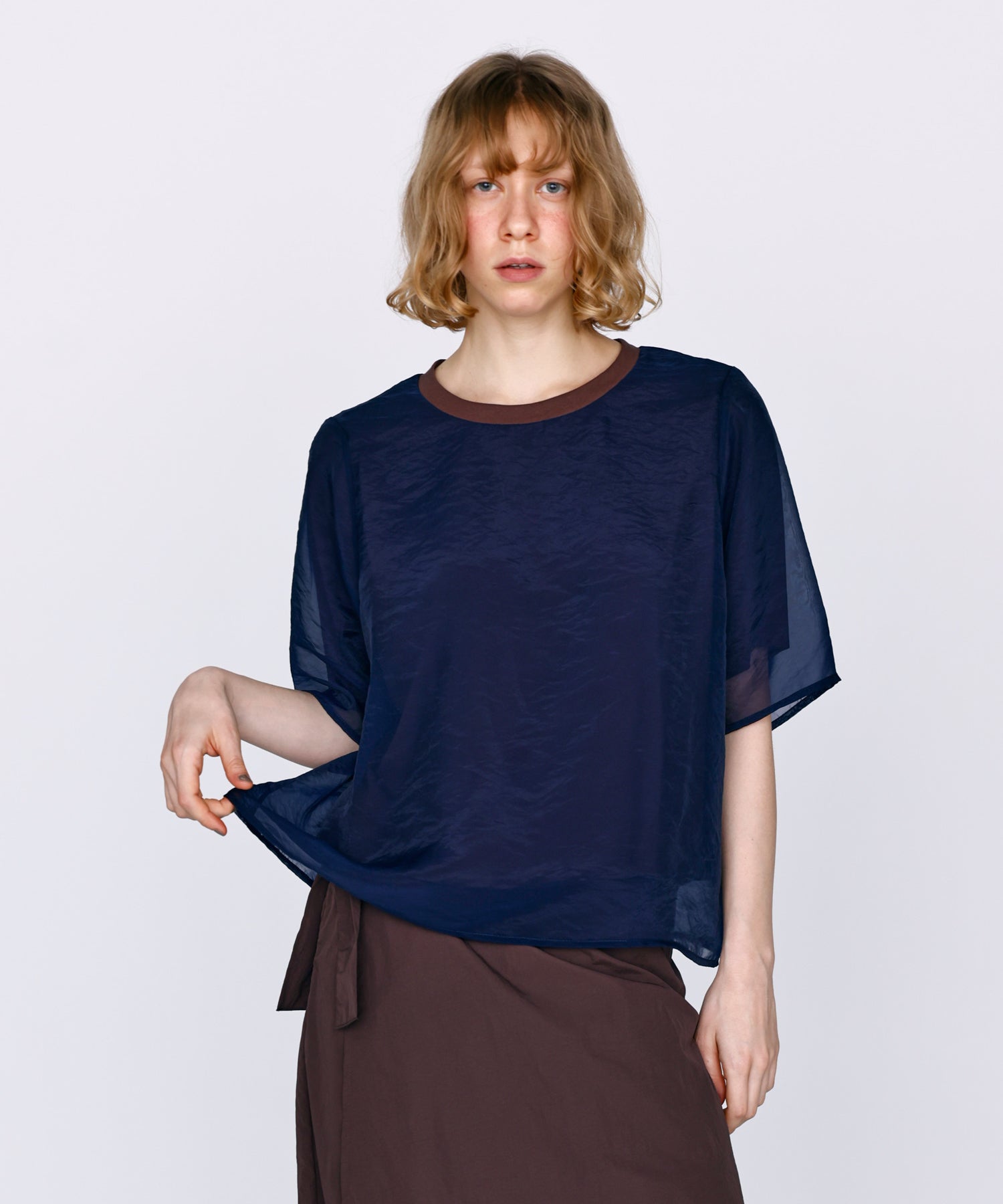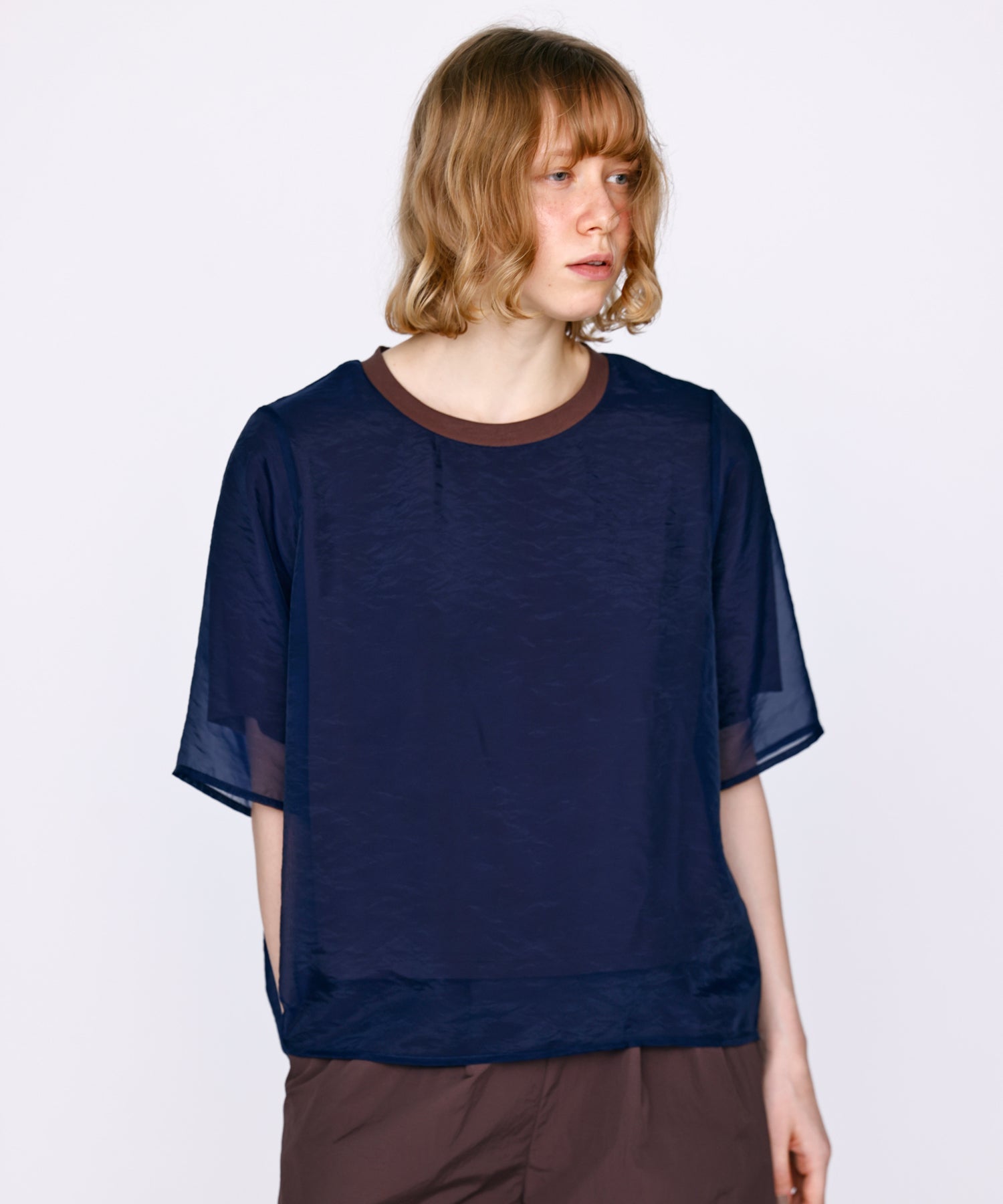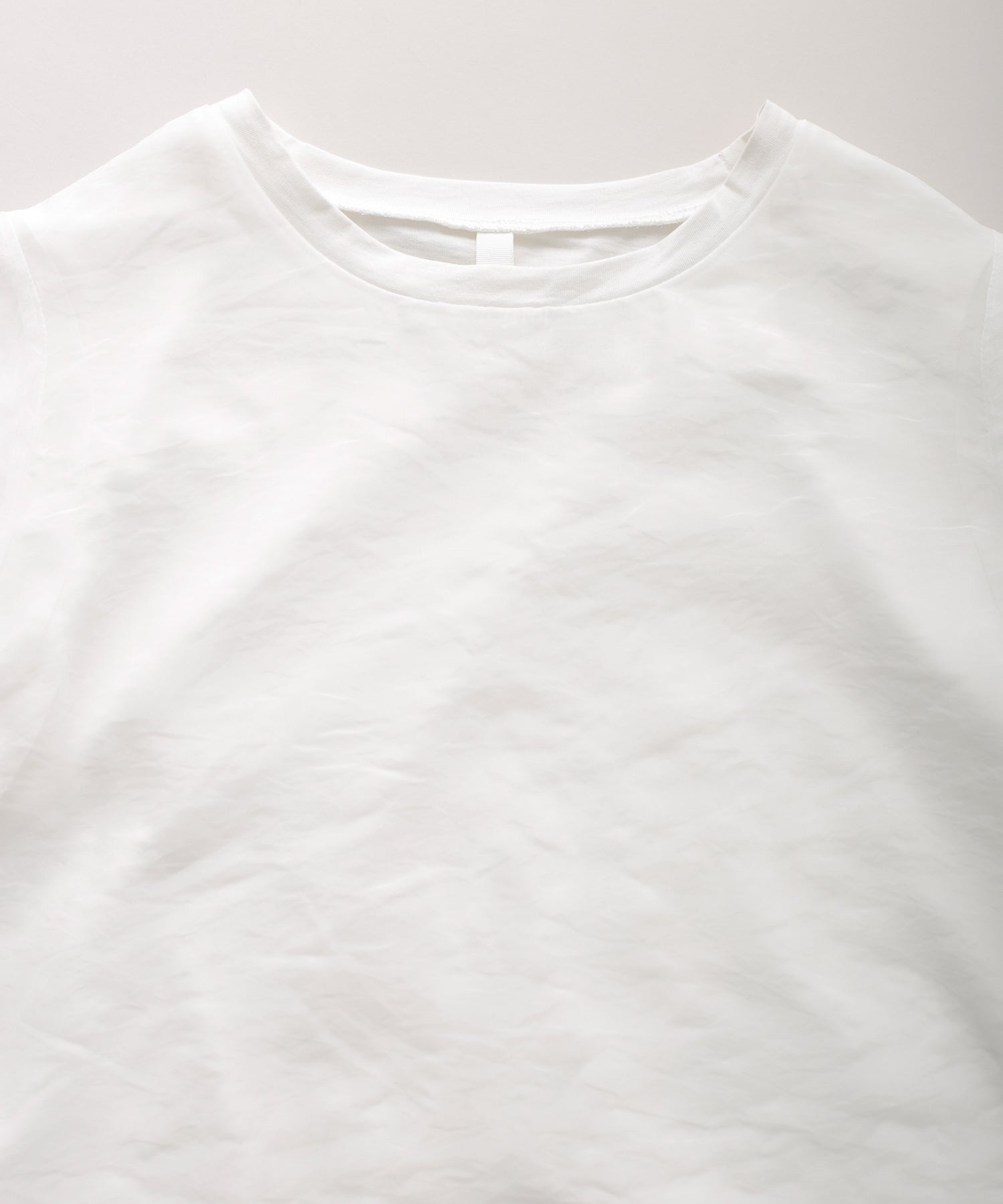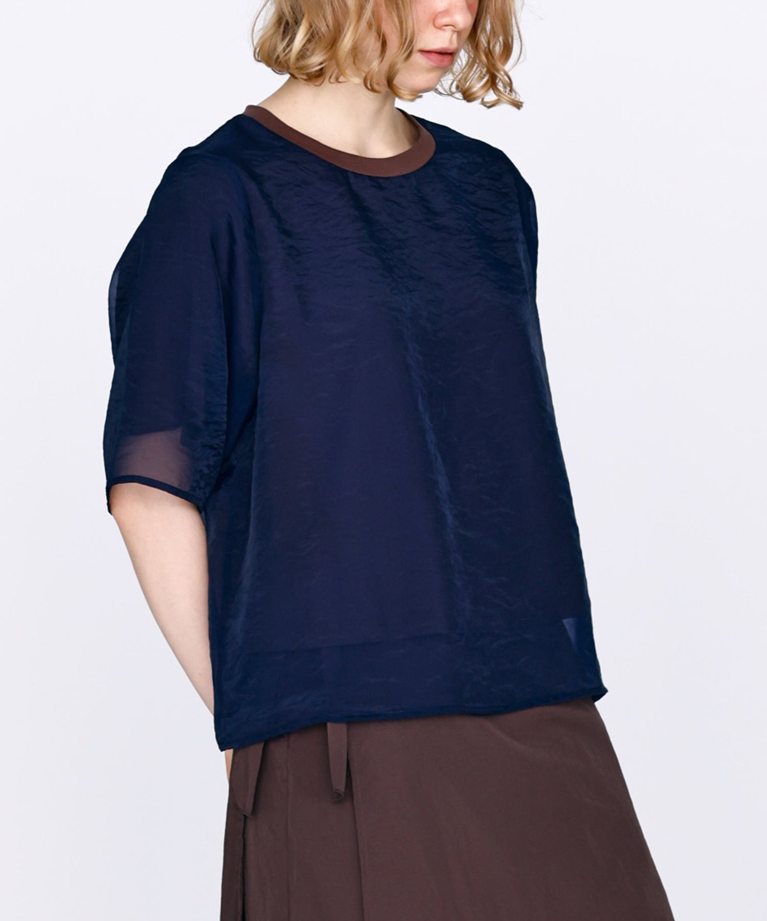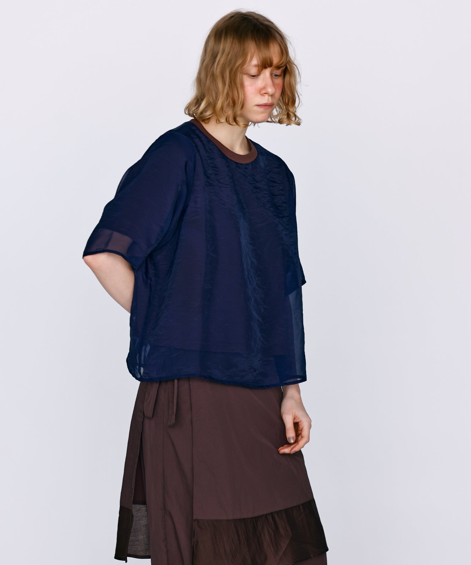 さらっとした肌あたりのカットソー素材と、程よい透け感のオーガンジー素材を使用し、デイリーに着用しやすいように仕上げました。