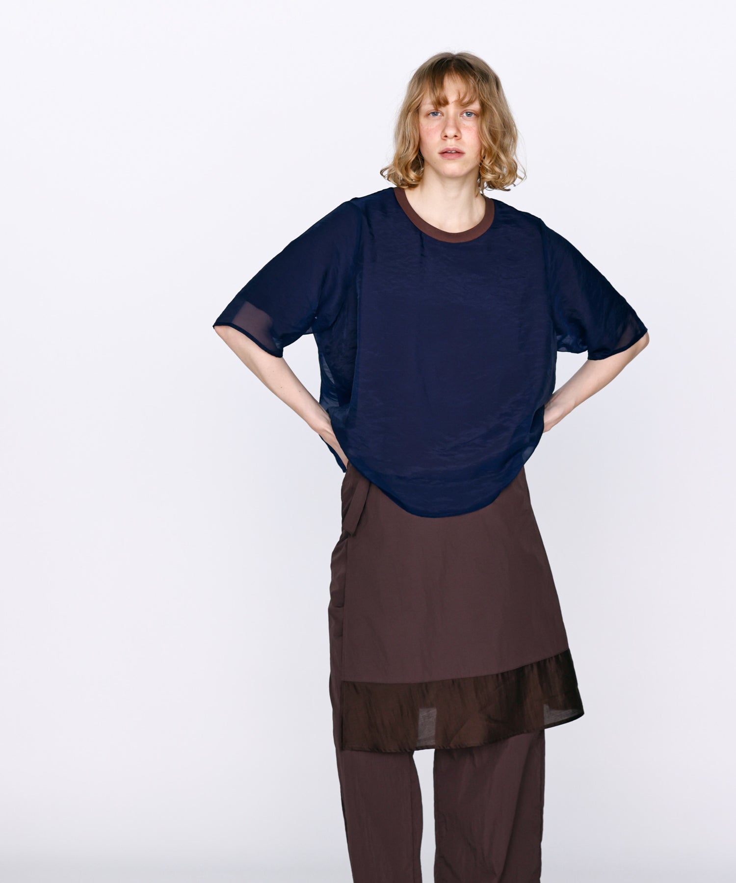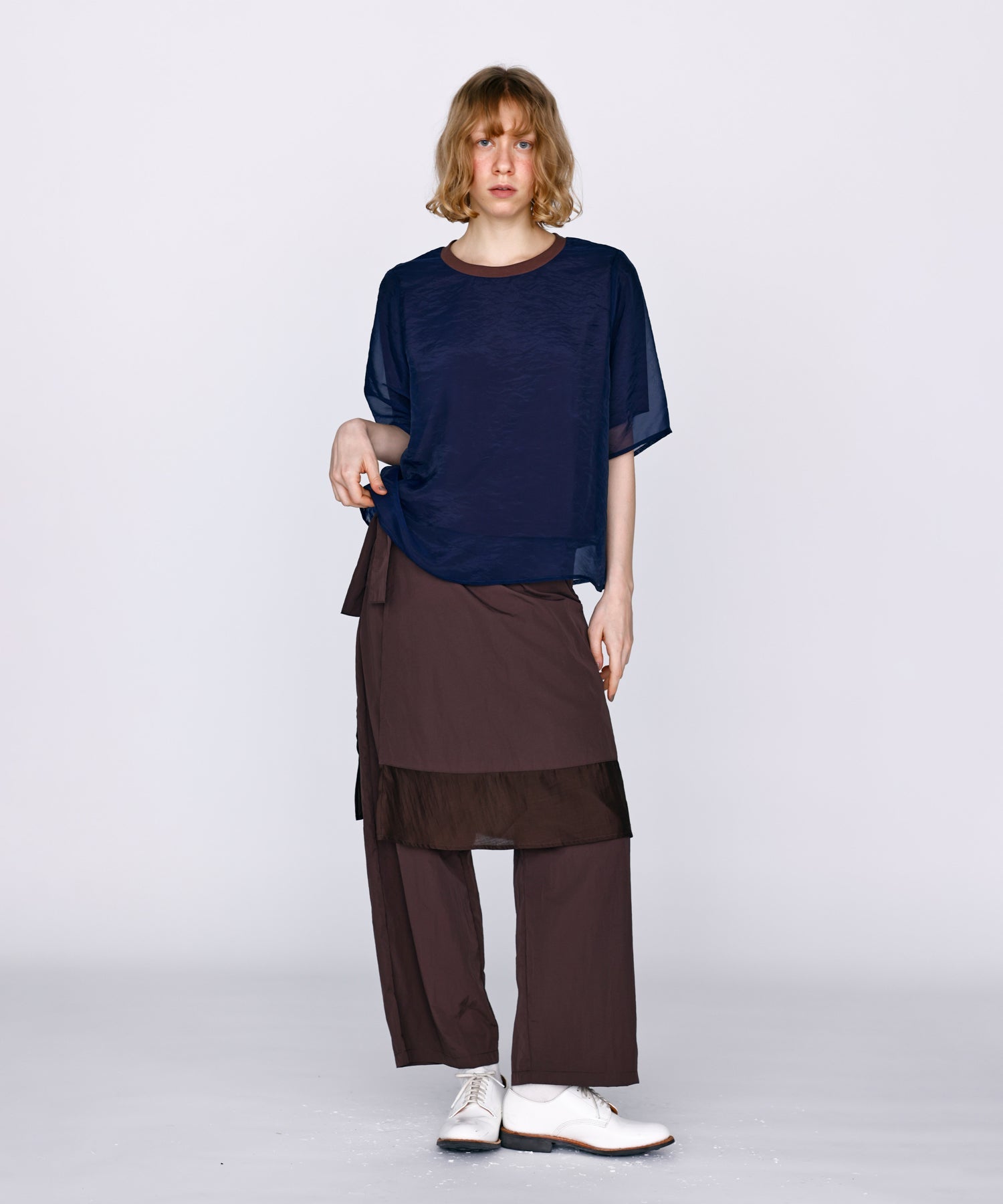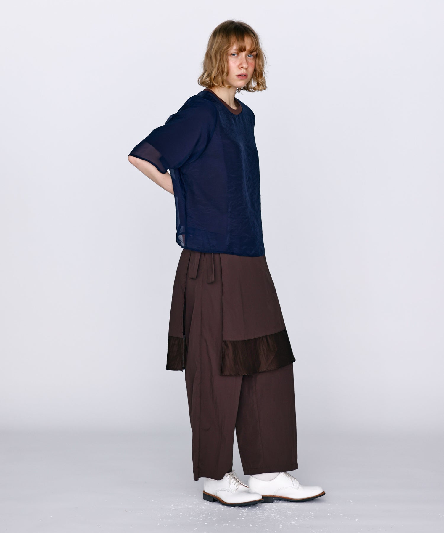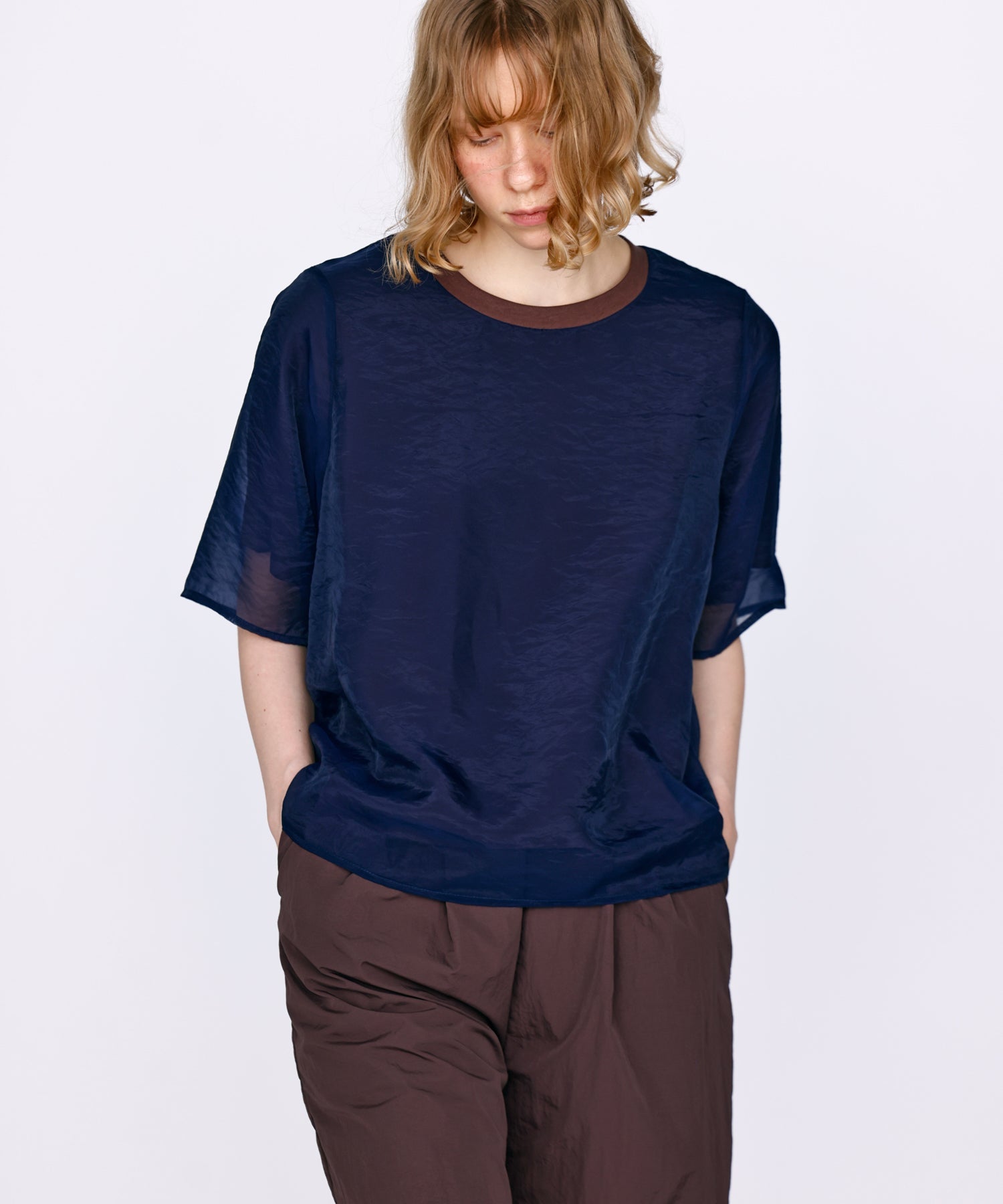 さらっとした肌あたりのカットソー素材と、程よい透け感のオーガンジー素材を使用し、デイリーに着用しやすいように仕上げました。