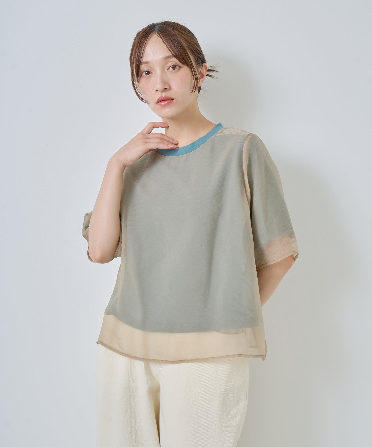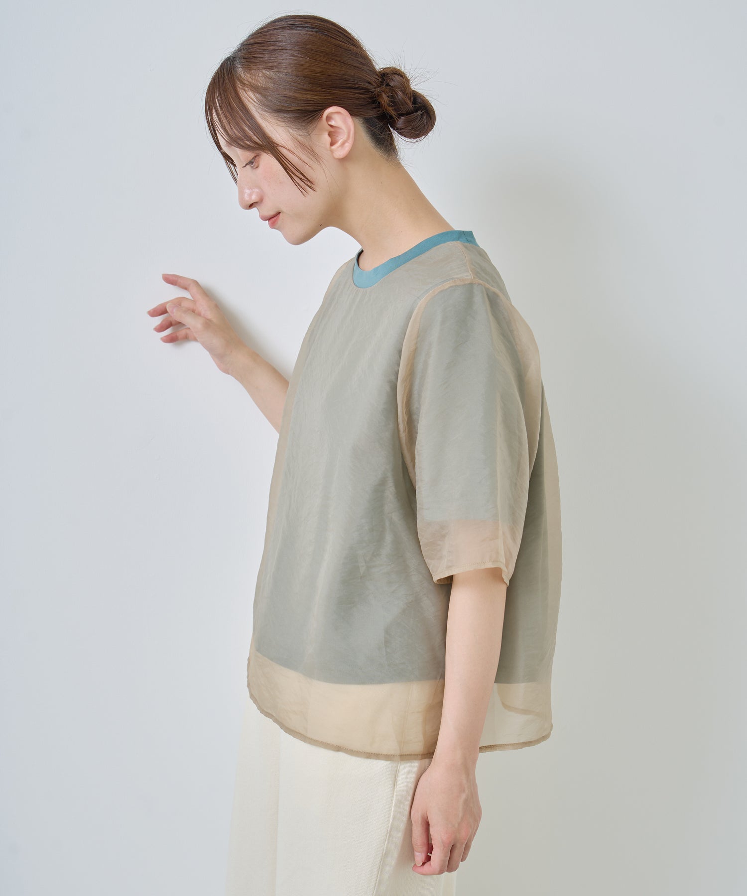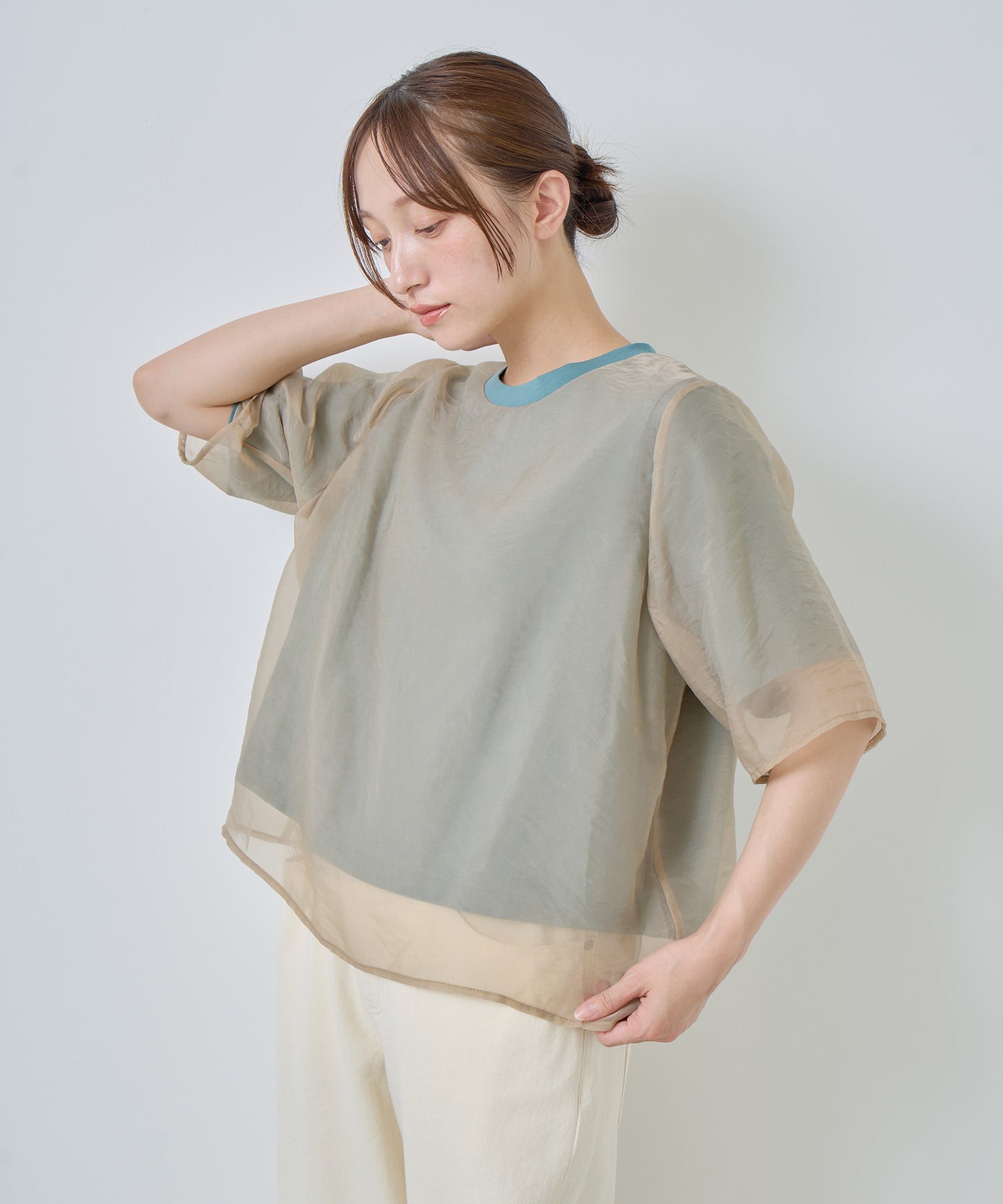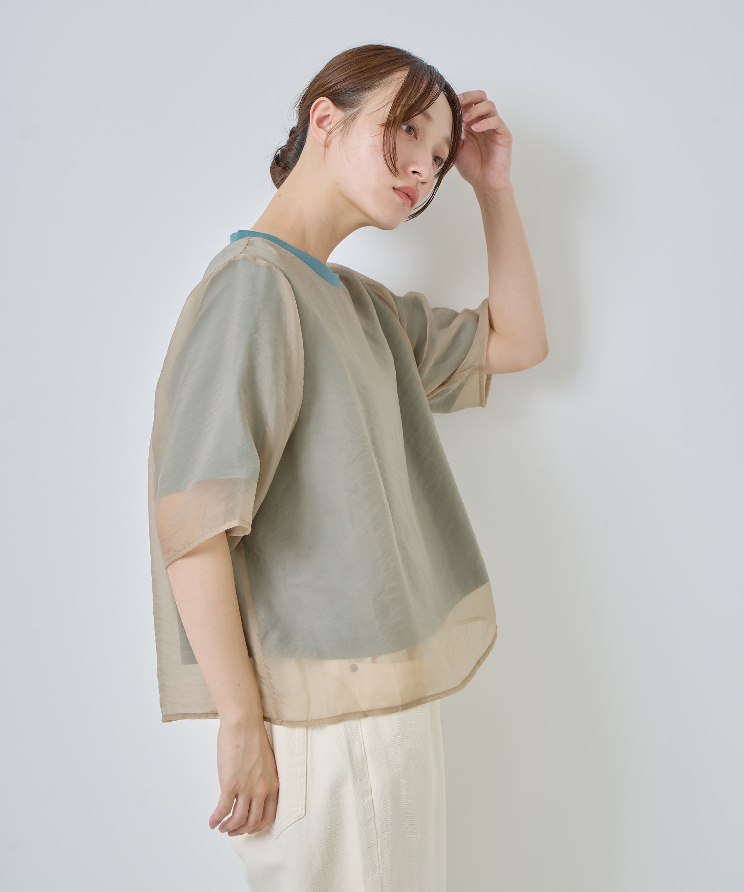 カットソーよりもオーガンジー素材を身丈・袖丈を長く設定することで透け感が垣間見え、涼しげな着用感を演出。