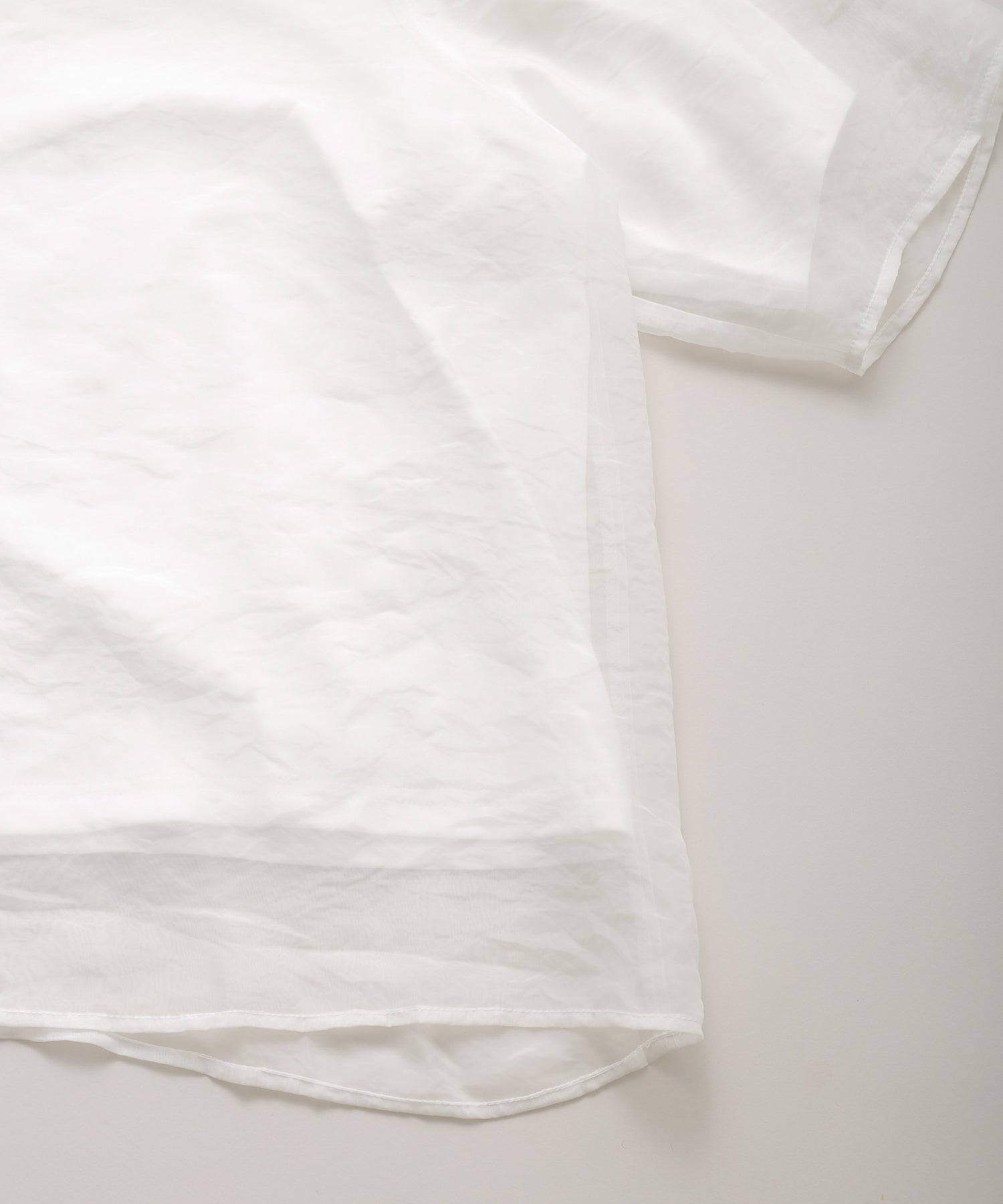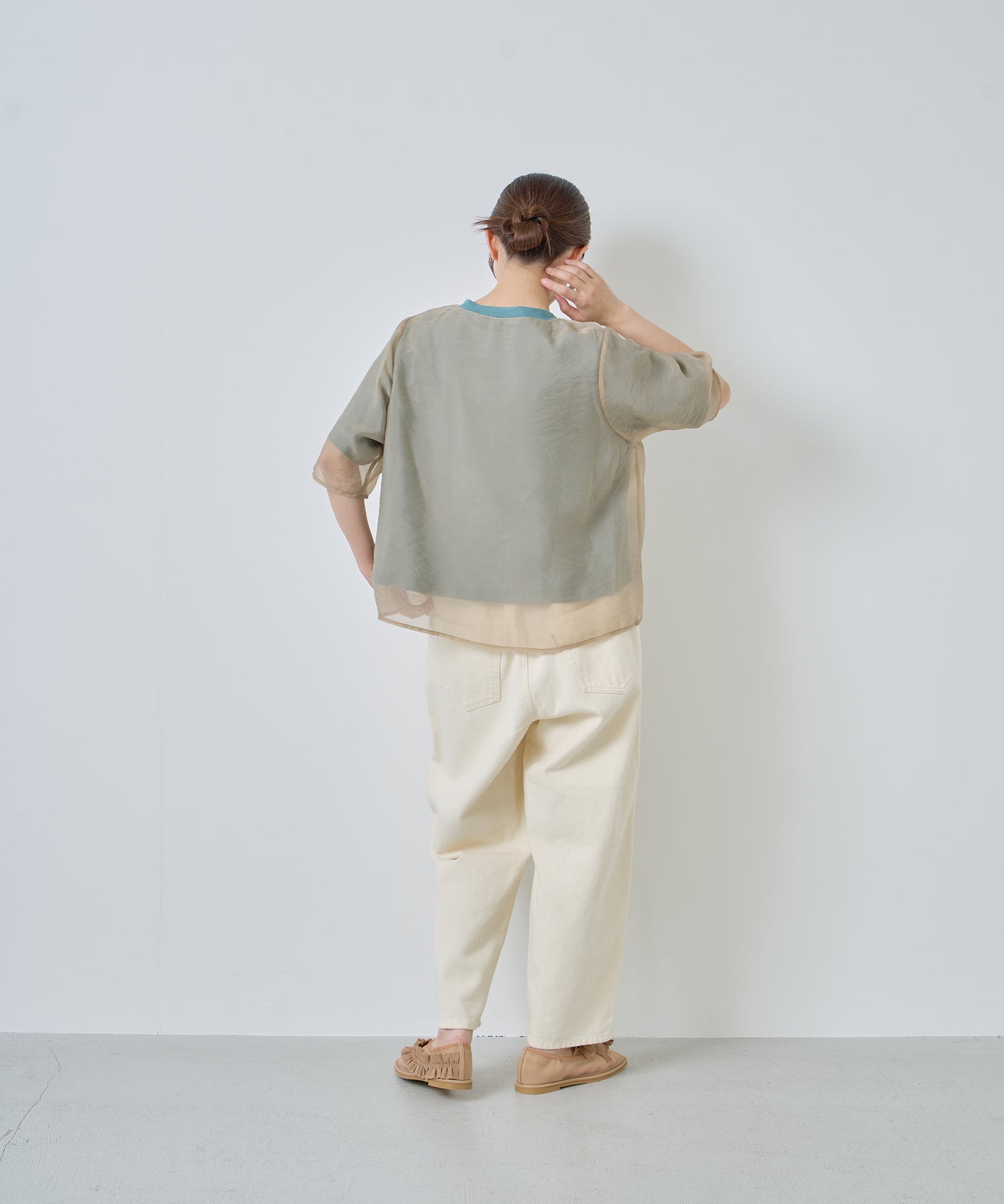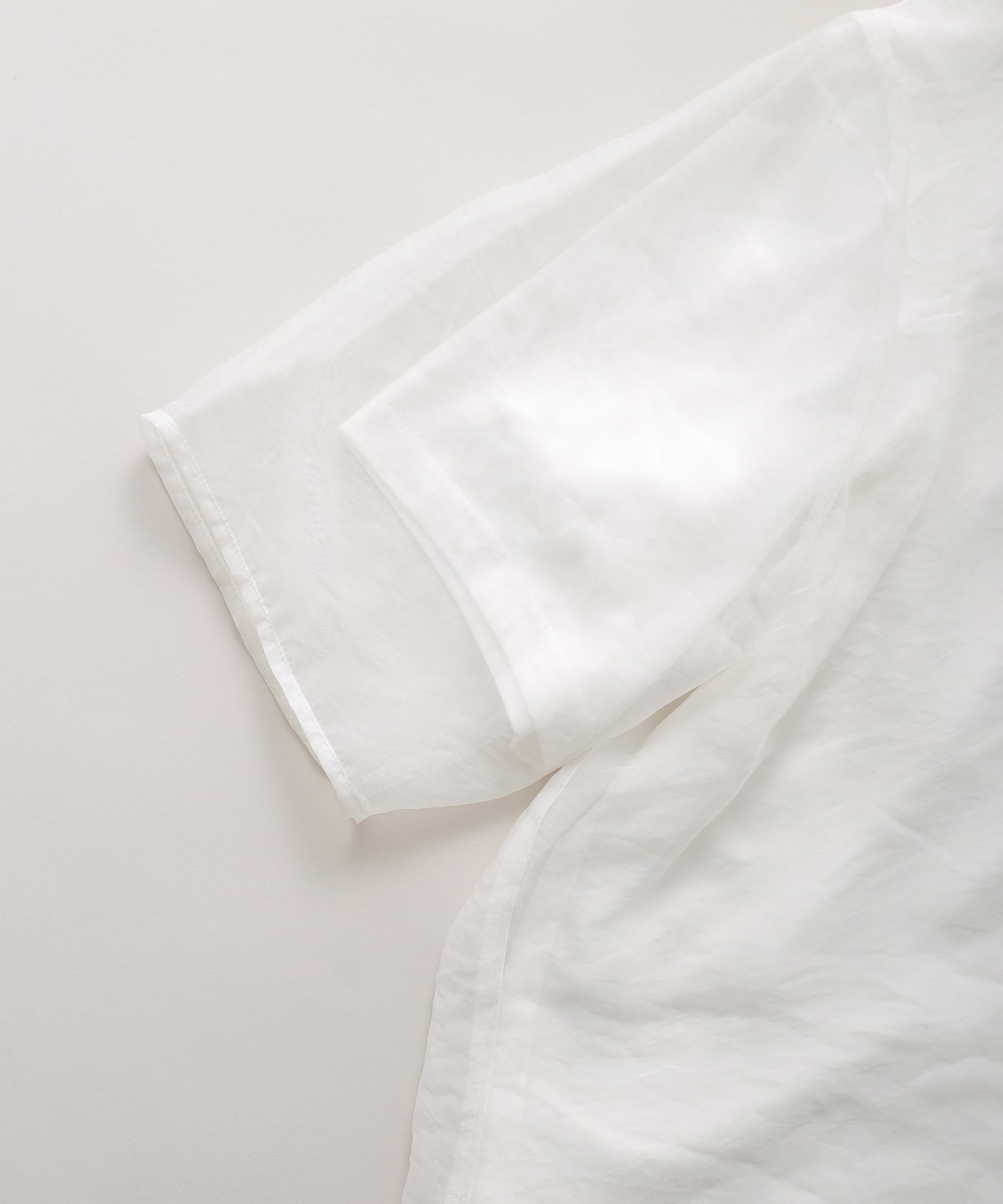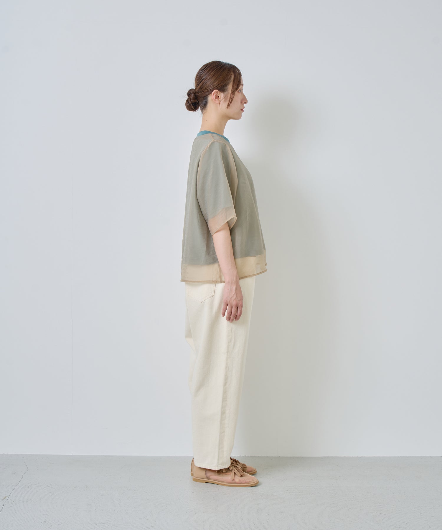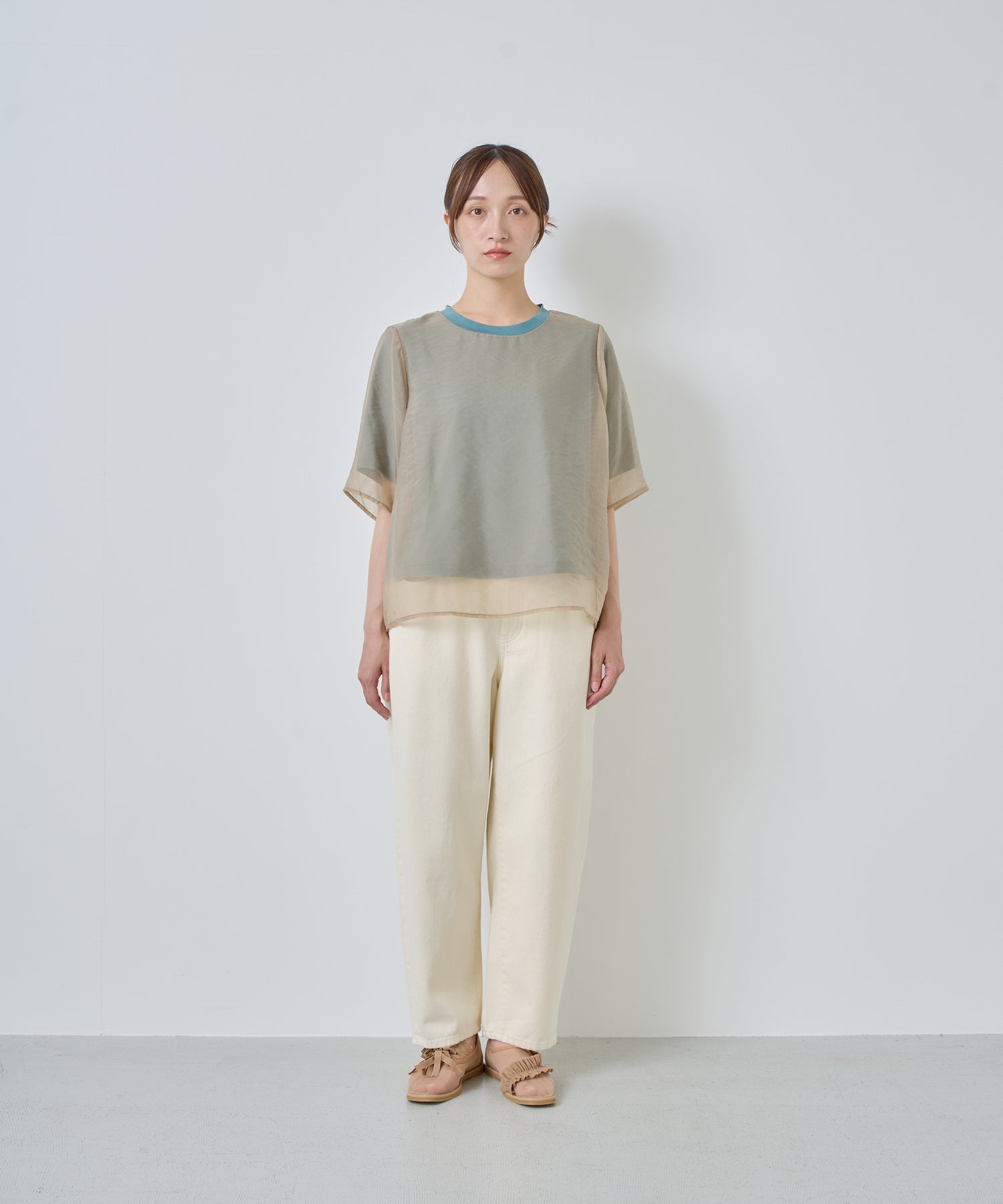 カットソーよりもオーガンジー素材を身丈・袖丈を長く設定することで透け感が垣間見え、涼しげな着用感を演出。