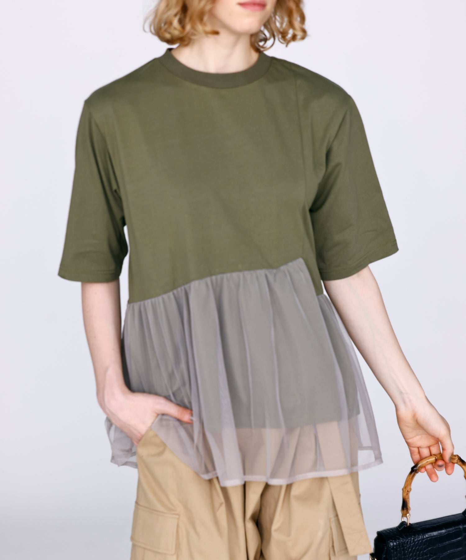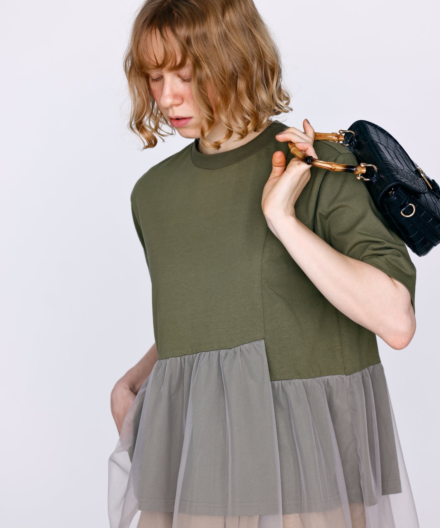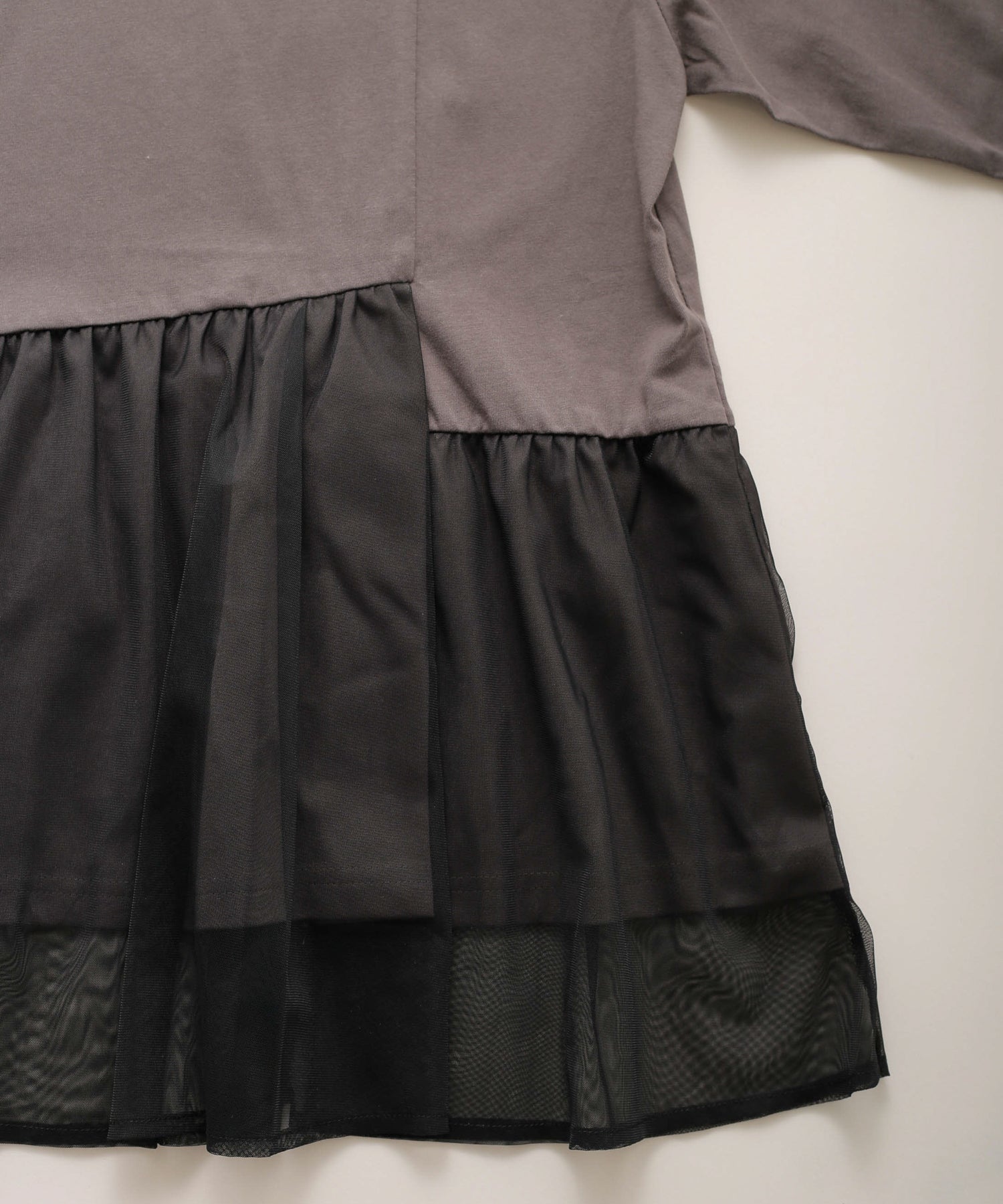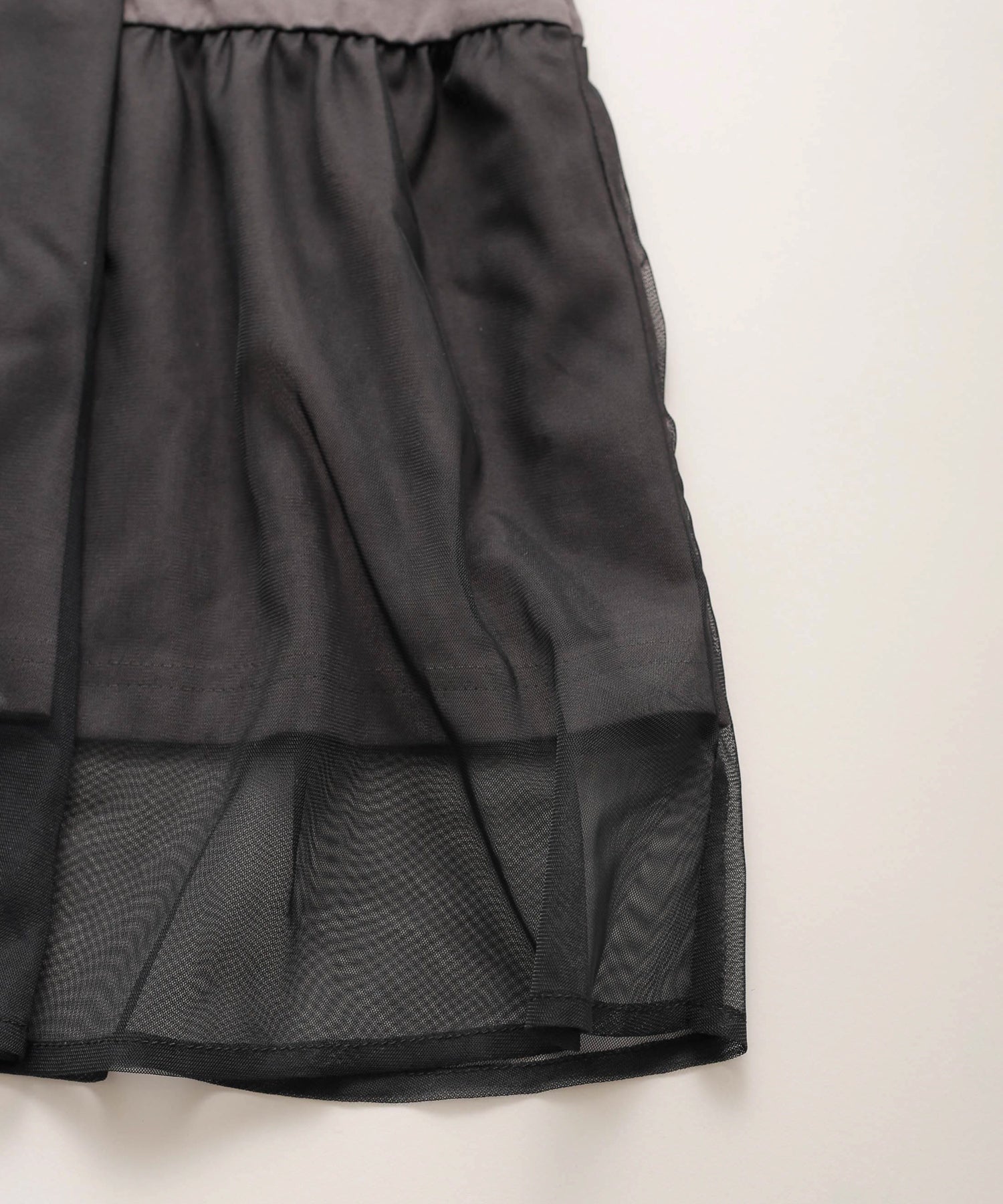 目の細かいチュールメッシュとの異素材コンビデザイン。