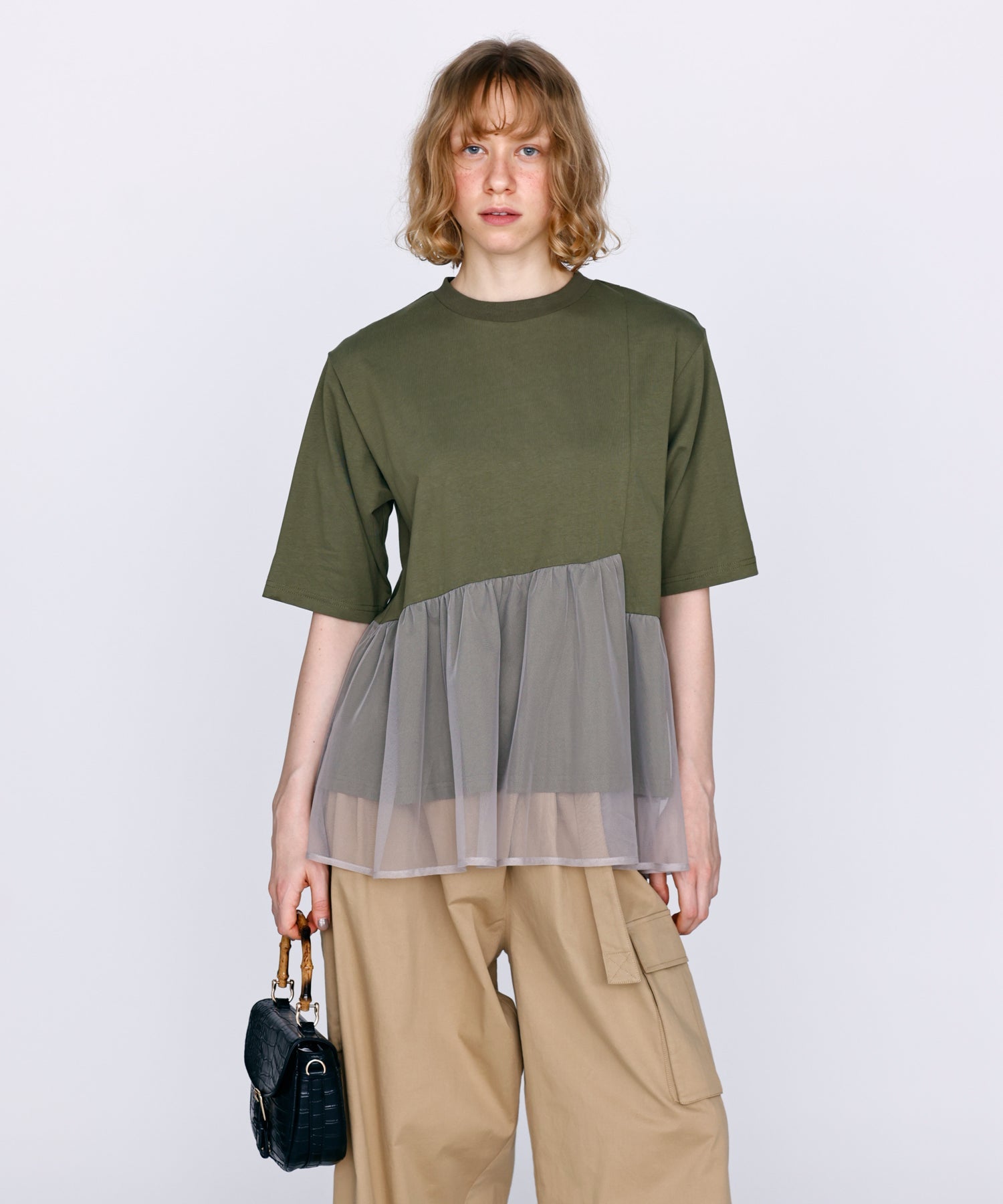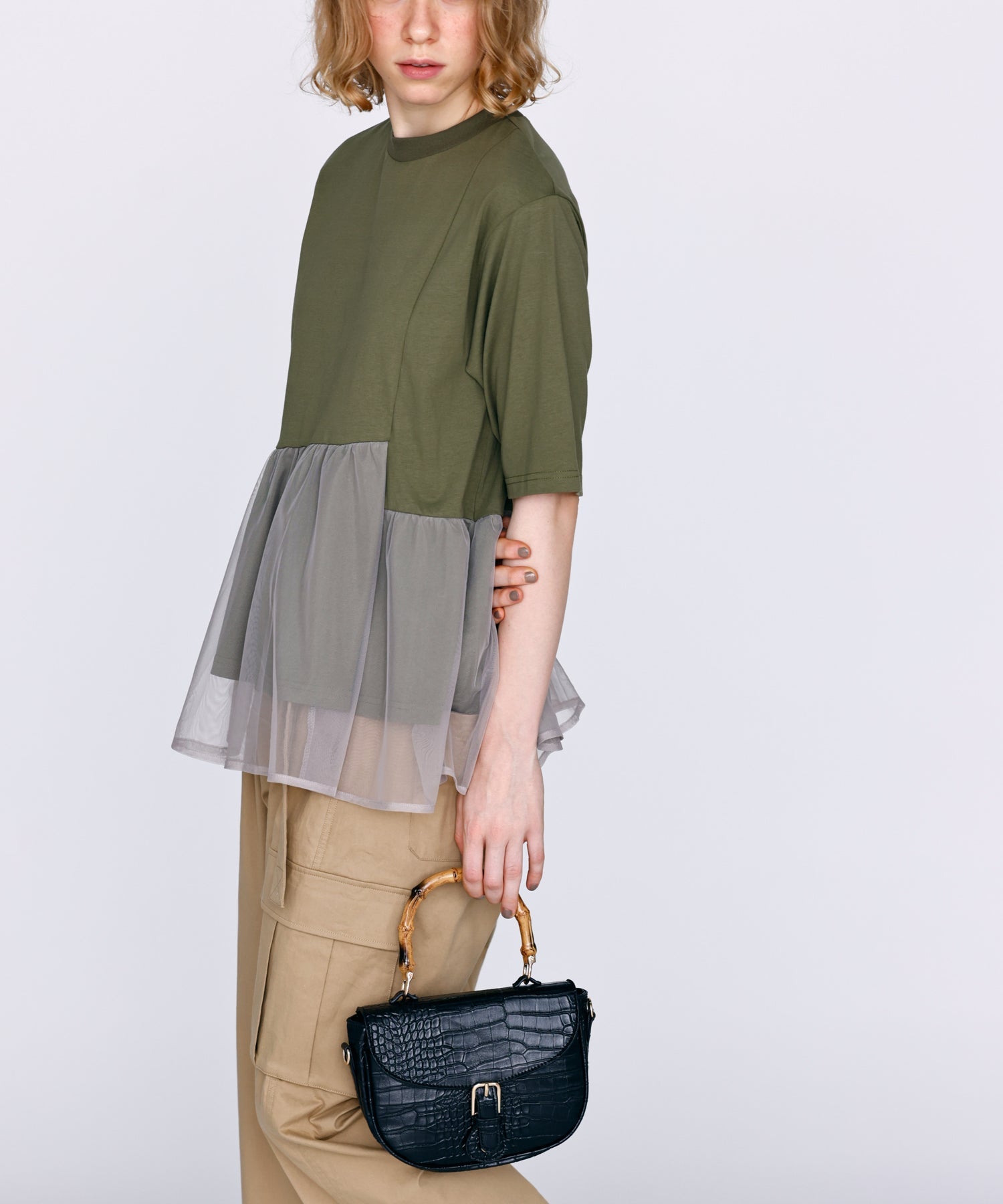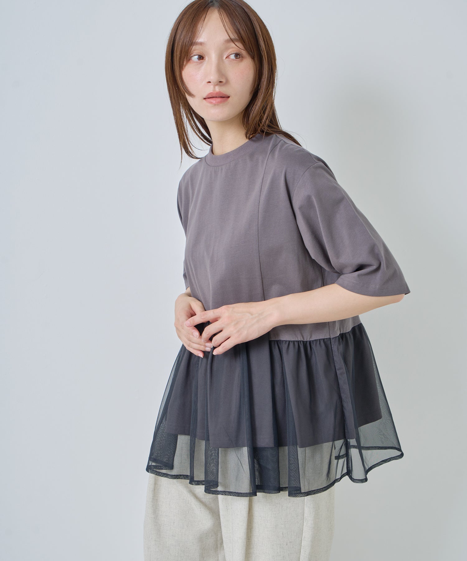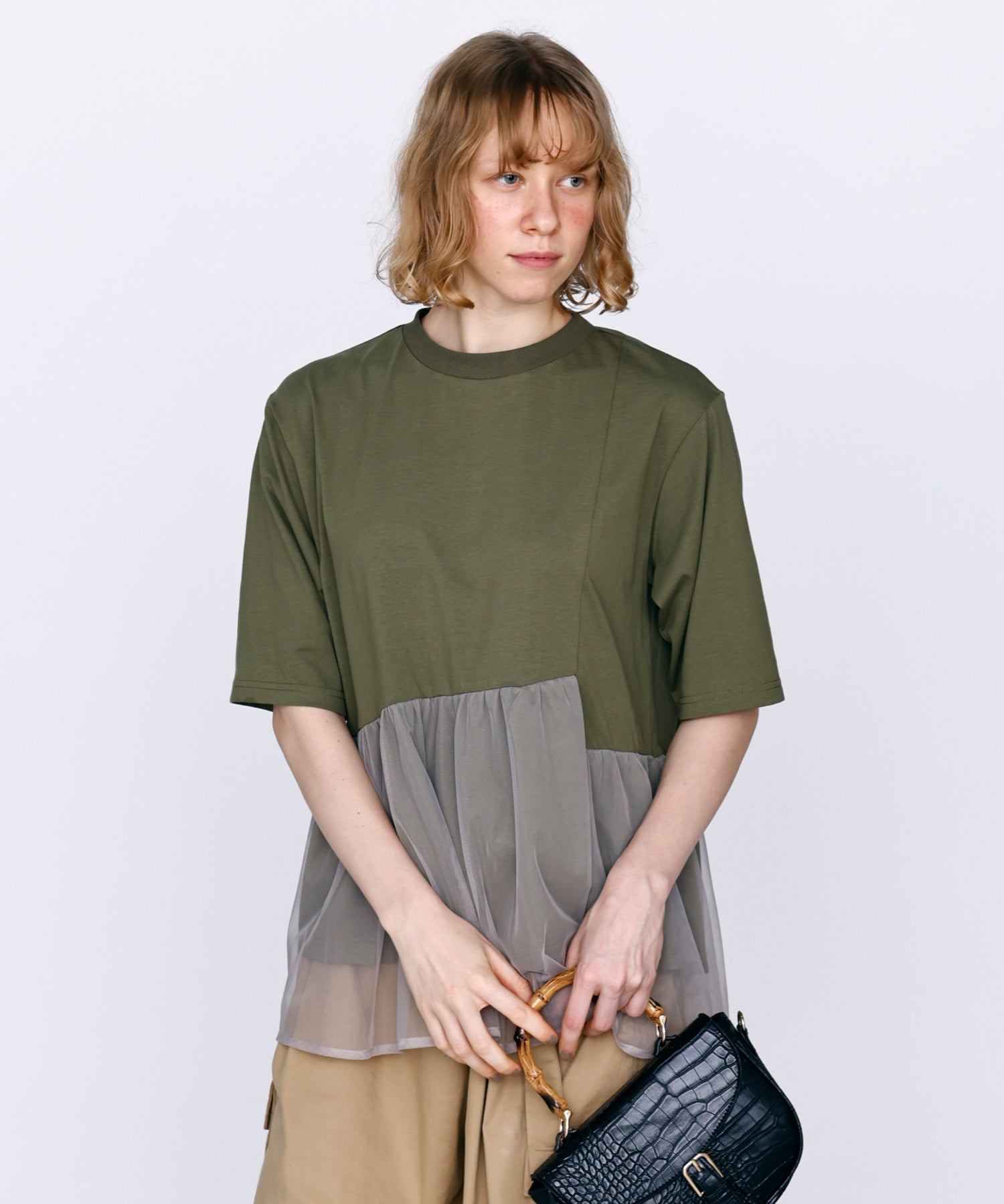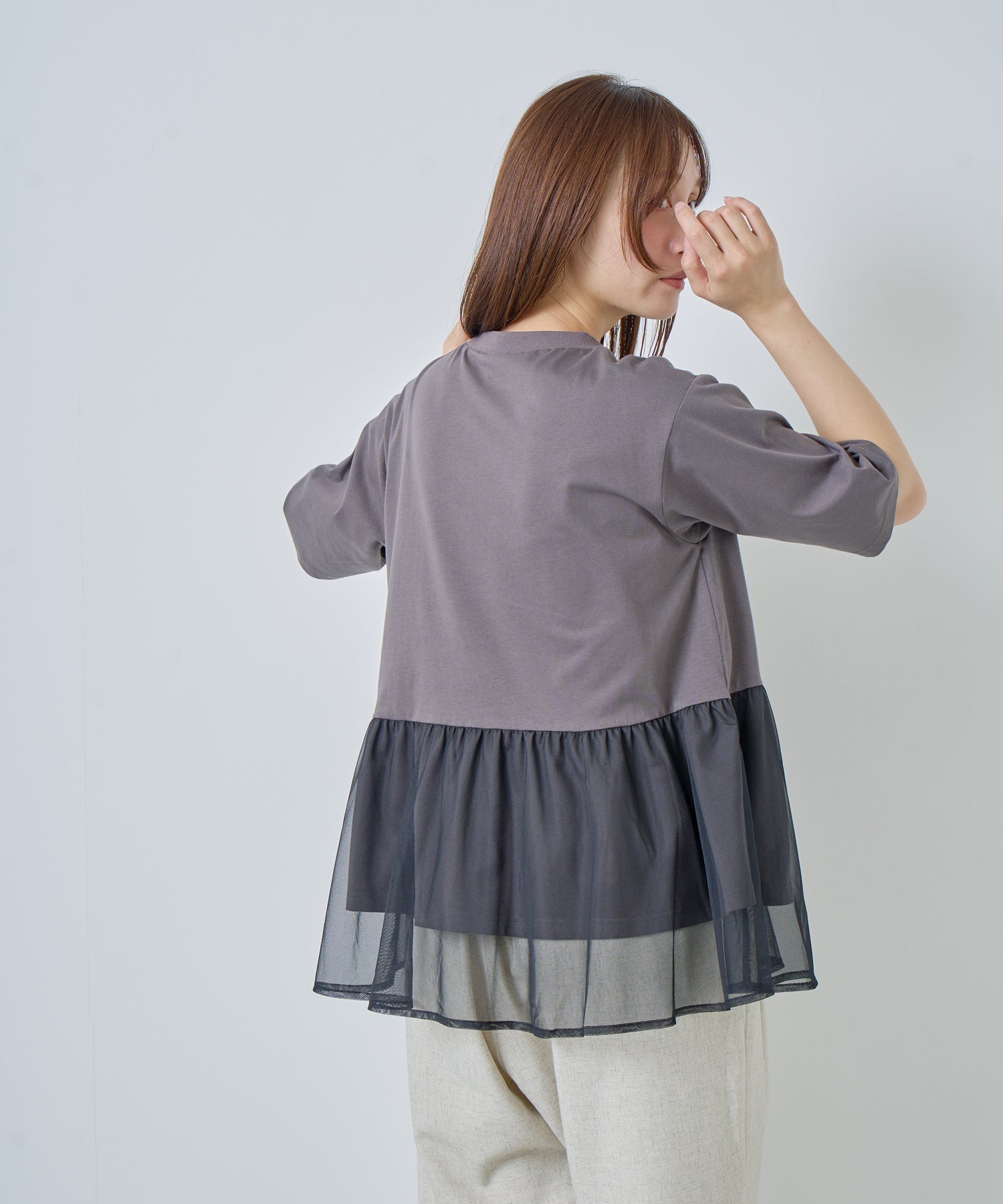 目の細かいチュールメッシュとの異素材コンビデザイン。