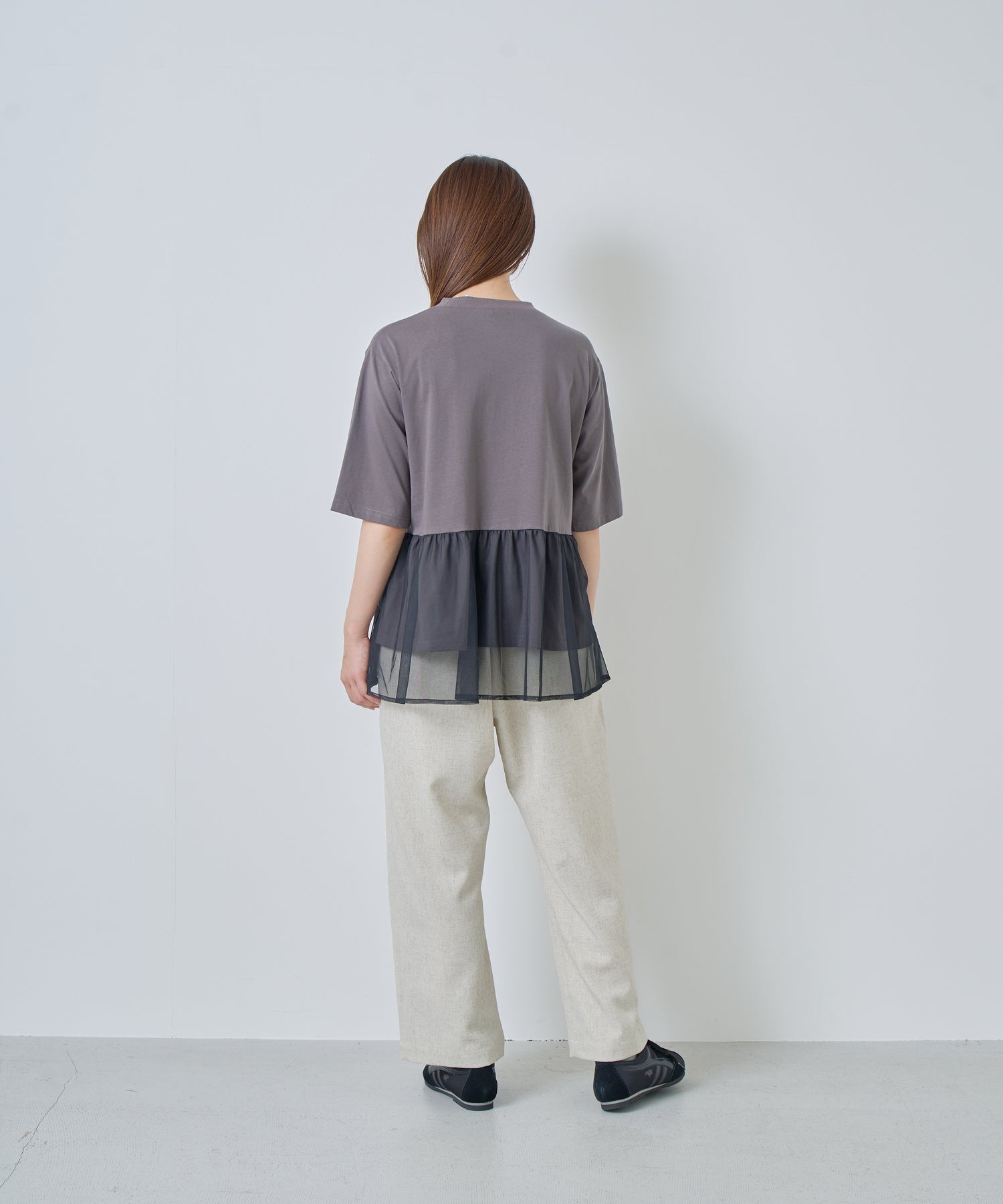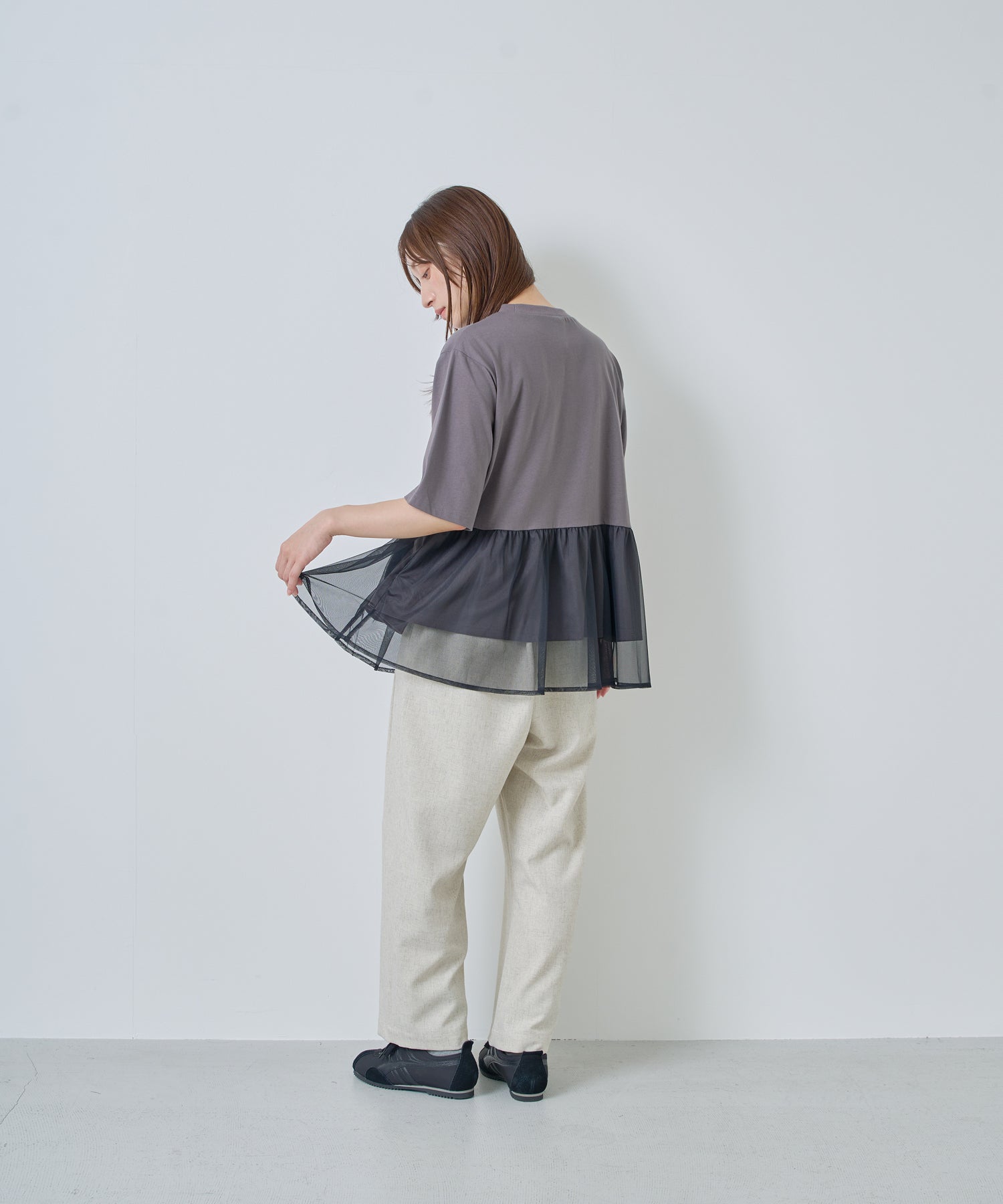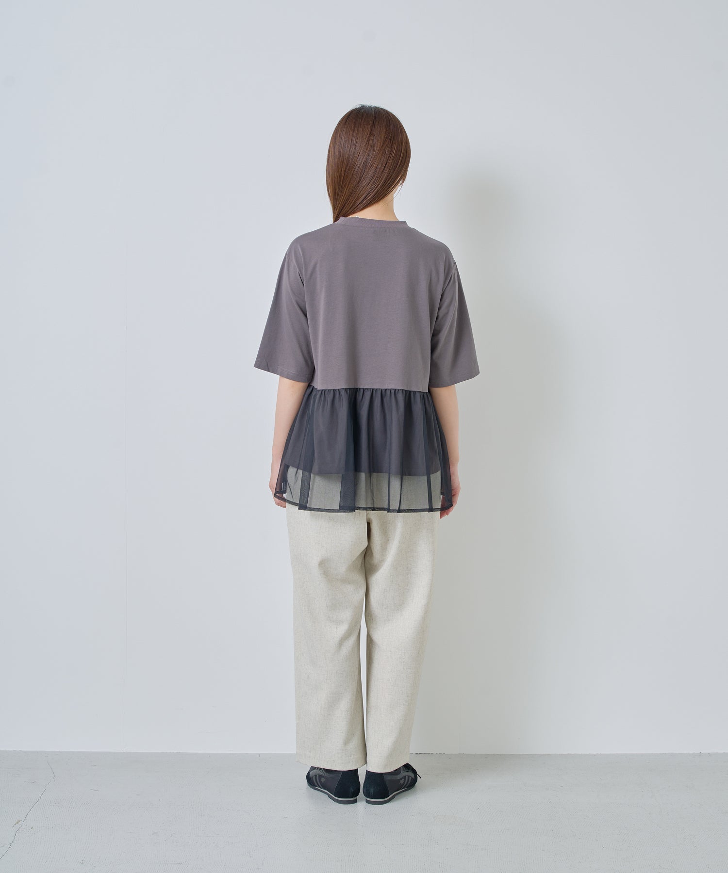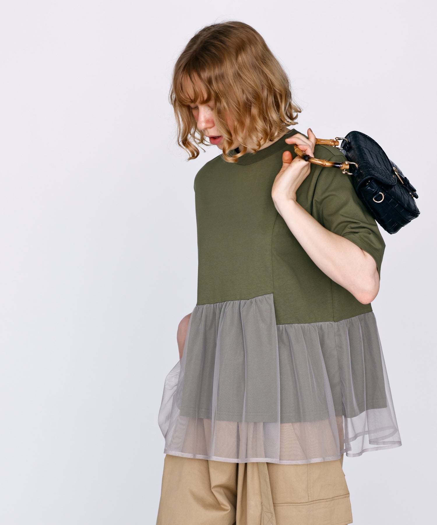 目の細かいチュールメッシュとの異素材コンビデザイン。