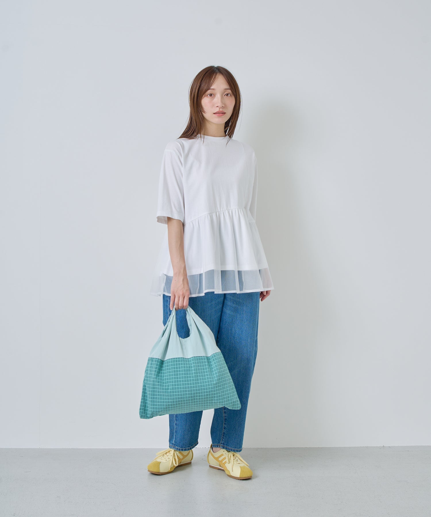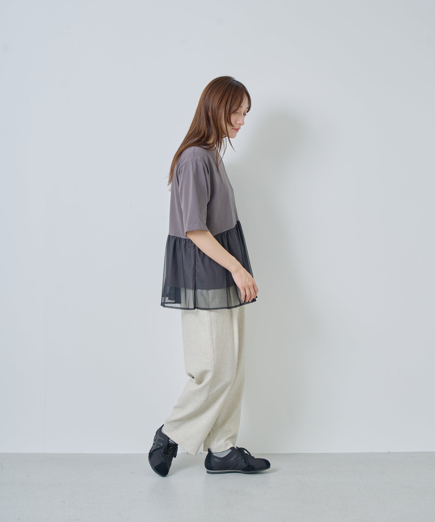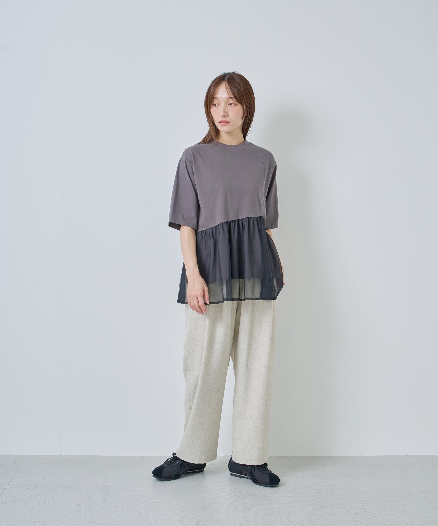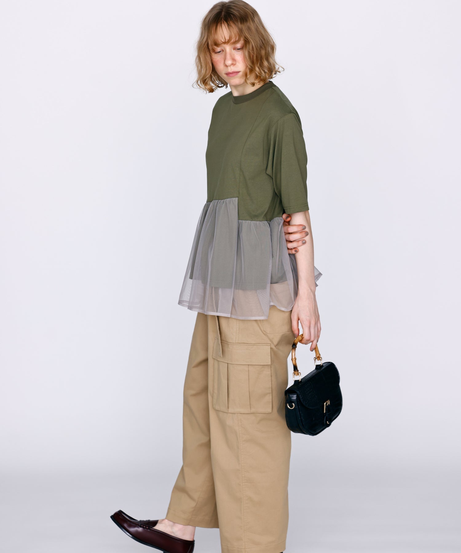 目の細かいチュールメッシュとの異素材コンビデザイン。