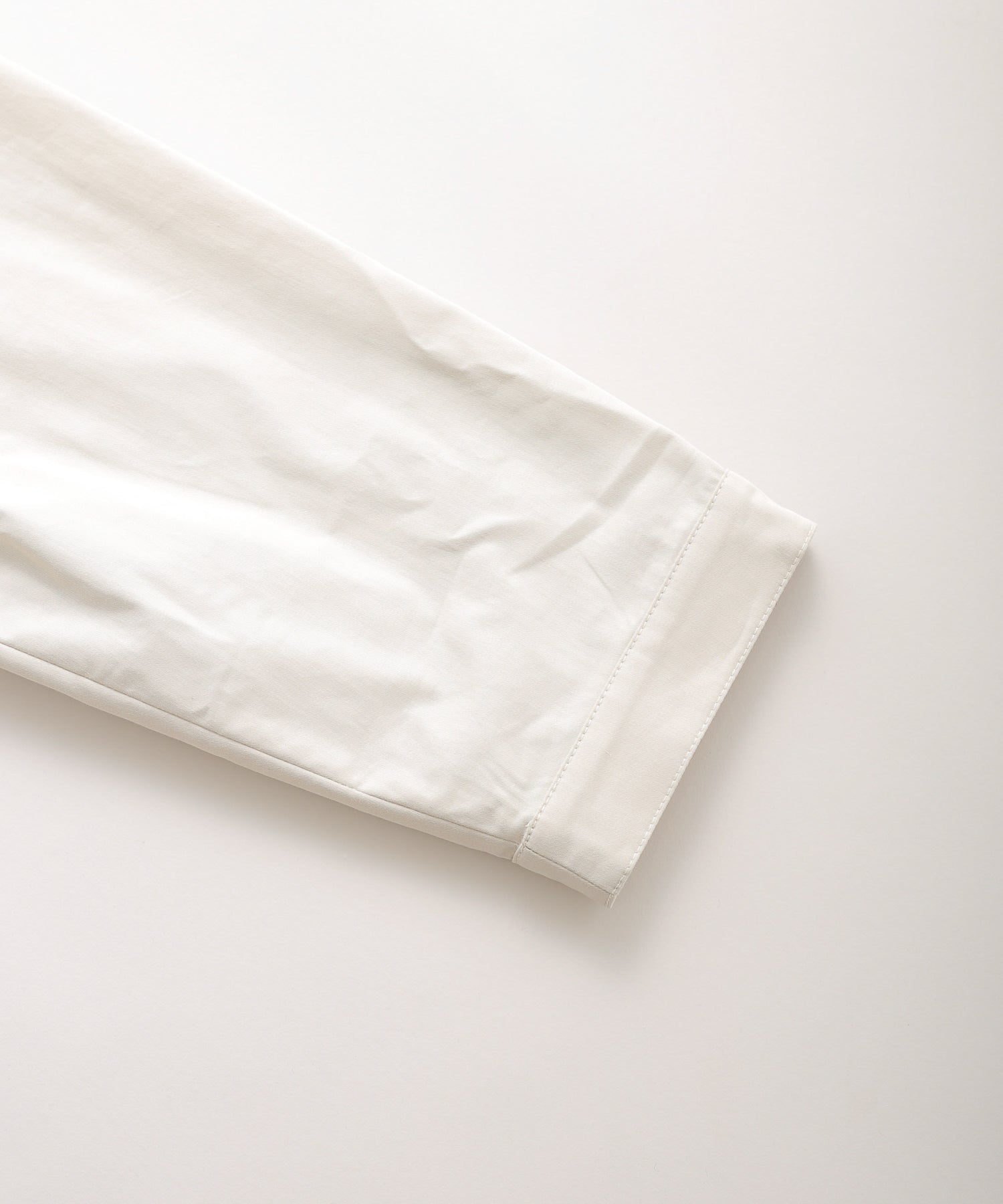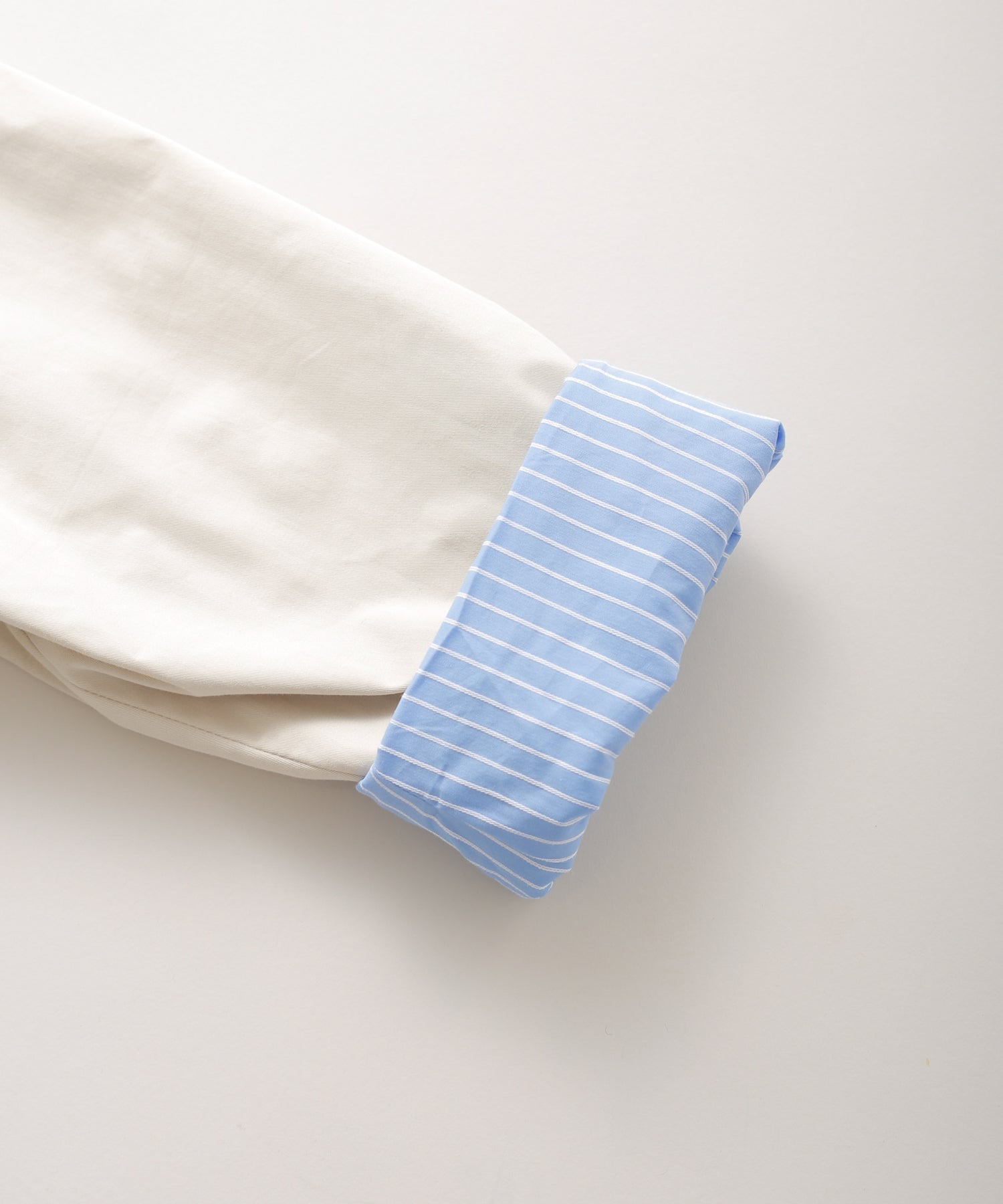 袖は2枚仕立てで、袖口をロールアップすると裏地のストライプが見え、抜け感のあるスタイリングが完成します。