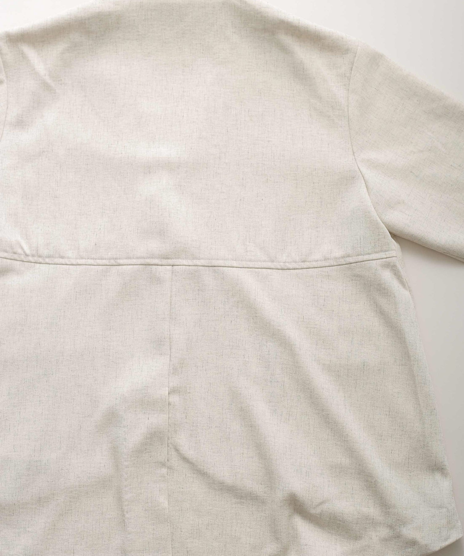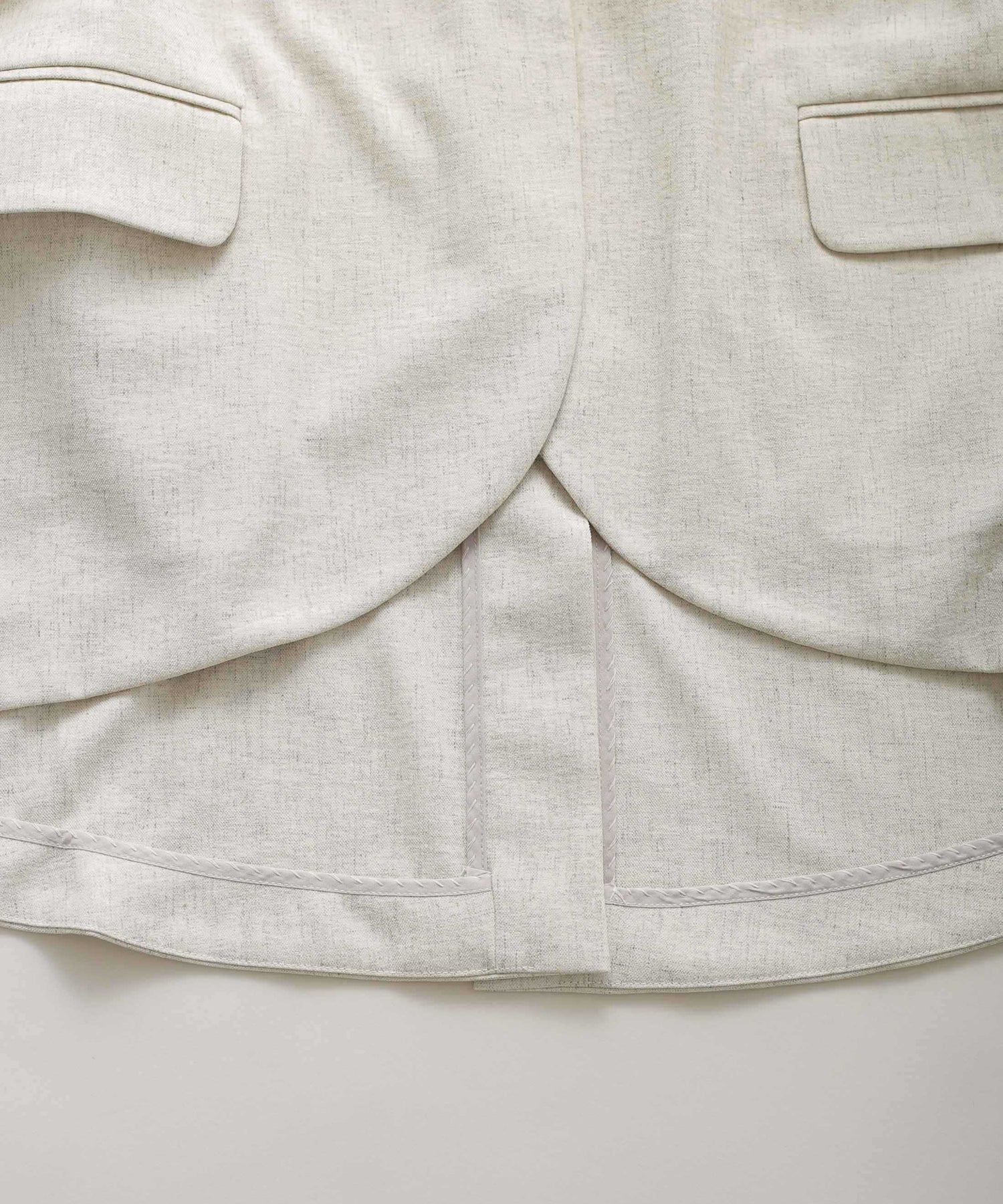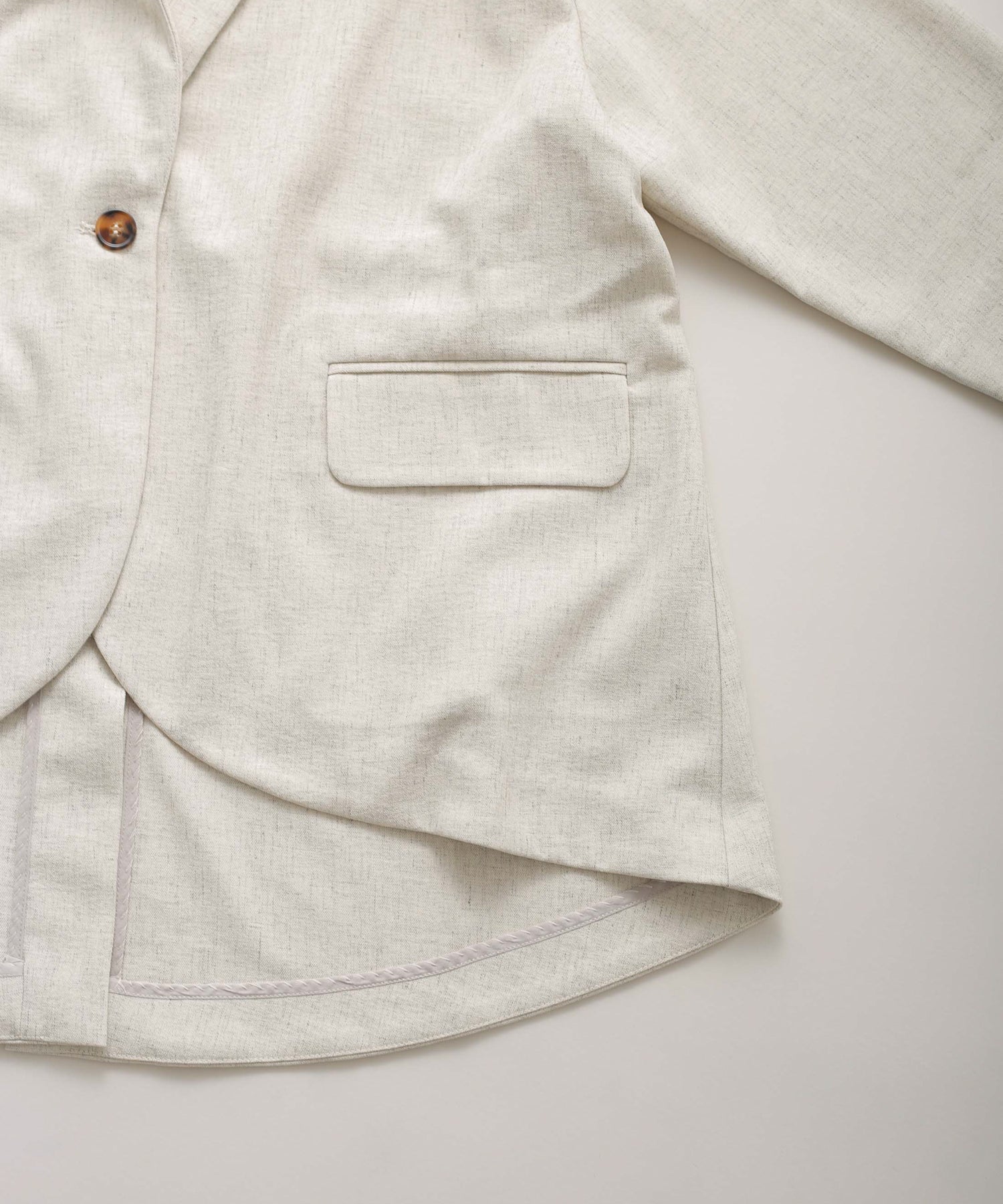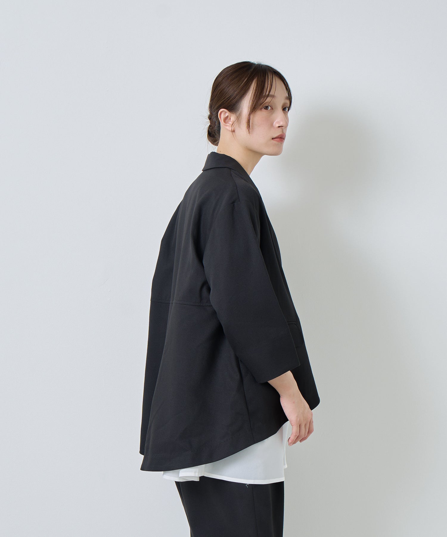 前後丈感の違うデザインで、前身は細めのテーラード襟でスッキリとした印象。