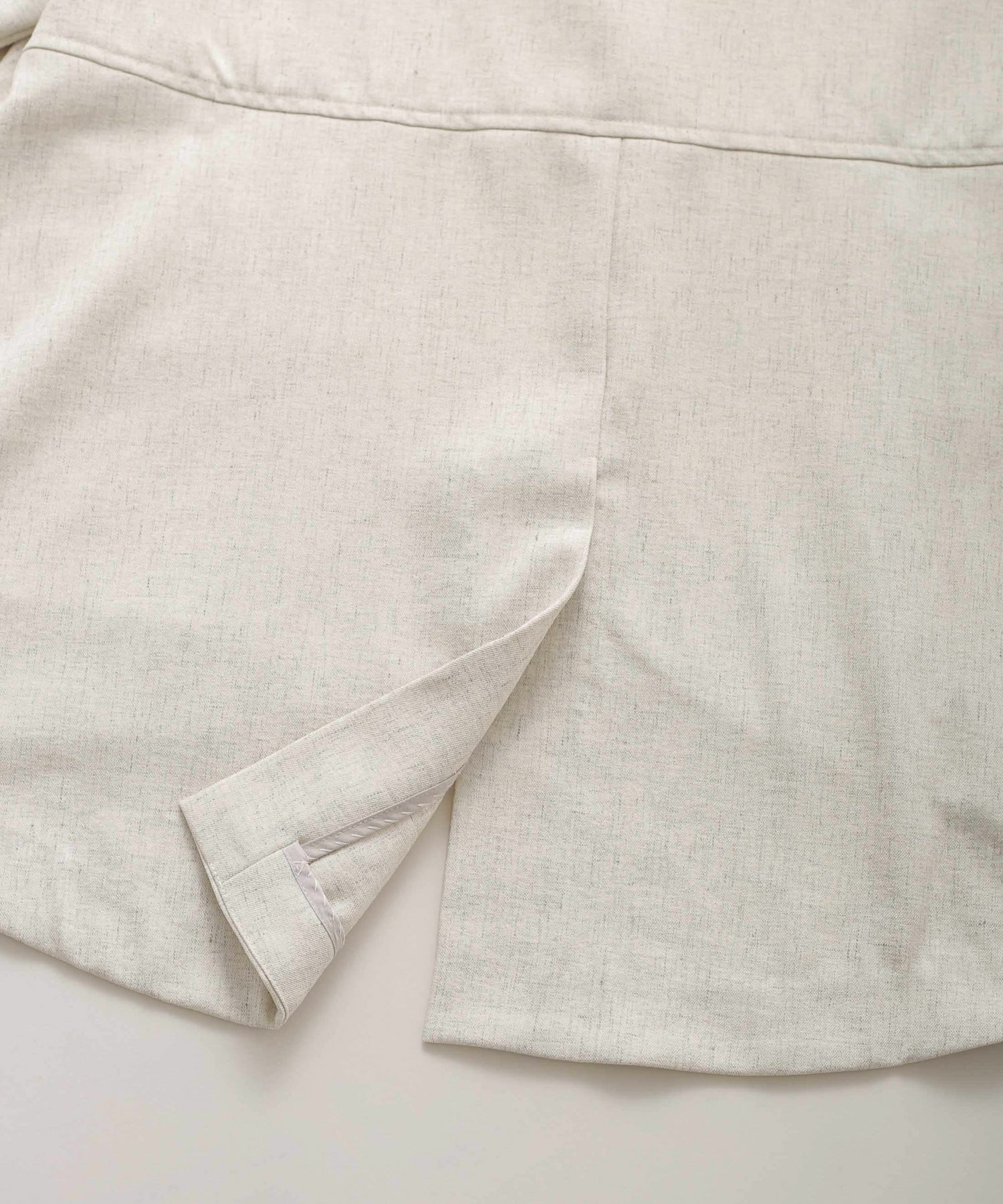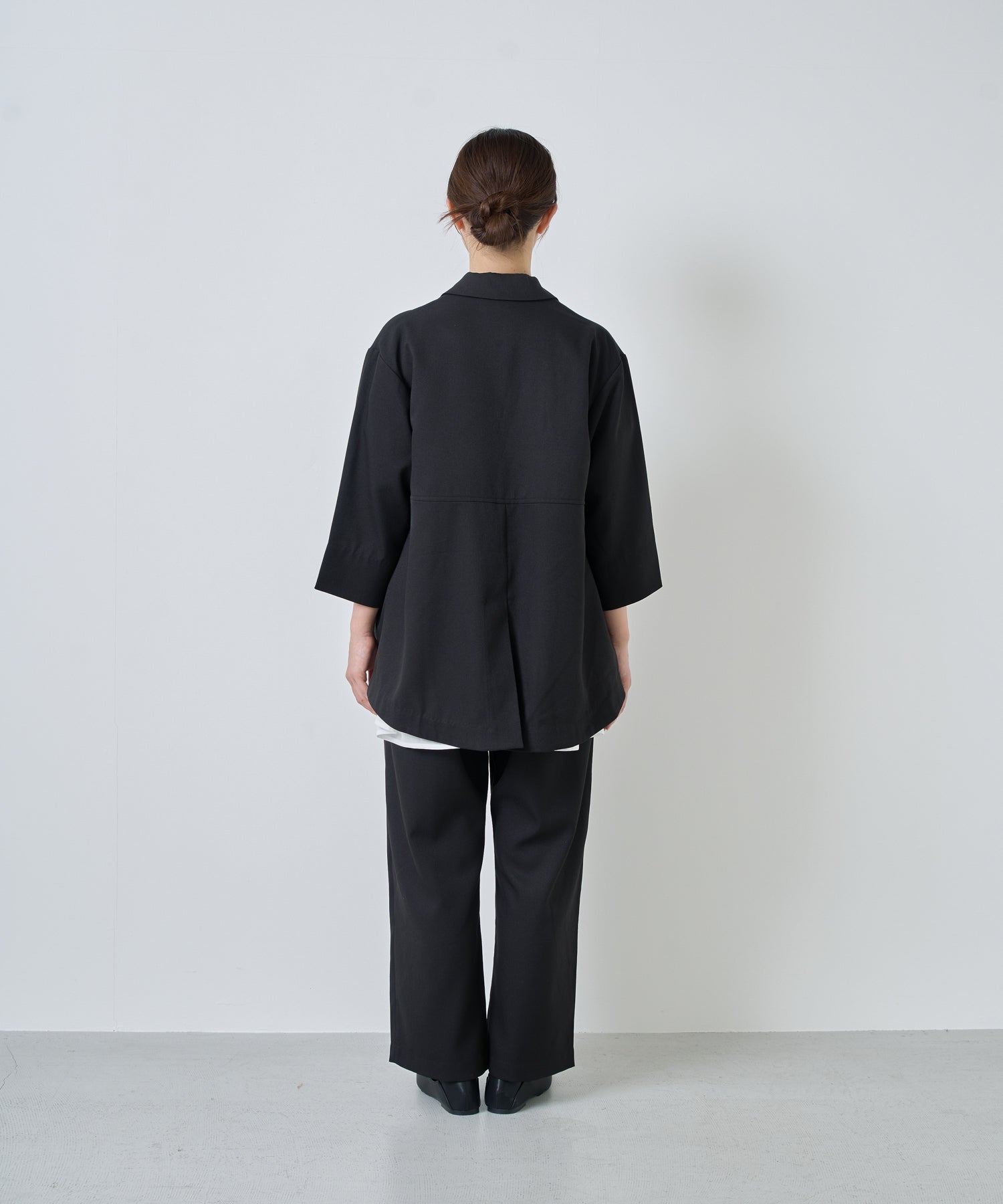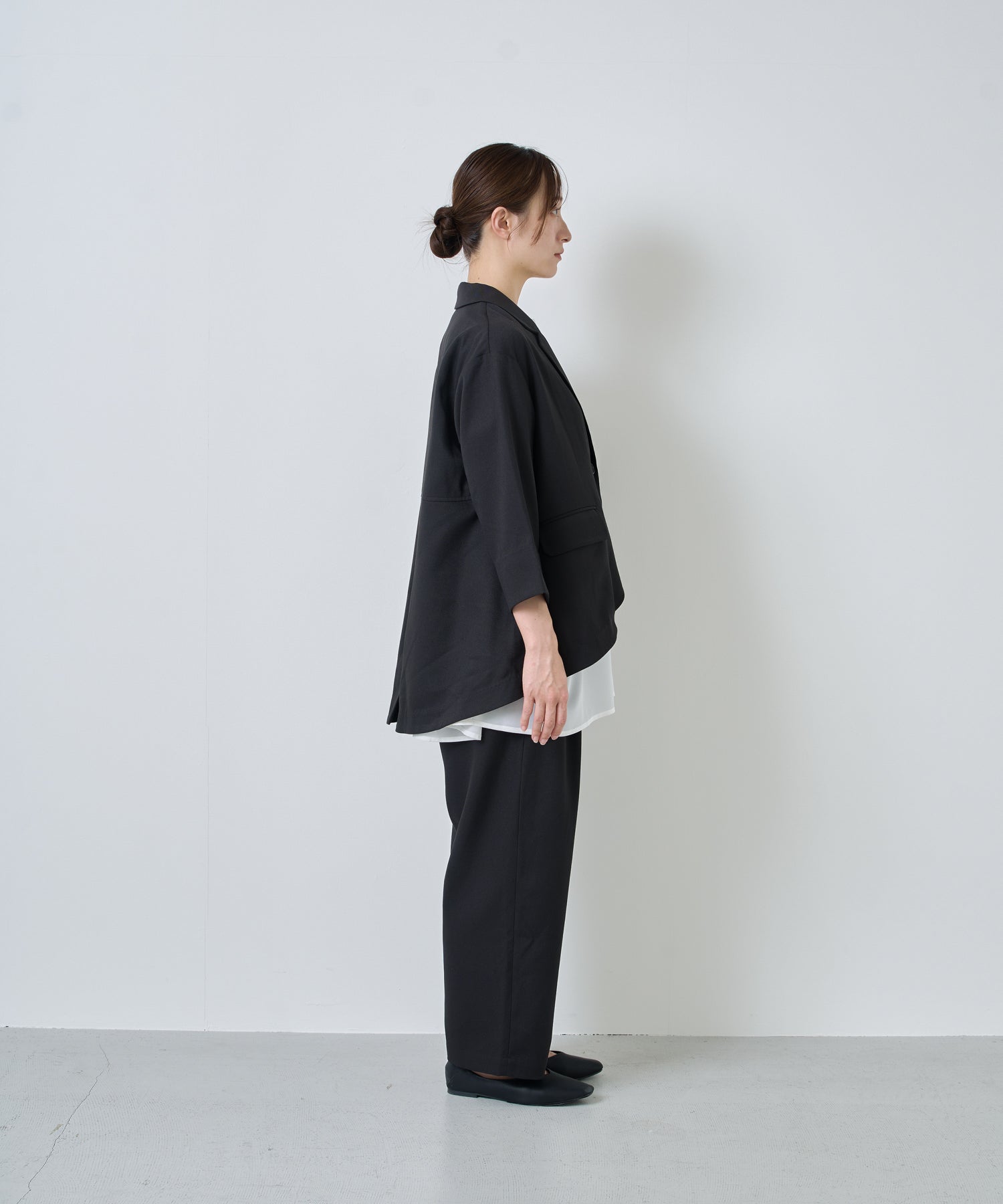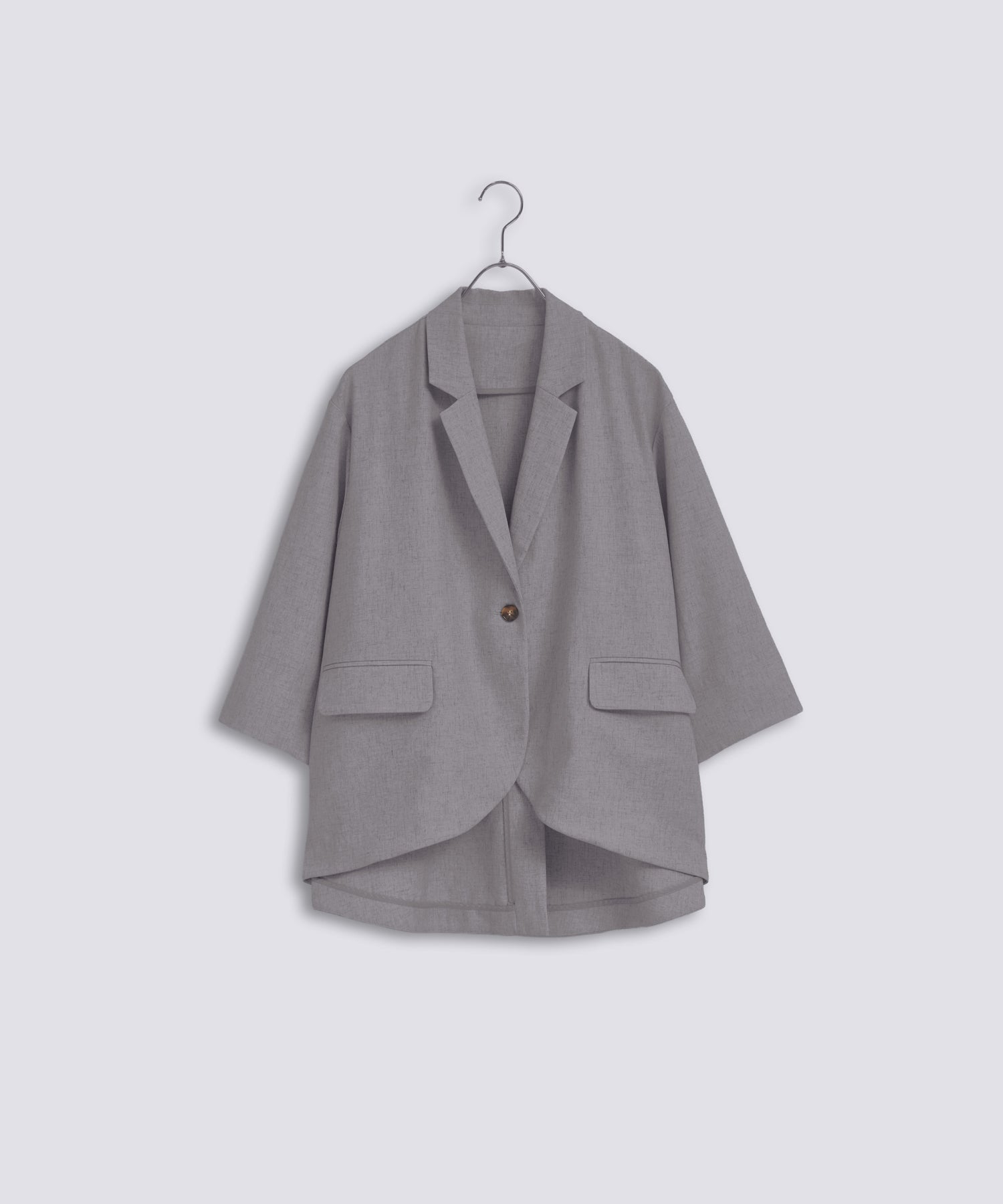前後丈感の違うデザインで、前身は細めのテーラード襟でスッキリとした印象。