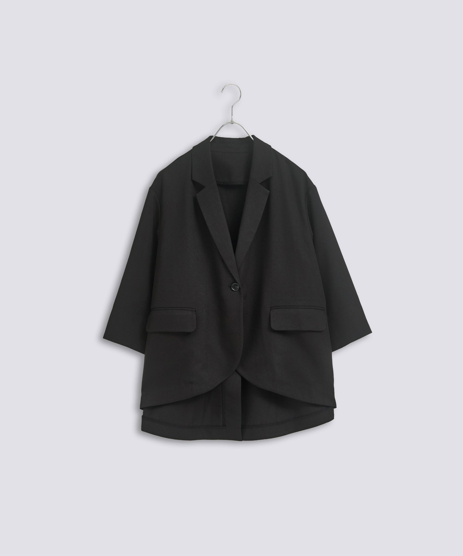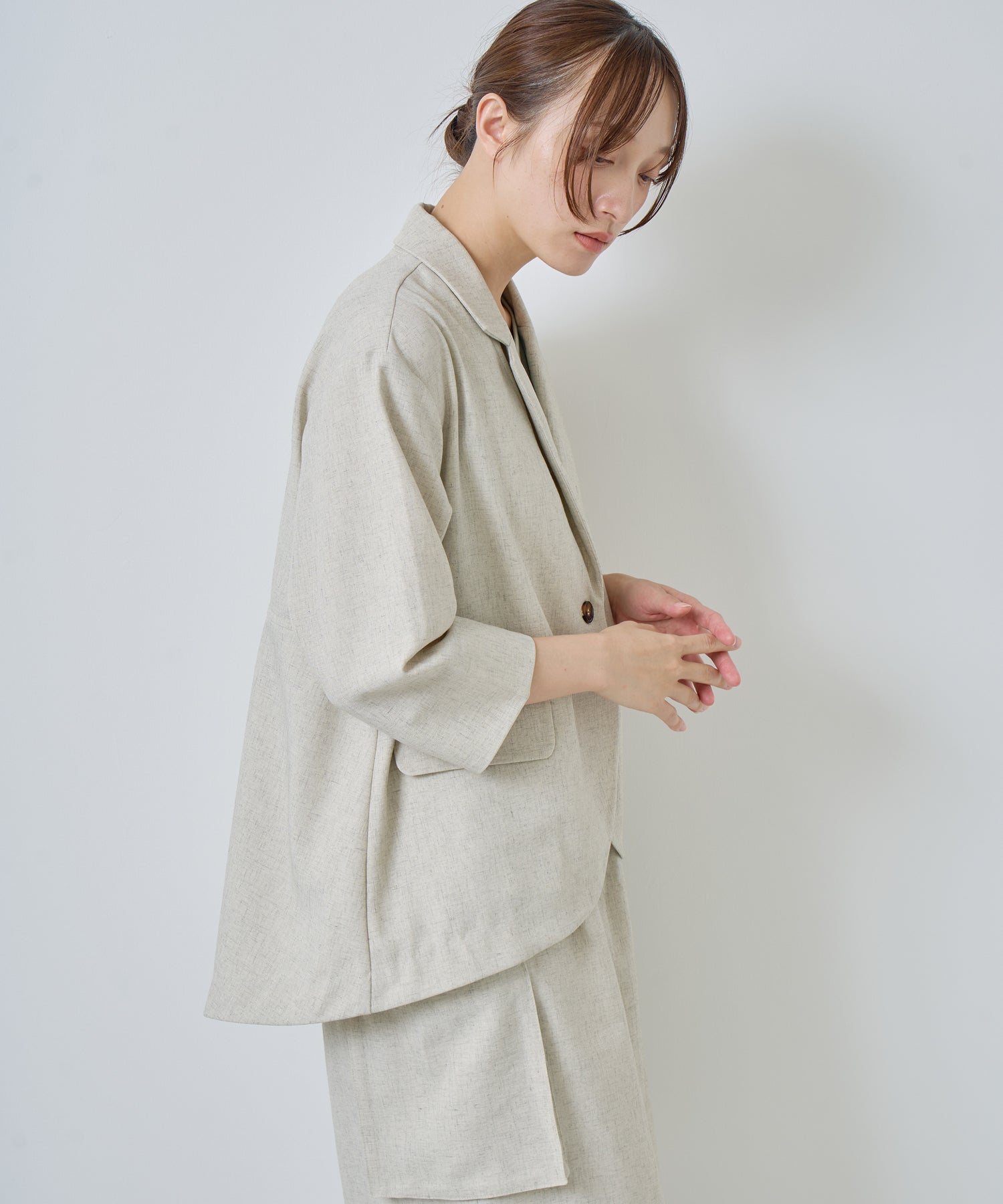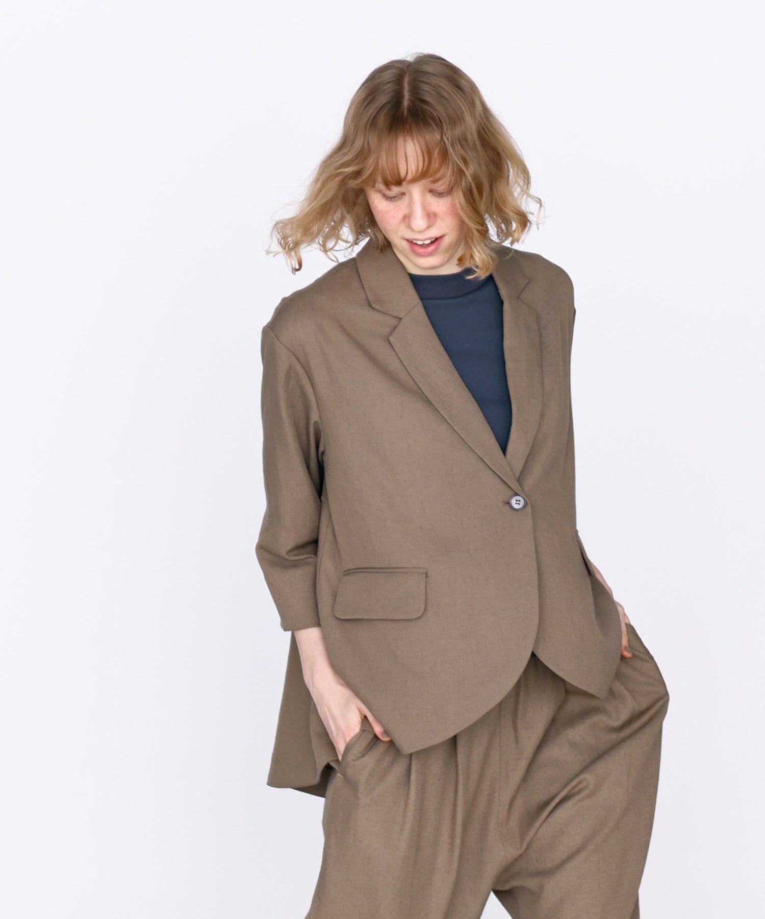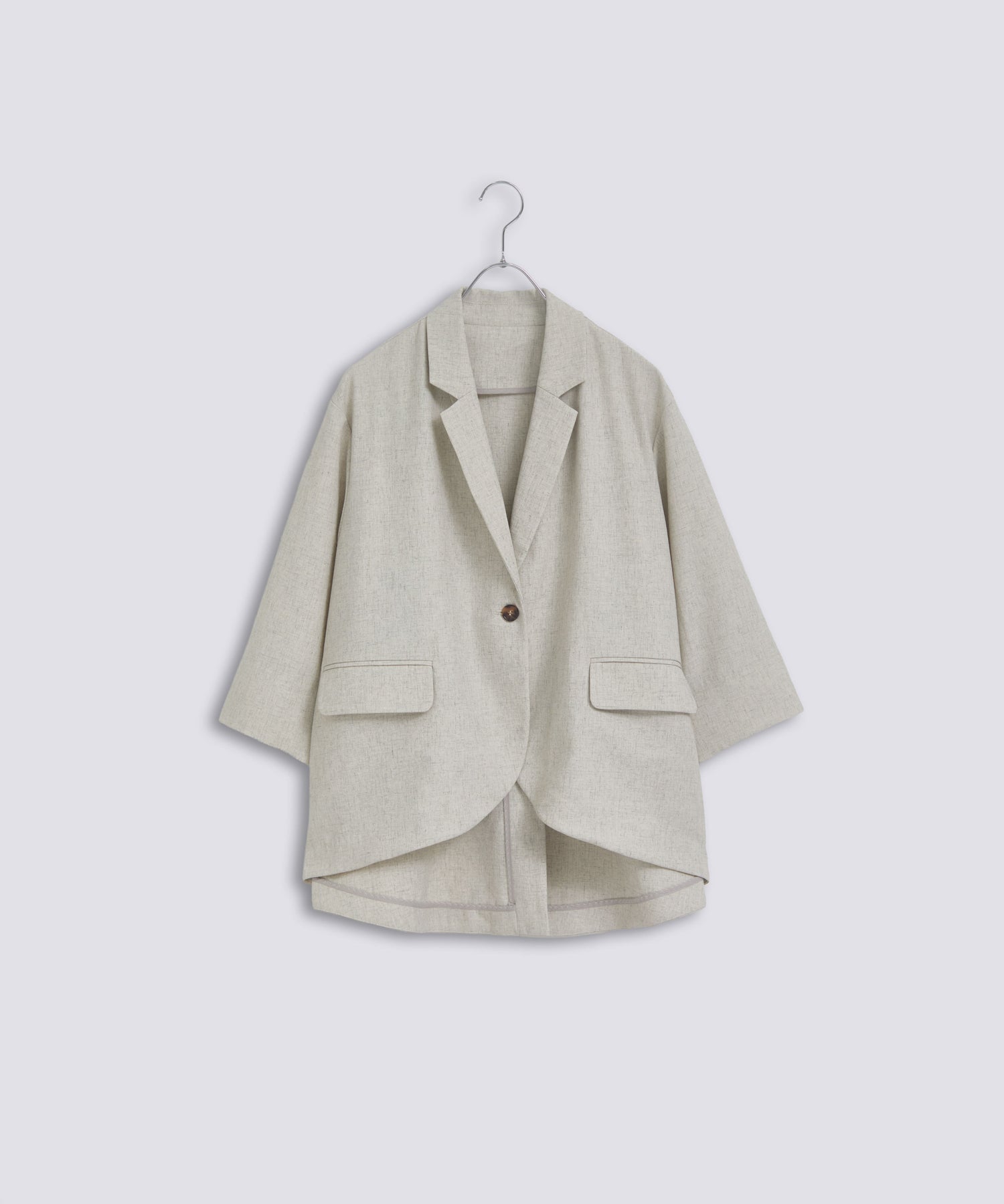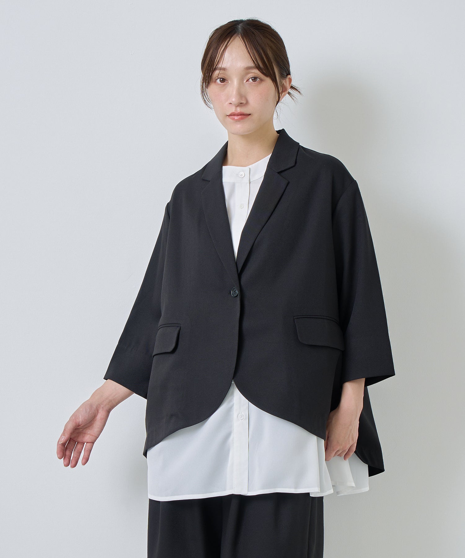 前後丈感の違うデザインで、前身は細めのテーラード襟でスッキリとした印象。