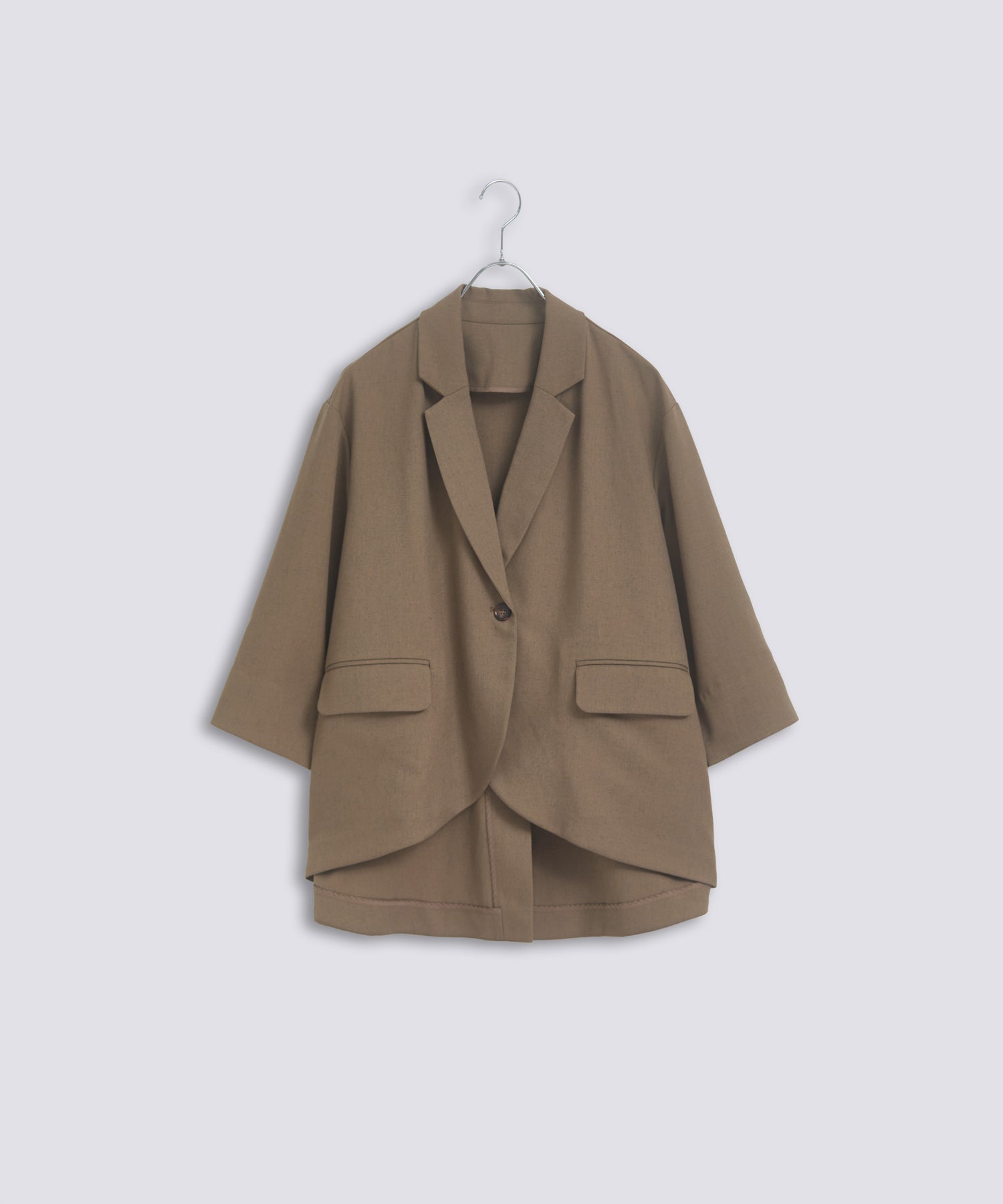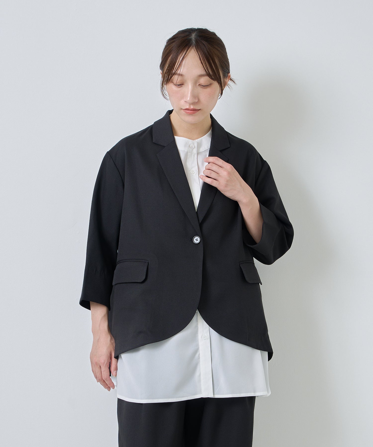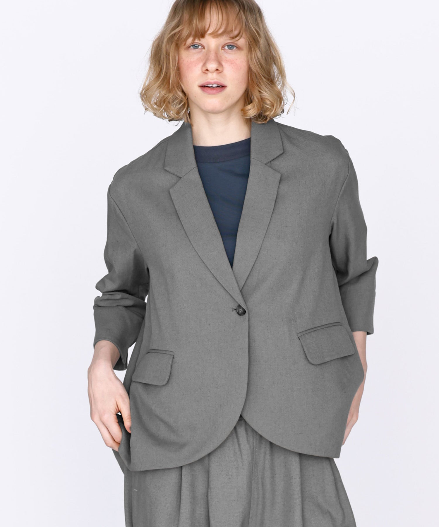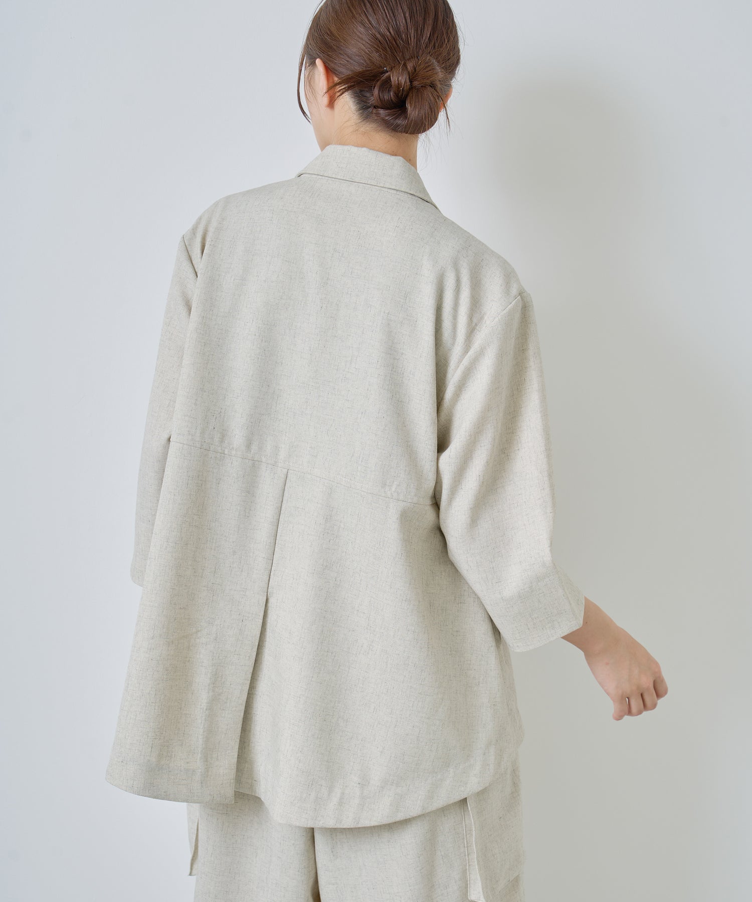 前後丈感の違うデザインで、前身は細めのテーラード襟でスッキリとした印象。