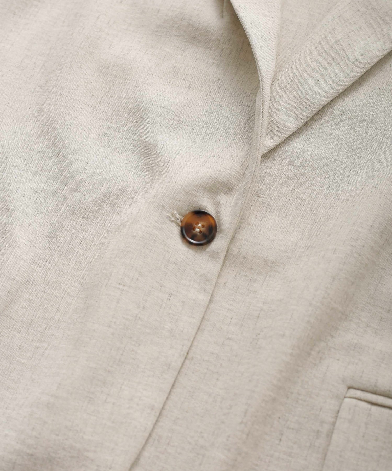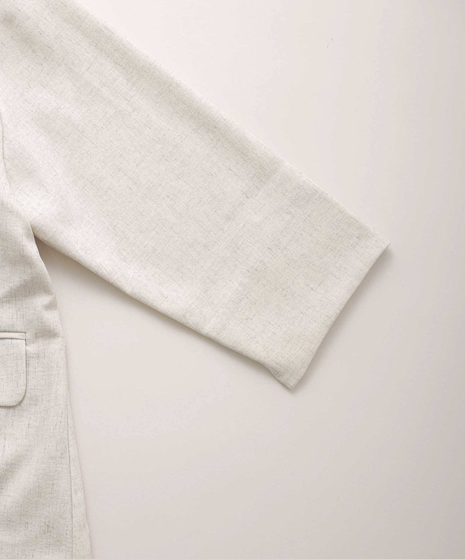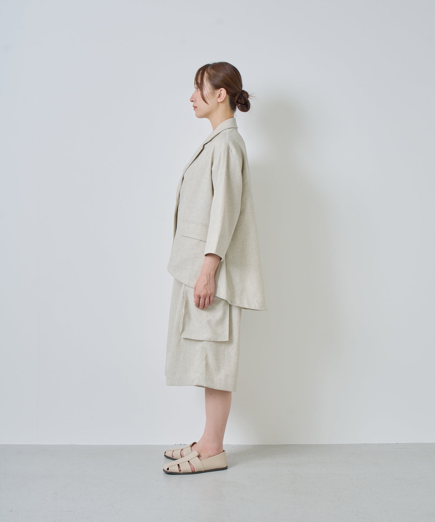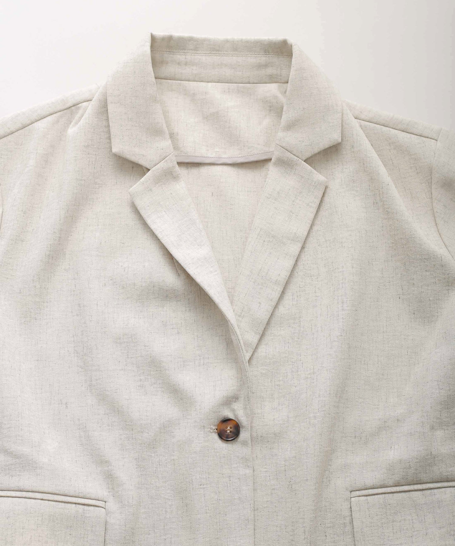 前後丈感の違うデザインで、前身は細めのテーラード襟でスッキリとした印象。