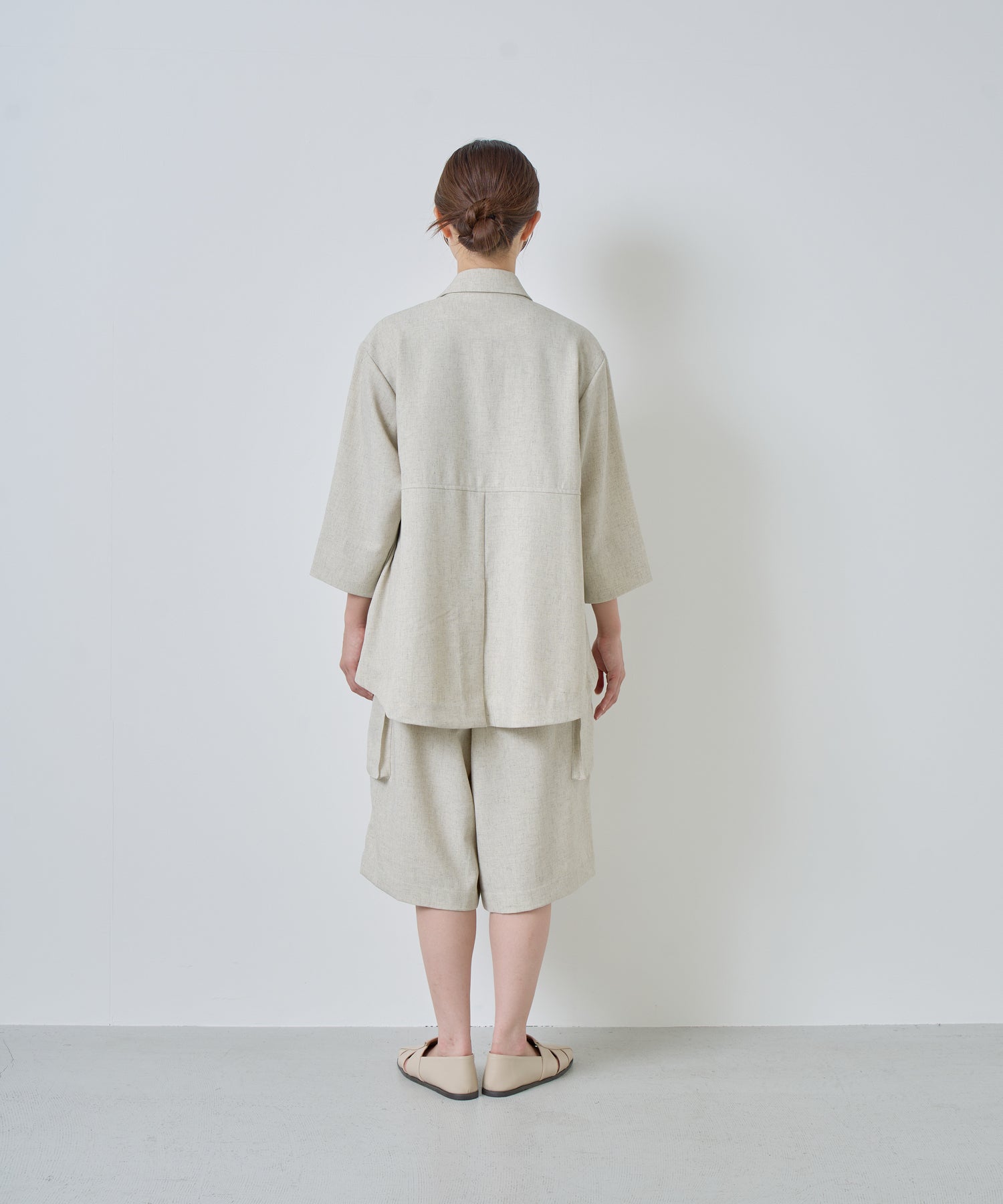 薄すぎない程よい厚みで落ち感があり、シワになりにくいリネン混の素材を使用。