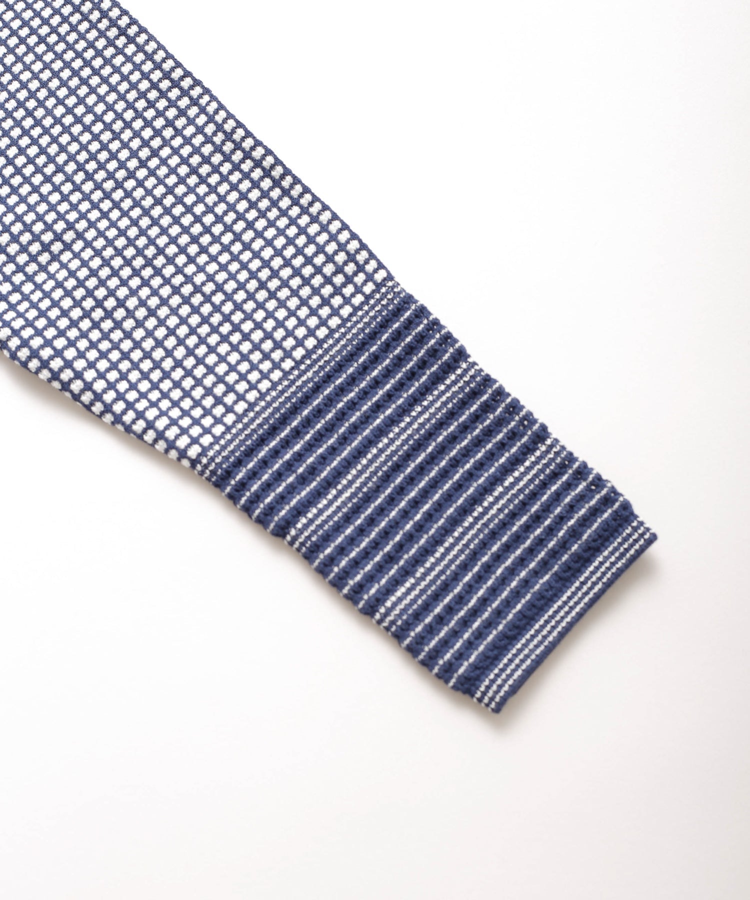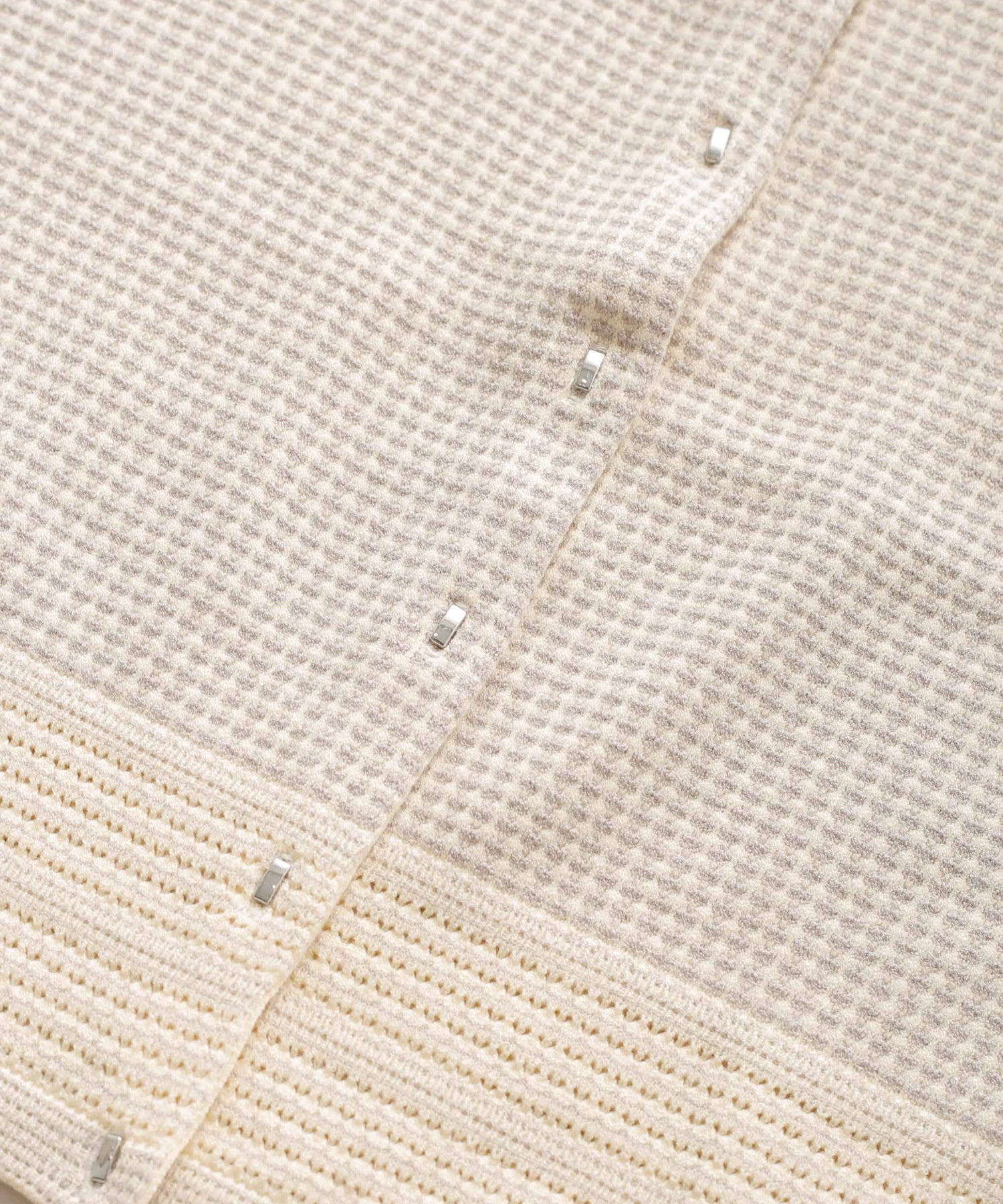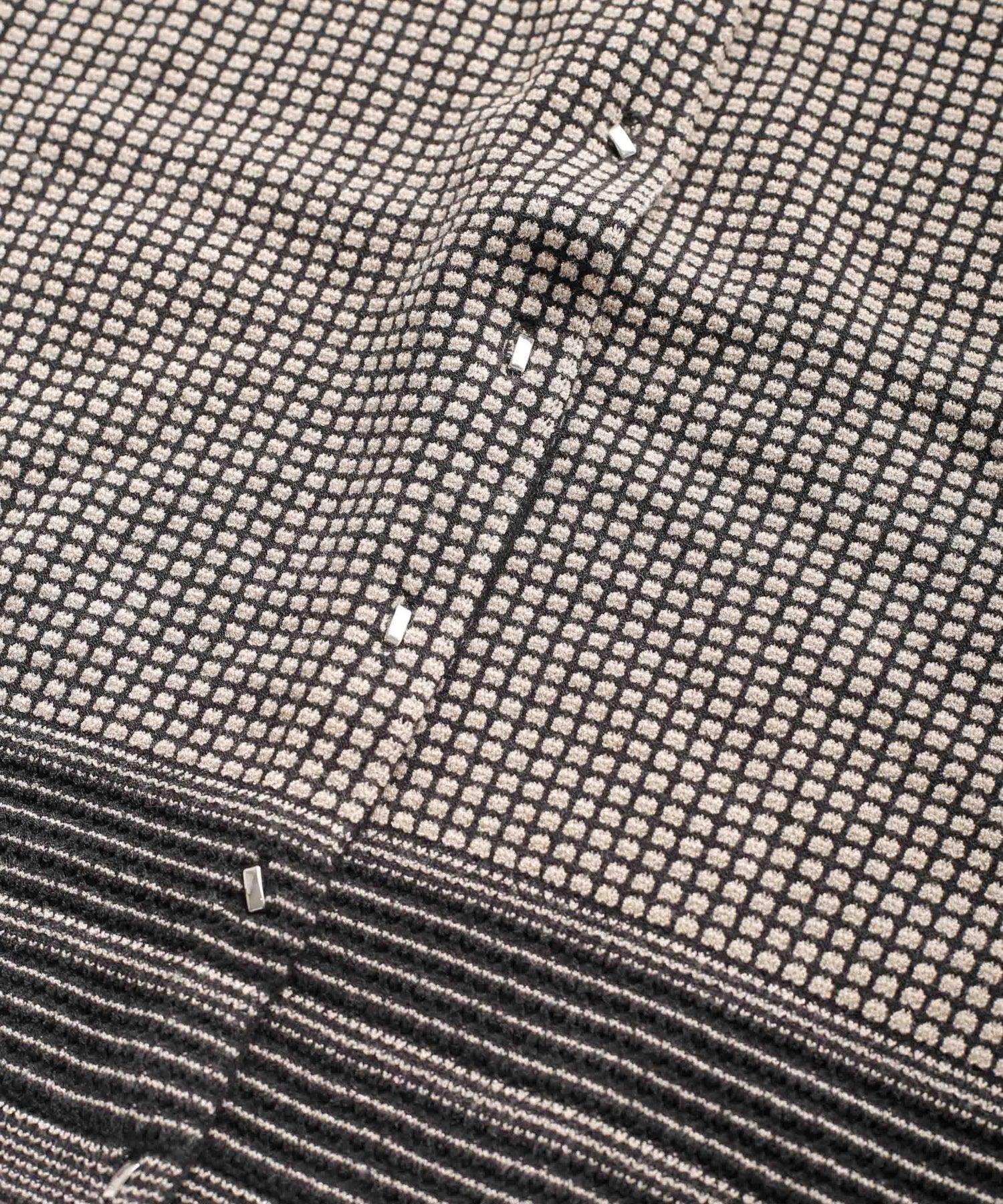 2色の糸を使用したバイカラーで、細かい格子柄や凹凸感のある編み地が立体感を演出しています。