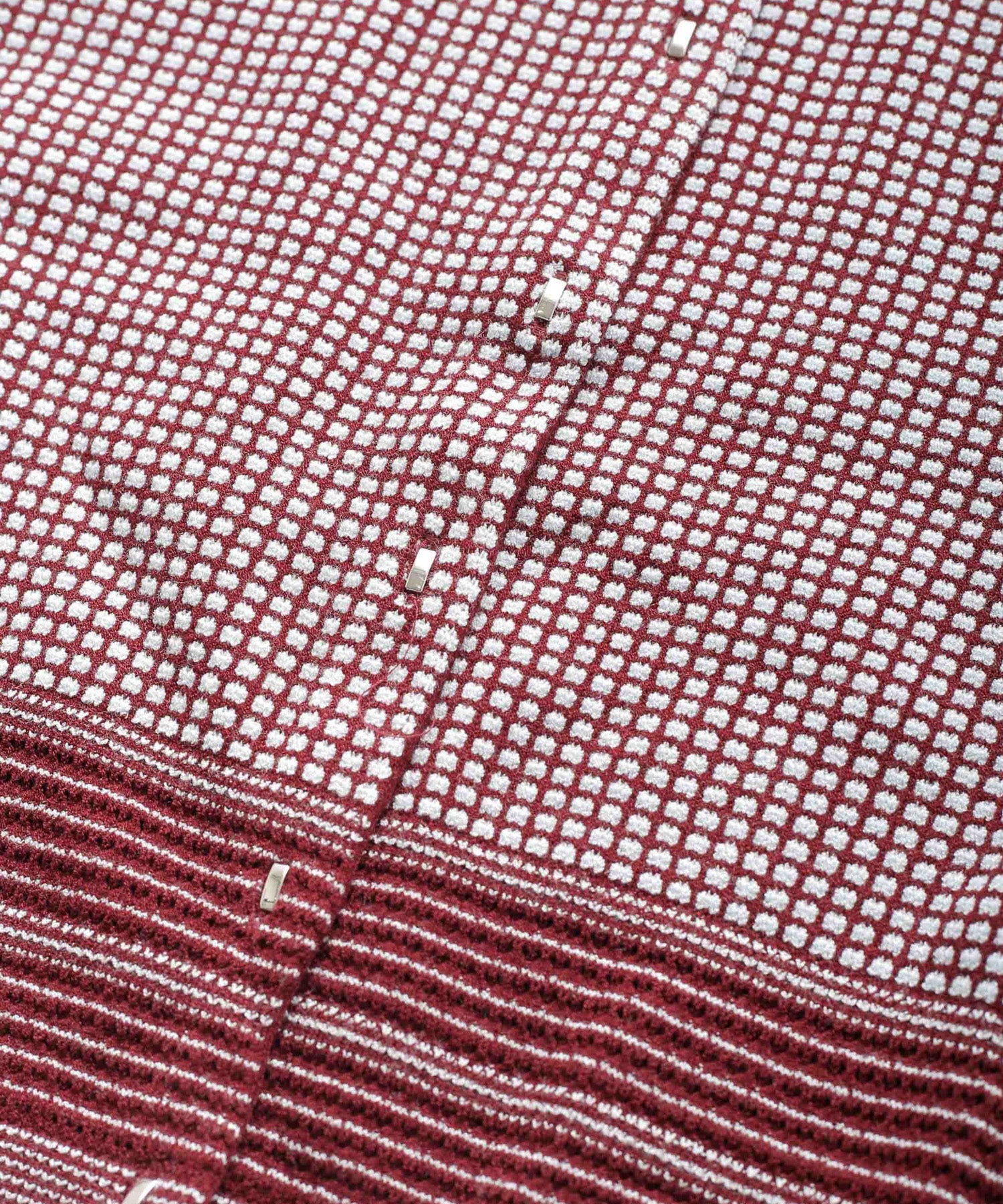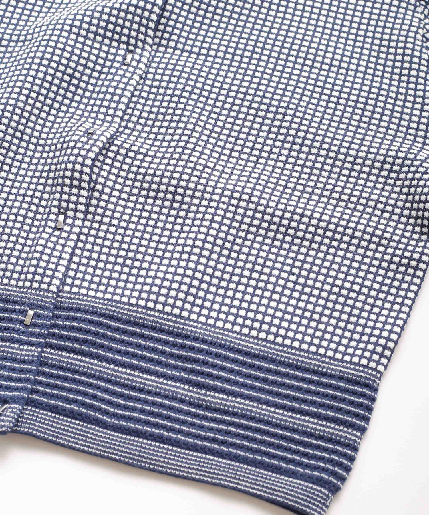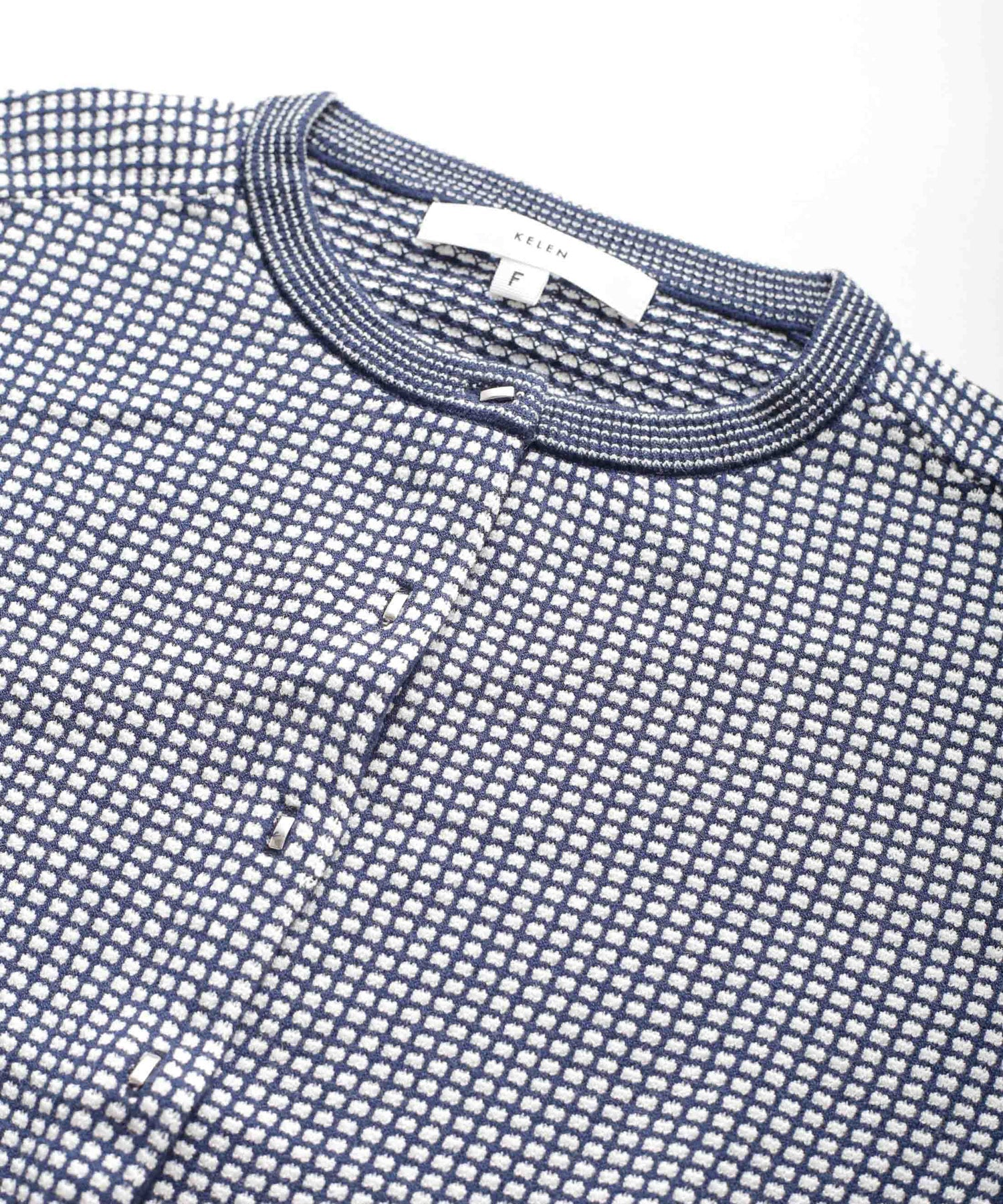 2色の糸を使用したバイカラーで、細かい格子柄や凹凸感のある編み地が立体感を演出しています。