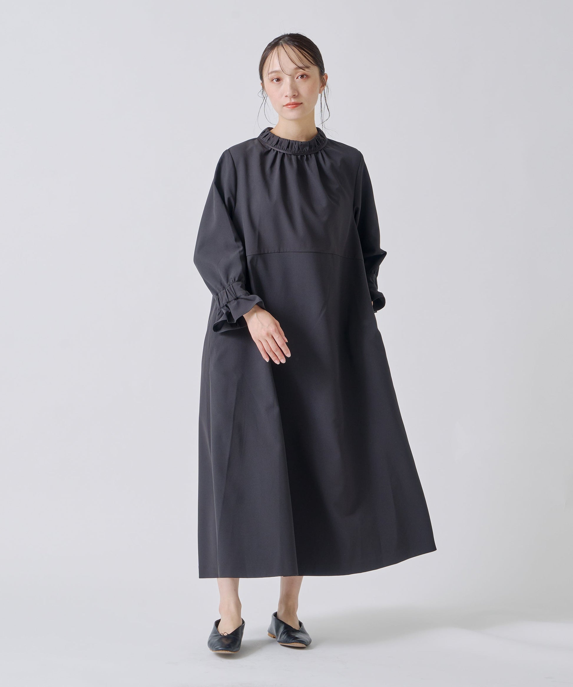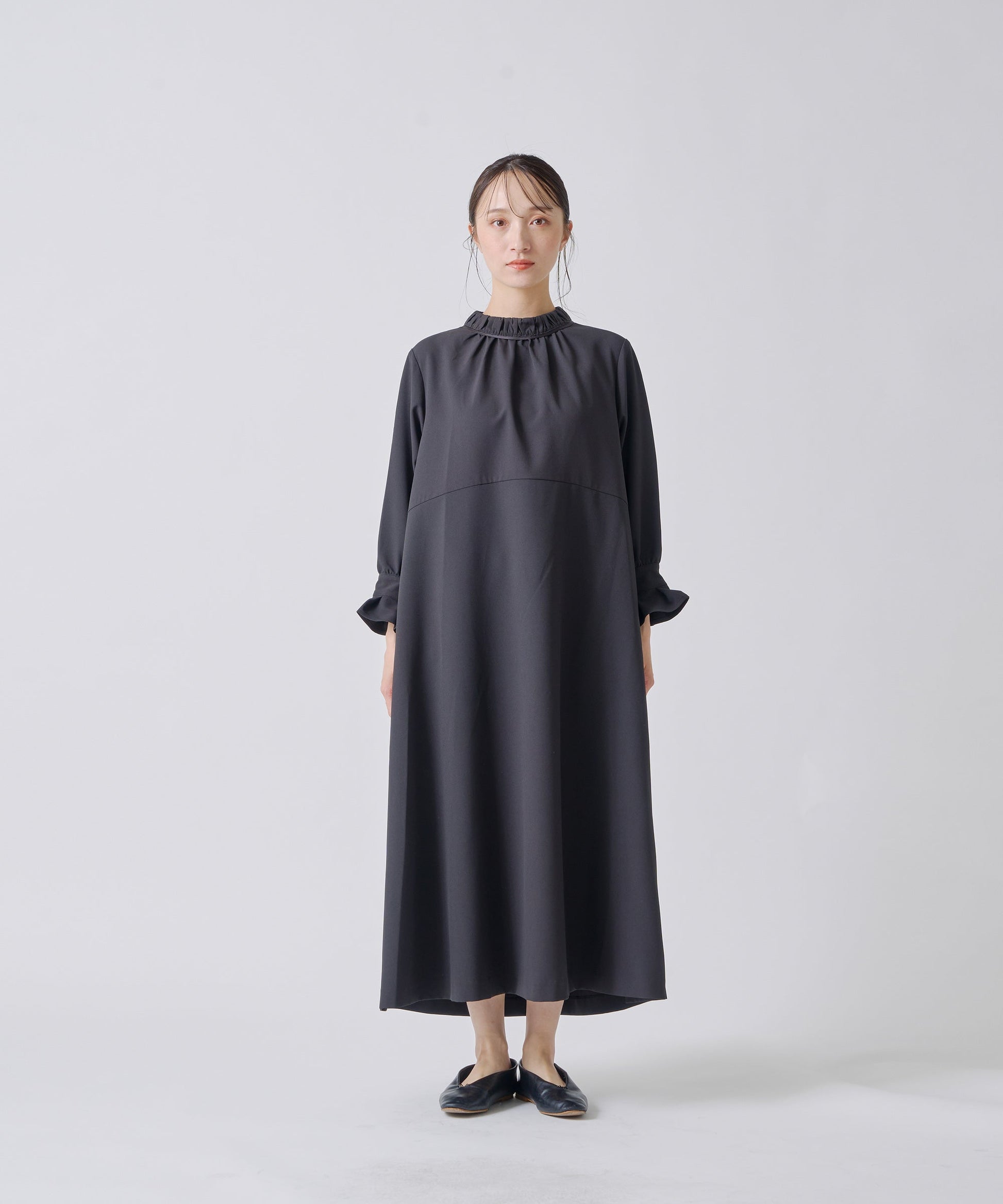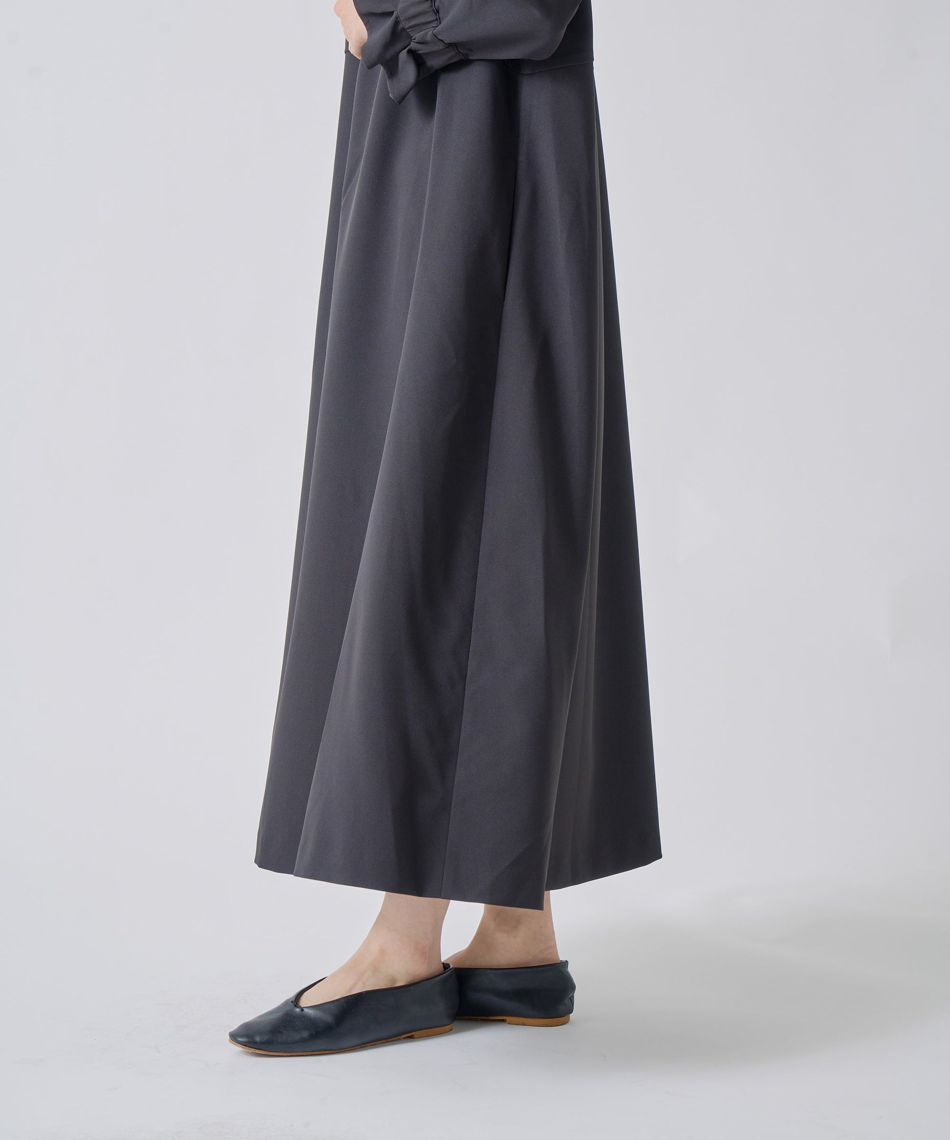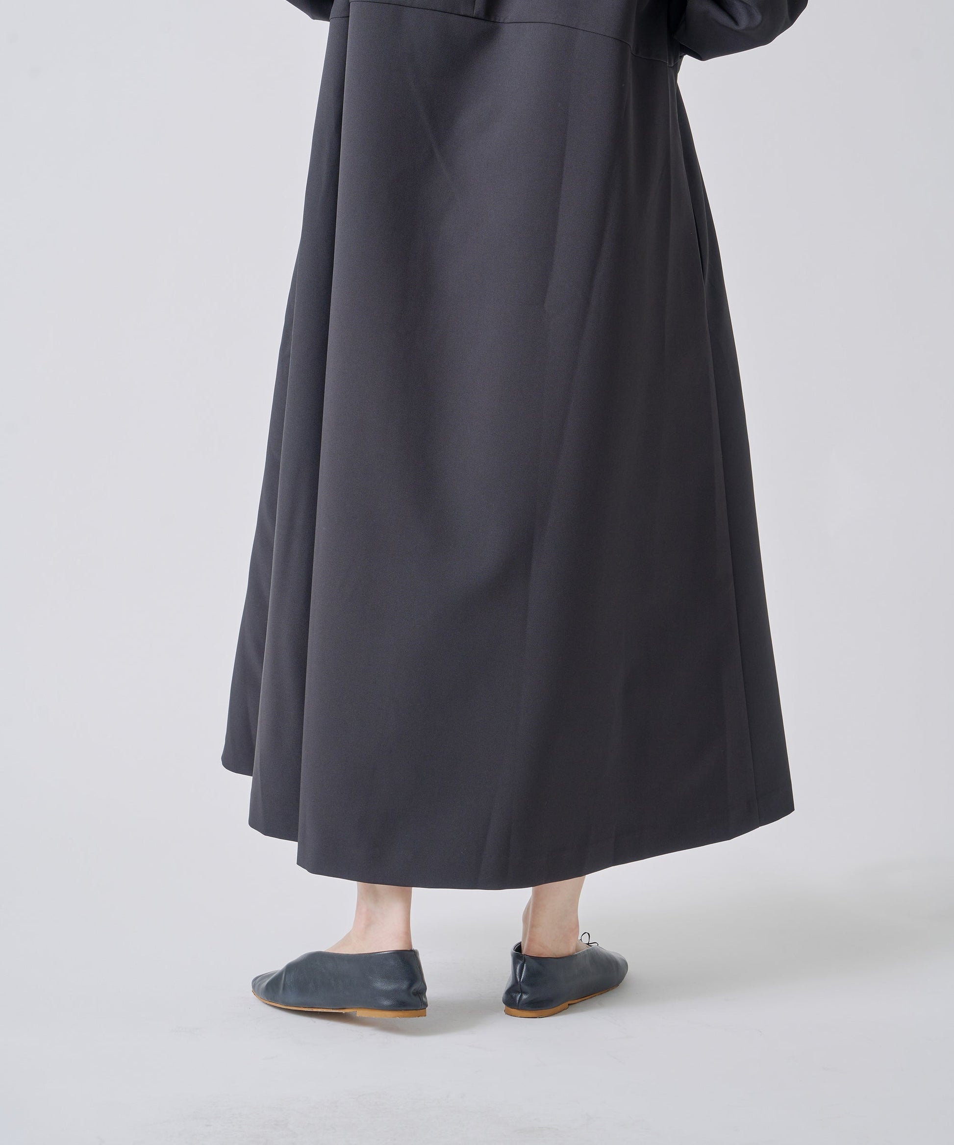 高めのウエスト切り替え位置から裾に向かって緩やかに広がるフレアシルエットで、身体のラインを拾いません。