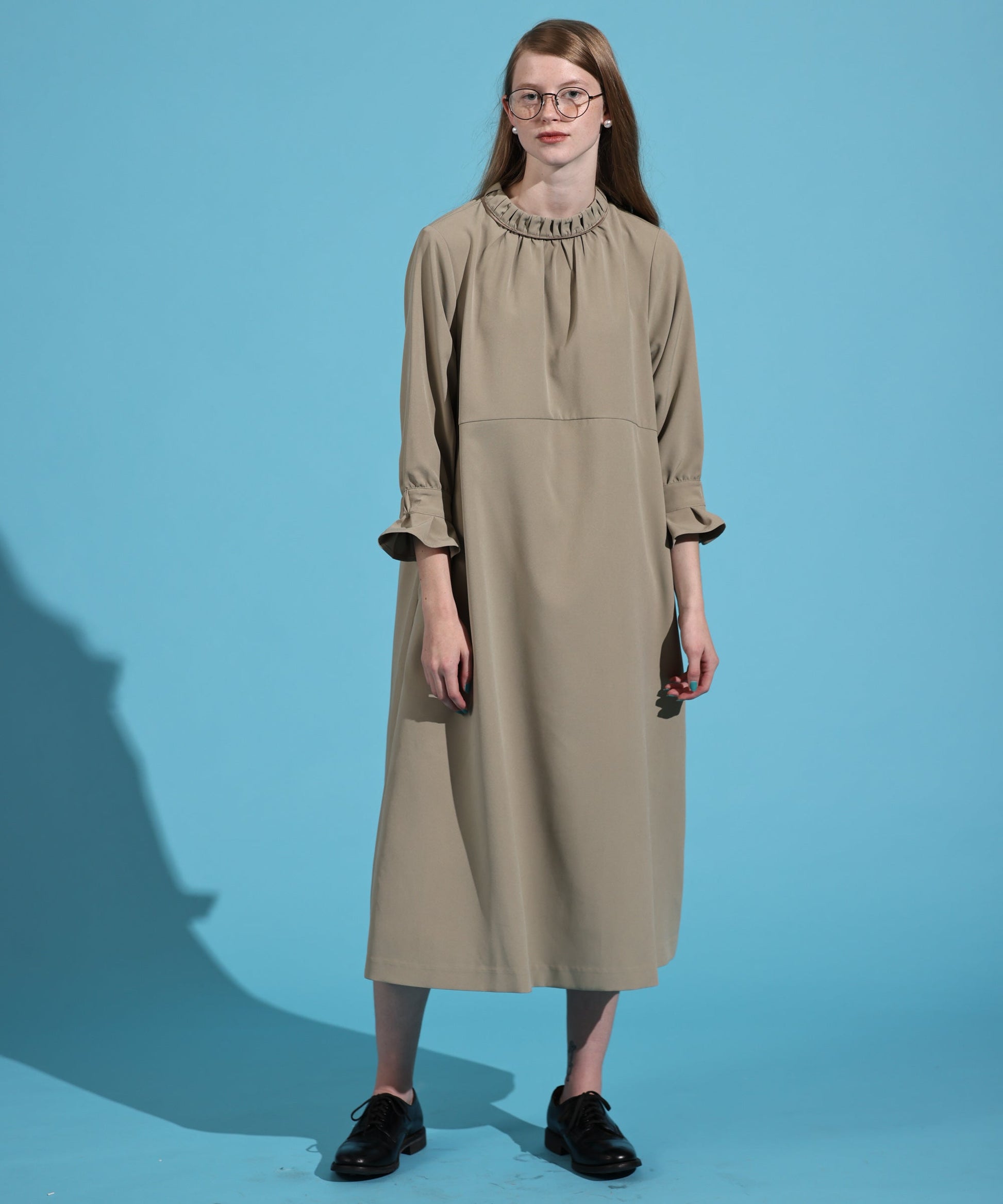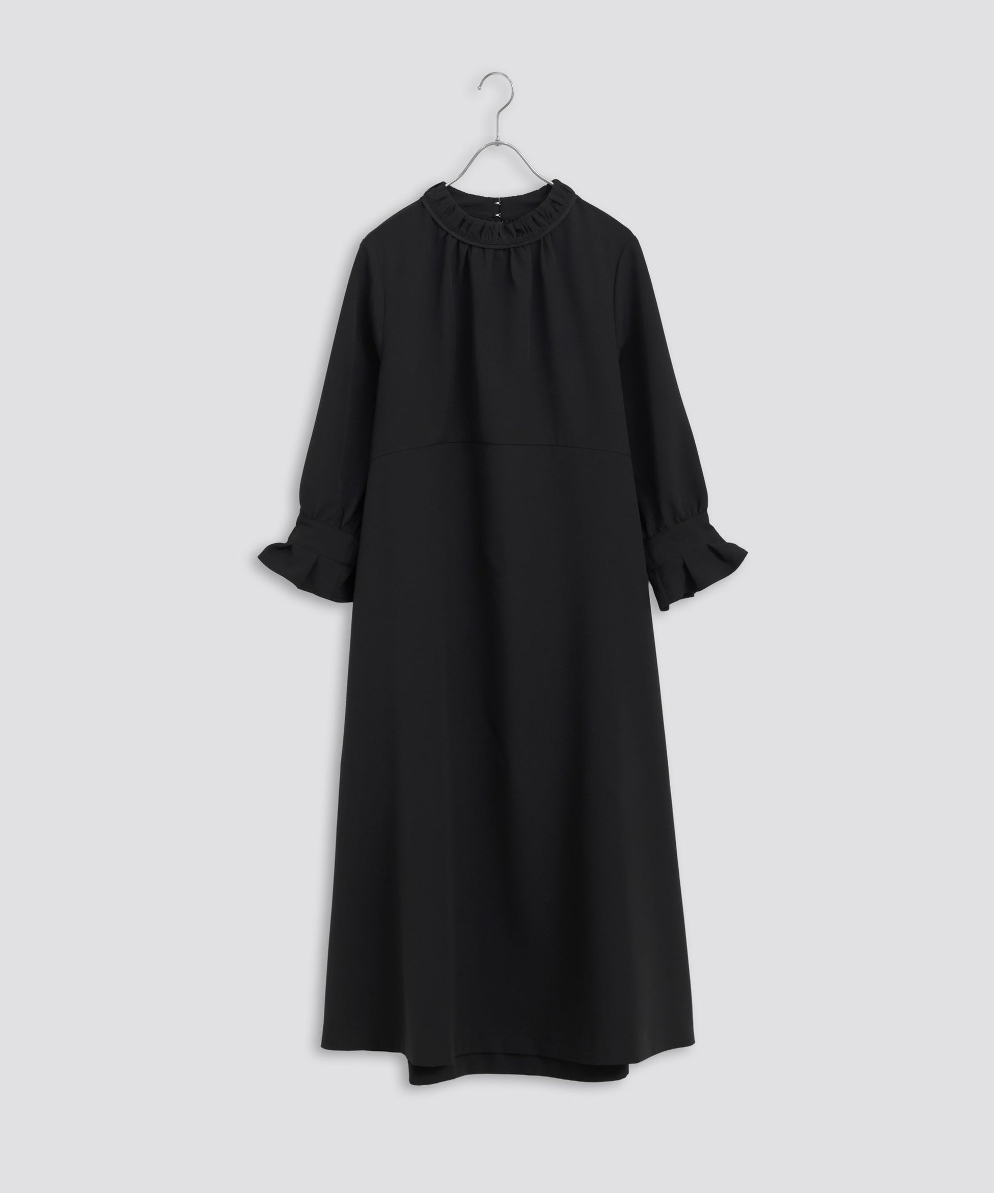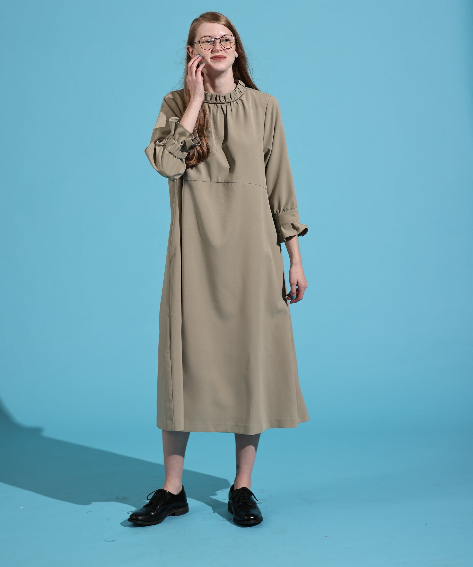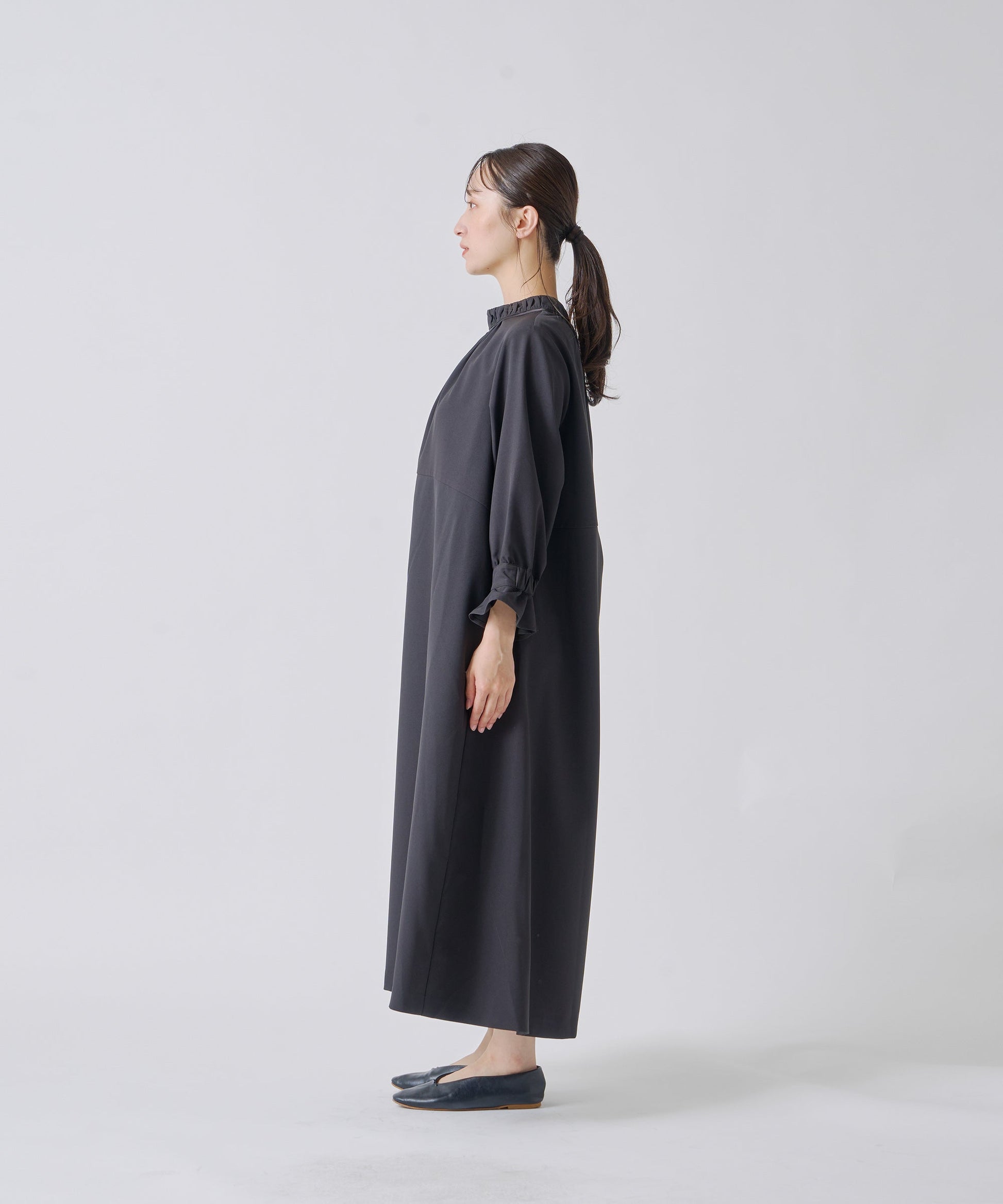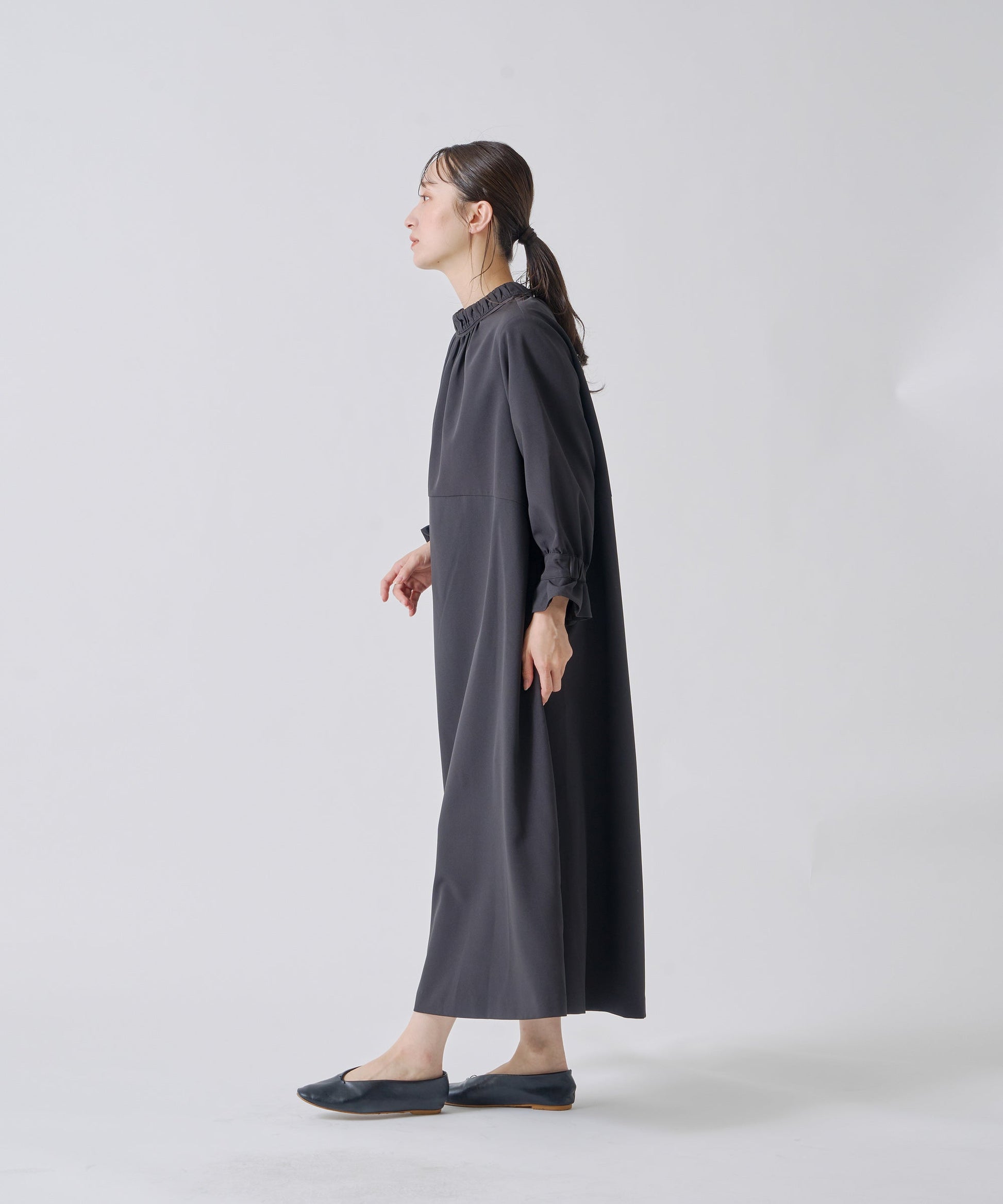 高めのウエスト切り替え位置から裾に向かって緩やかに広がるフレアシルエットで、身体のラインを拾いません。