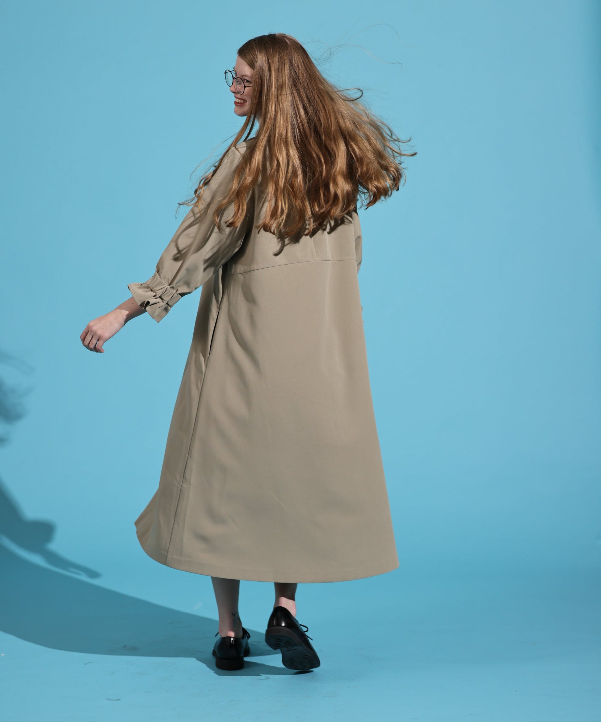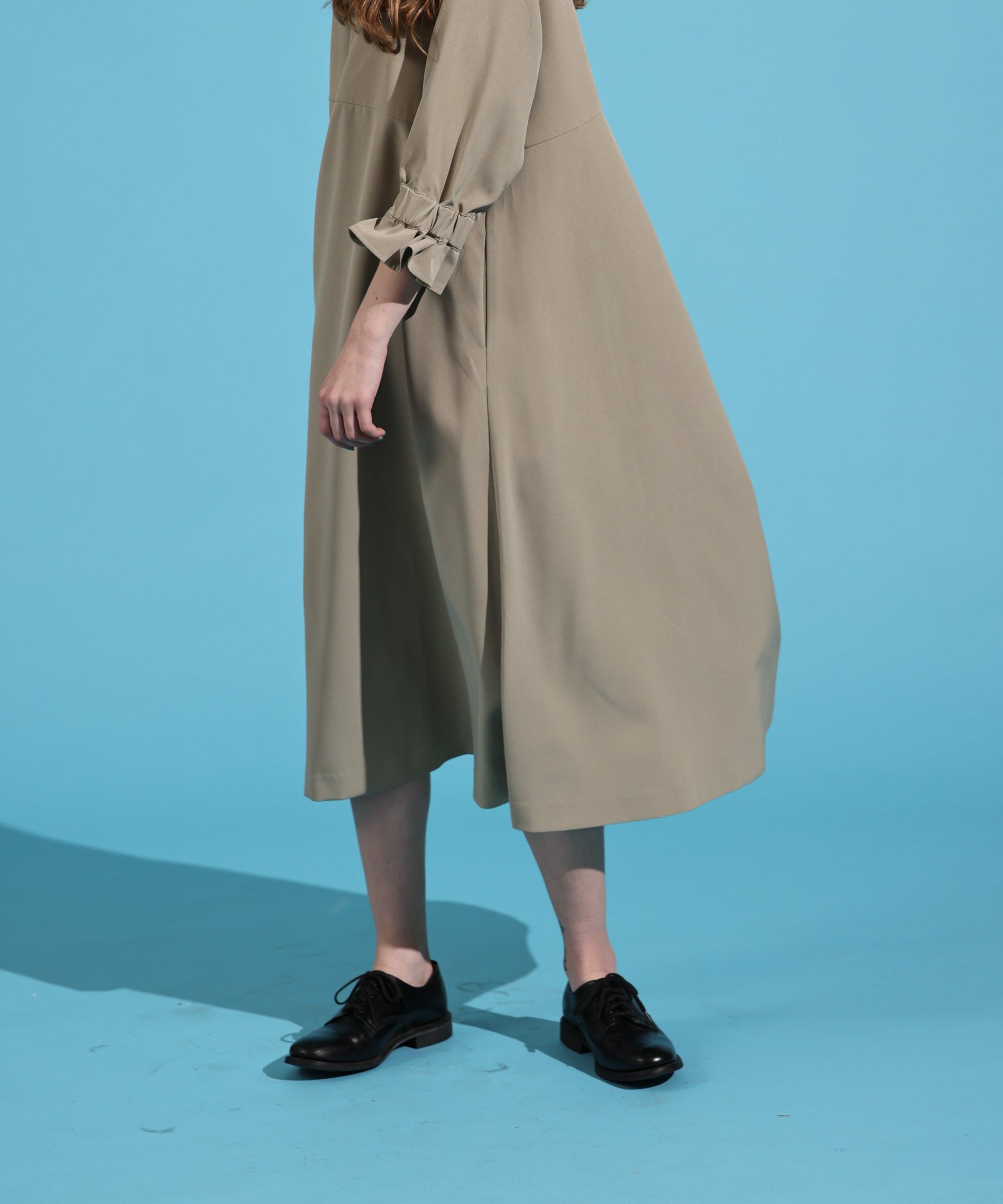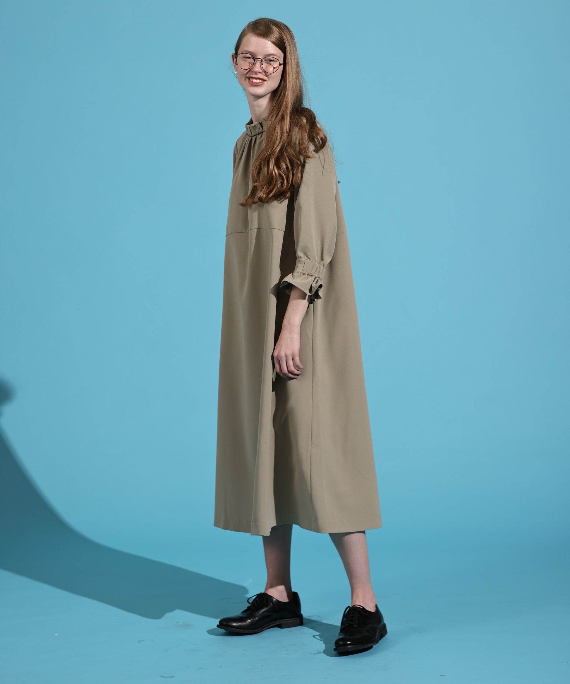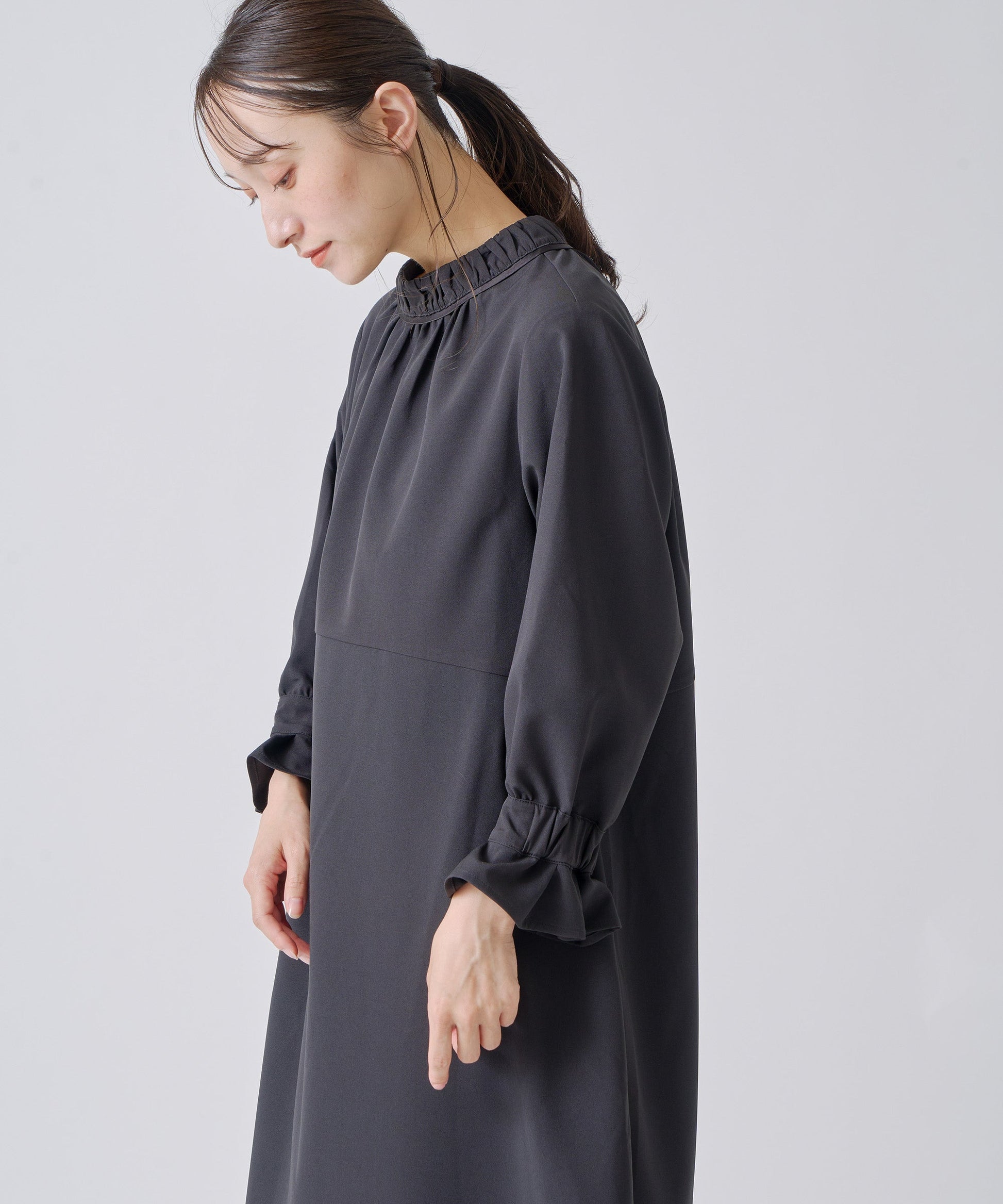 高めのウエスト切り替え位置から裾に向かって緩やかに広がるフレアシルエットで、身体のラインを拾いません。