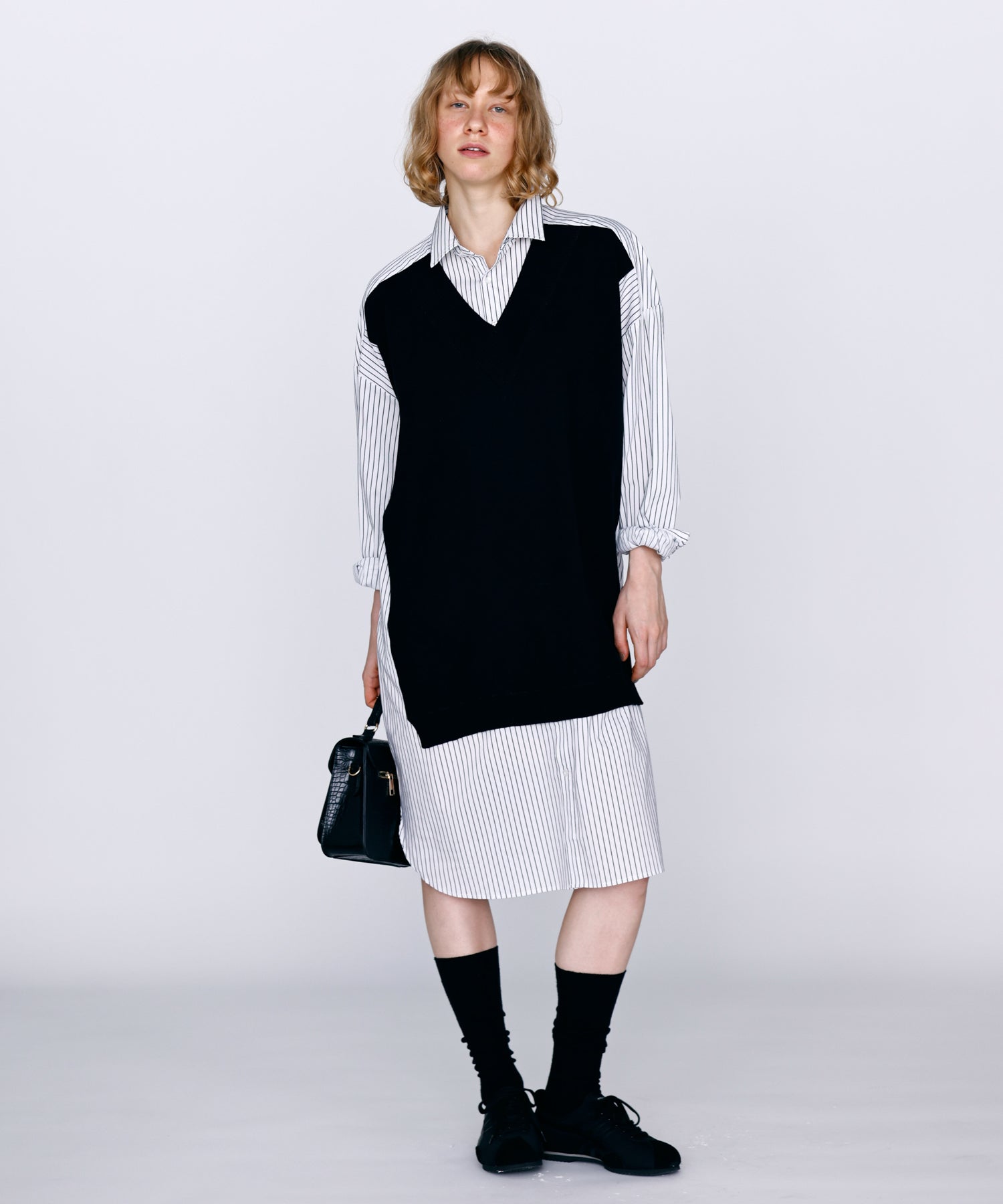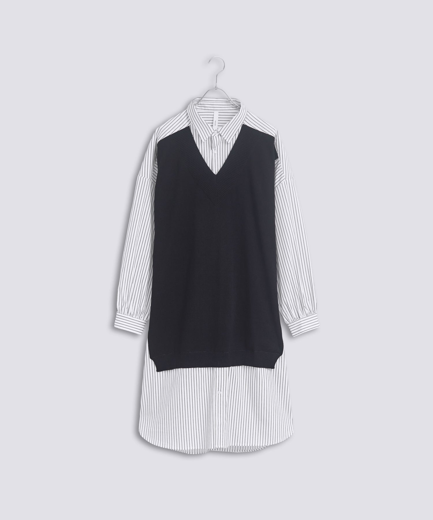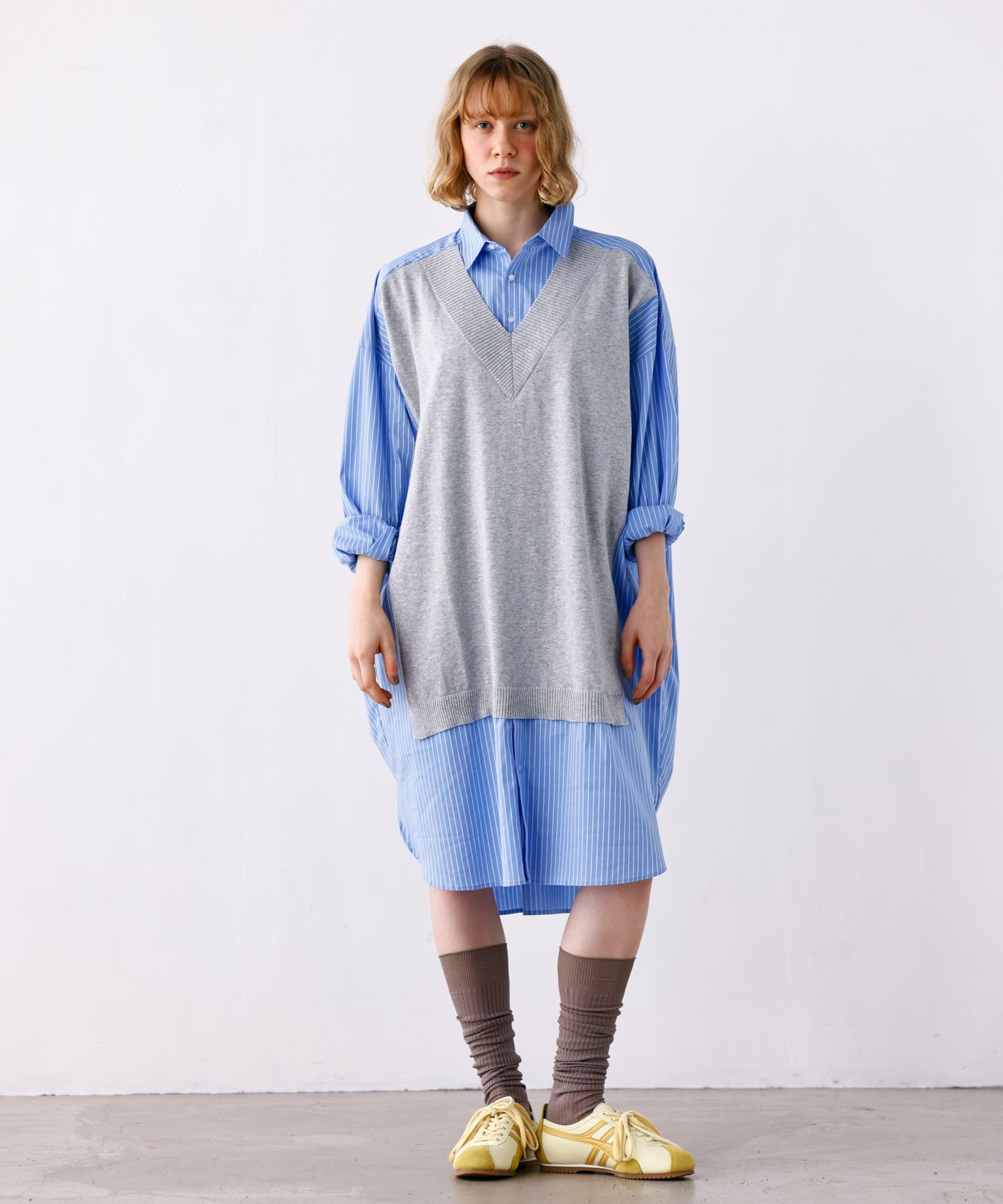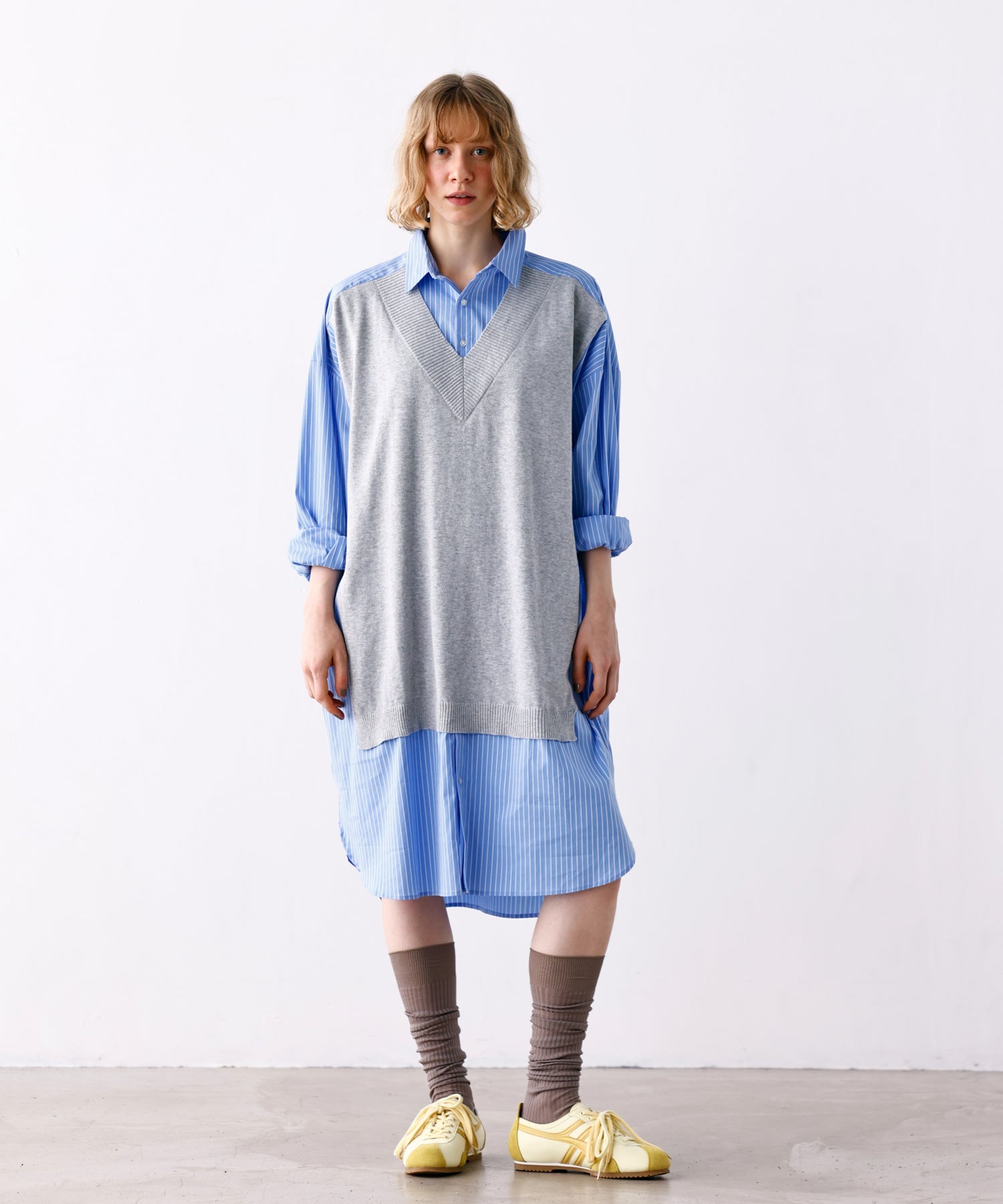 ニットベスト重ね着風ストライプシャツワンピース APOLU