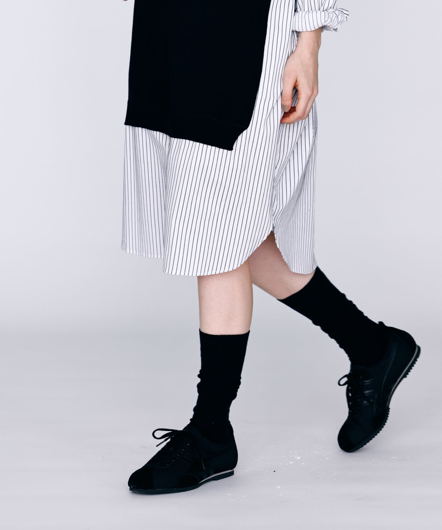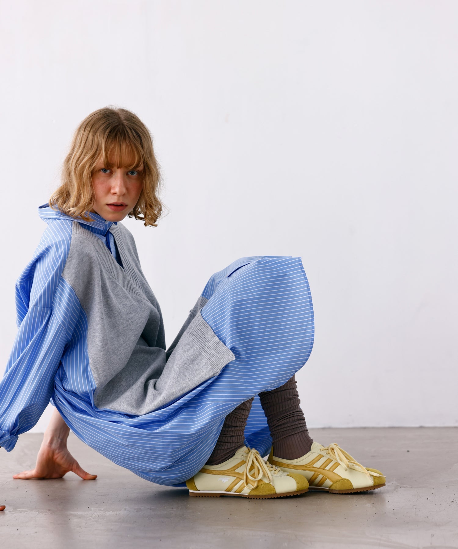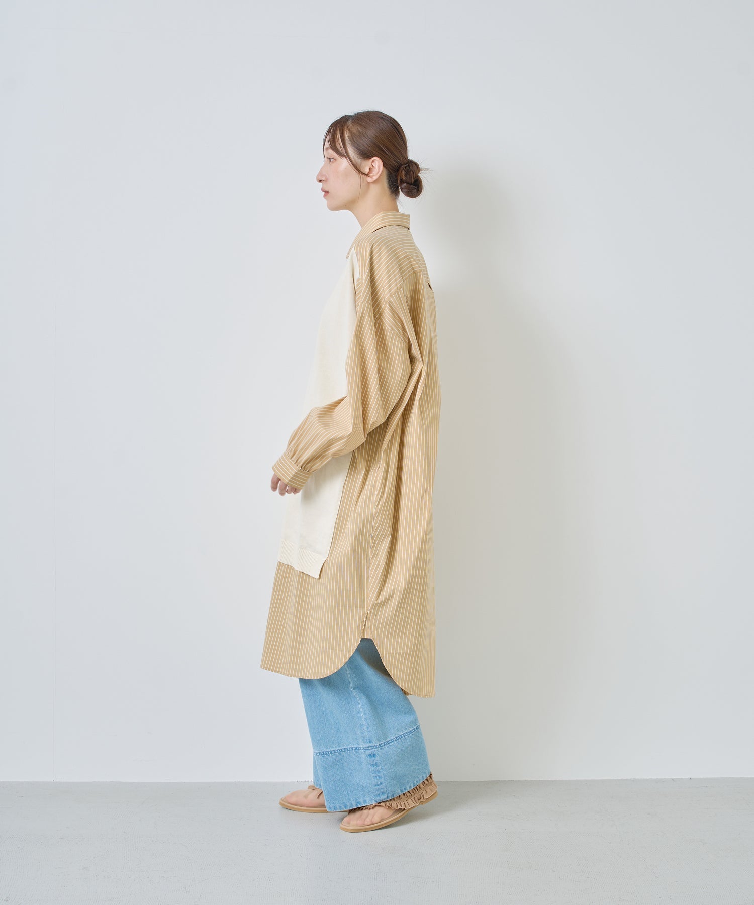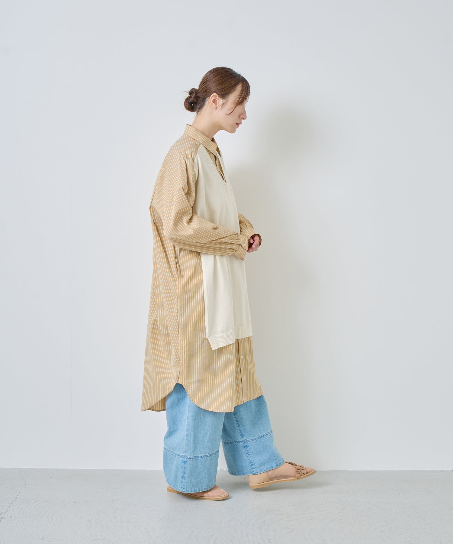 ストライプのシャツワンピースにVネックのニットを重ねていますが、脇までは配さず、すっきりと見えるようにデザインしています。