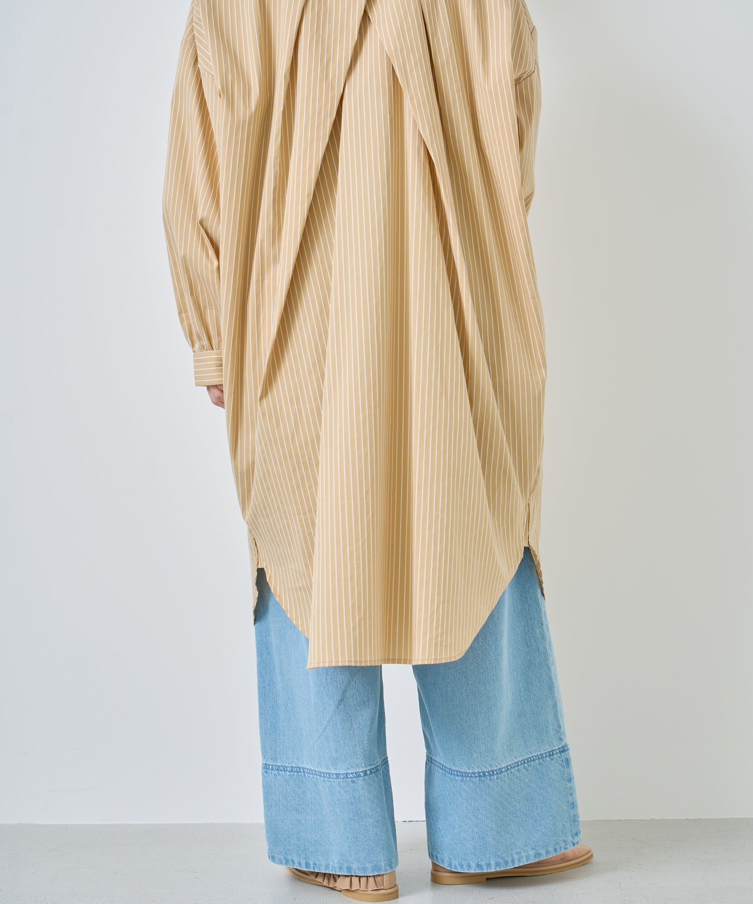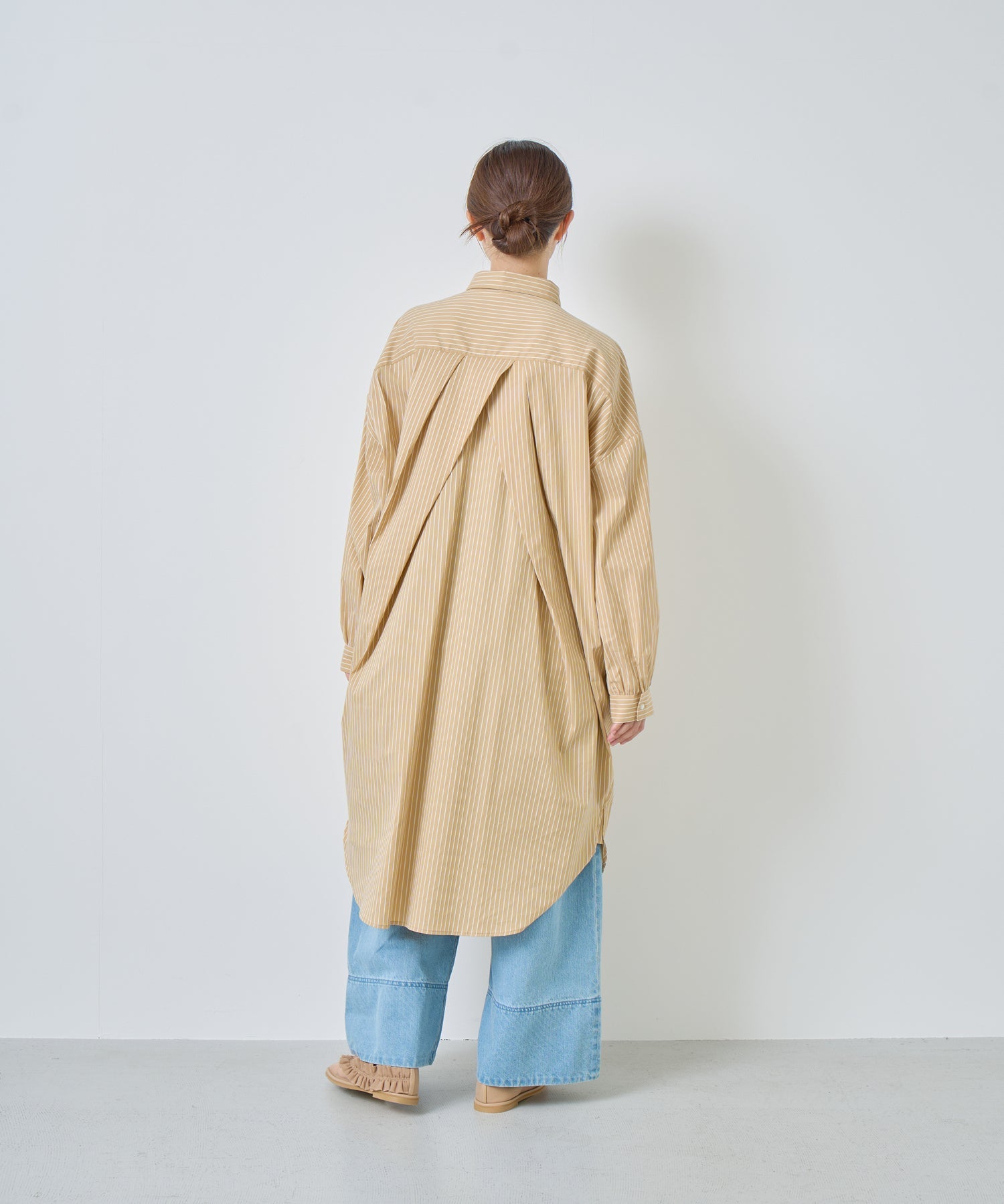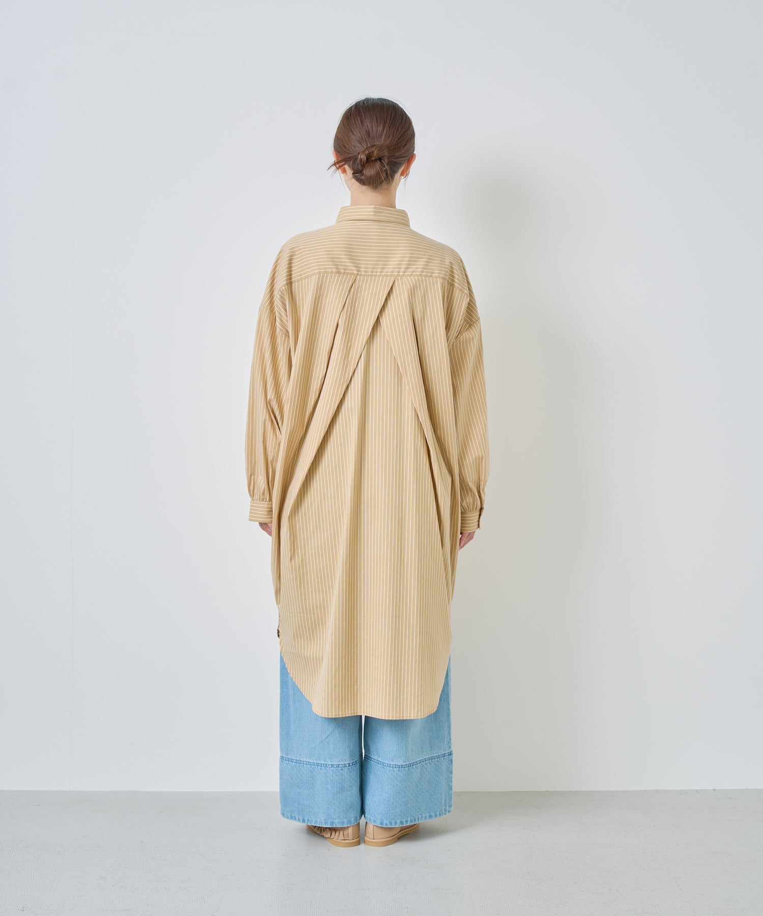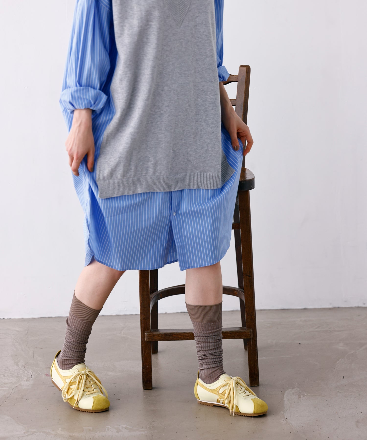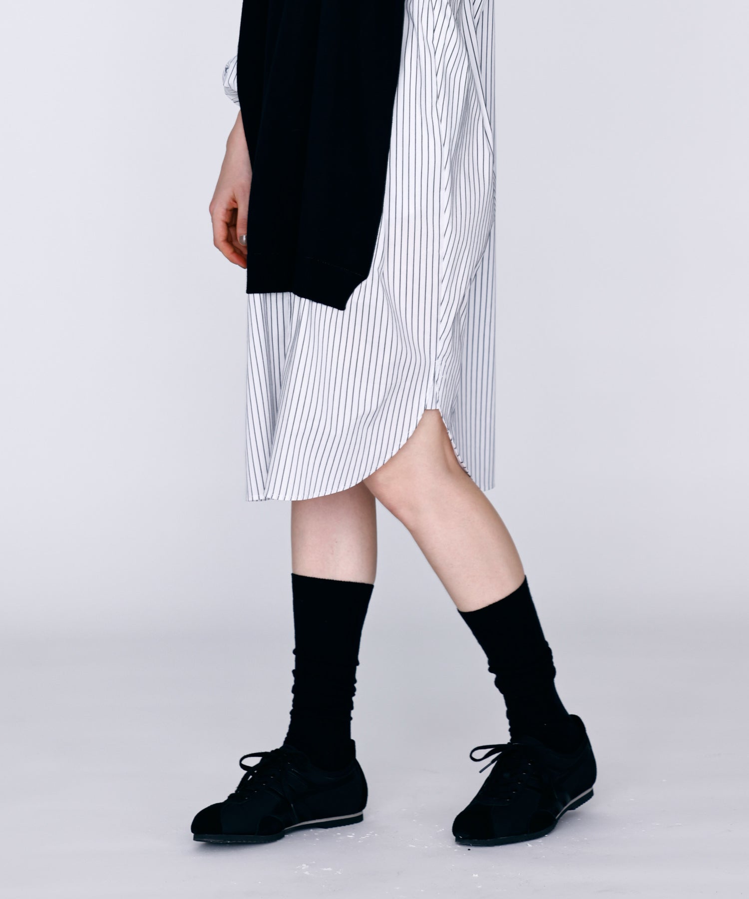 ストライプのシャツワンピースにVネックのニットを重ねていますが、脇までは配さず、すっきりと見えるようにデザインしています。