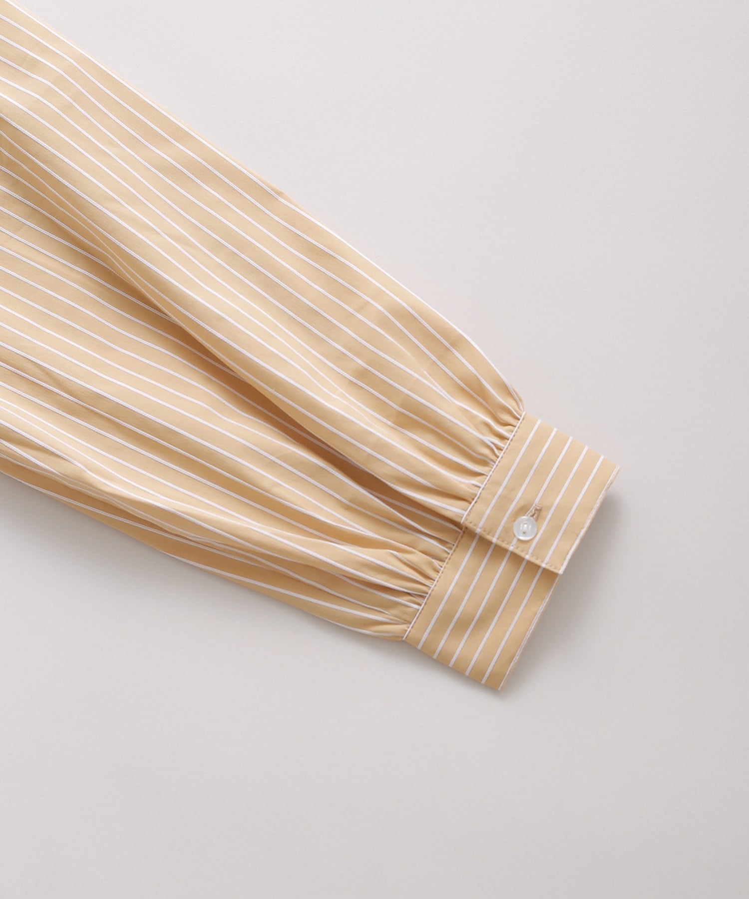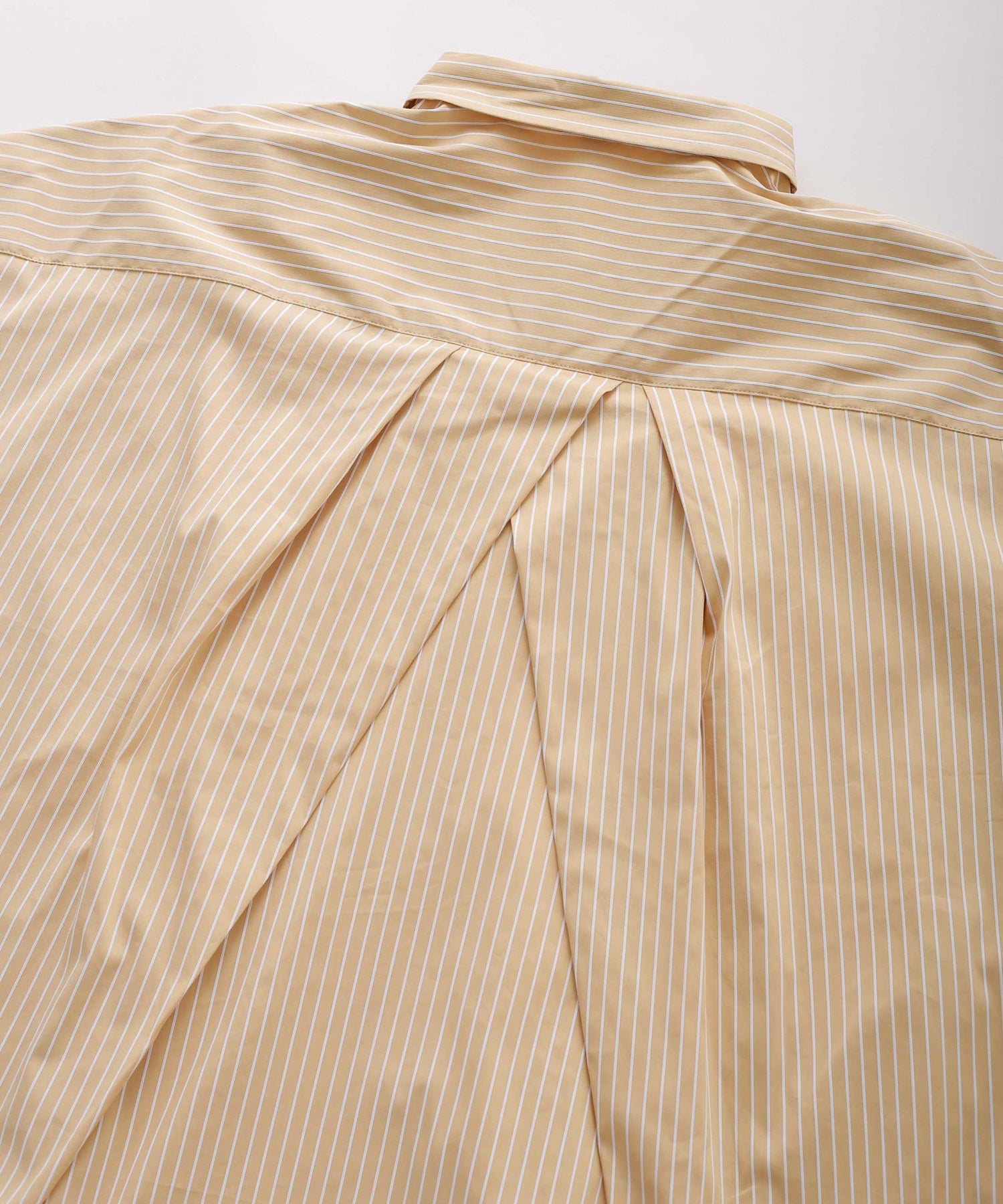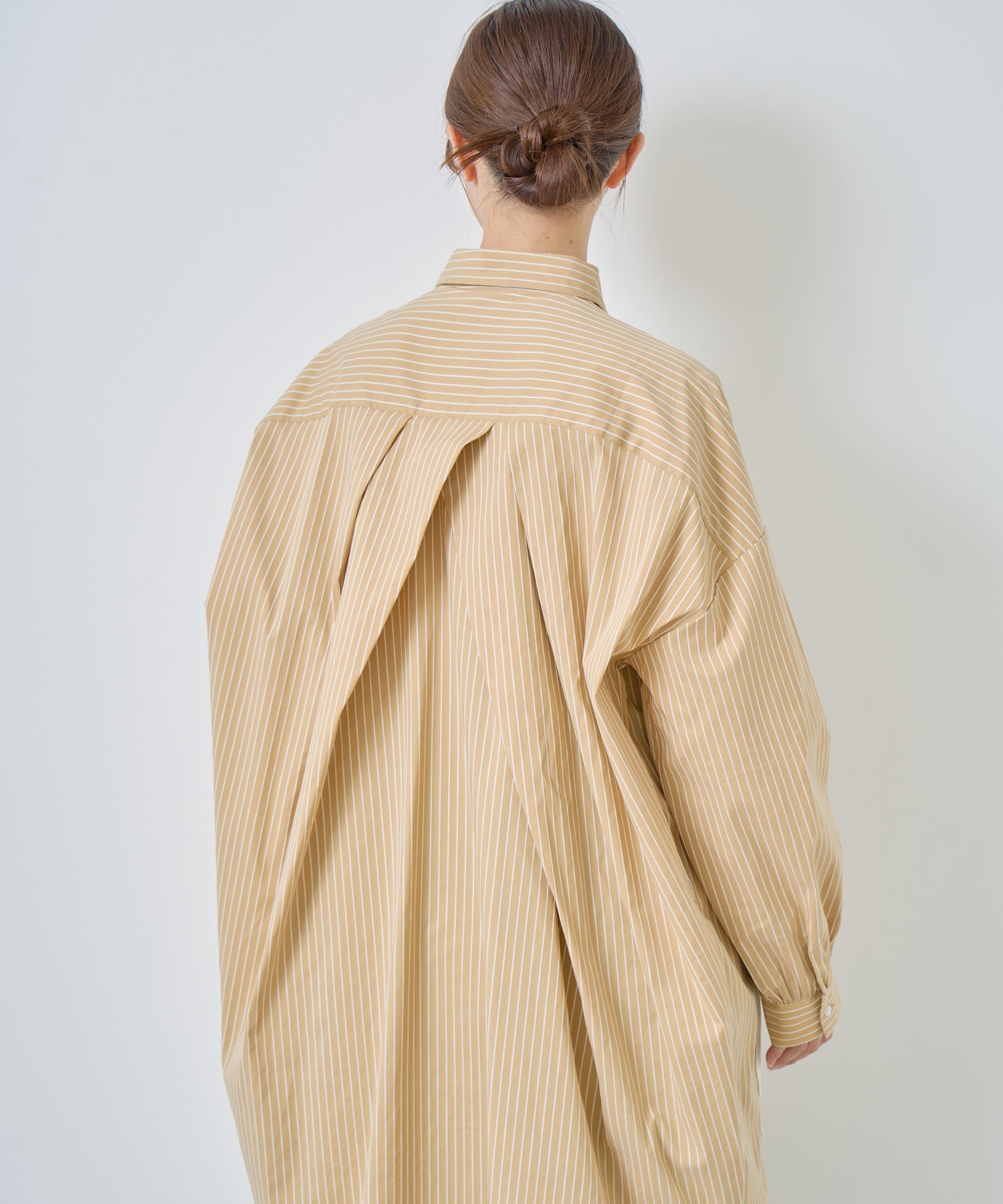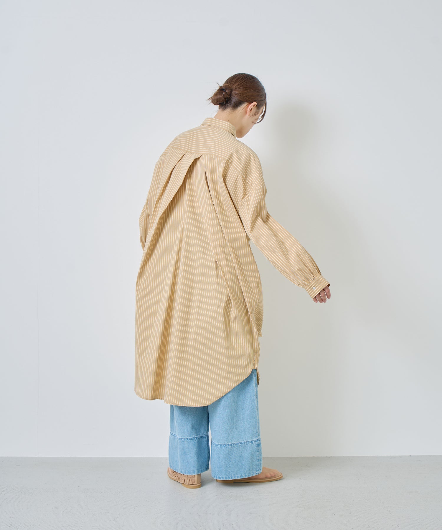 ストライプのシャツワンピースにVネックのニットを重ねていますが、脇までは配さず、すっきりと見えるようにデザインしています。