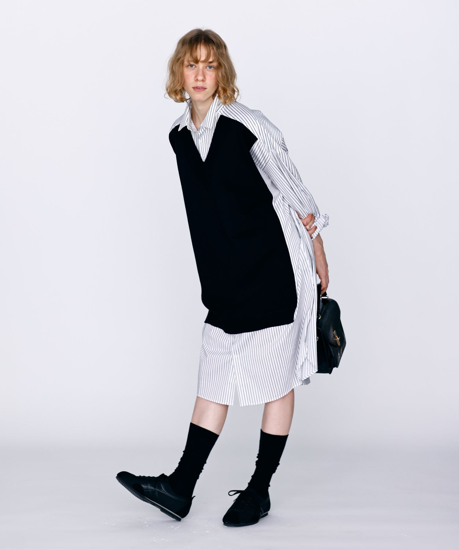 シャツワンピースにニットベストをレイヤードしたようなデザインが魅力の一枚。