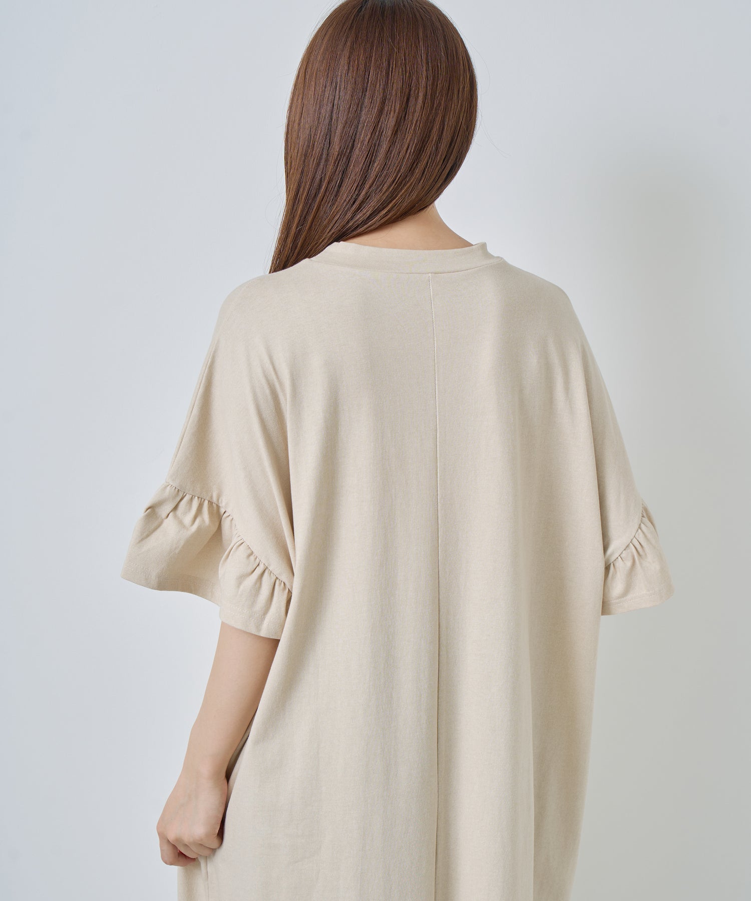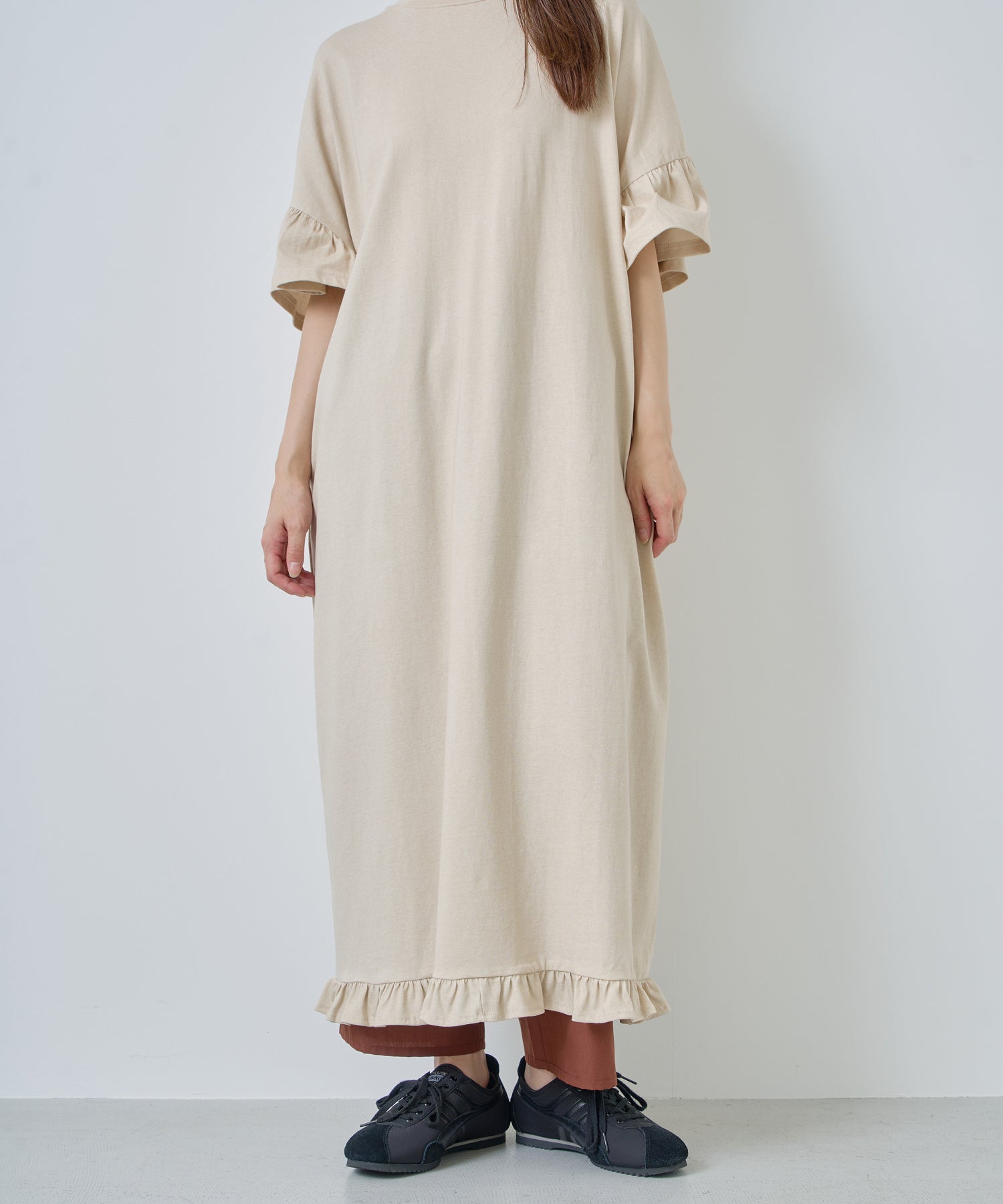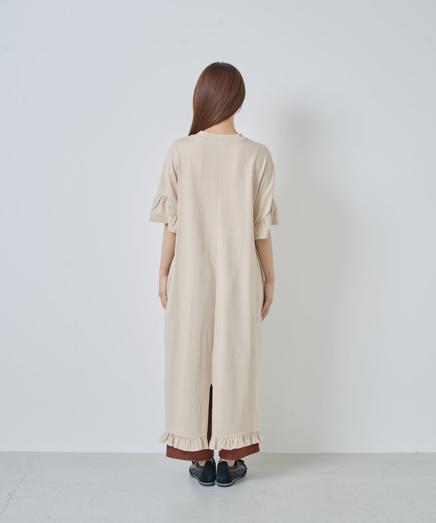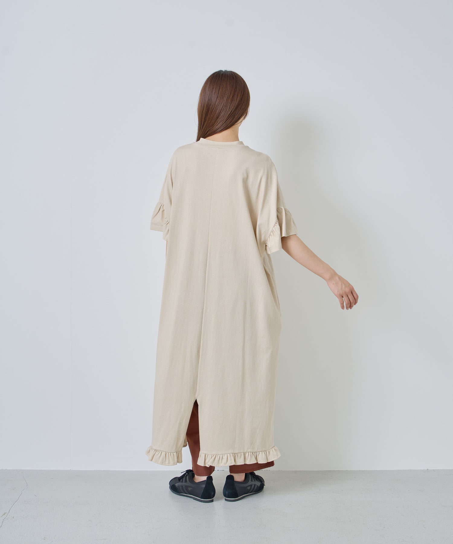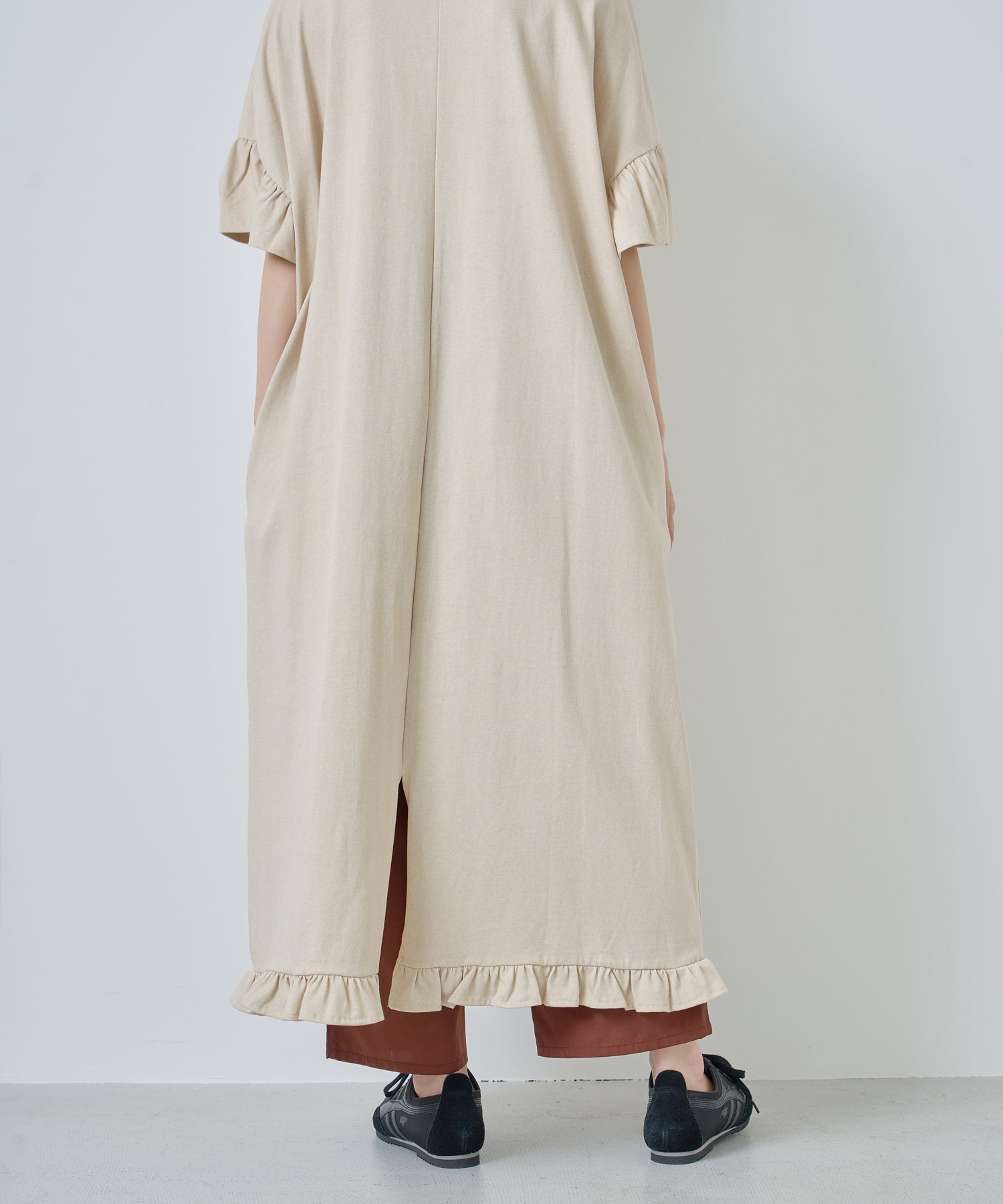 袖口と裾にフリルを施し、シンプルな形にほどよい可愛らしさをプラス。動くたびに揺れるデザインが軽やかな印象を与えます。