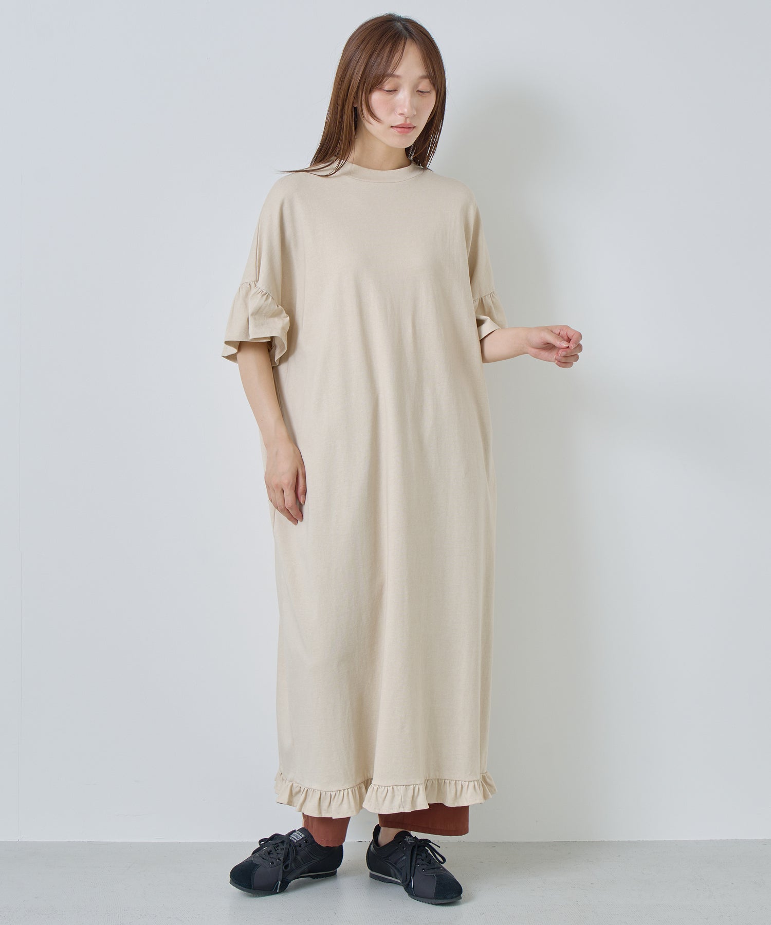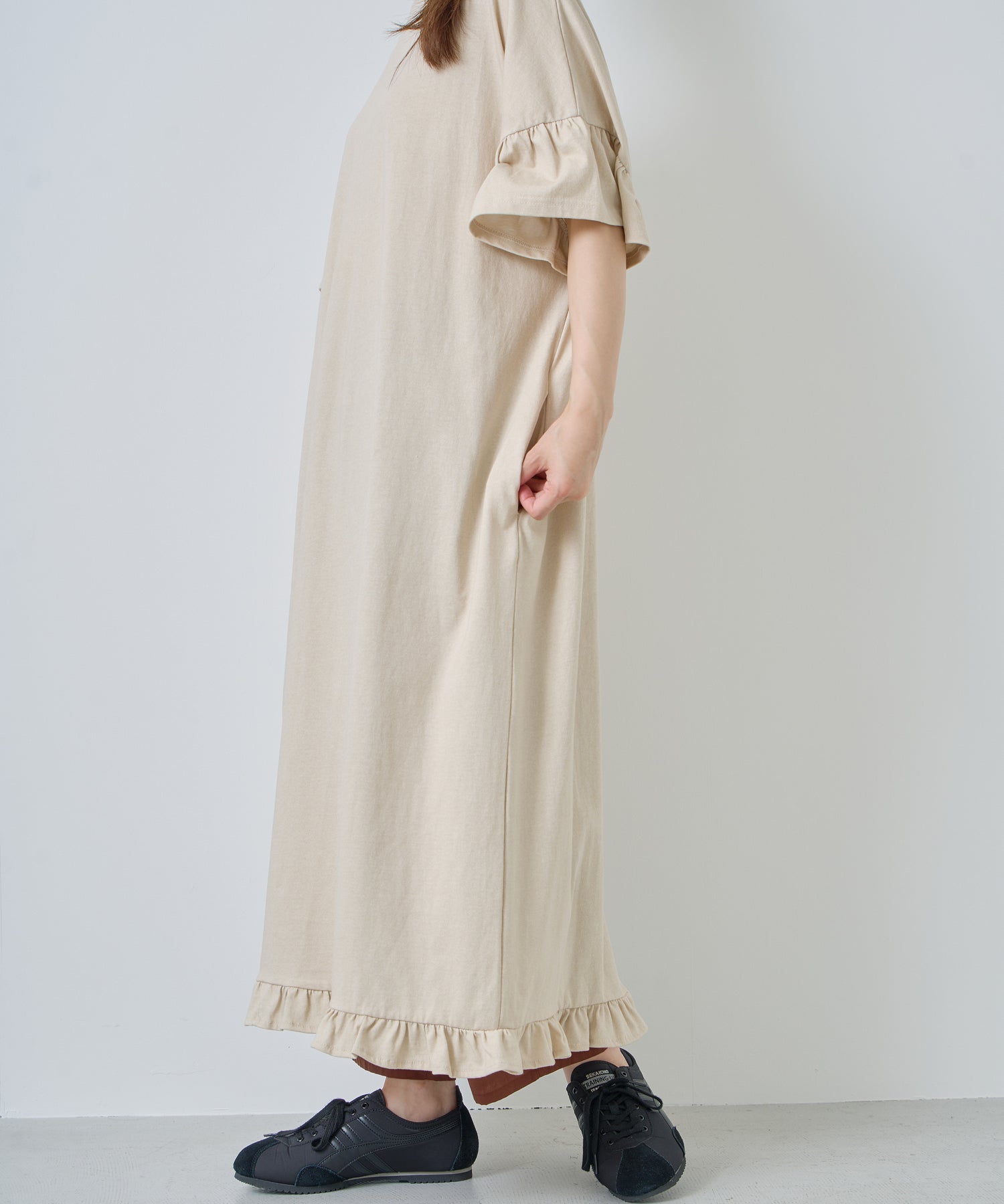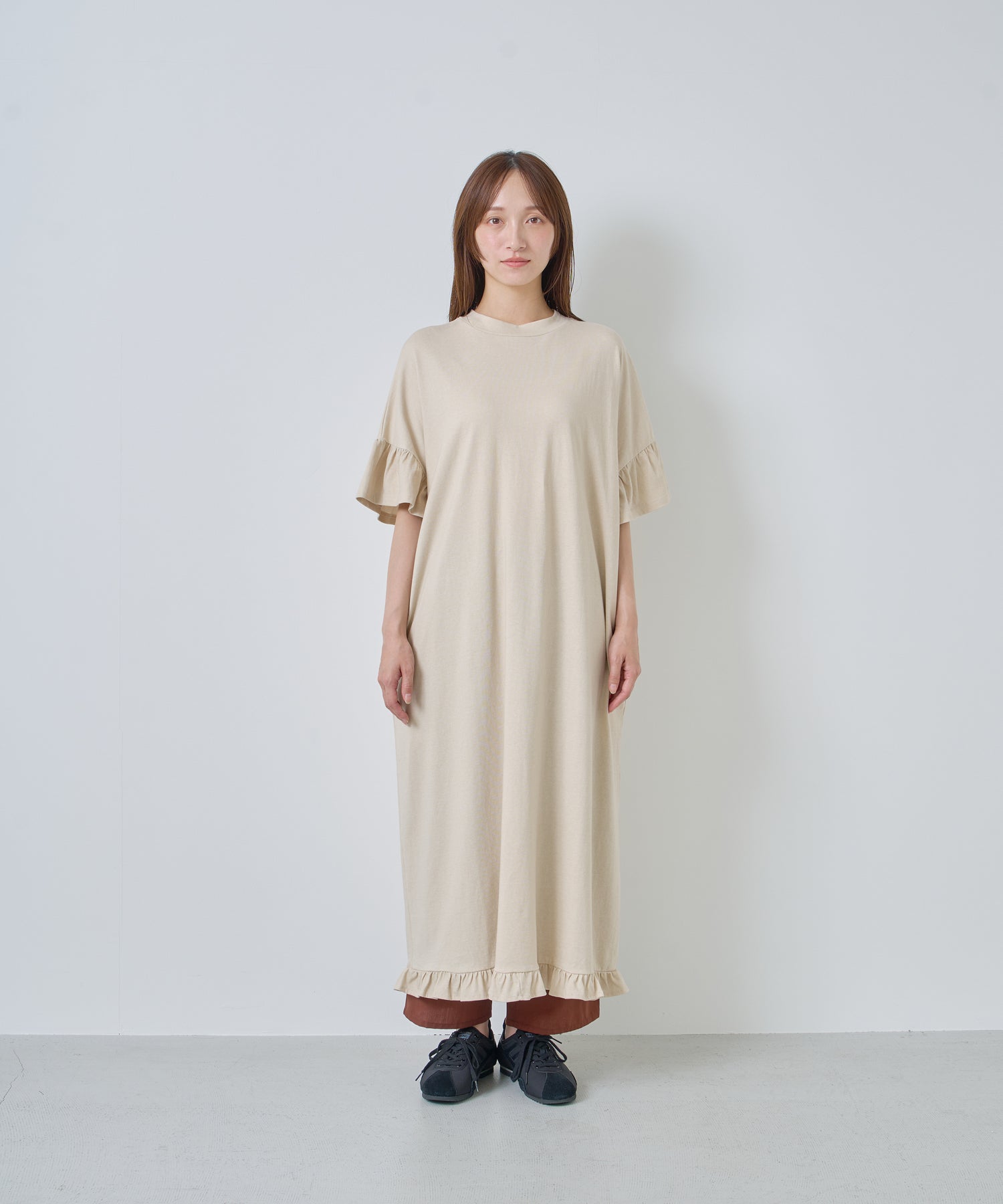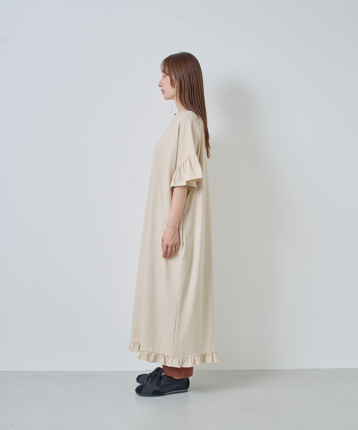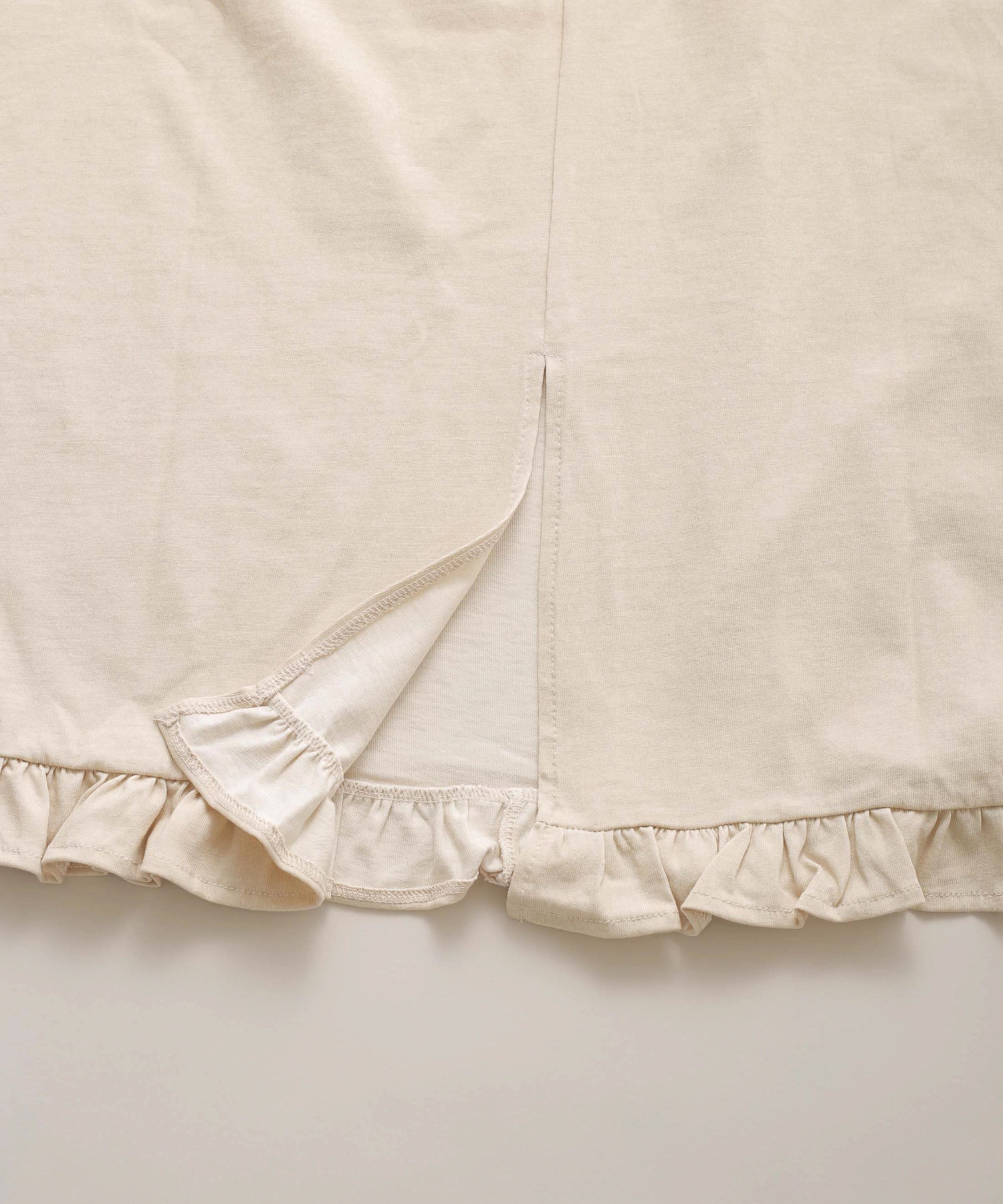 袖口と裾にフリルを施し、シンプルな形にほどよい可愛らしさをプラス。動くたびに揺れるデザインが軽やかな印象を与えます。