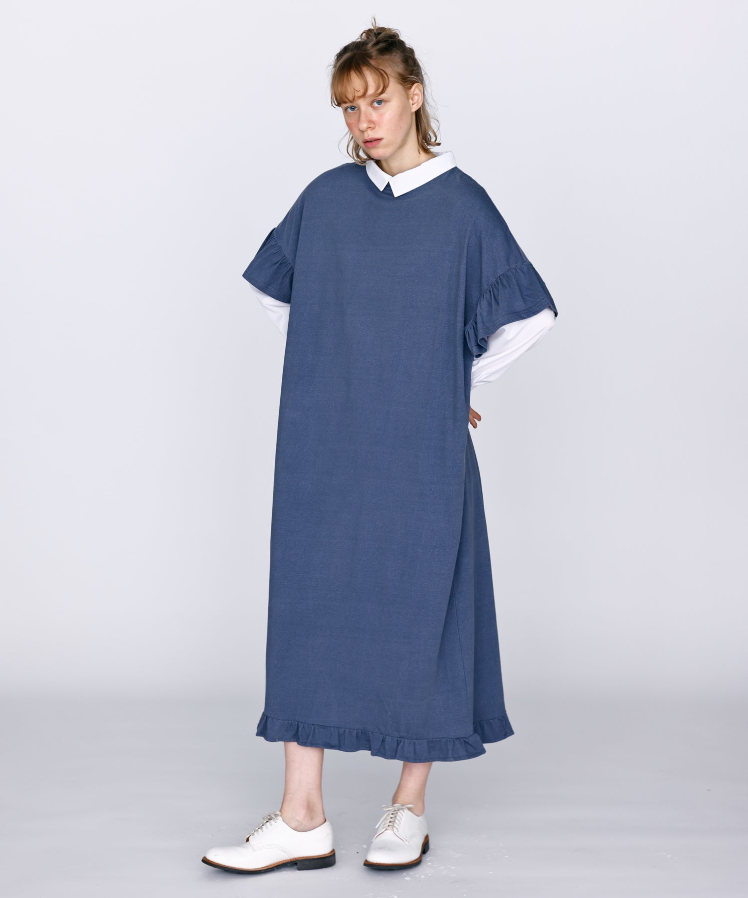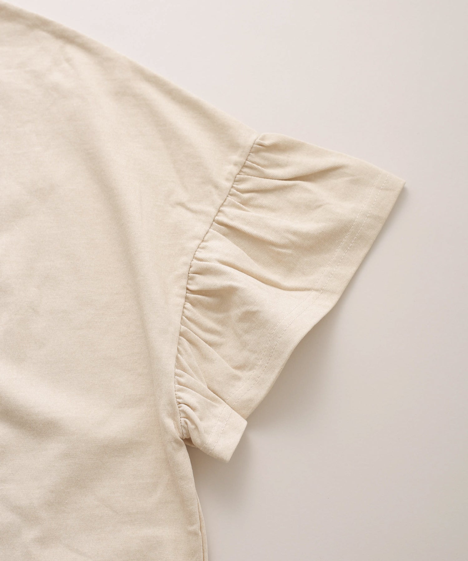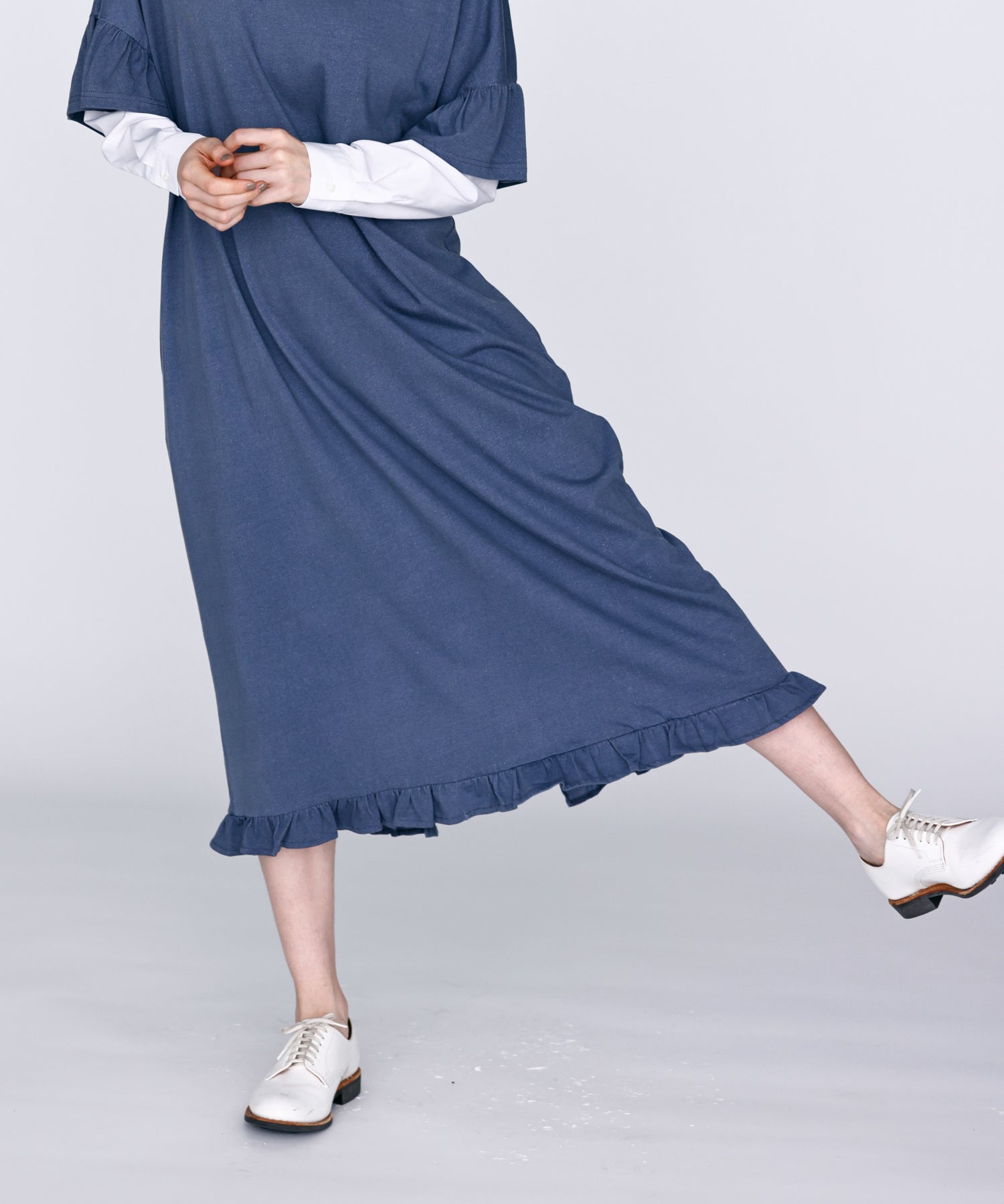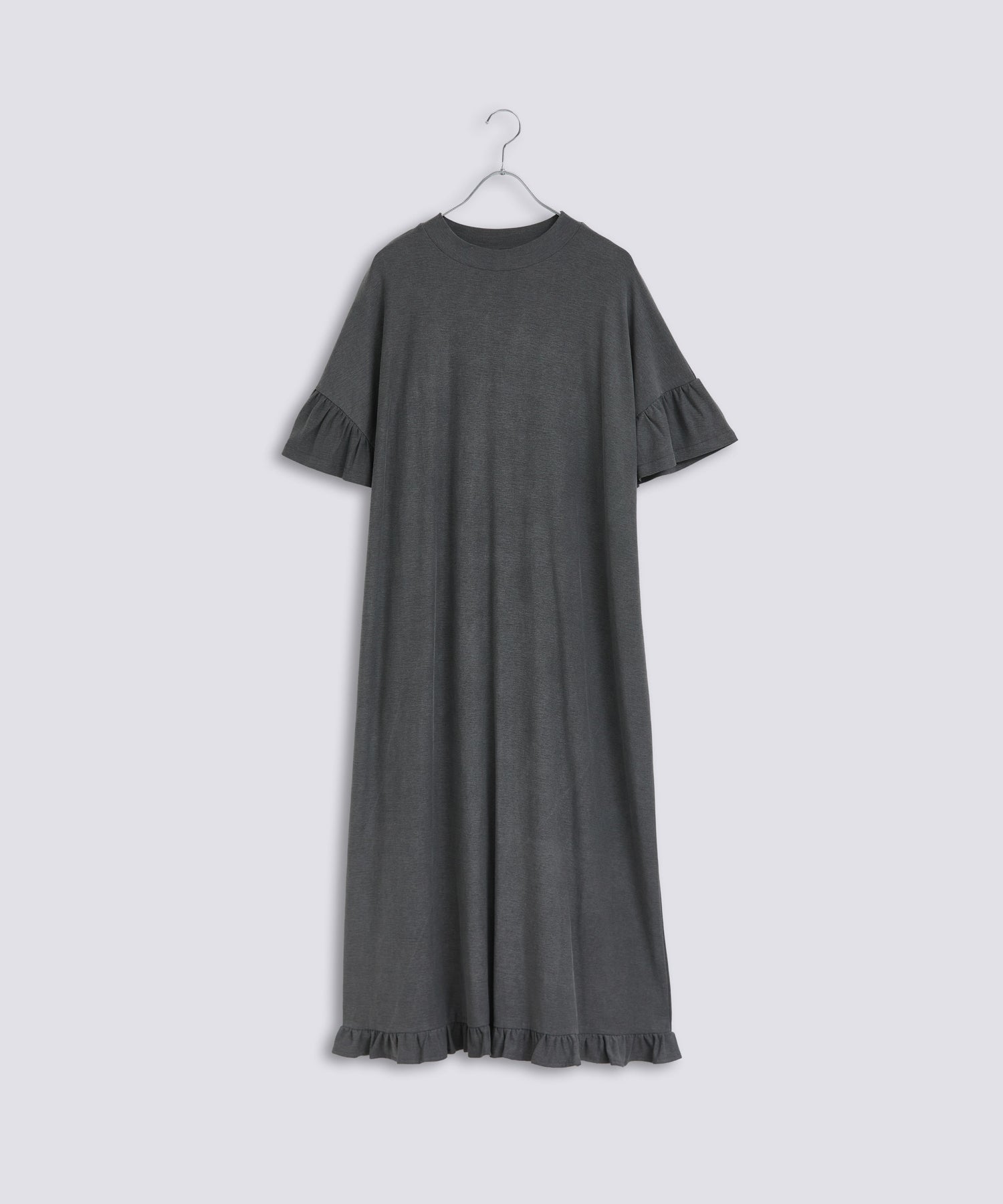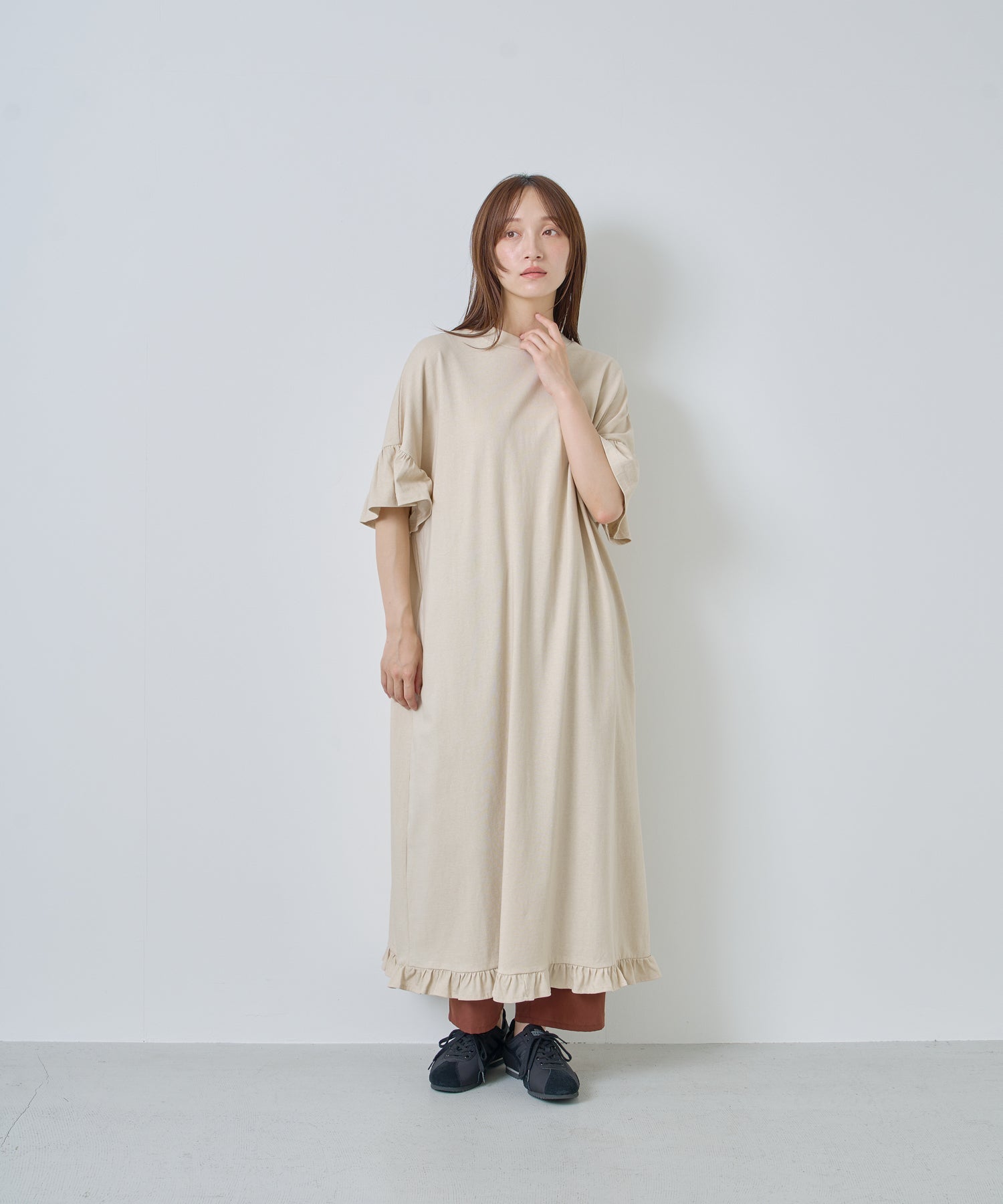袖口と裾にフリルを施し、シンプルな形にほどよい可愛らしさをプラス。動くたびに揺れるデザインが軽やかな印象を与えます。