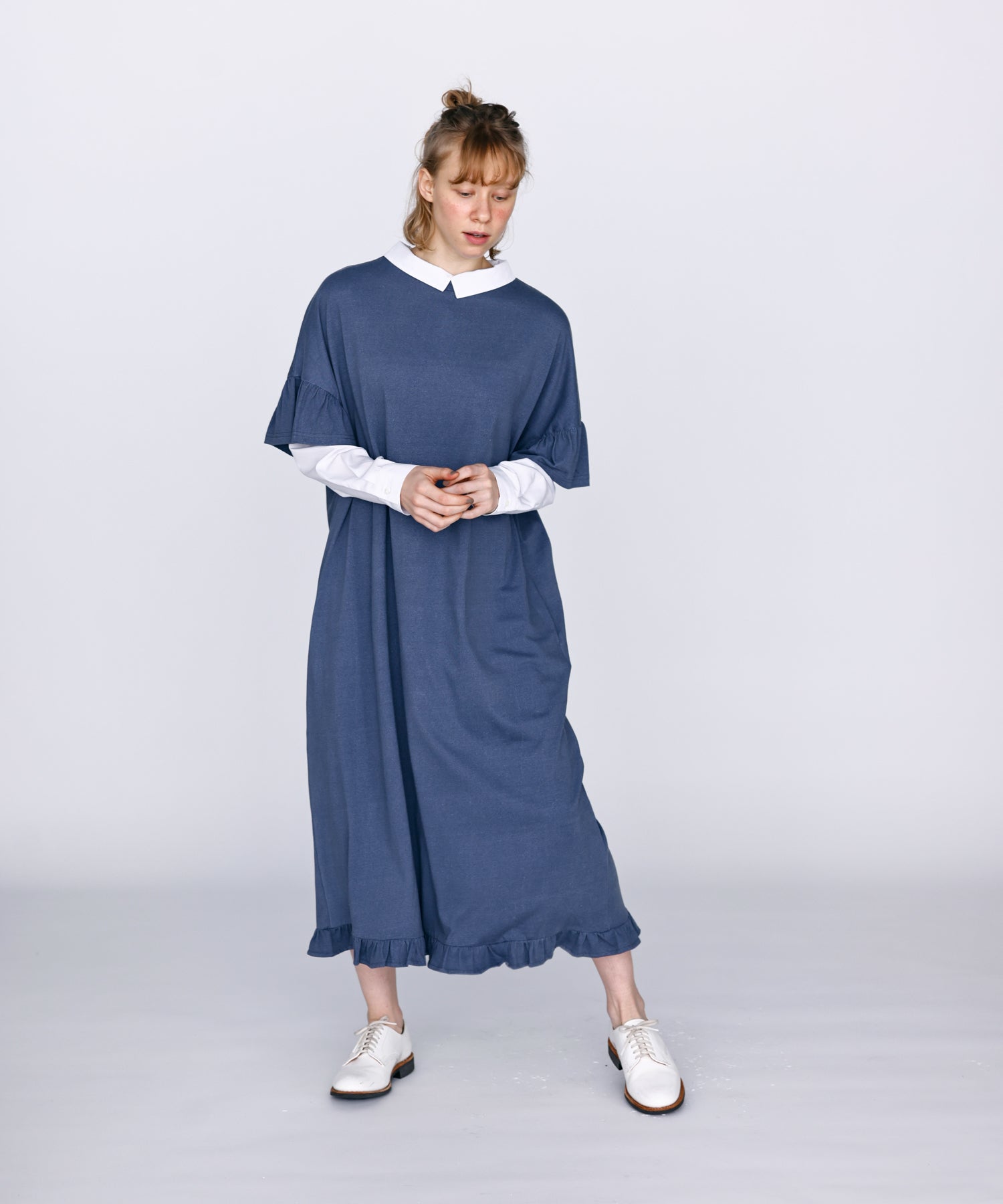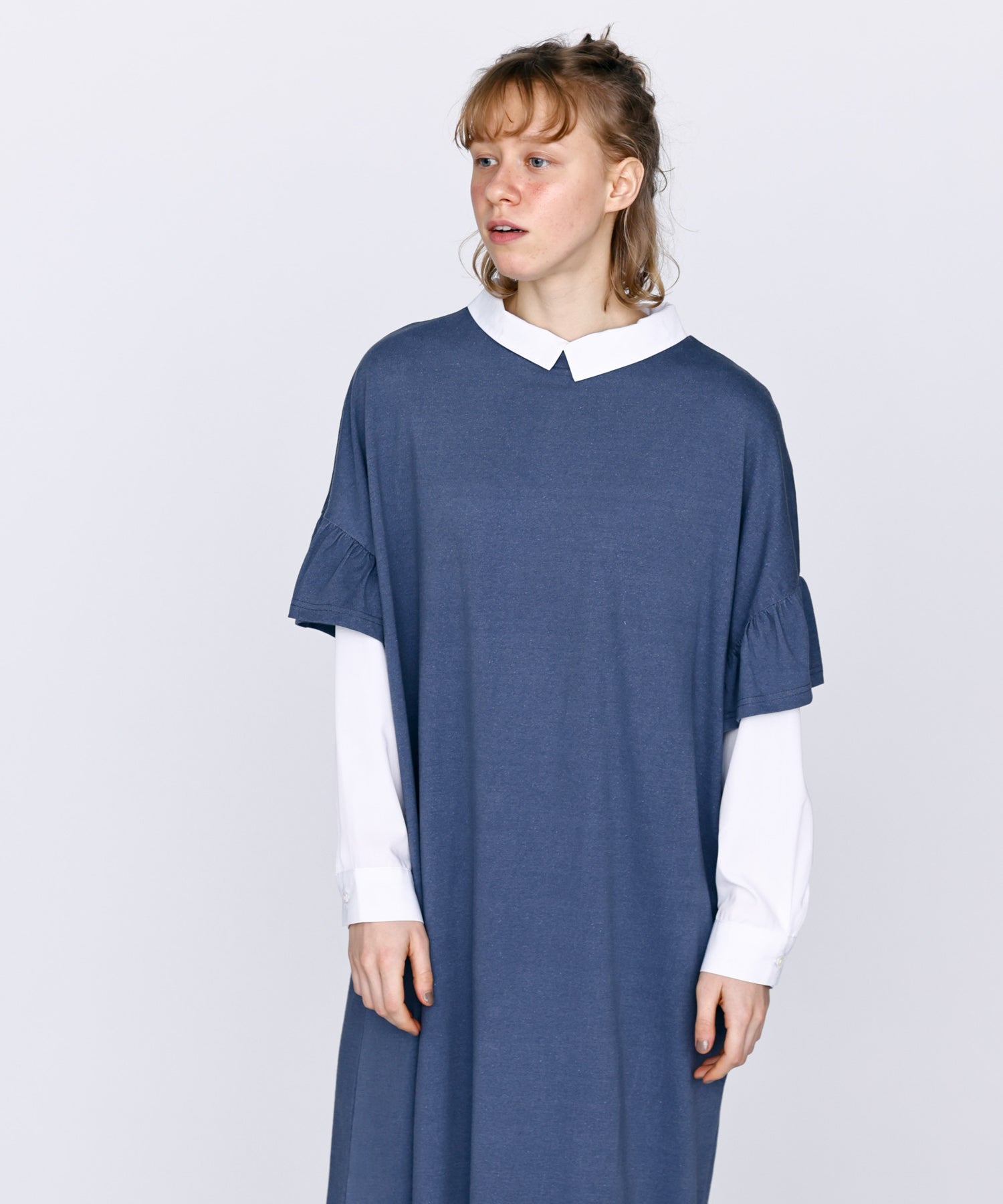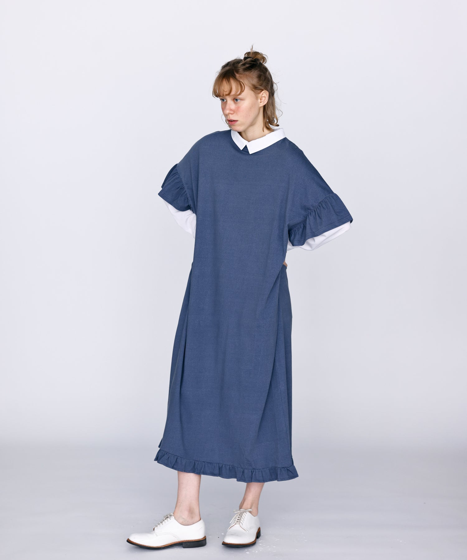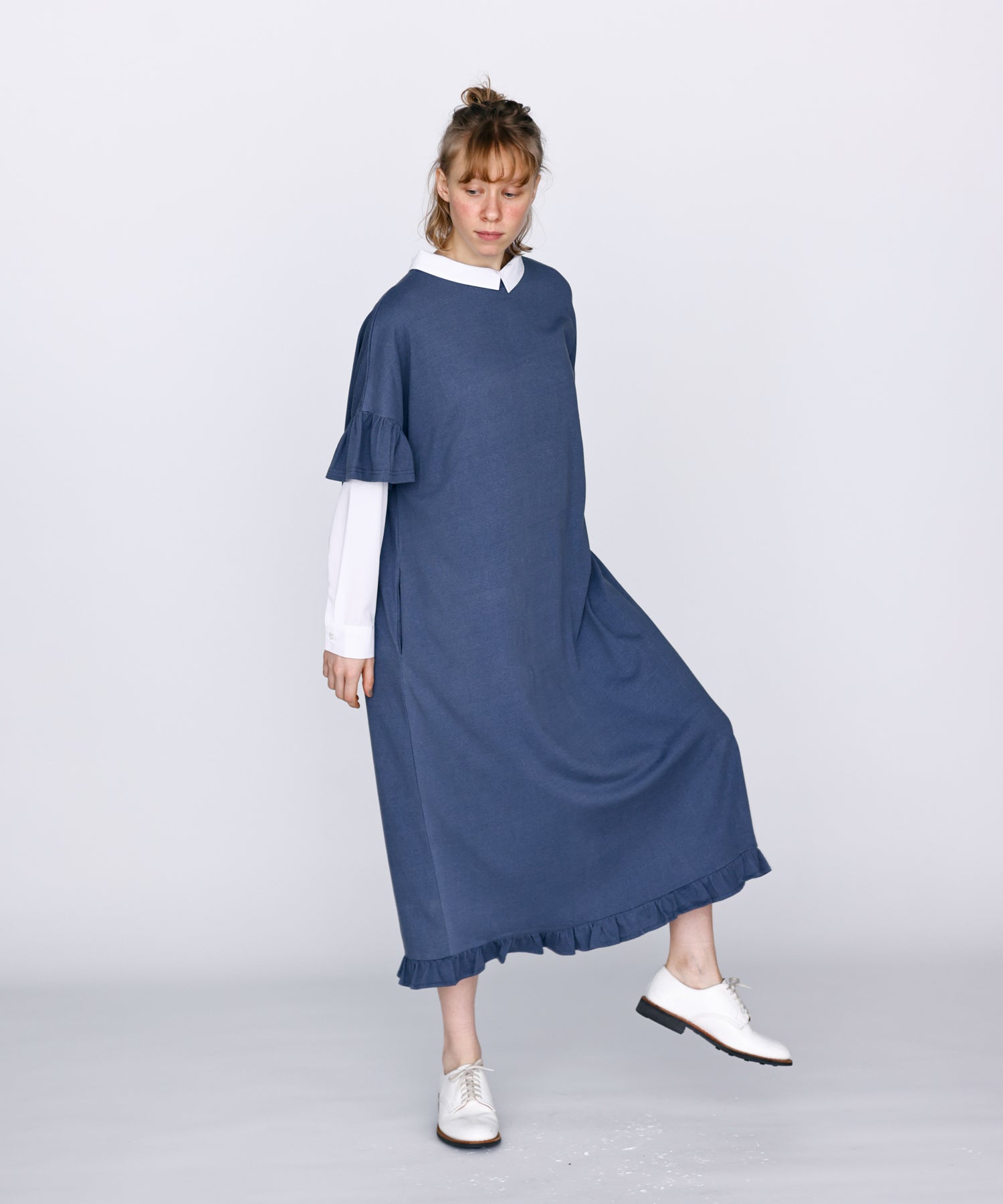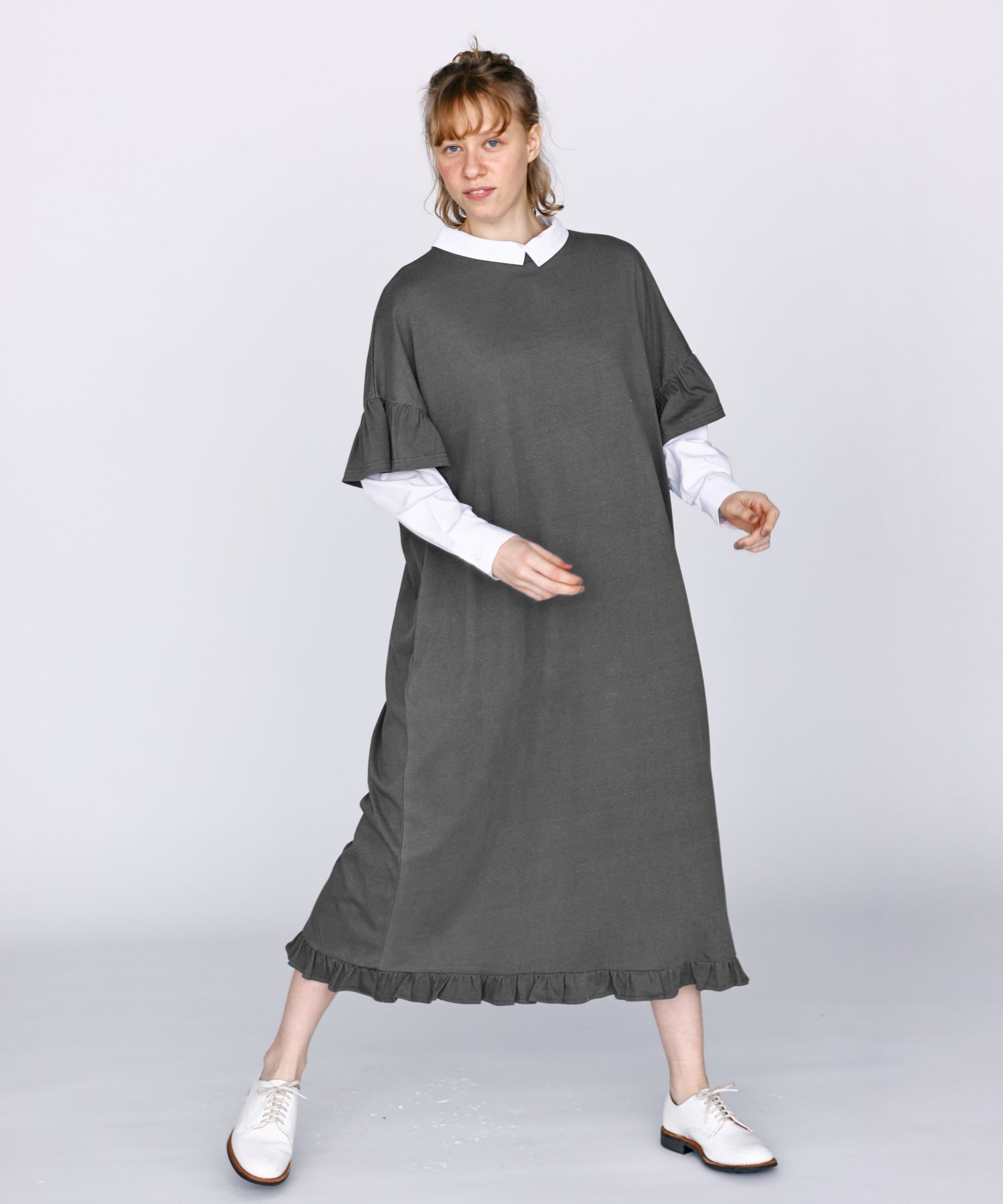 袖口と裾にフリルを施し、シンプルな形にほどよい可愛らしさをプラス。動くたびに揺れるデザインが軽やかな印象を与えます。