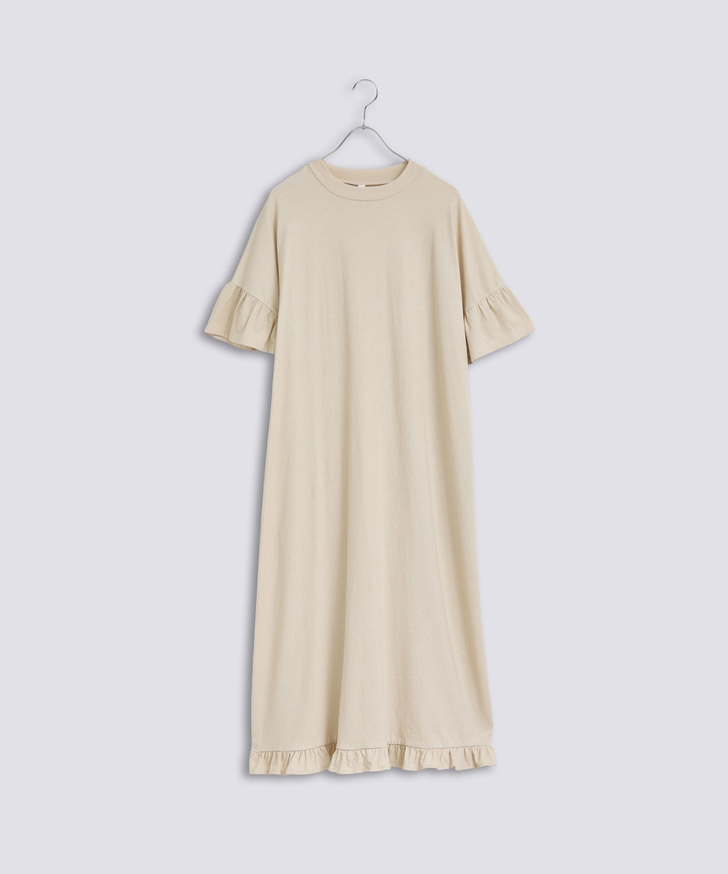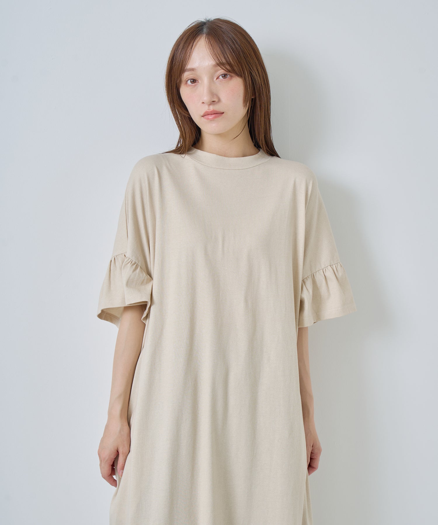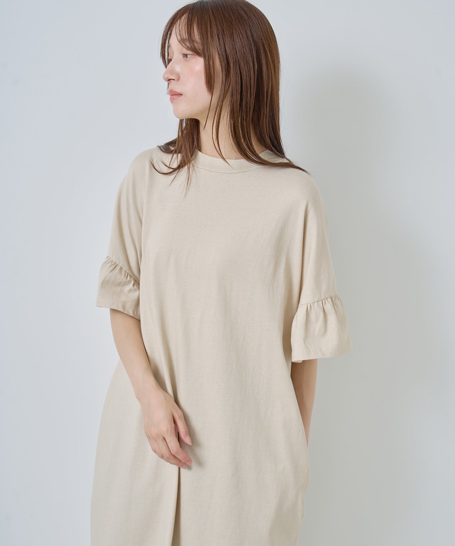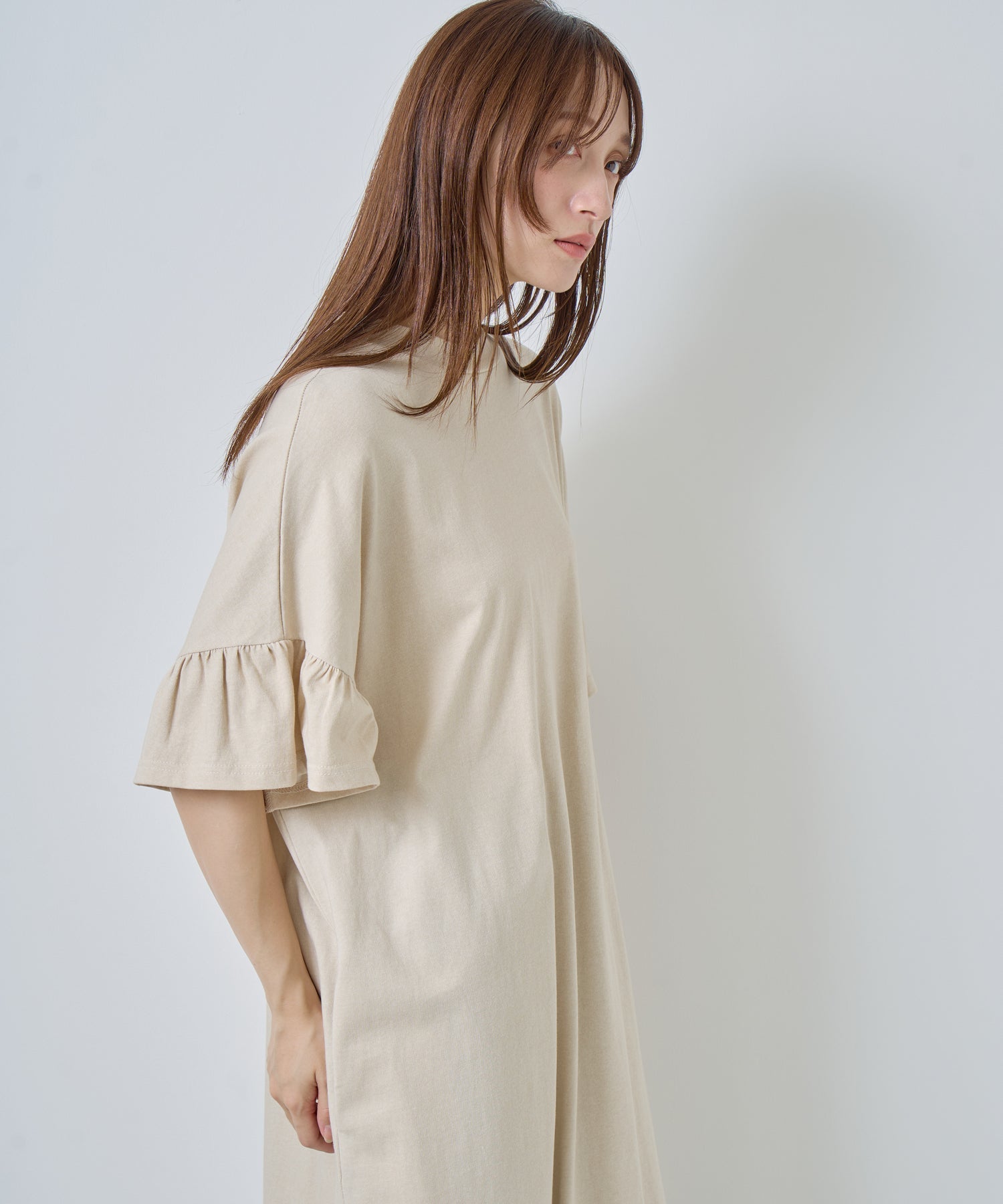 ゆったりとしたシルエットにフリルを効かせた、女性らしいリラックスムード漂うカットソーワンピースです。