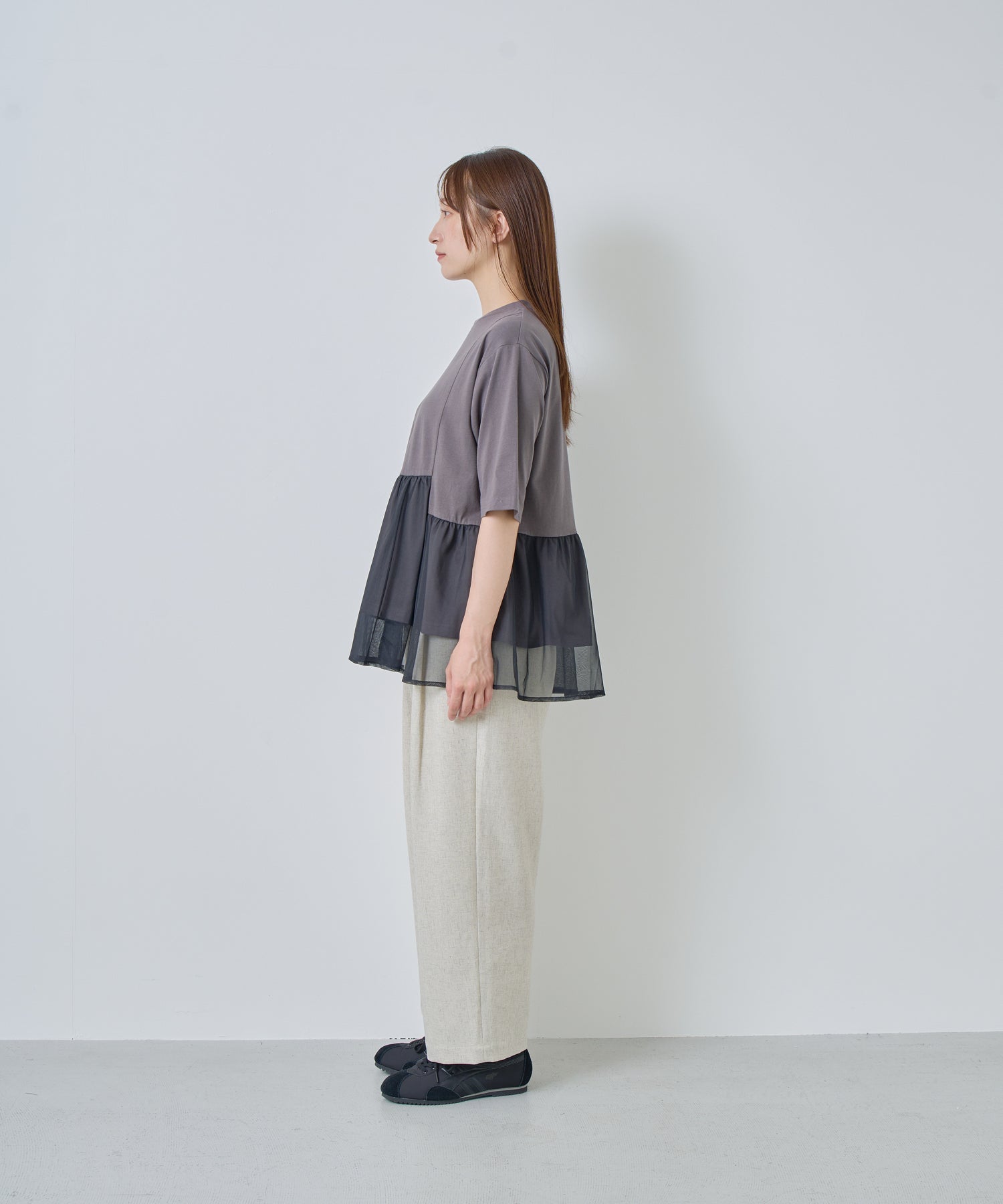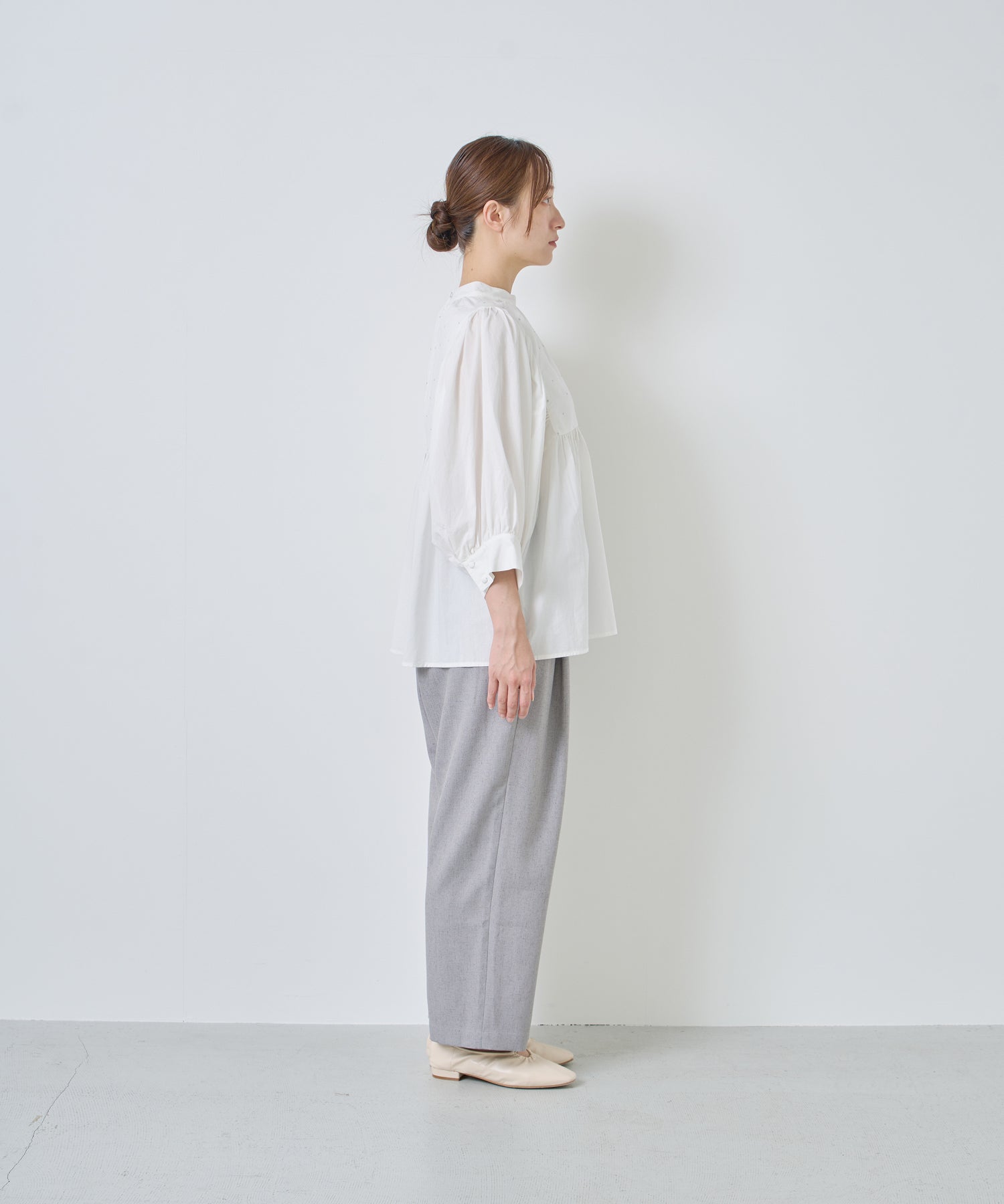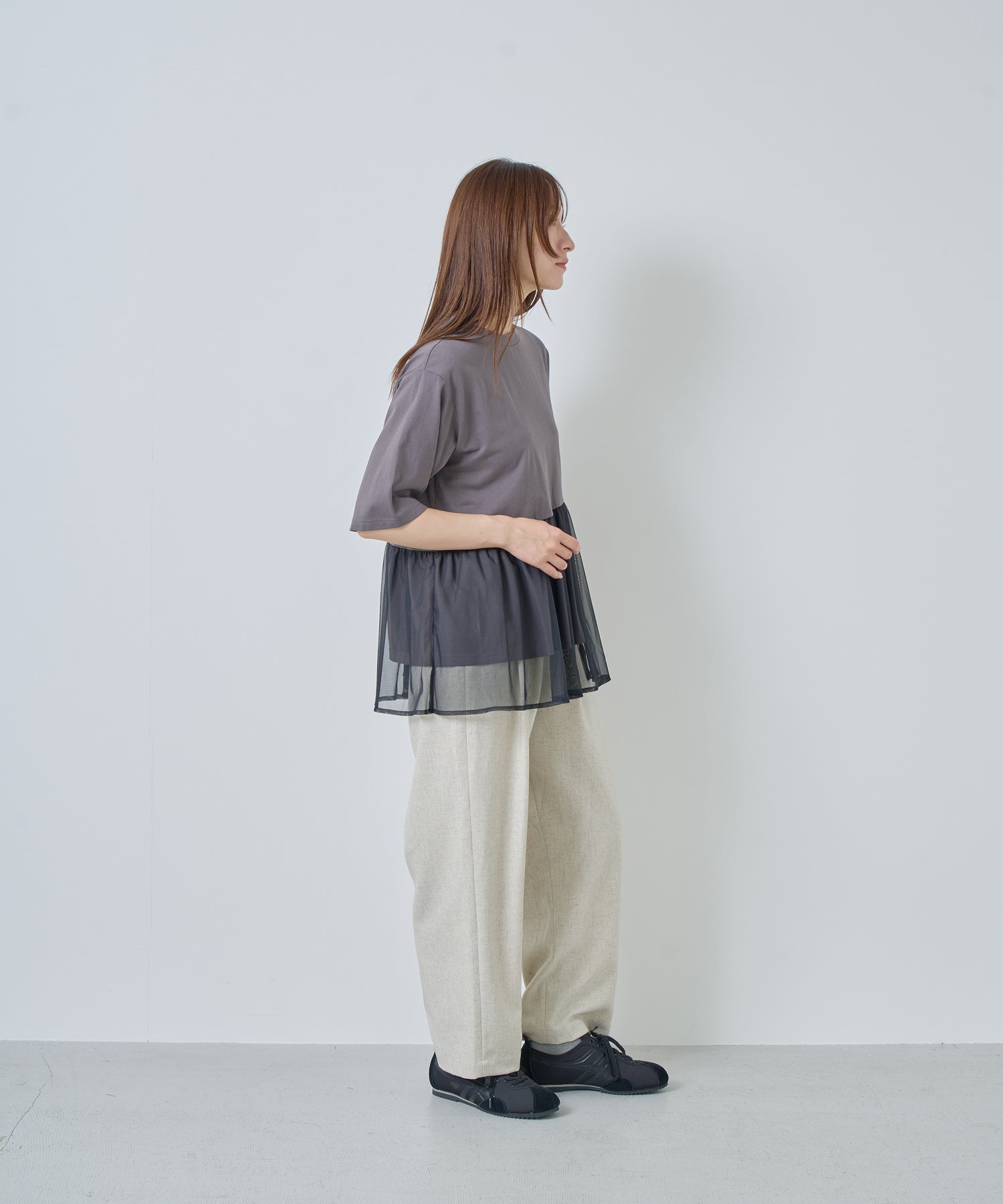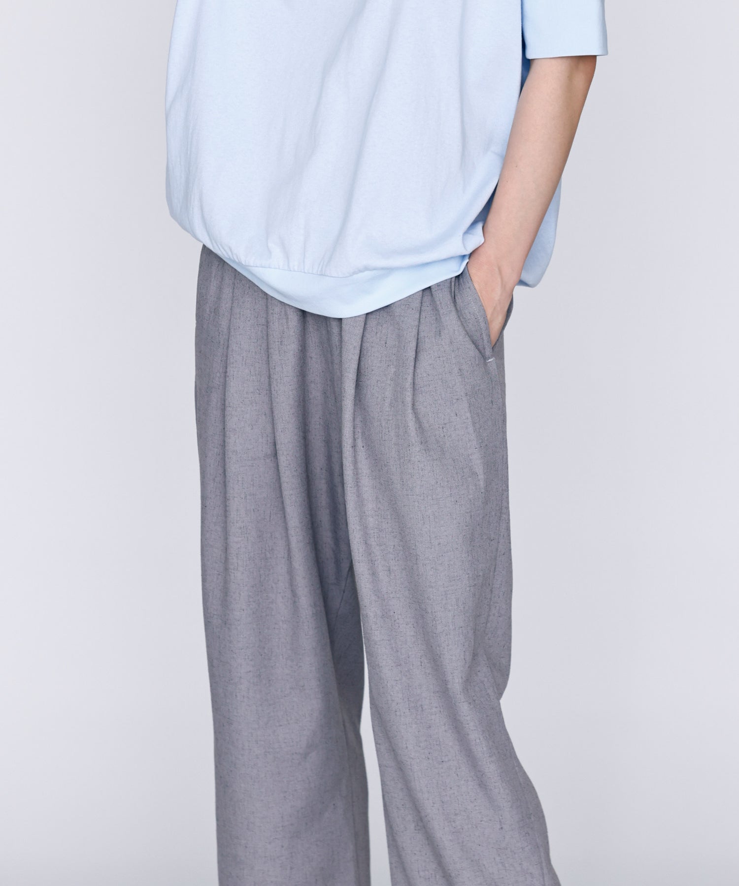 薄すぎない程よい厚みで落ち感があり、シワになりにくいリネン混の素材を使用。