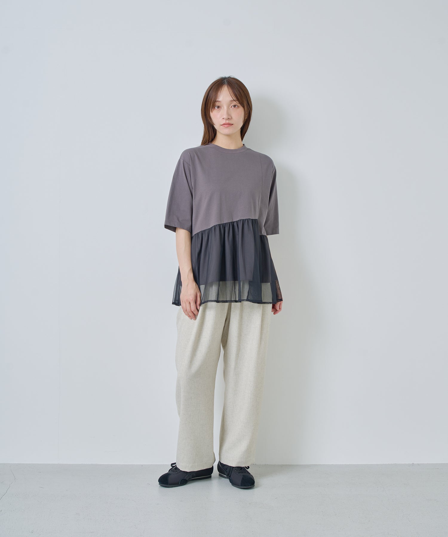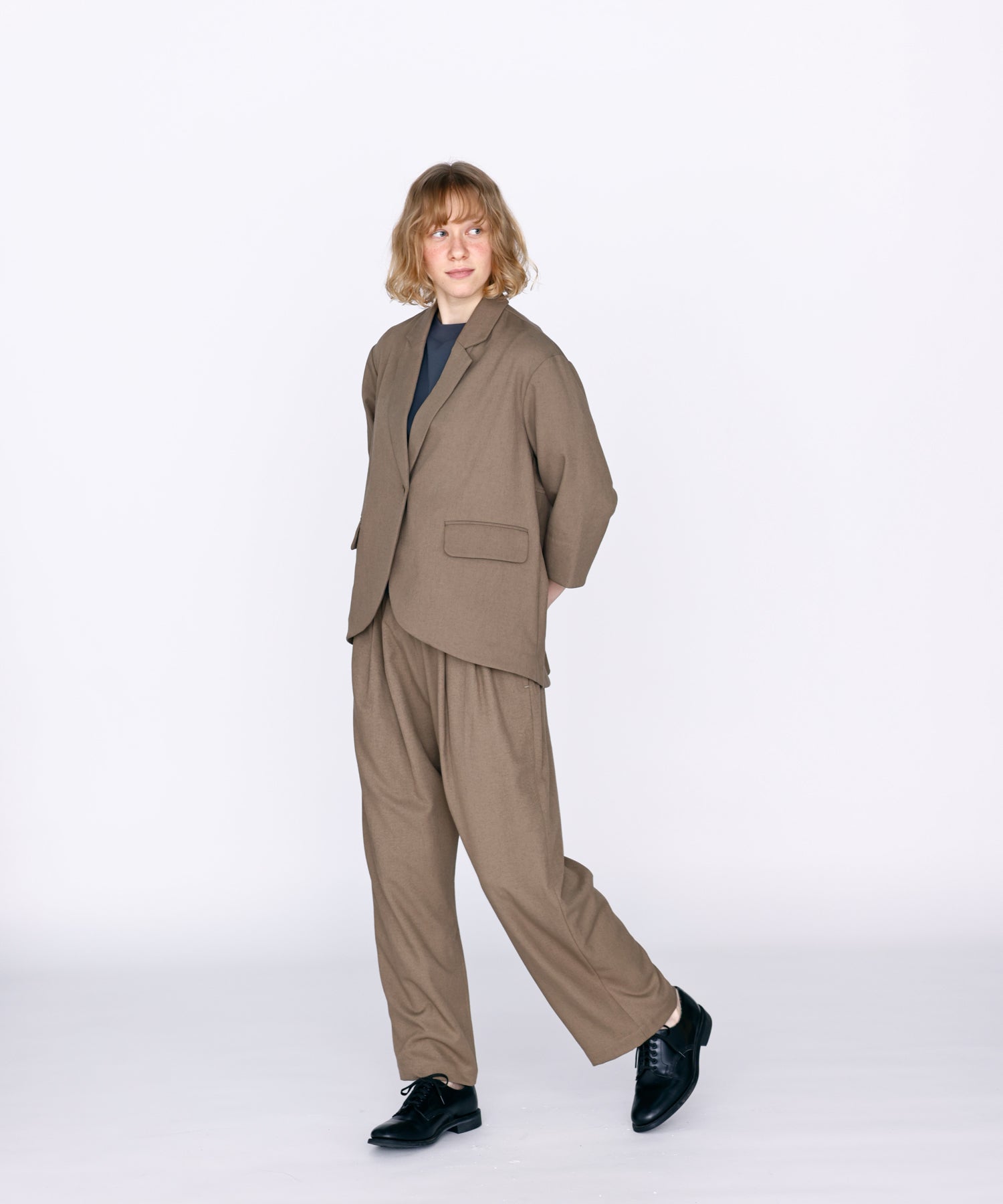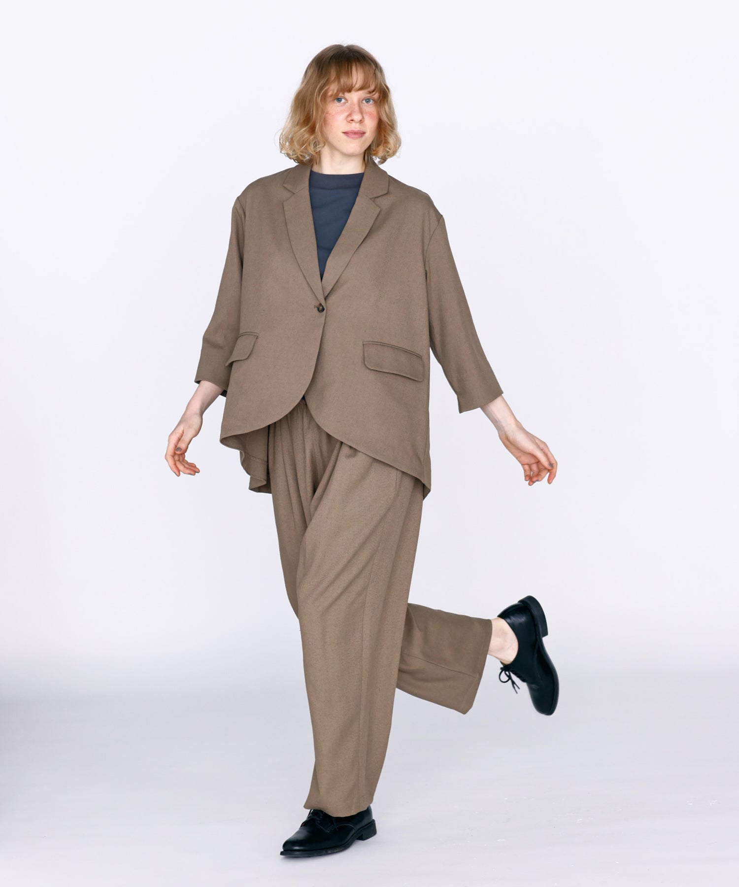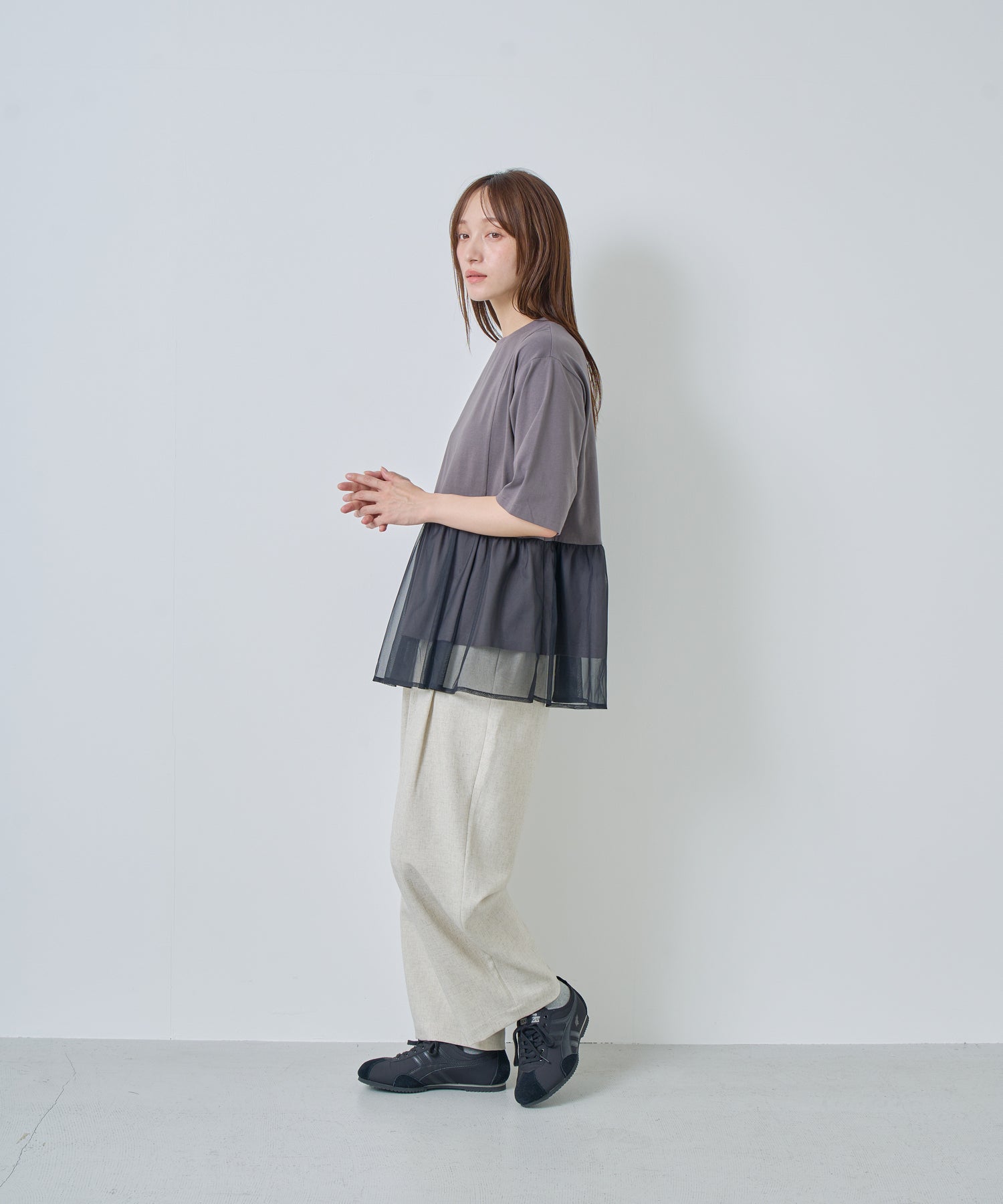 薄すぎない程よい厚みで落ち感があり、シワになりにくいリネン混の素材を使用。