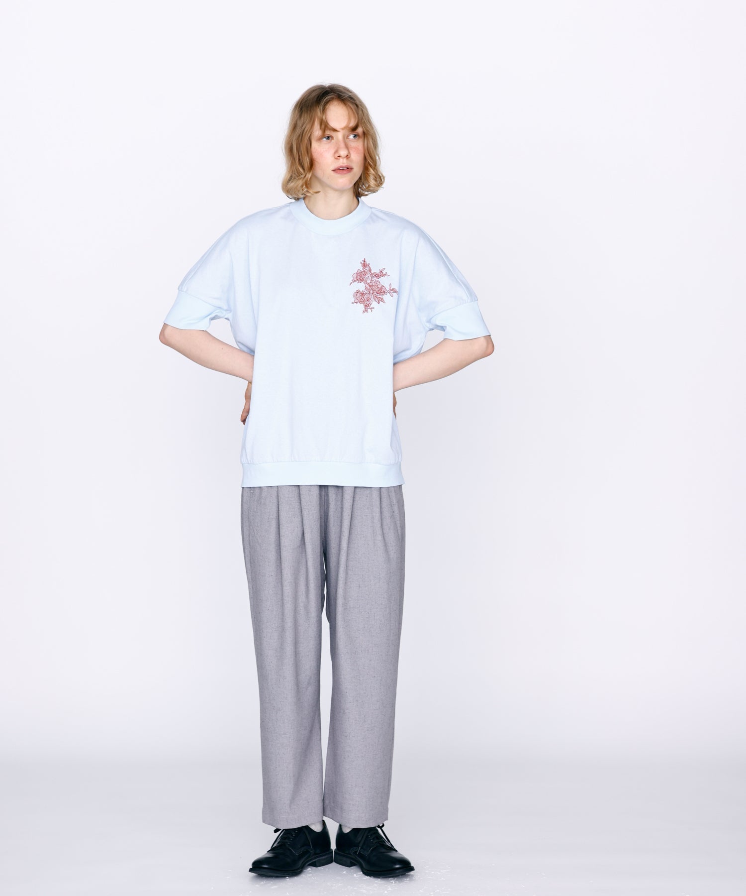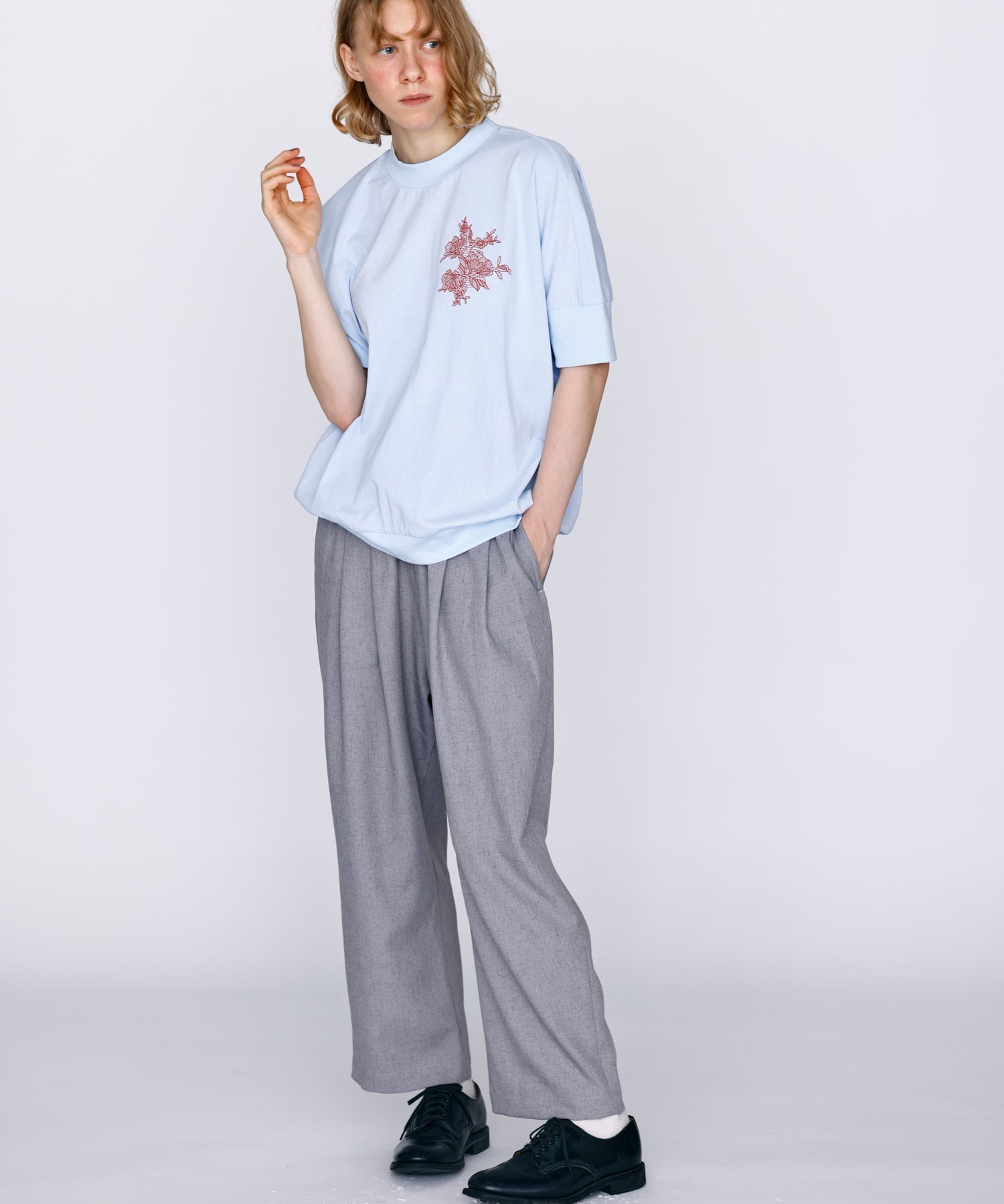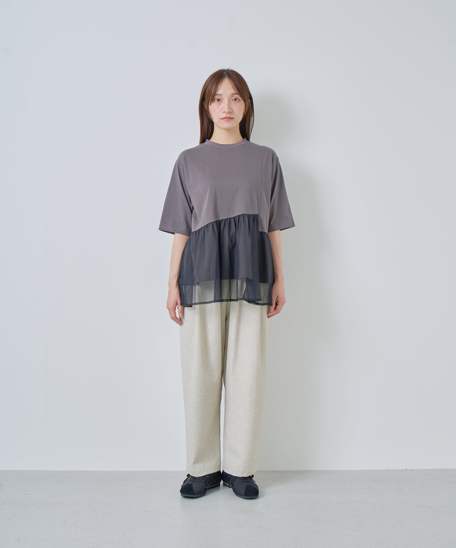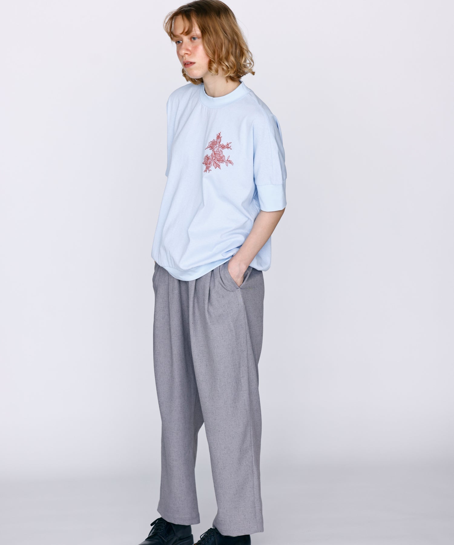 薄すぎない程よい厚みで落ち感があり、シワになりにくいリネン混の素材を使用。