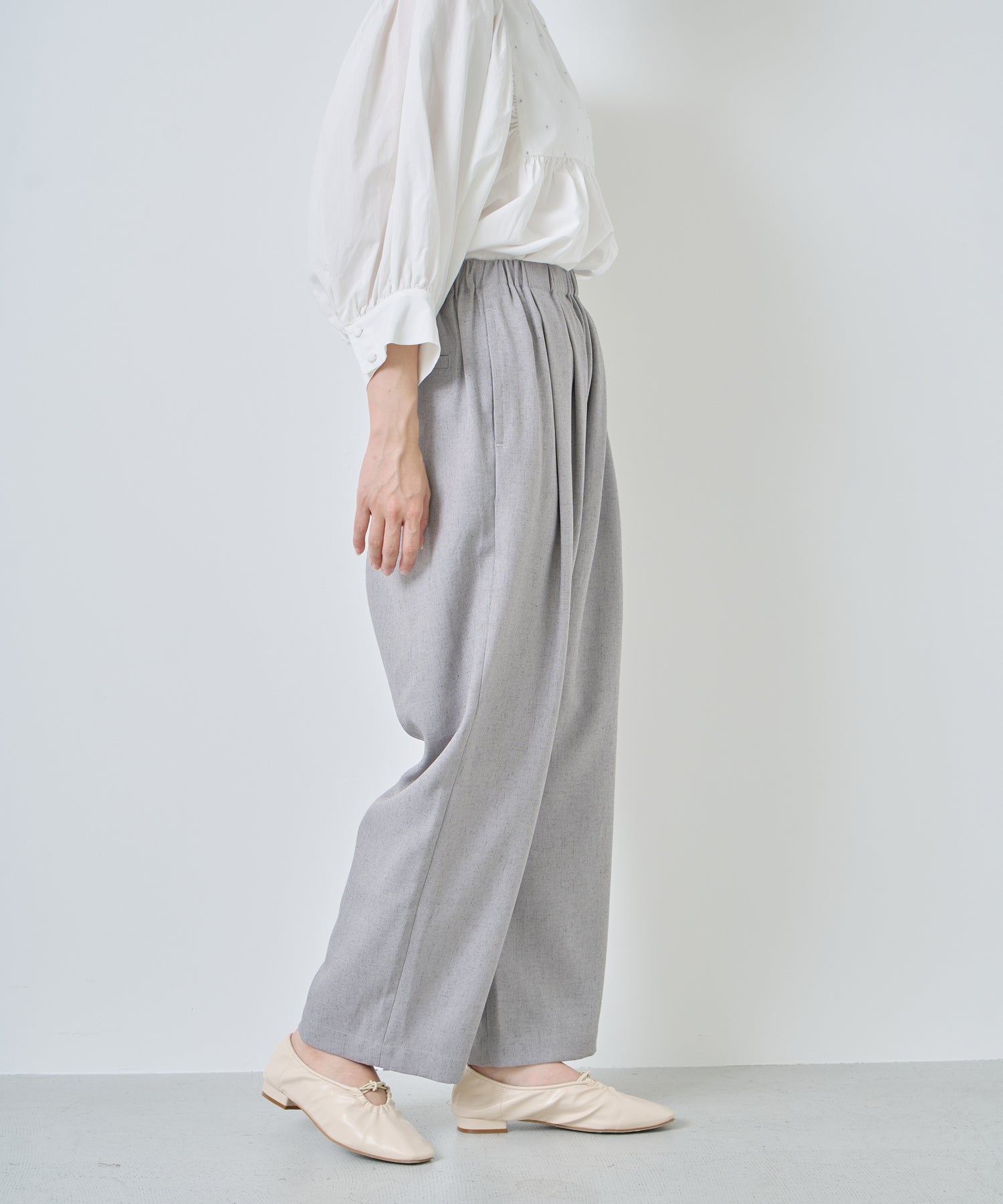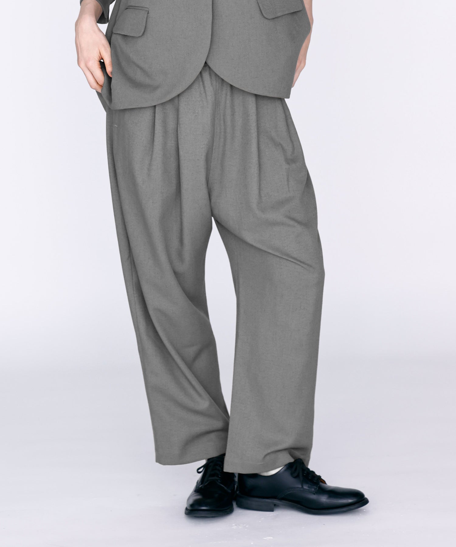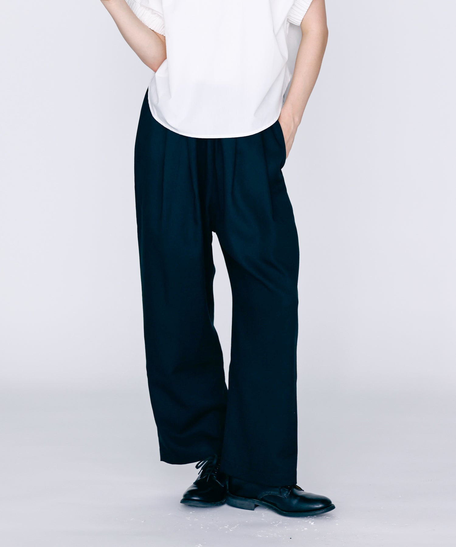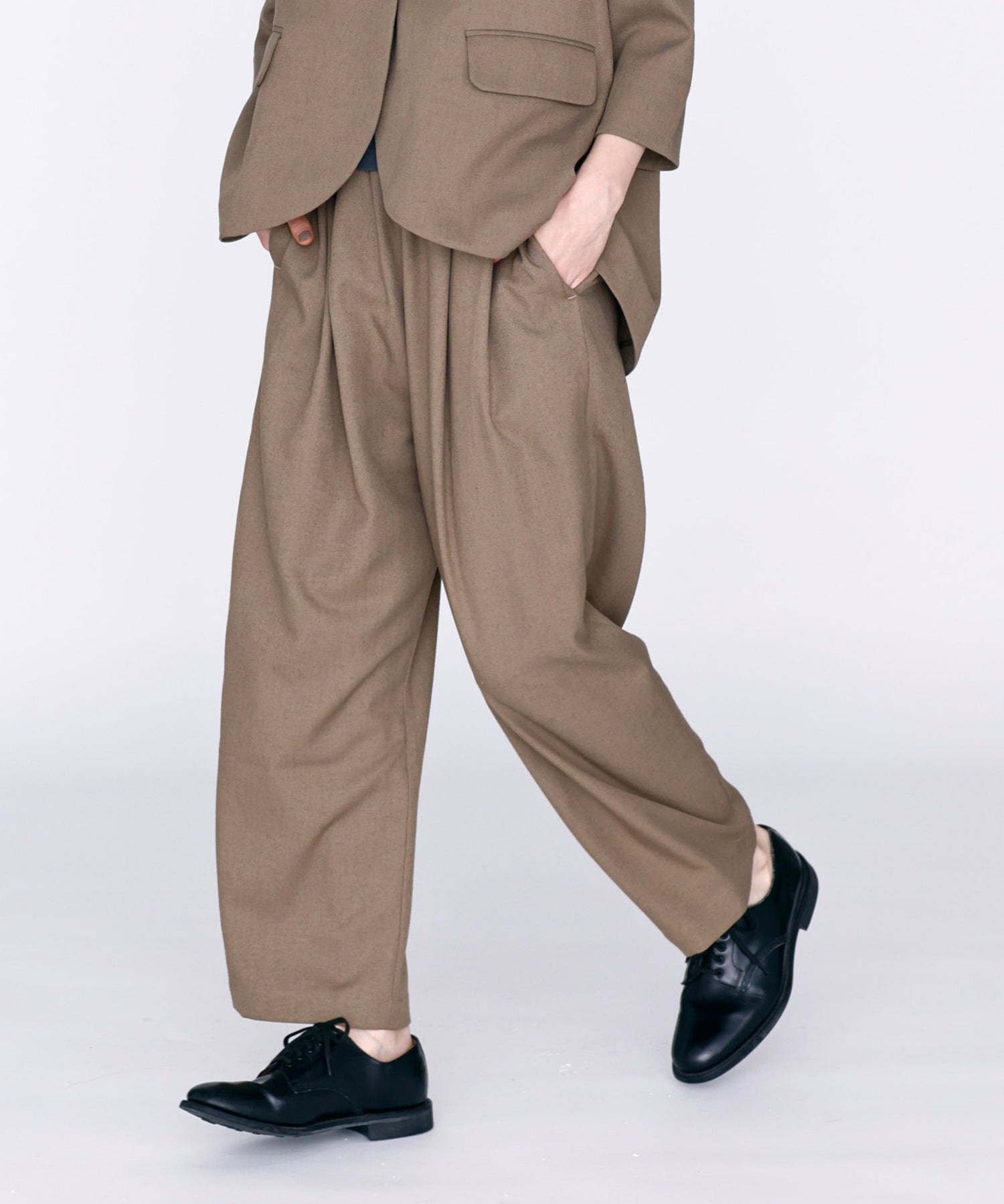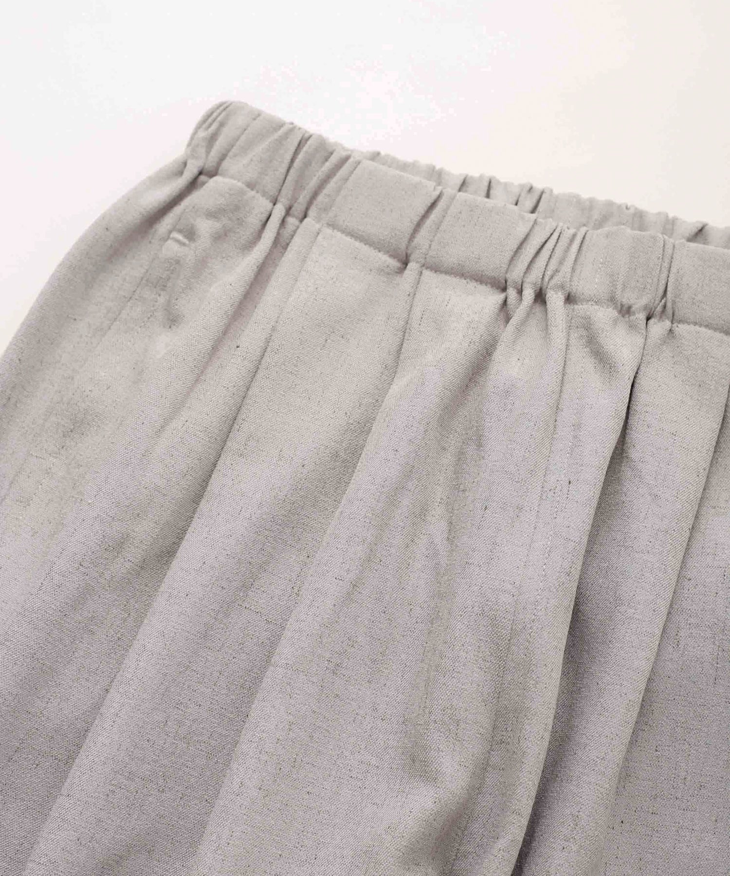 ウエストに大きくタックとギャザーを施し、裾に向かって落ちる綺麗なシルエットのパンツ。