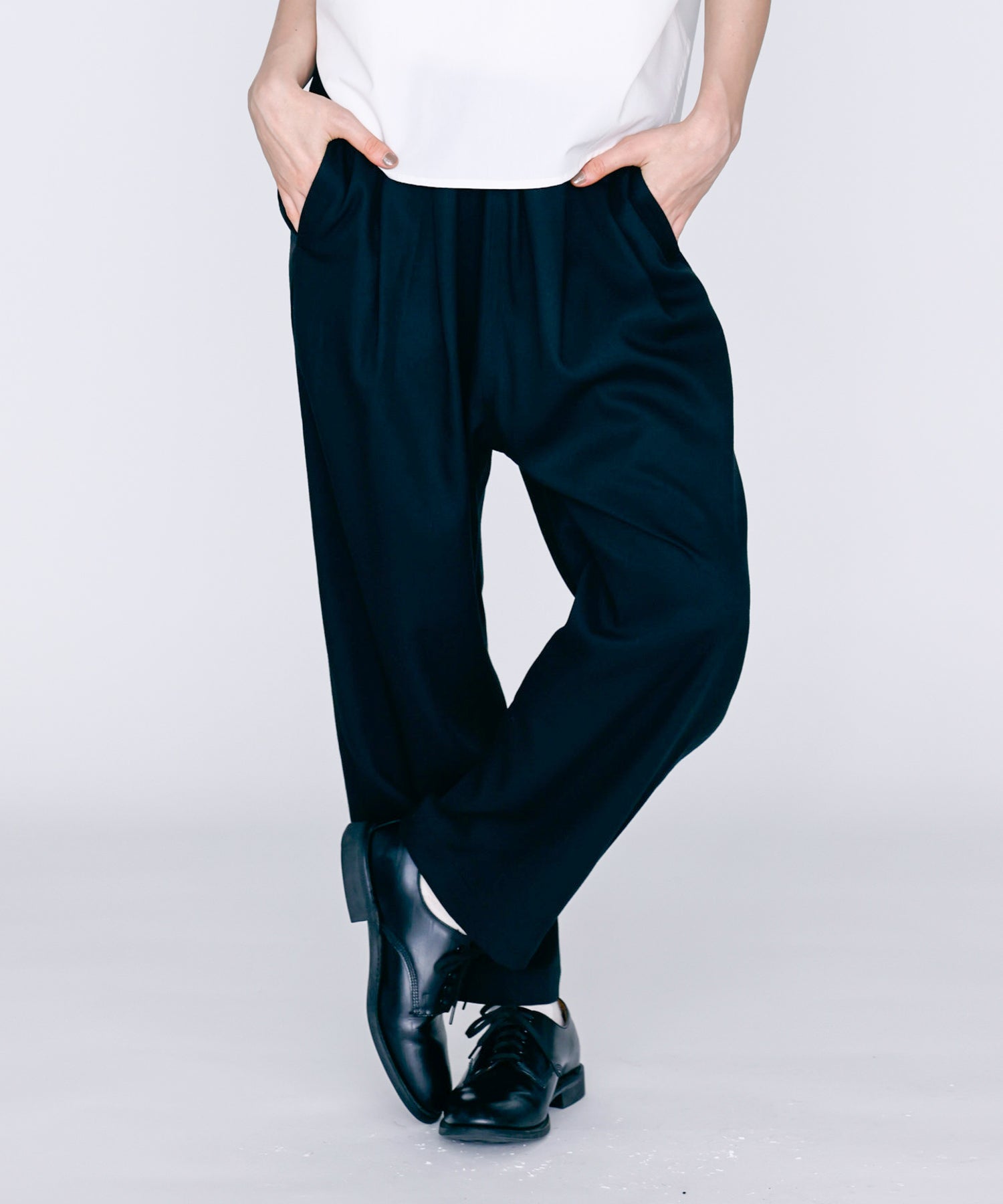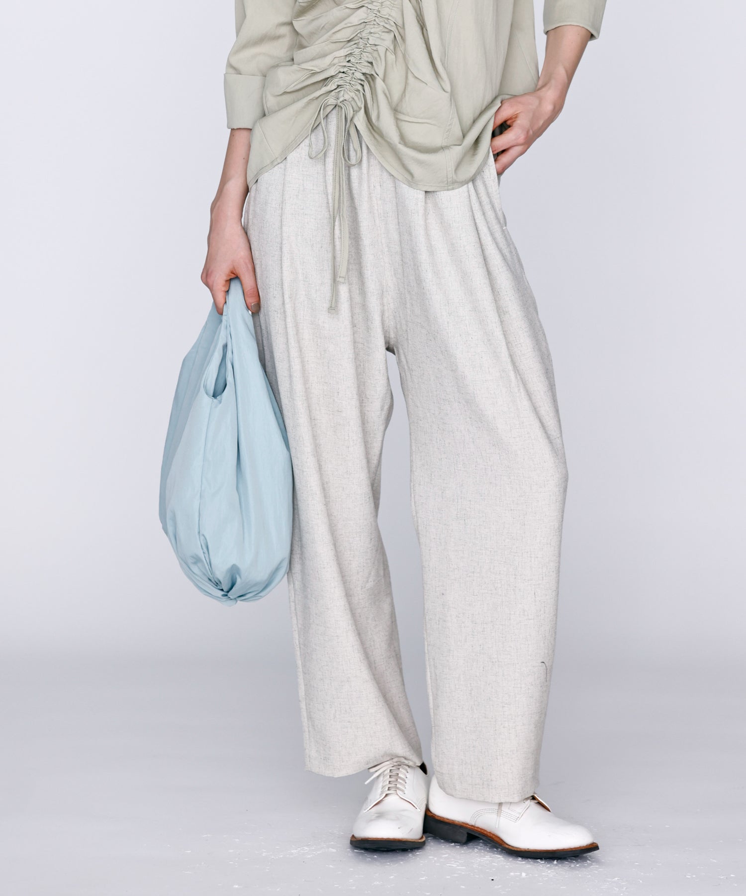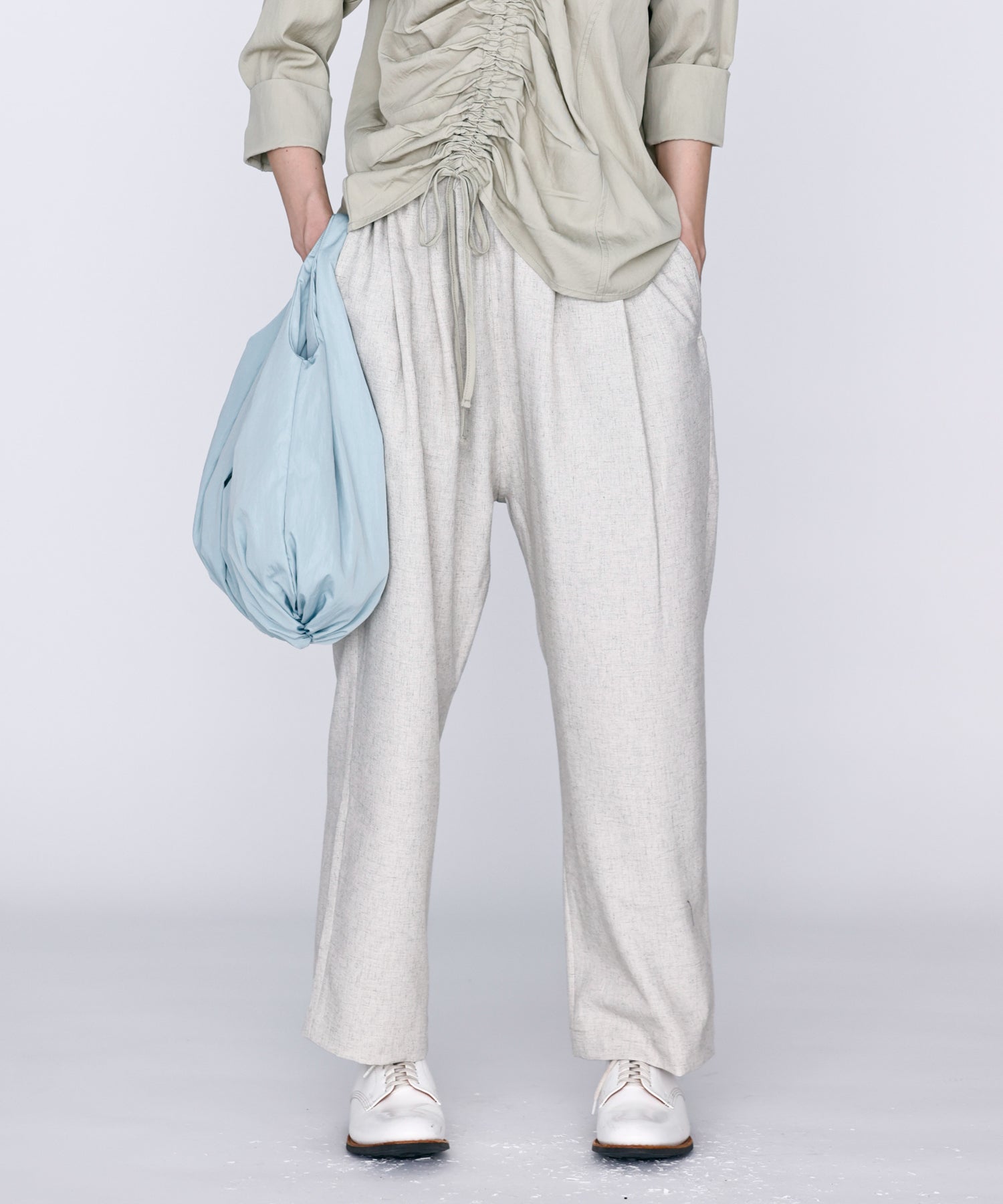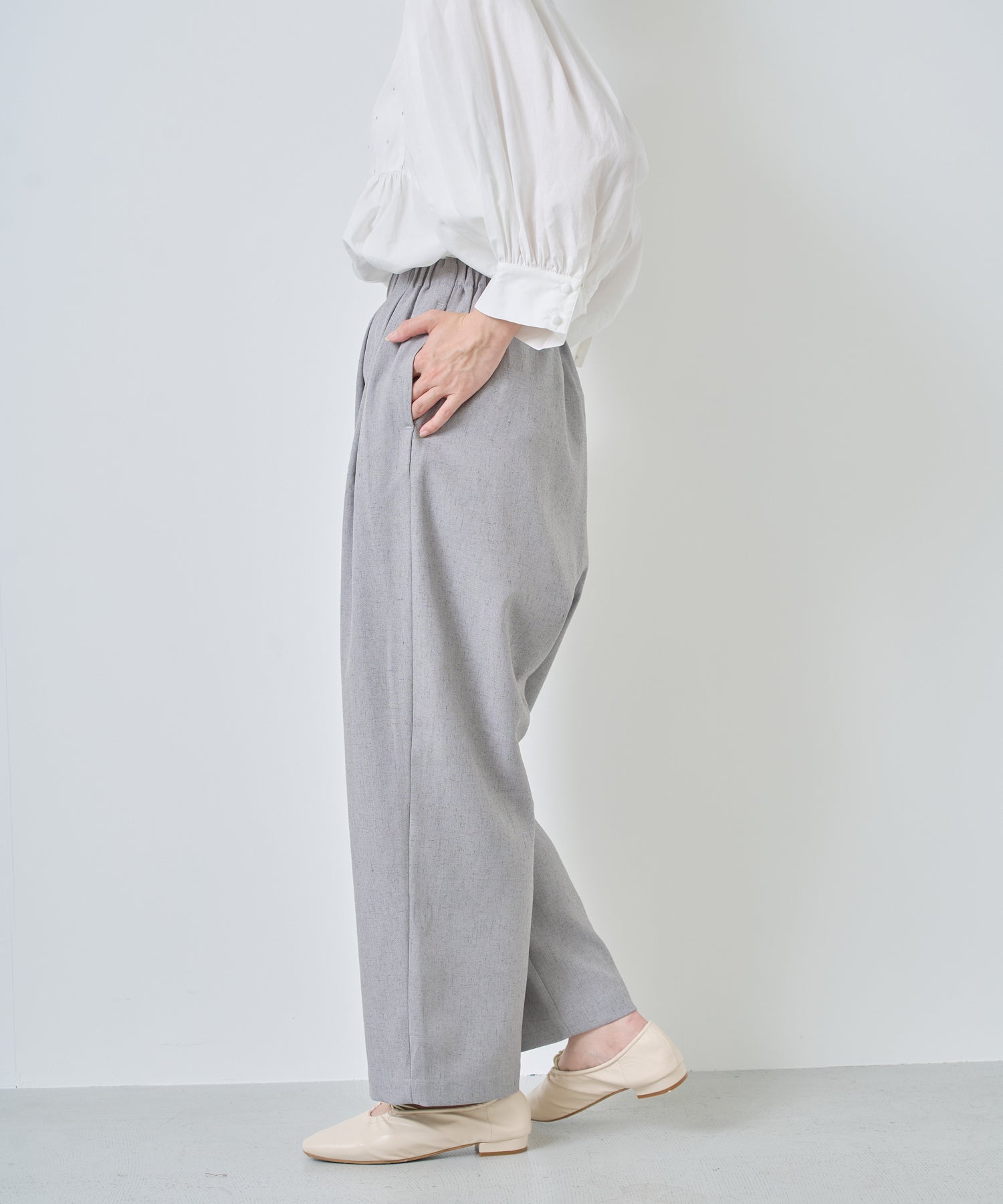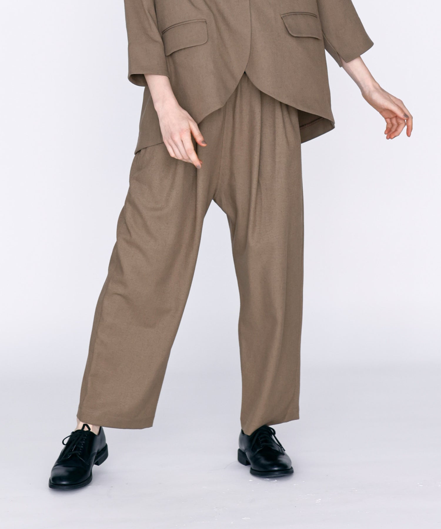 ウエストに大きくタックとギャザーを施し、裾に向かって落ちる綺麗なシルエットのパンツ。