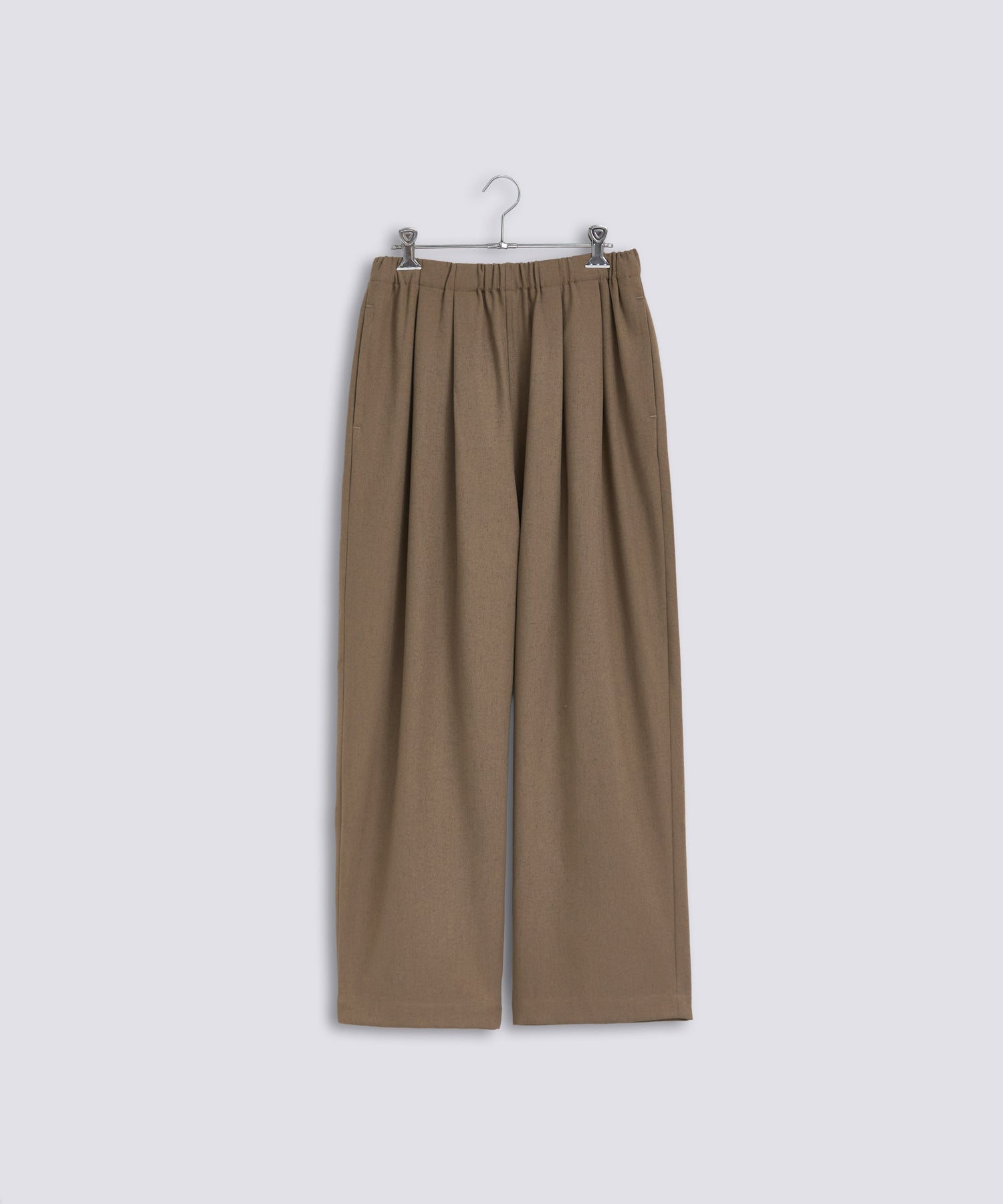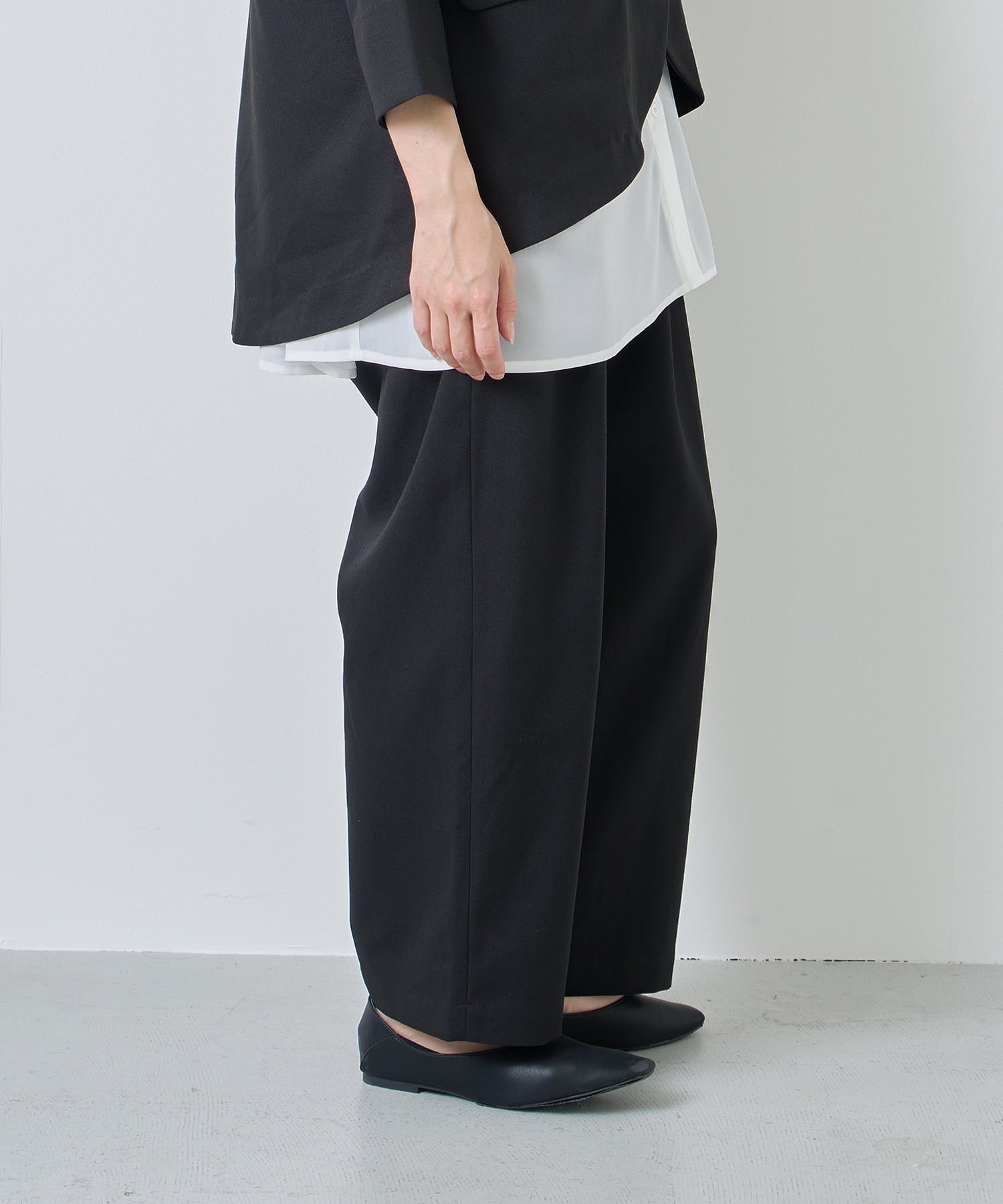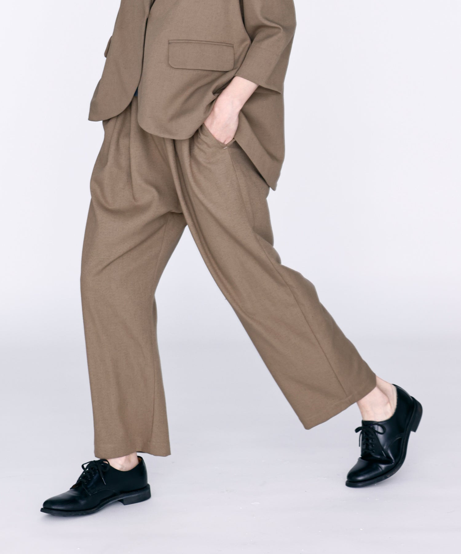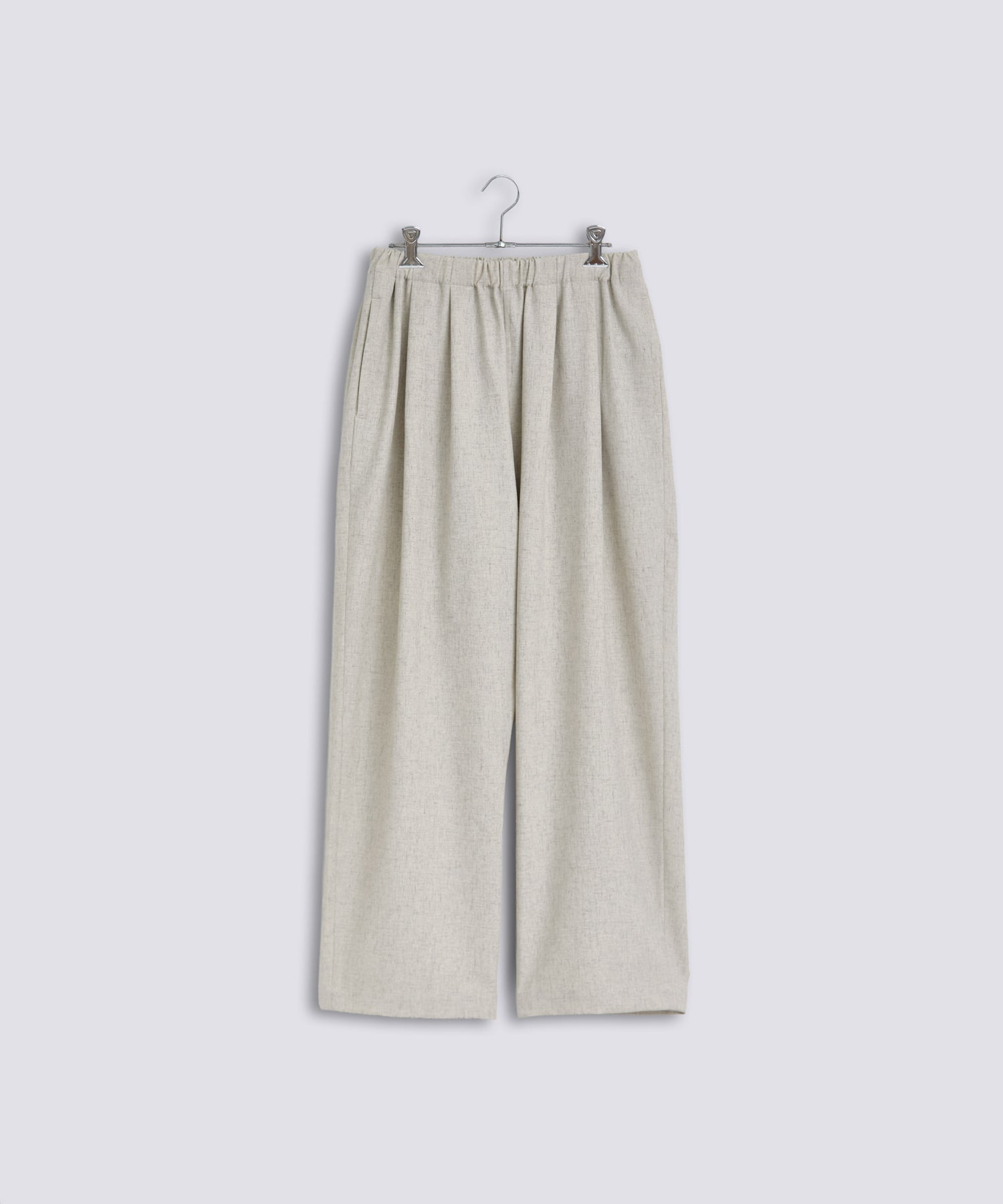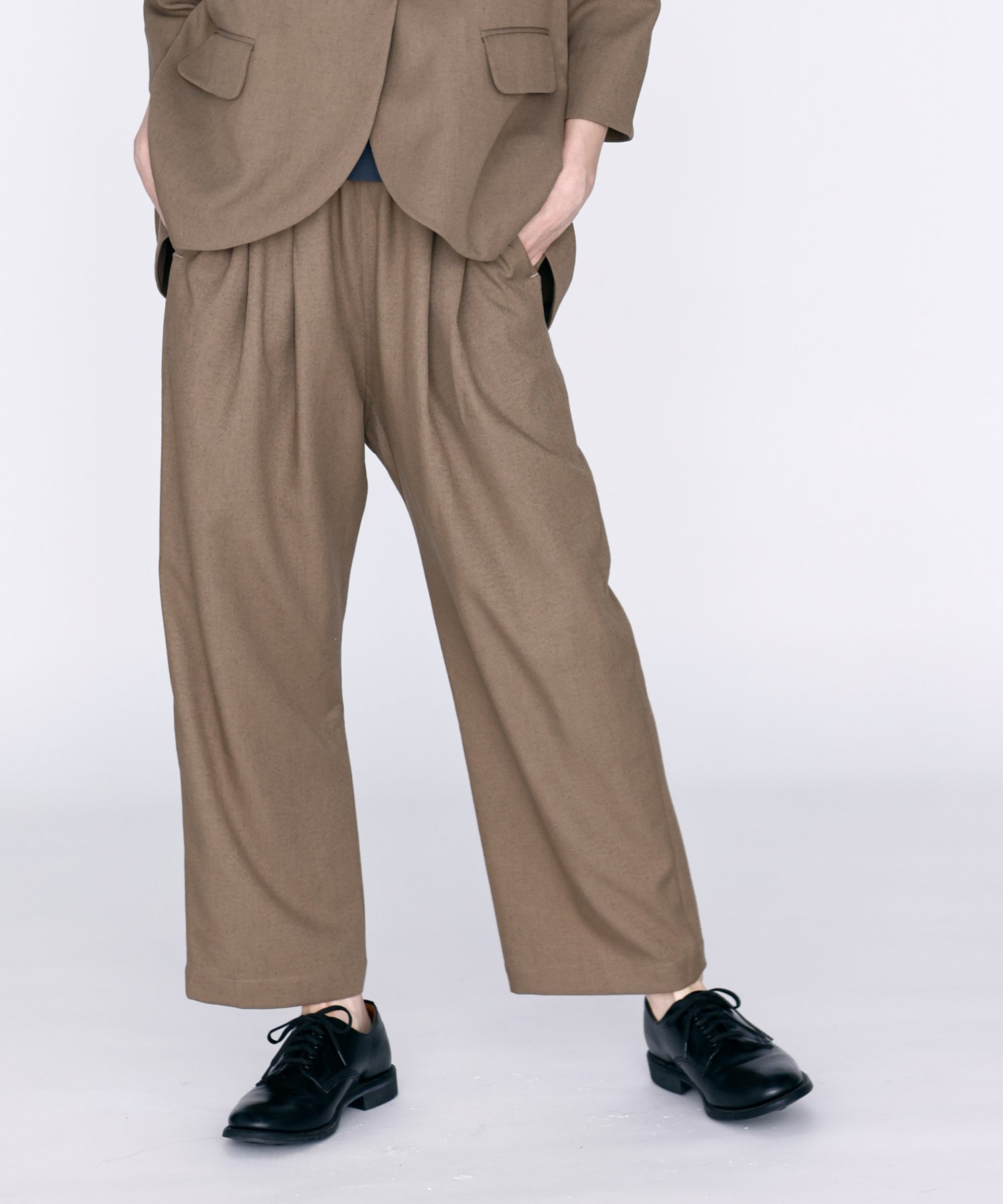 ウエストに大きくタックとギャザーを施し、裾に向かって落ちる綺麗なシルエットのパンツ。