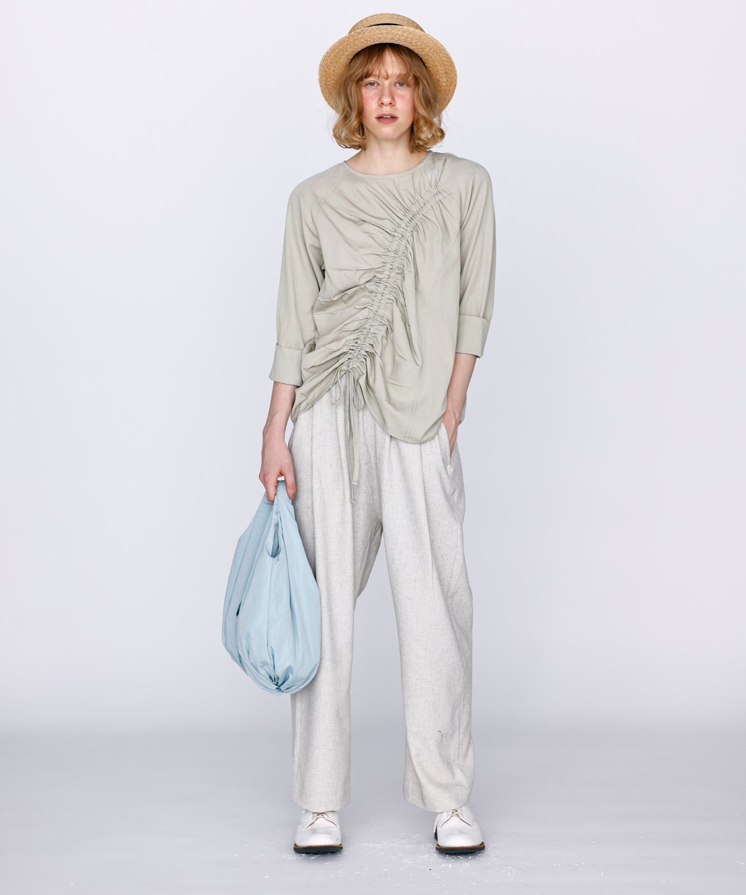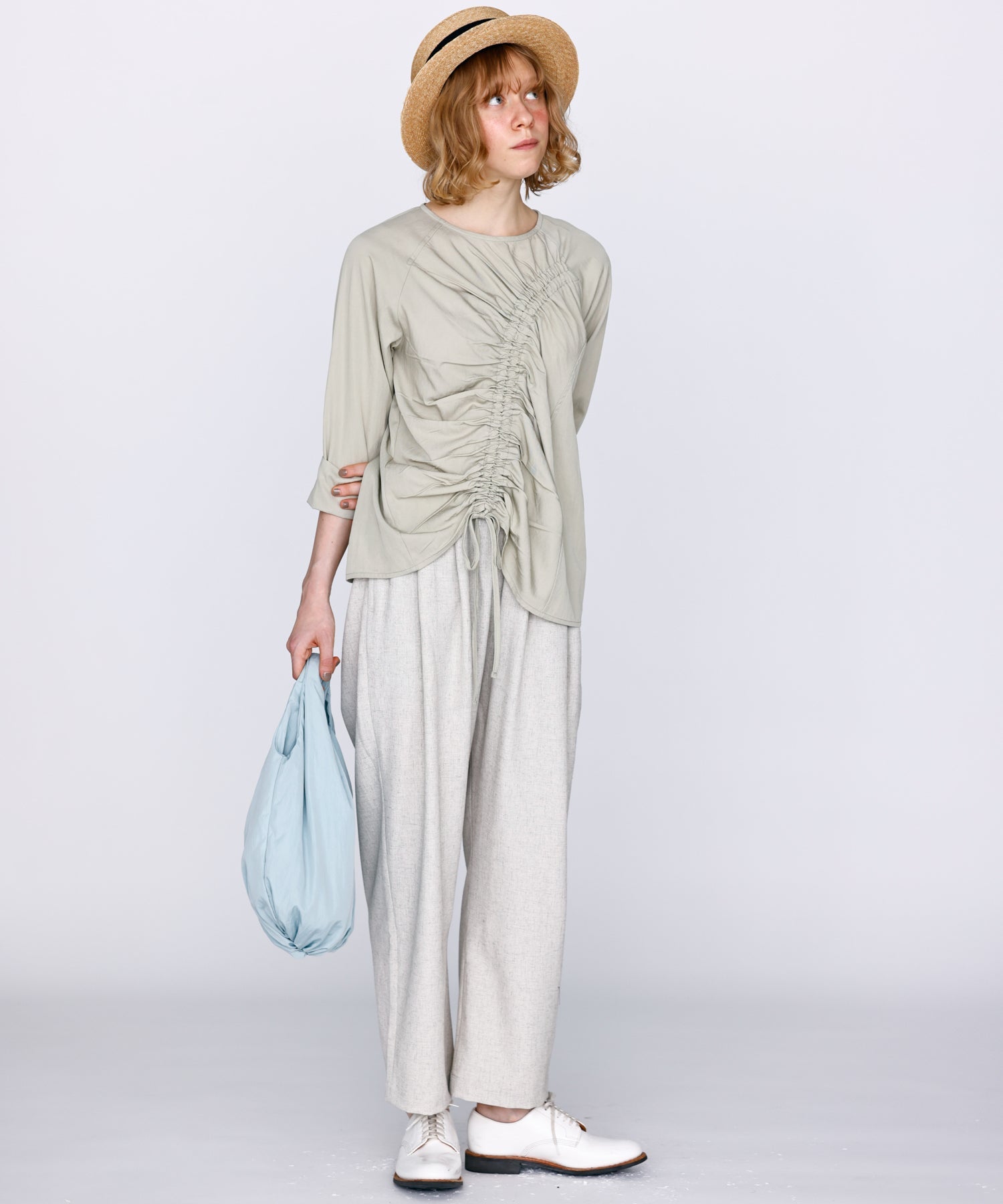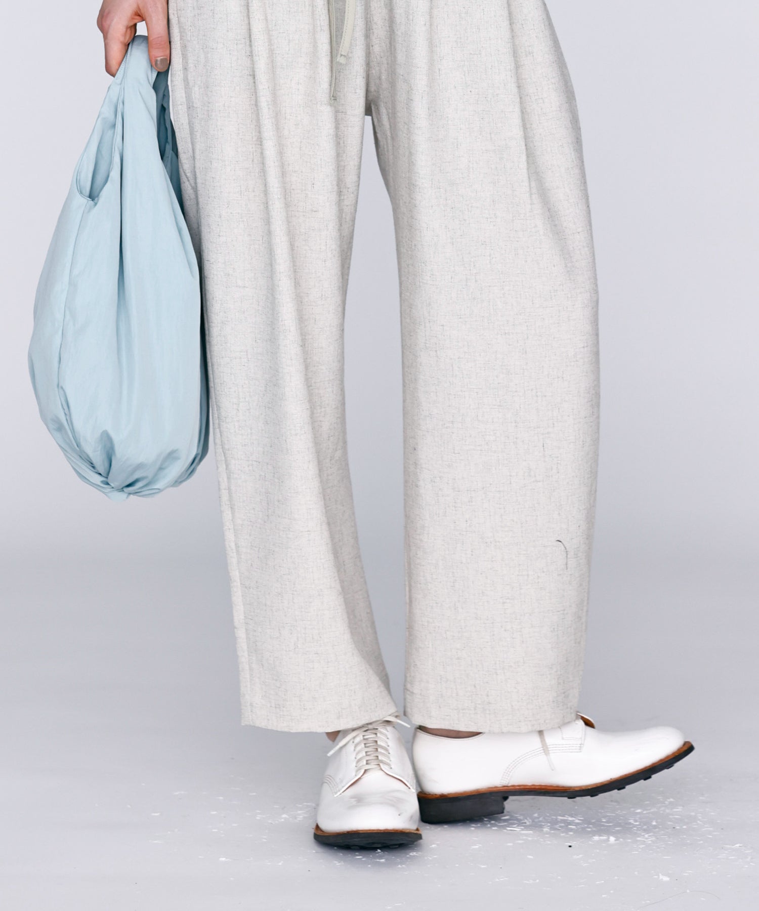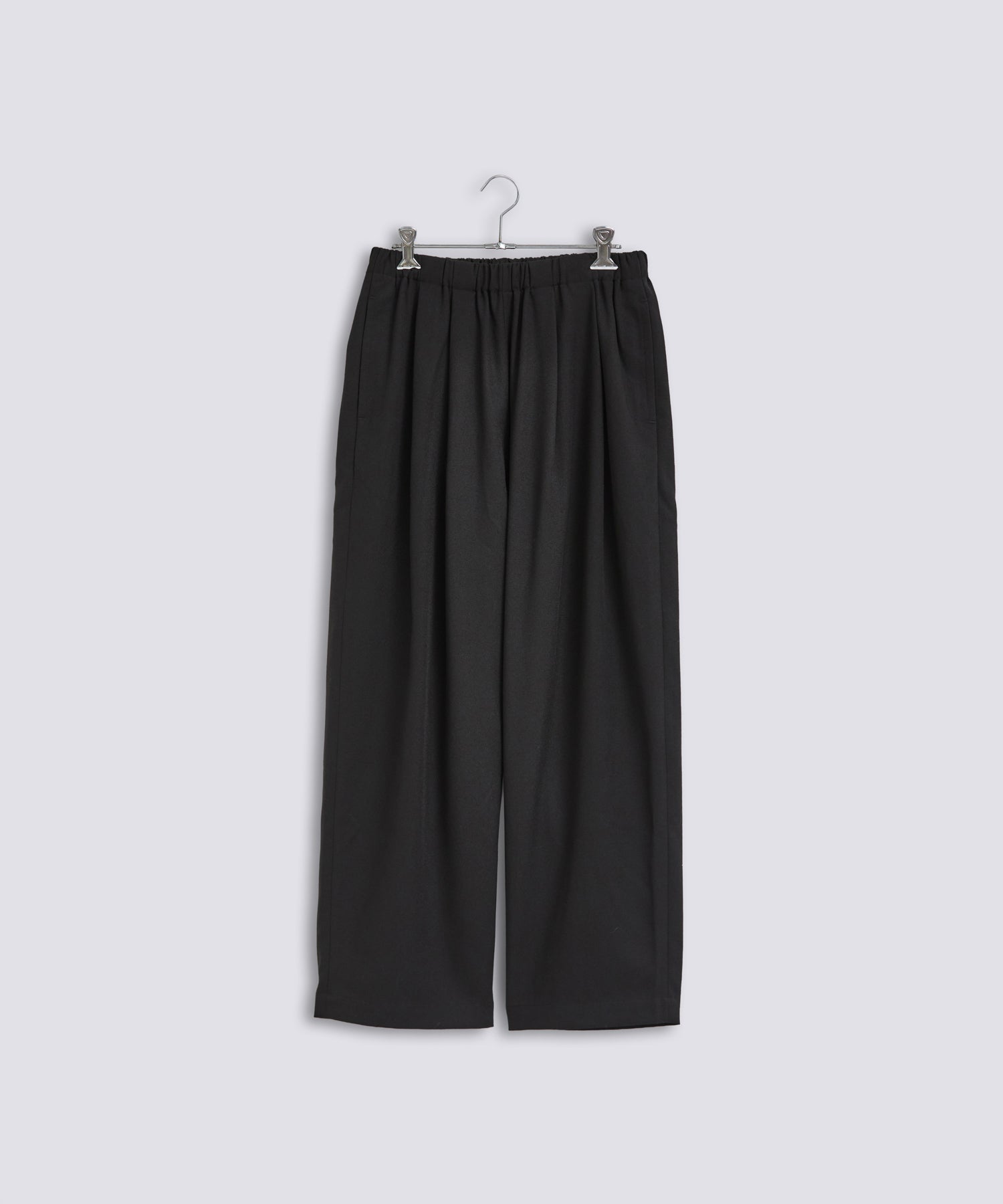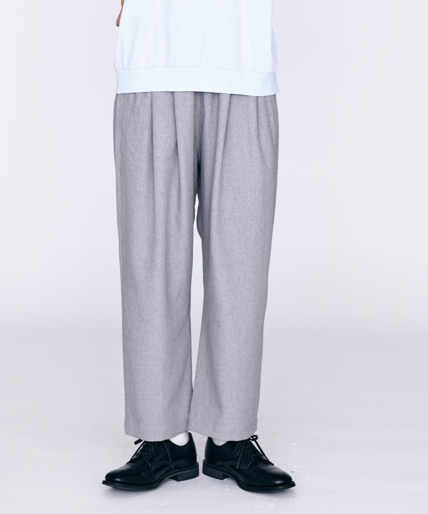 ウエストに大きくタックとギャザーを施し、裾に向かって落ちる綺麗なシルエットのパンツ。