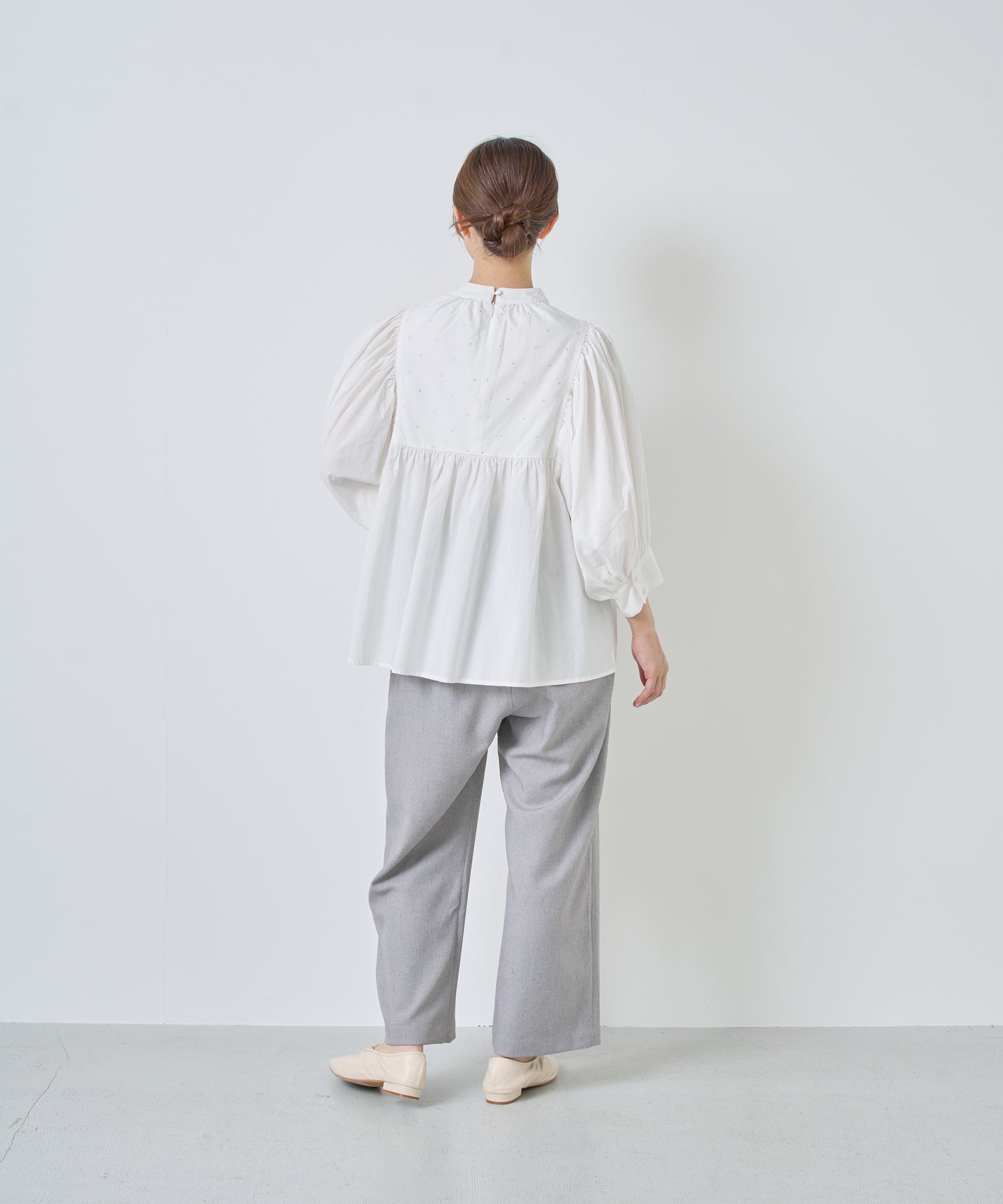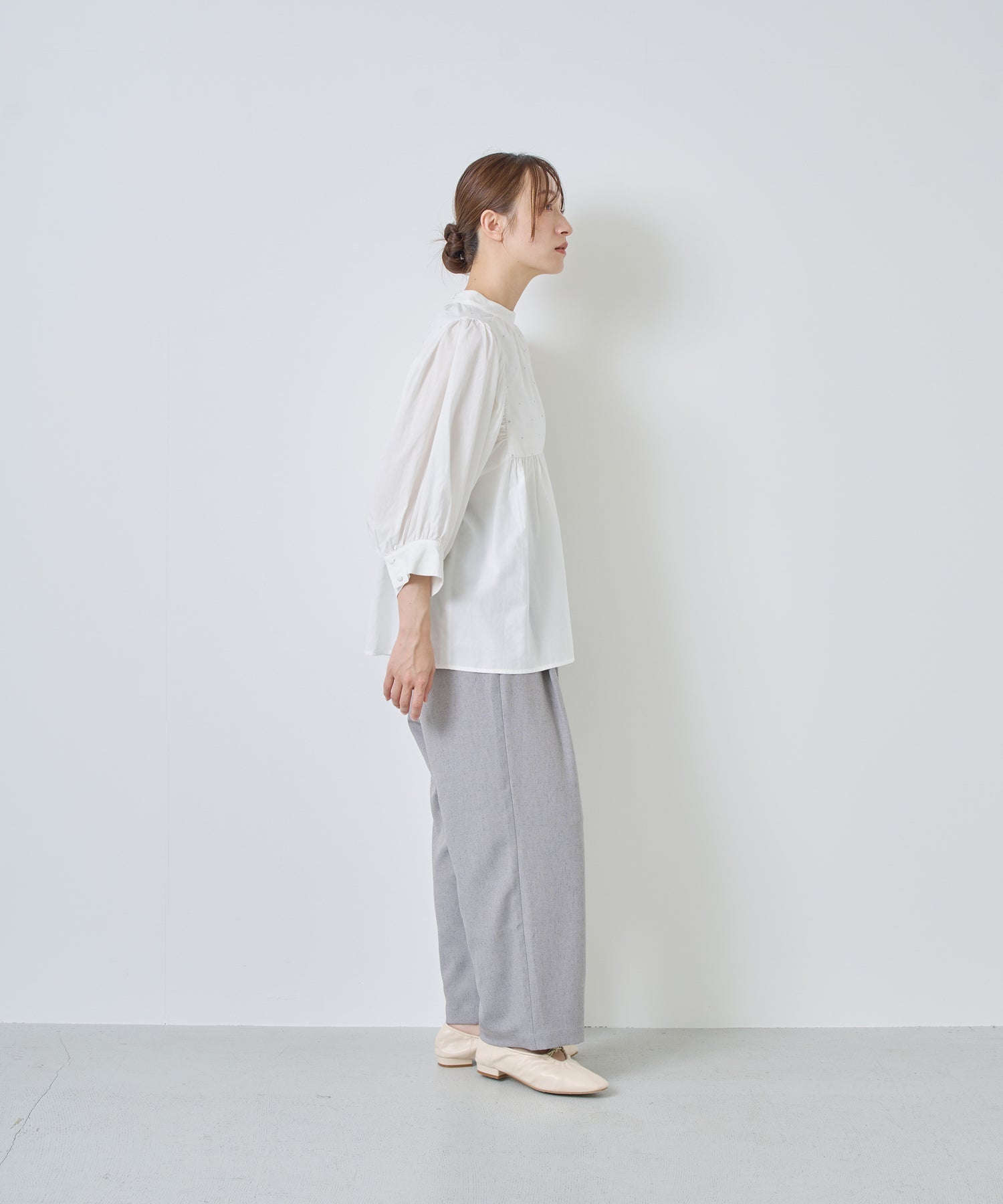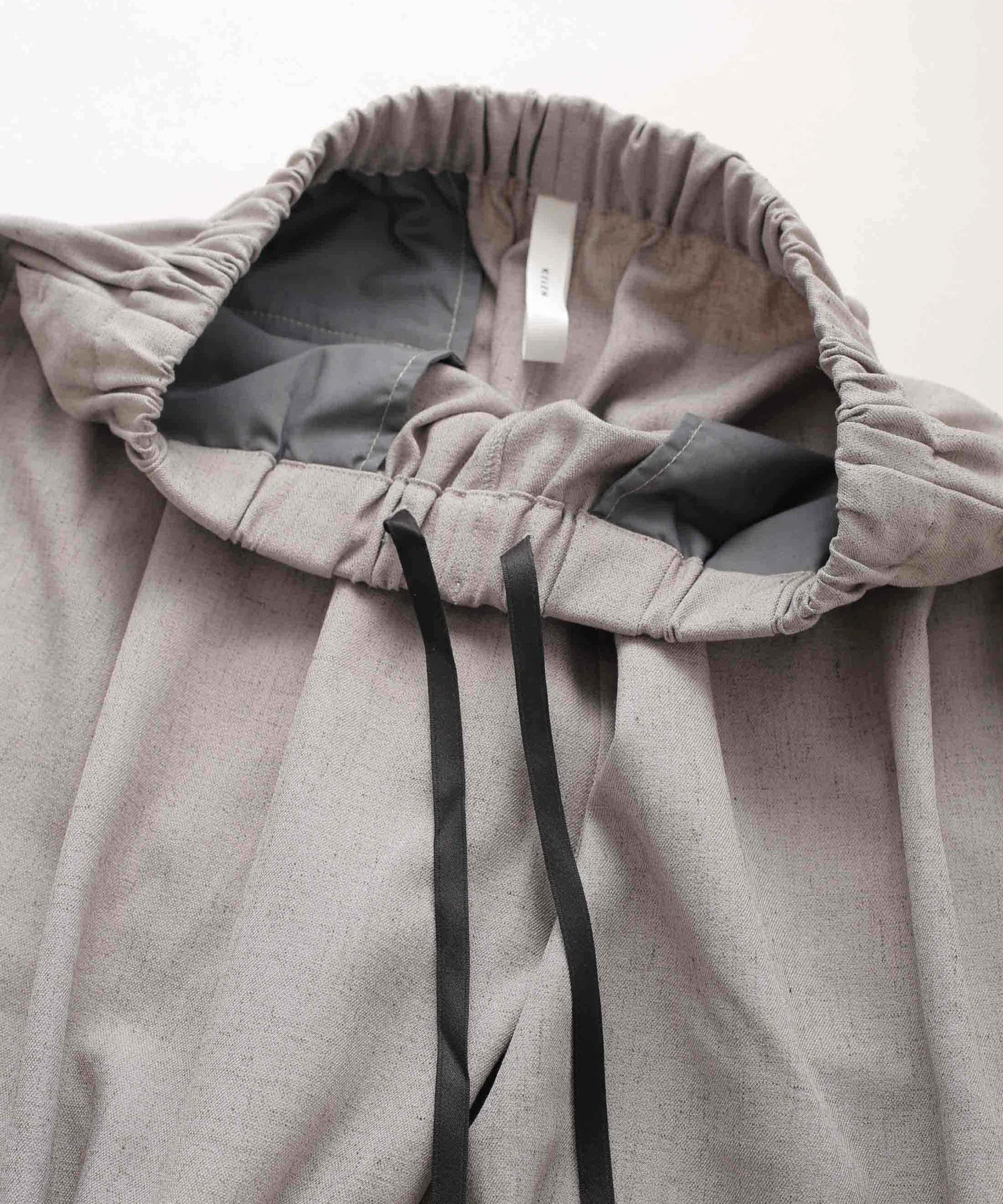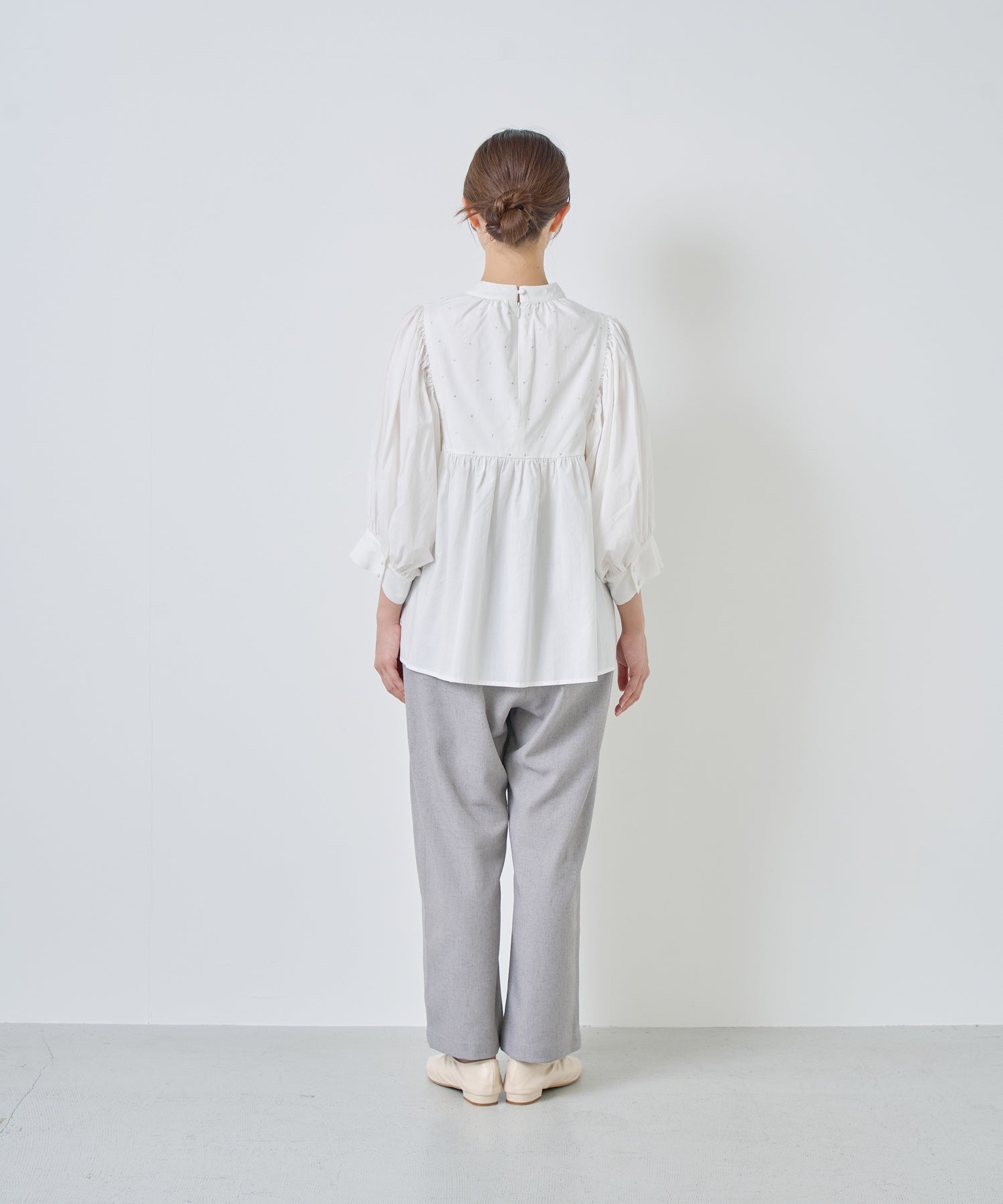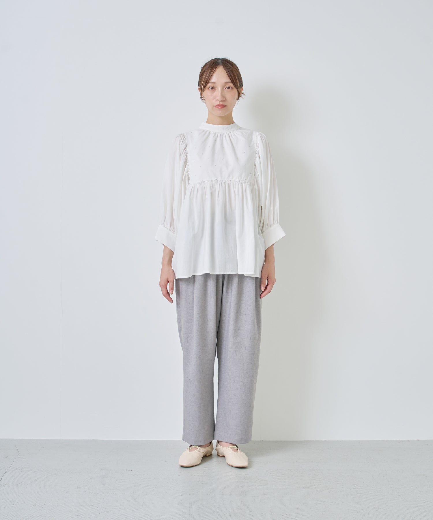 ウエストに大きくタックとギャザーを施し、裾に向かって落ちる綺麗なシルエットのパンツ。