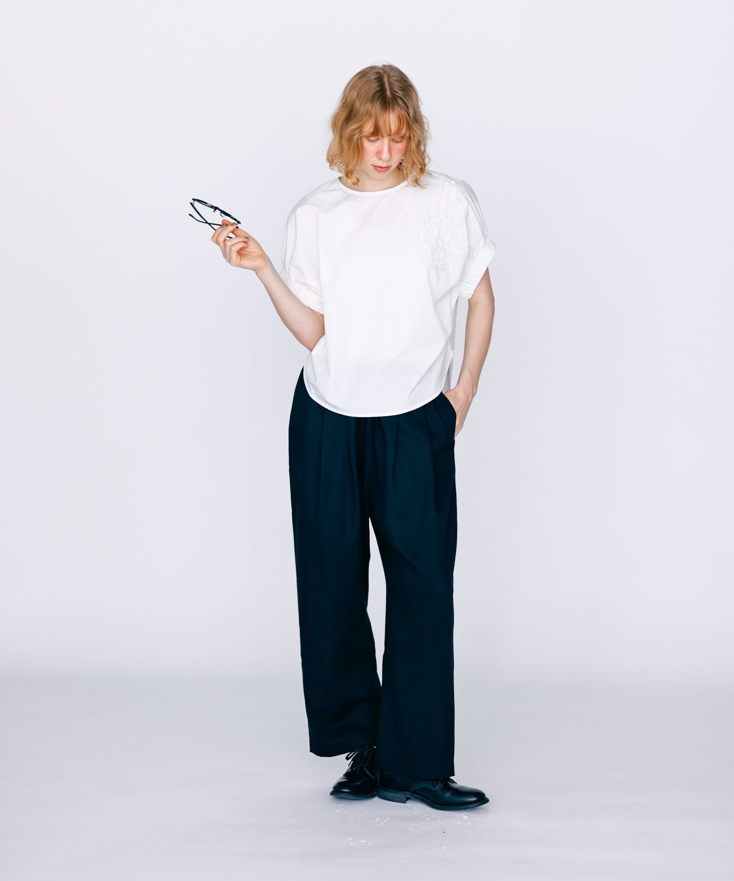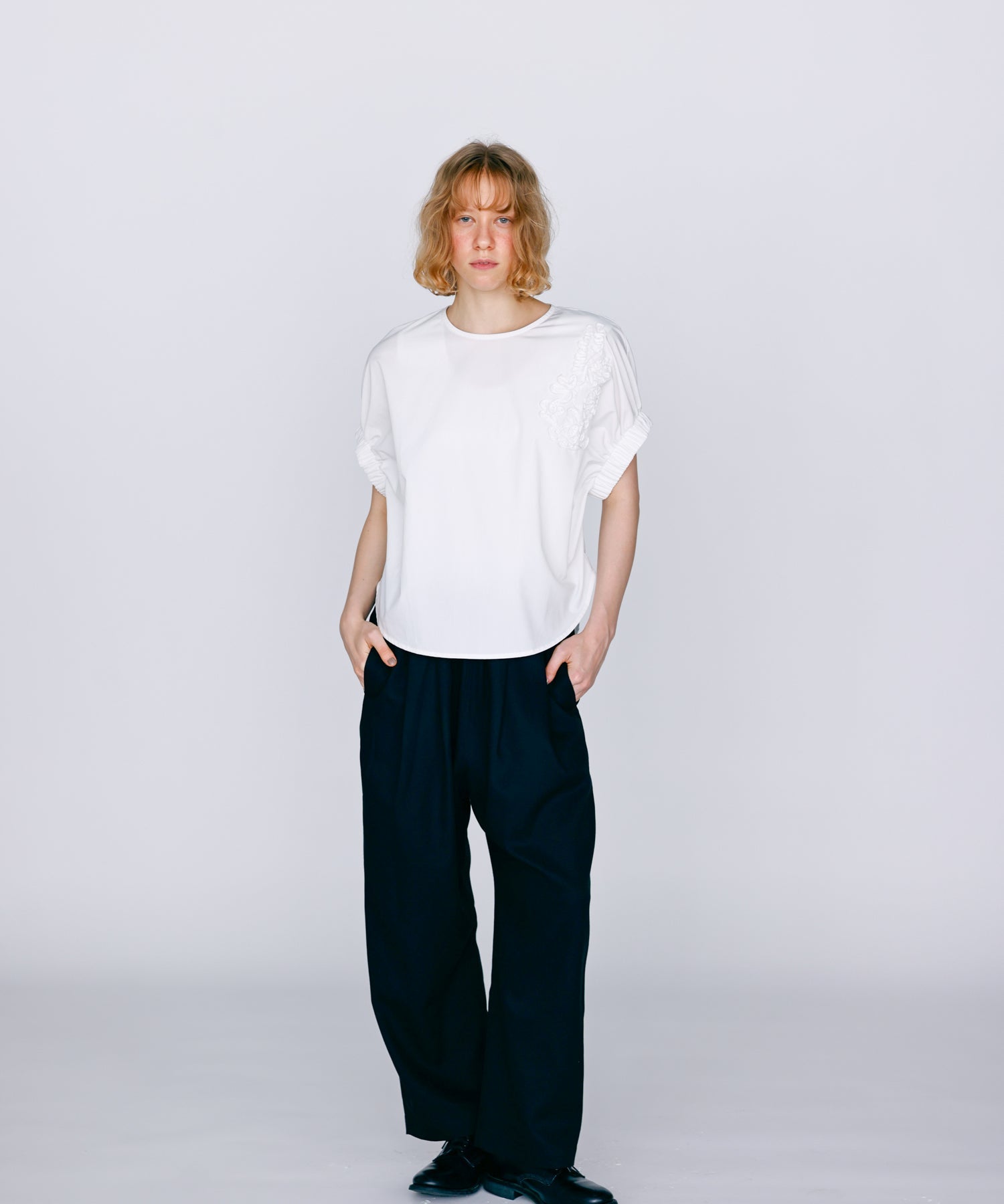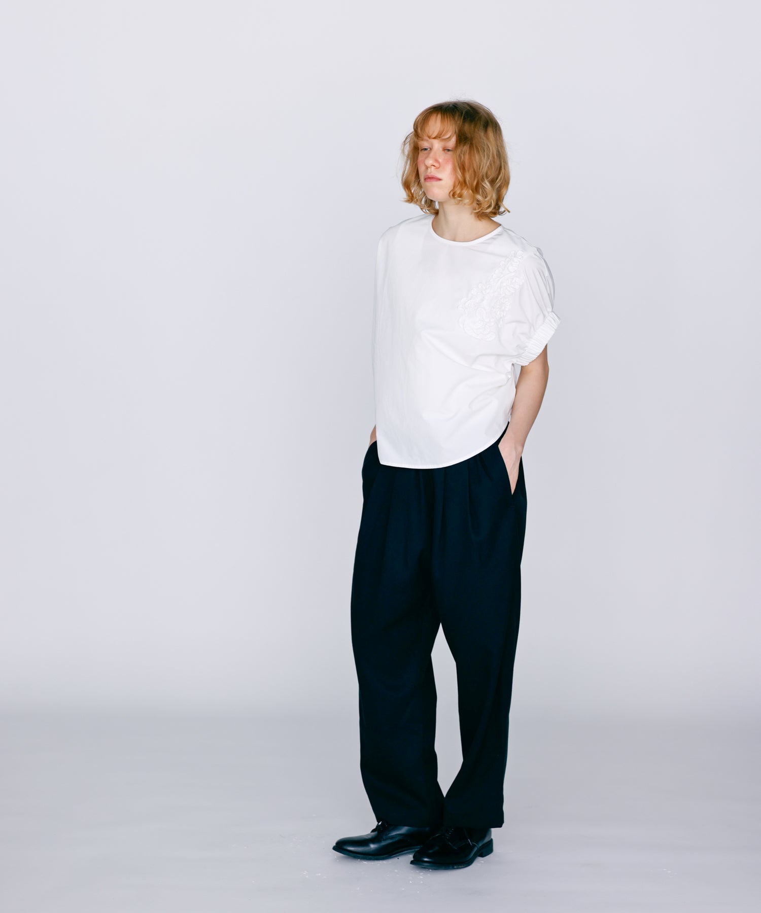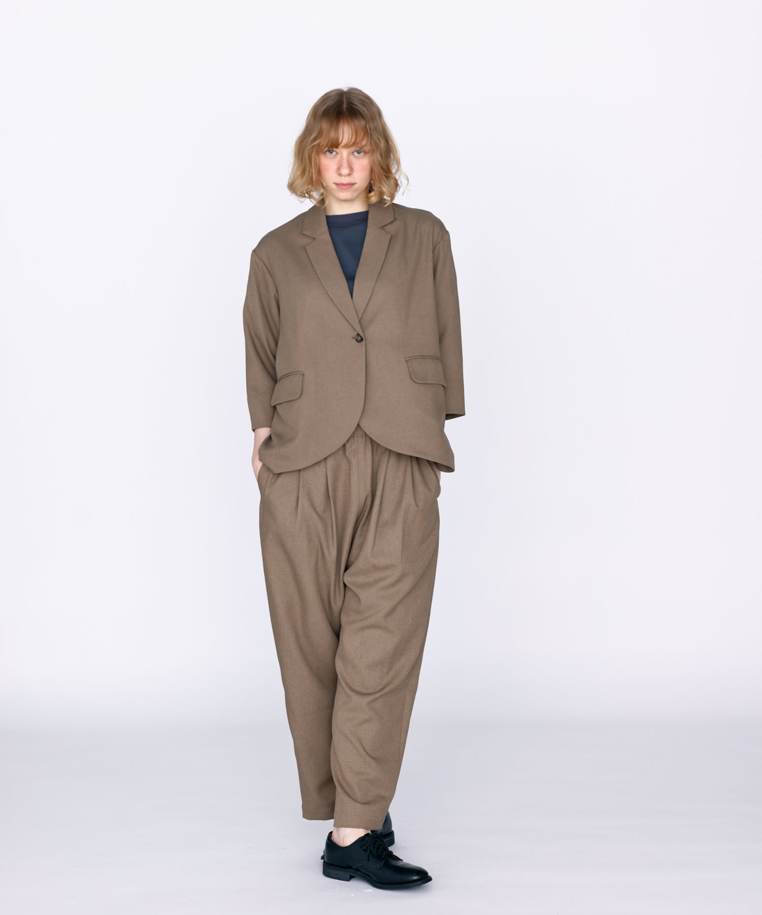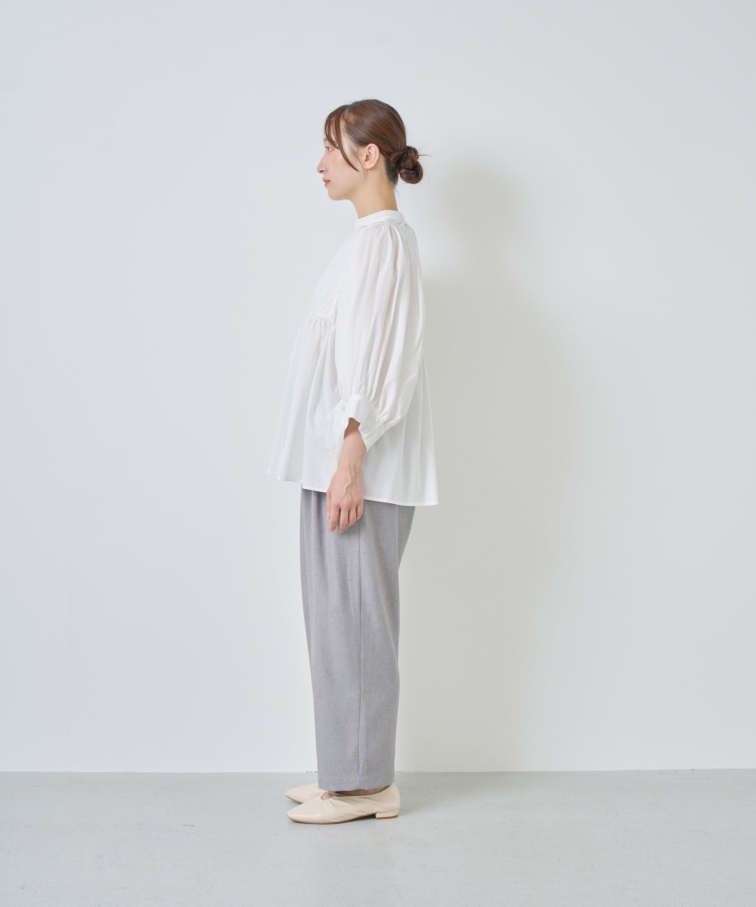 ウエストに大きくタックとギャザーを施し、裾に向かって落ちる綺麗なシルエットのパンツ。