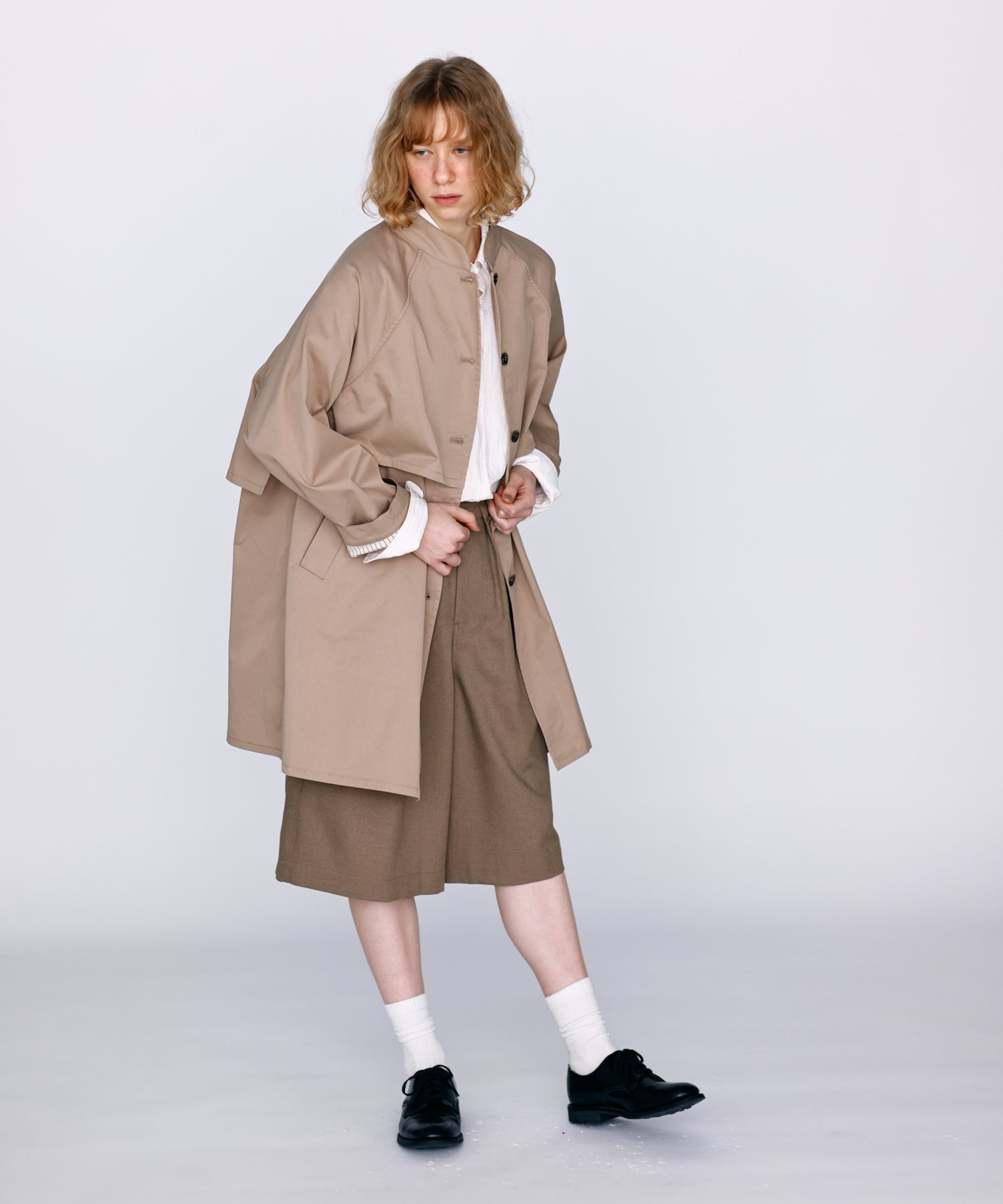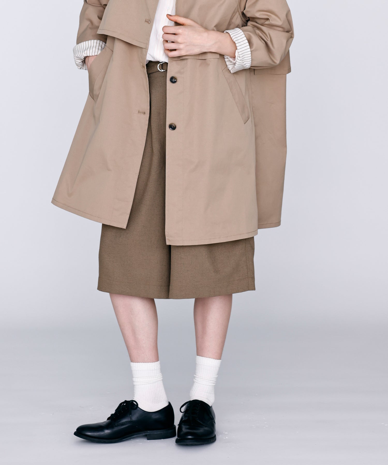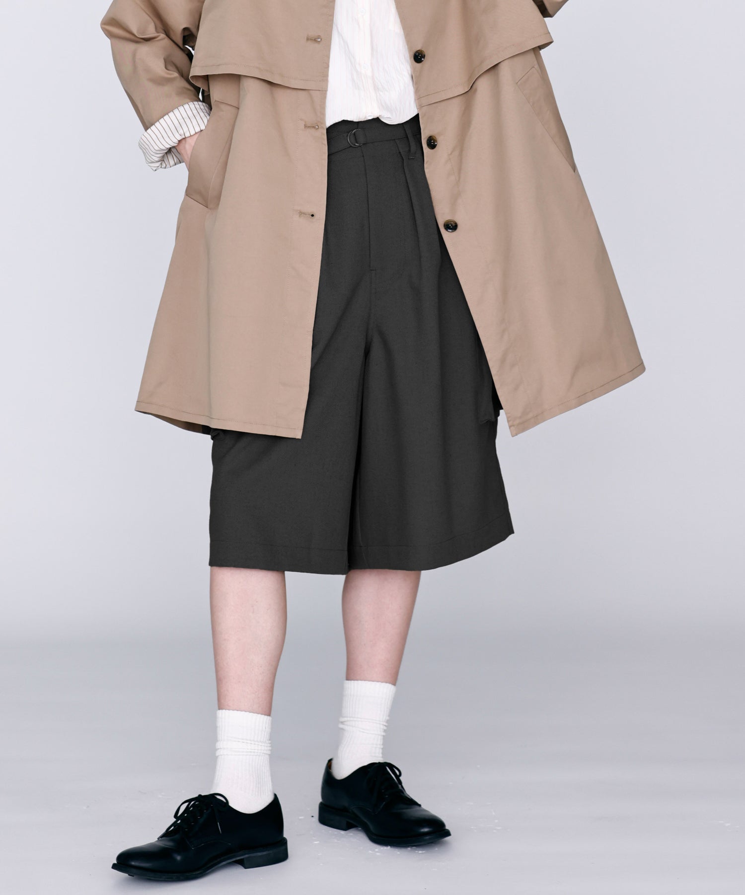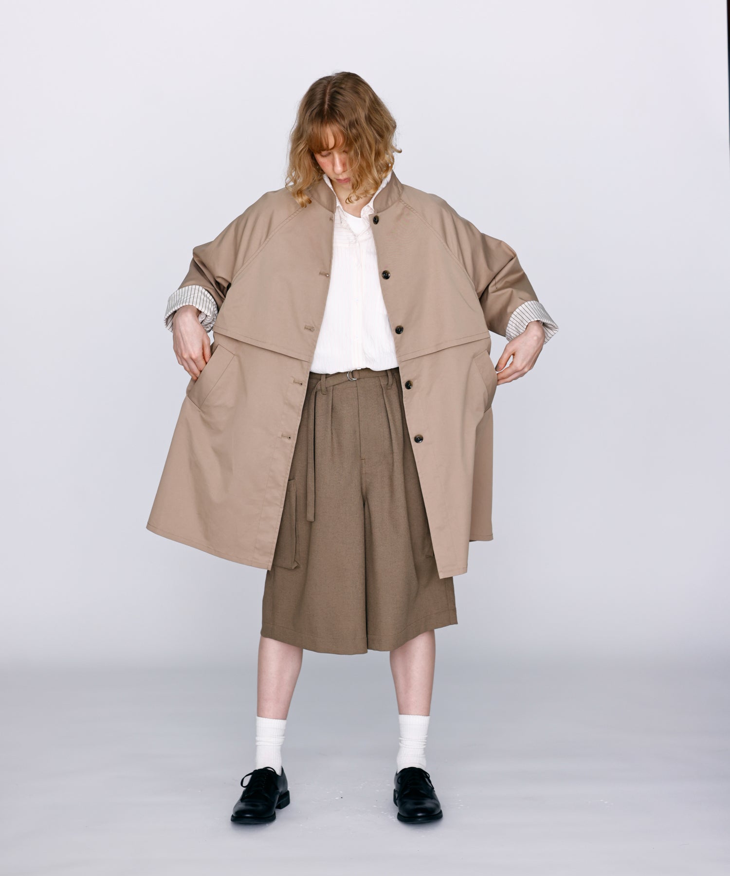 ワイドストレートに落ちるシルエットで膝まで隠れる着丈に設定。