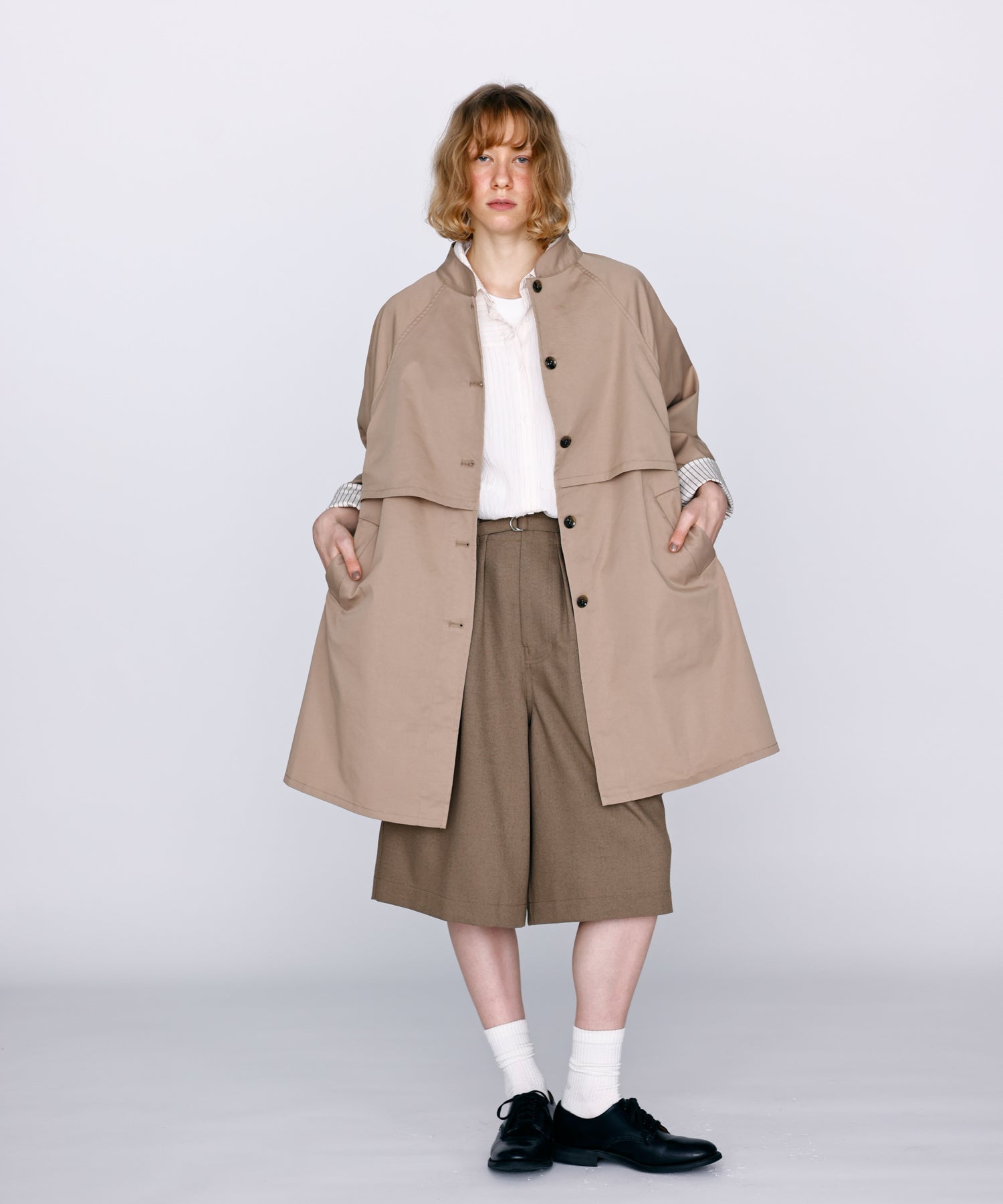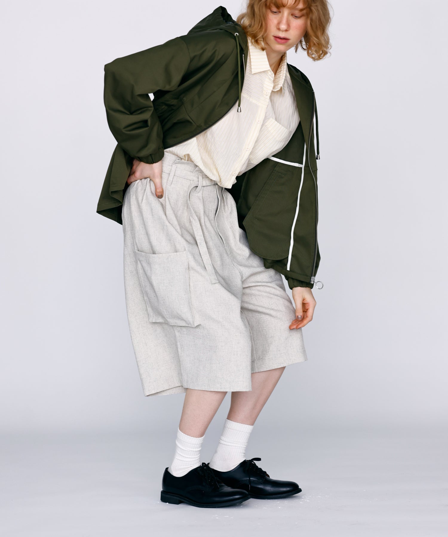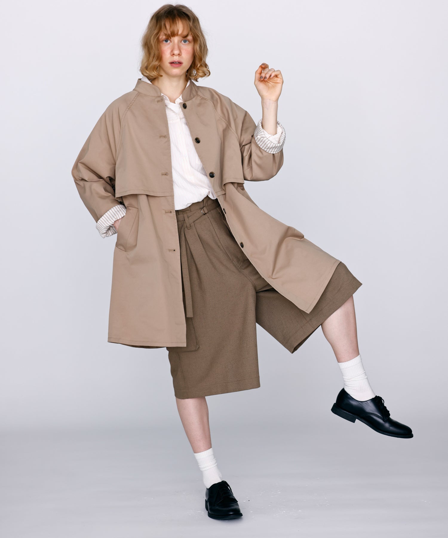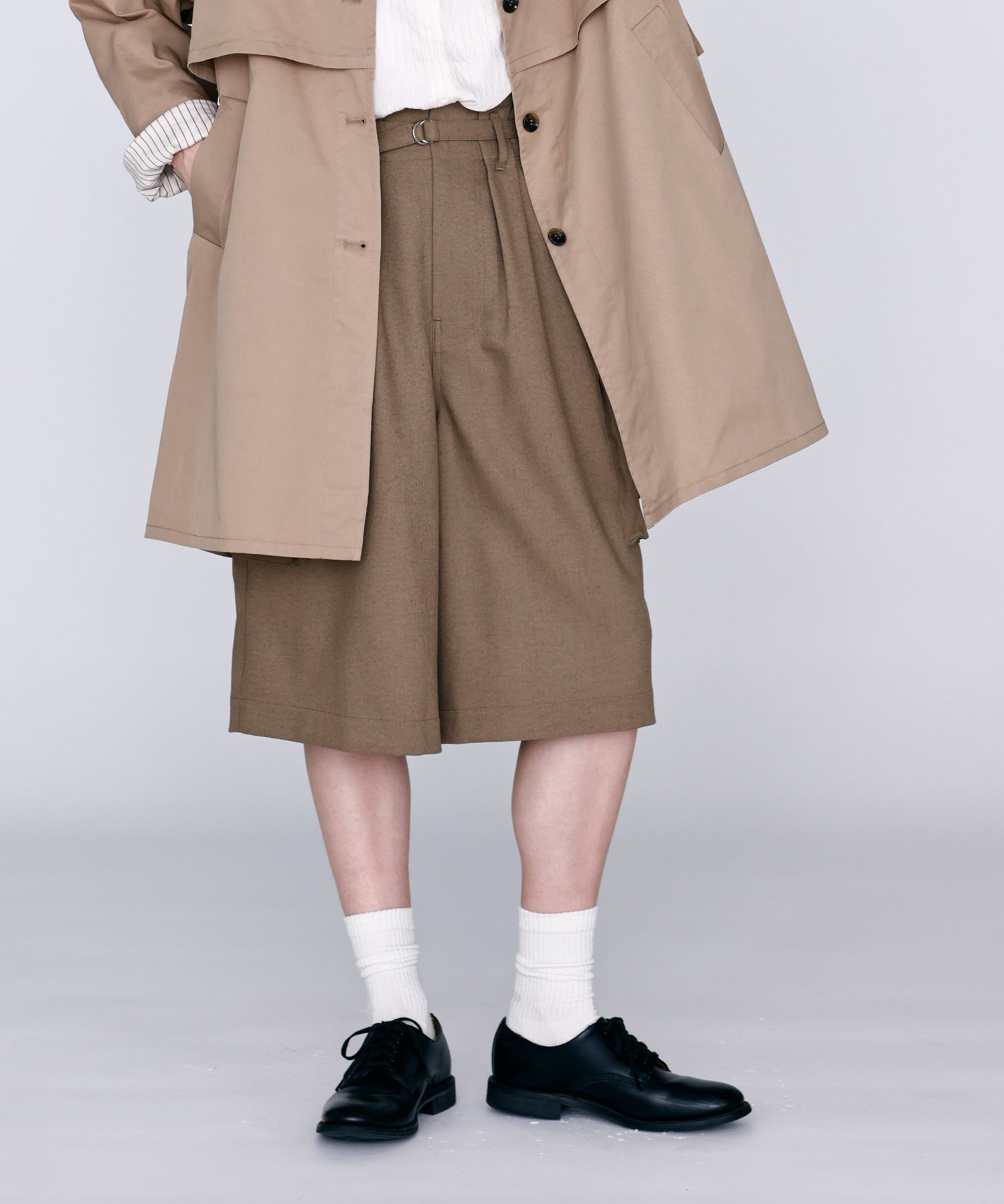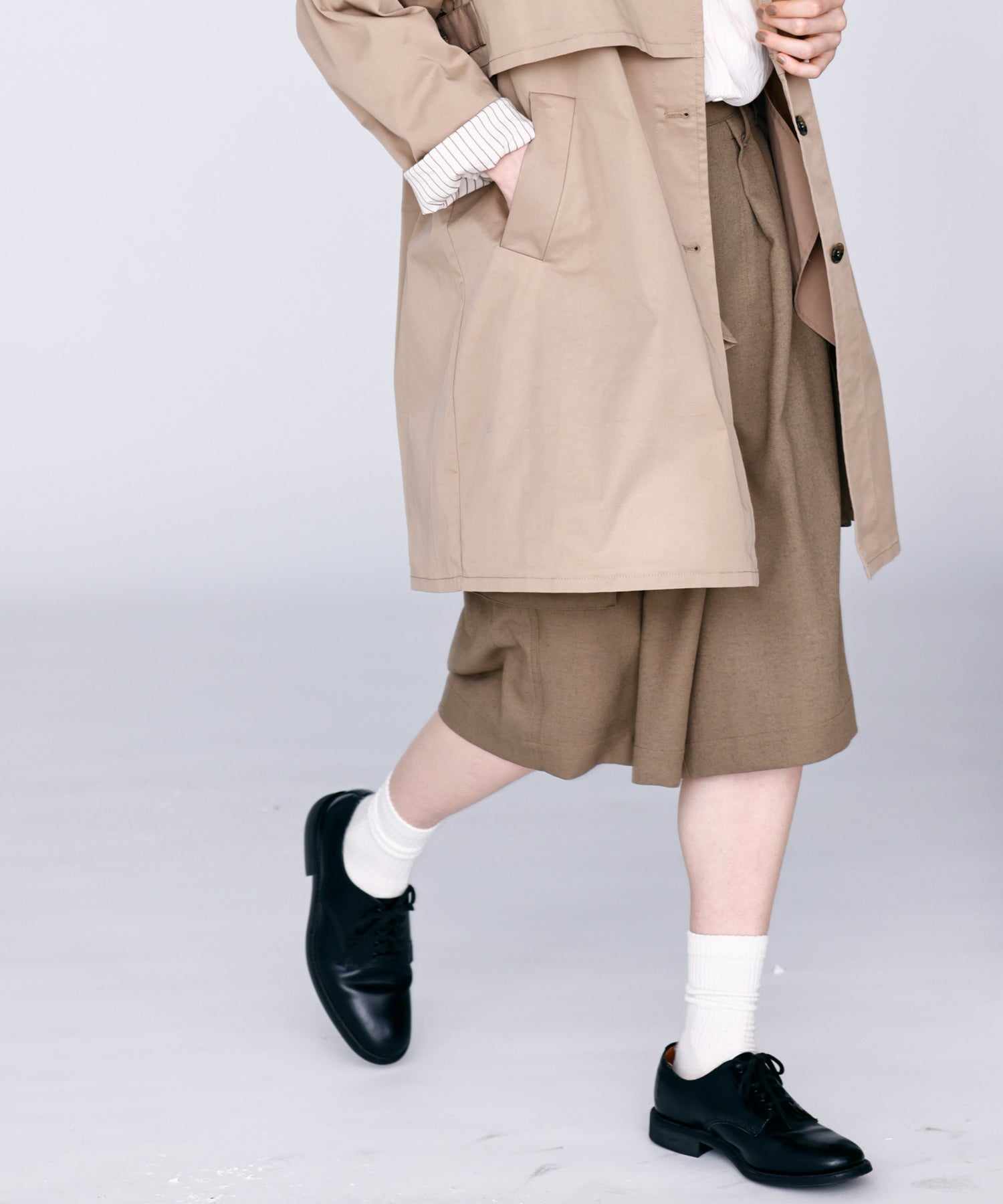 ワイドストレートに落ちるシルエットで膝まで隠れる着丈に設定。