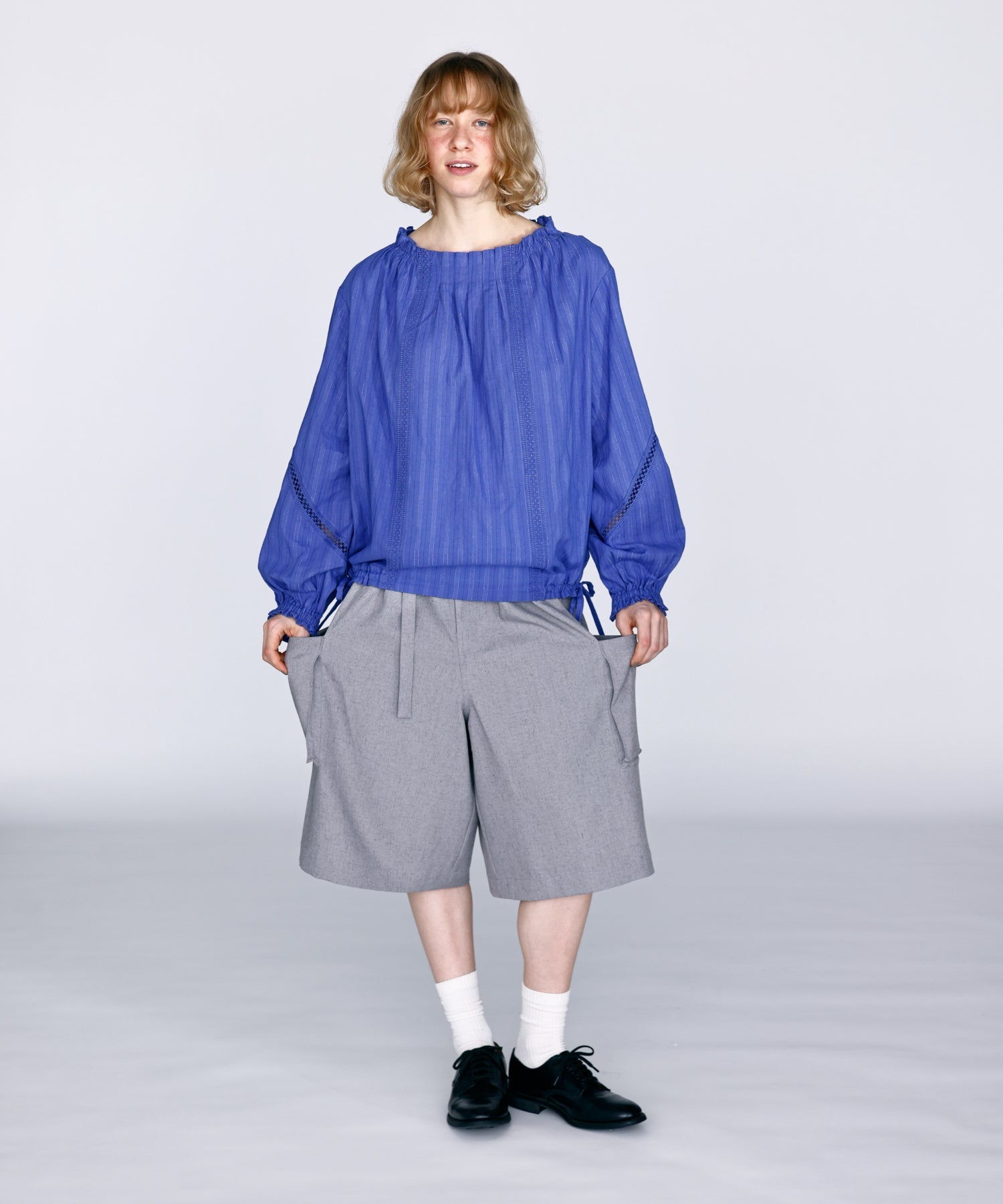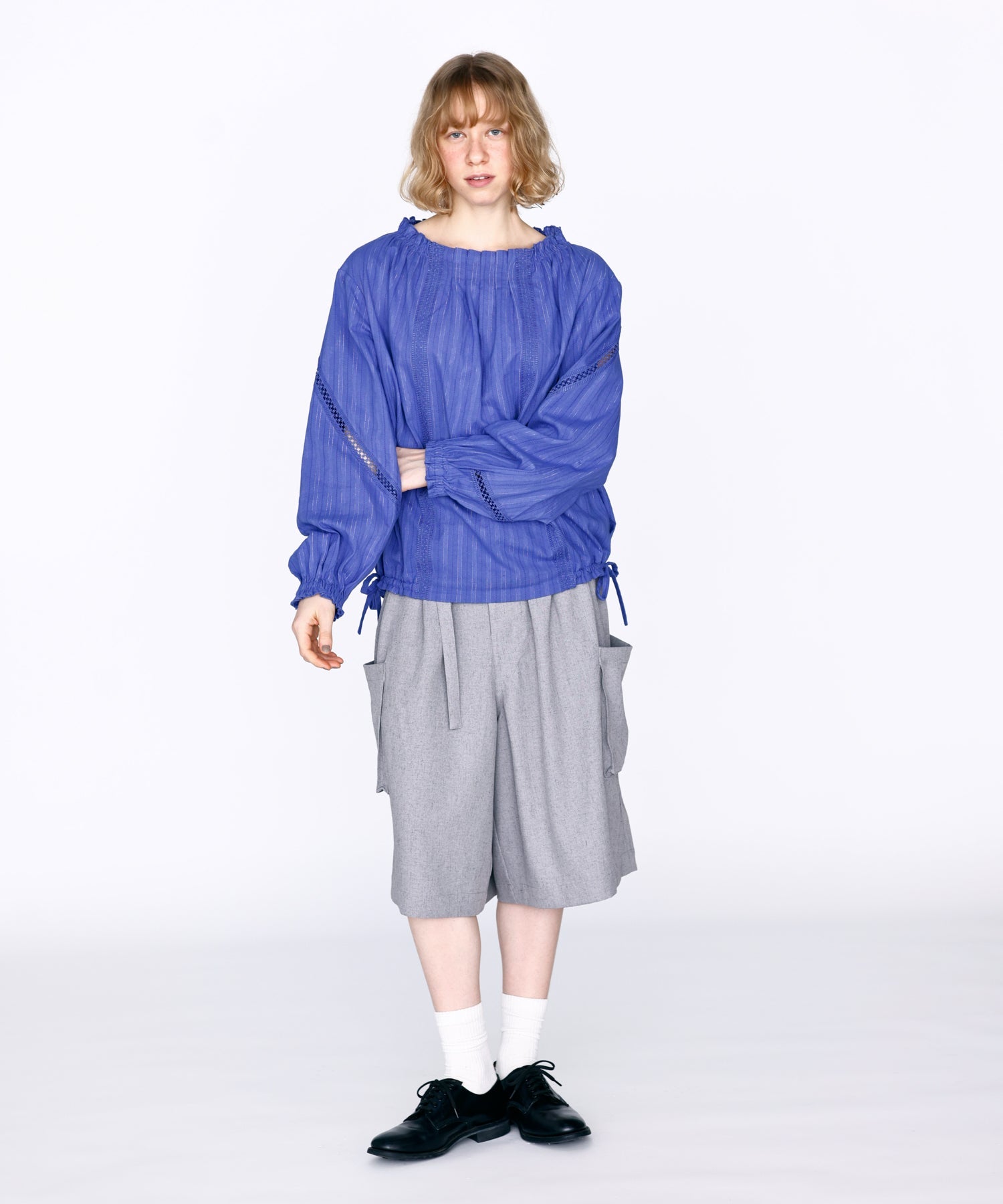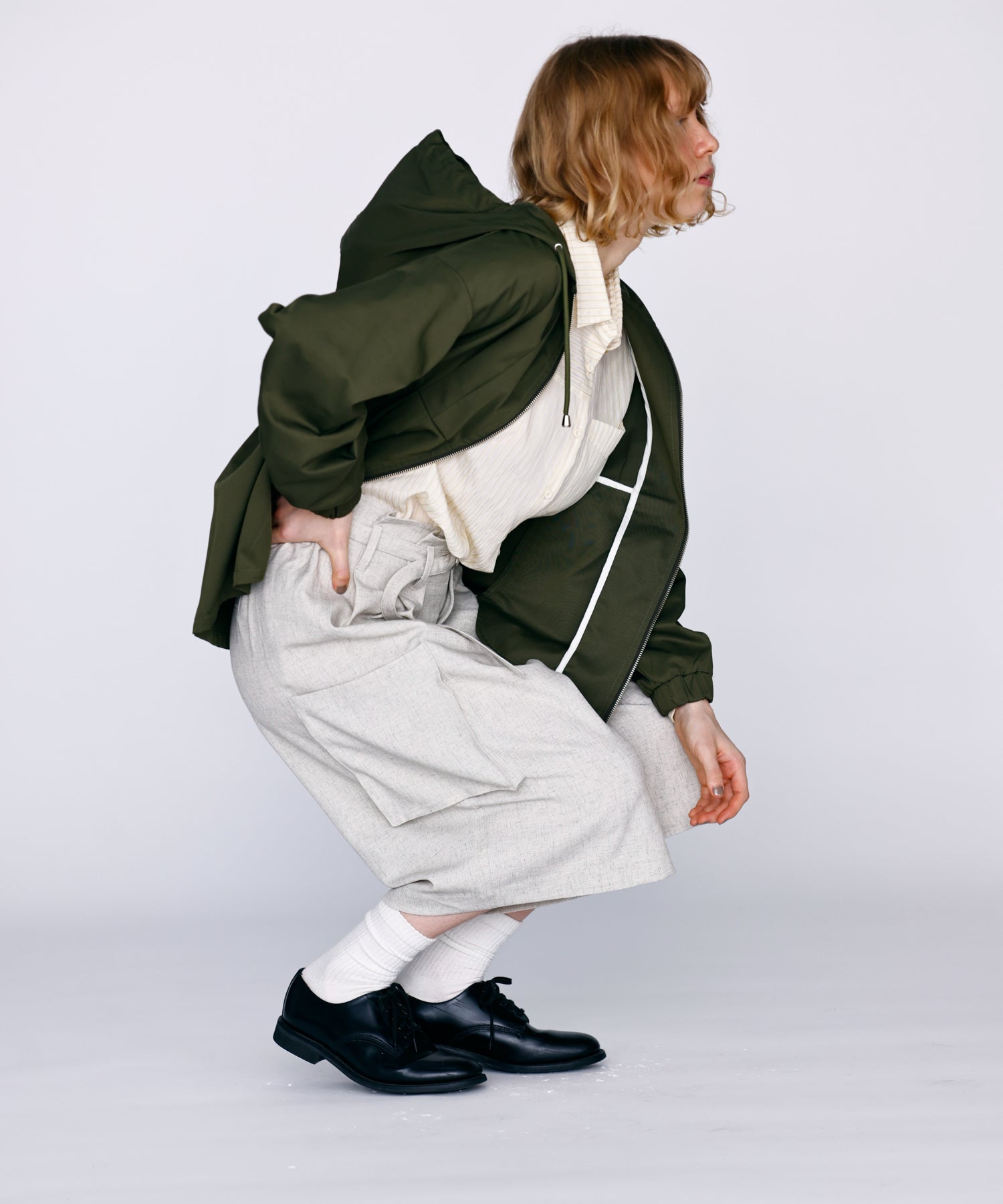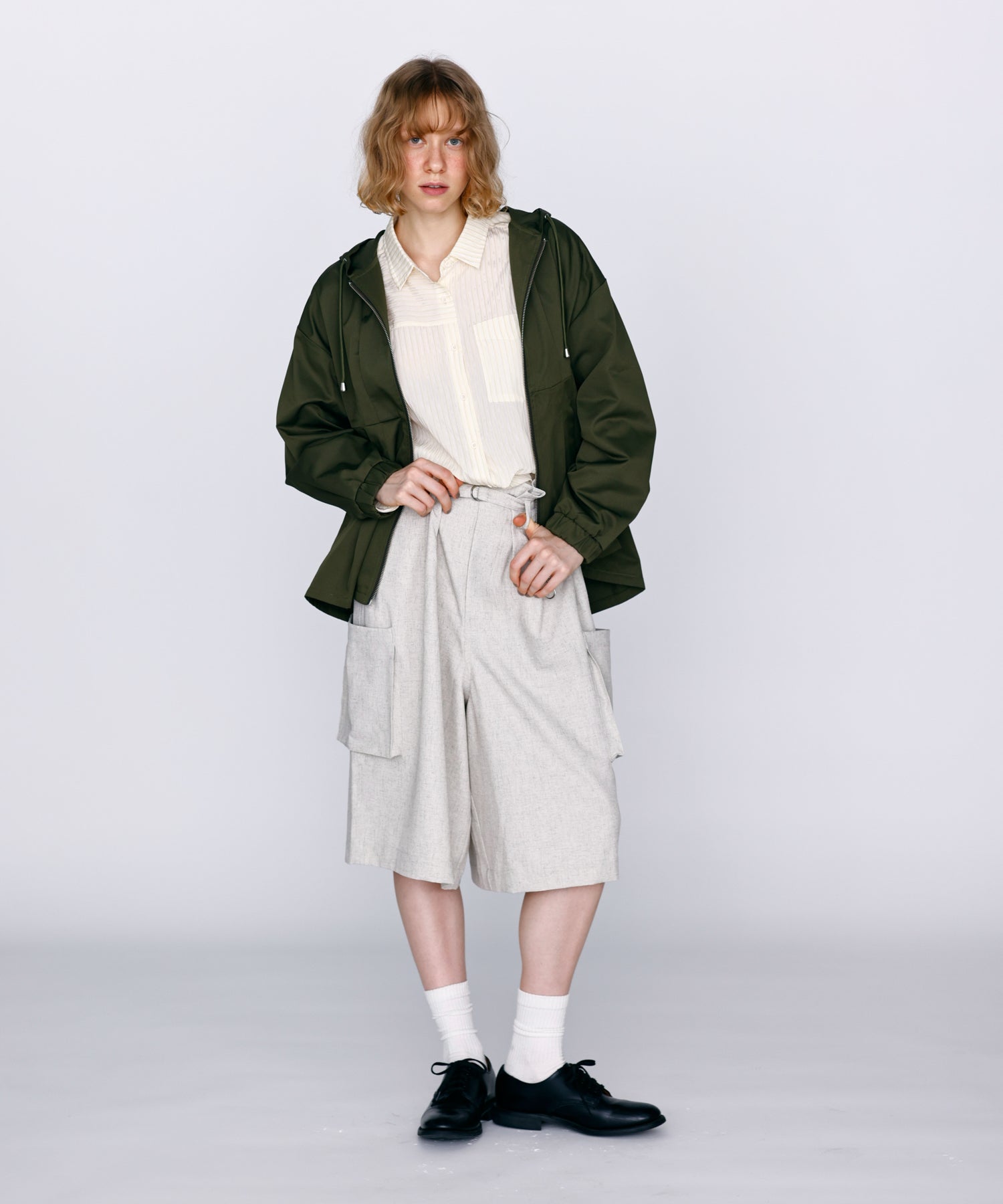ワイドストレートに落ちるシルエットで膝まで隠れる着丈に設定。