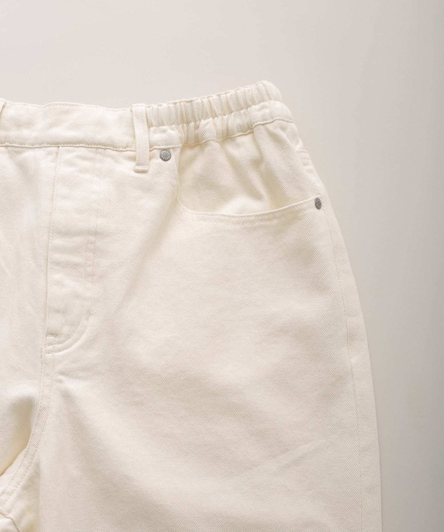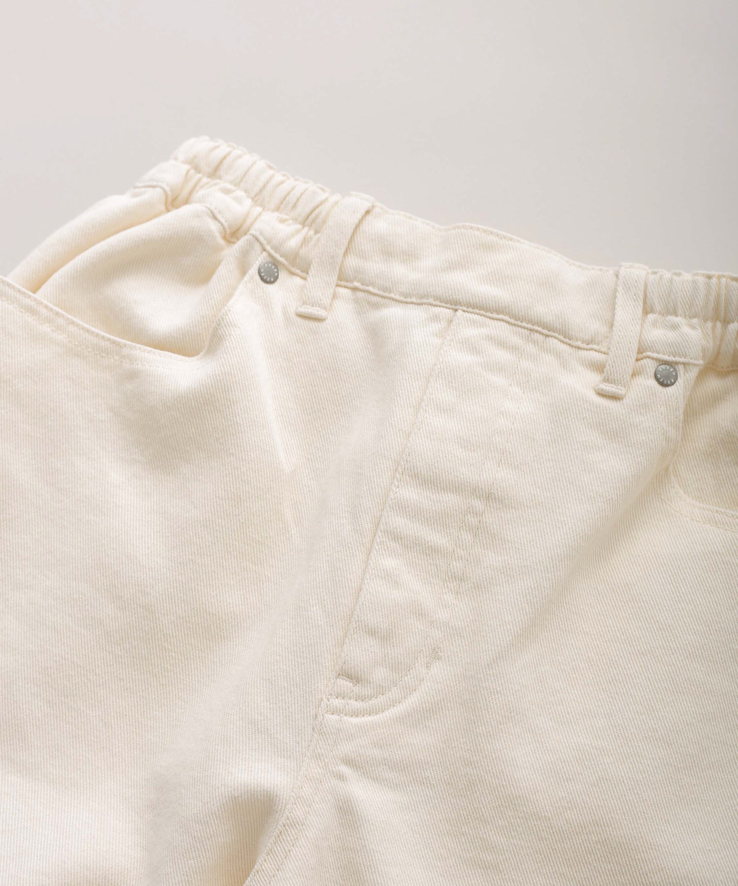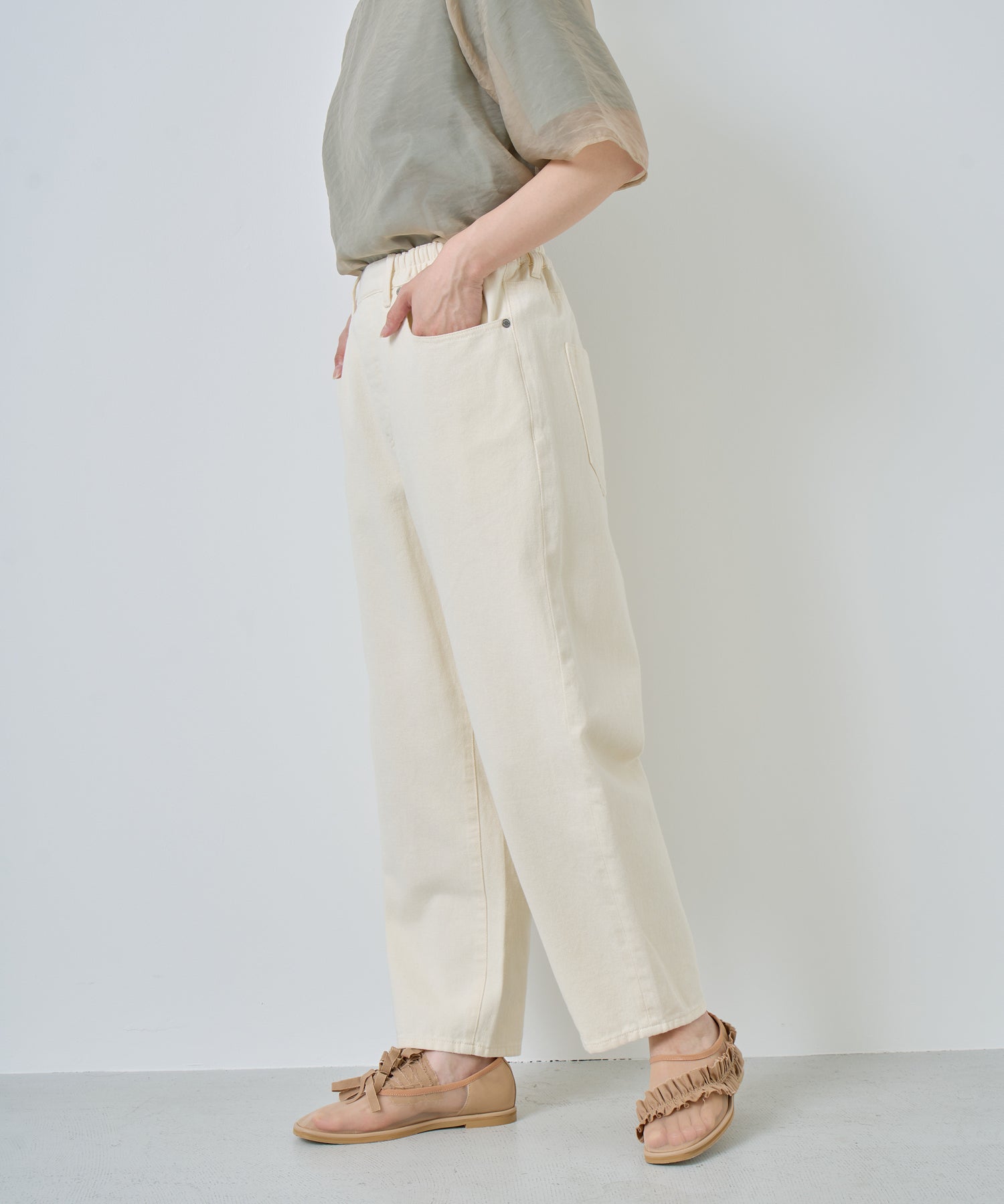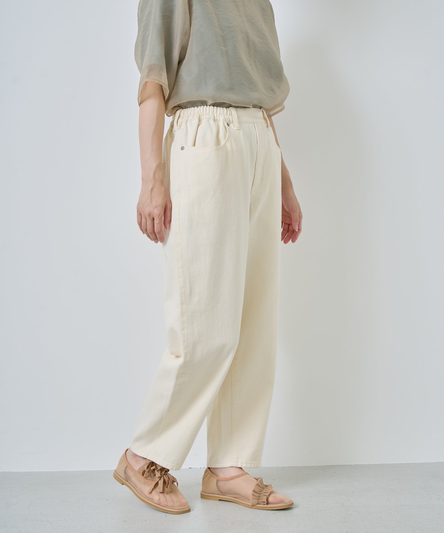 ウエストの脇から後ろにかけてゴムが入ったイージーな着心地が魅力的。